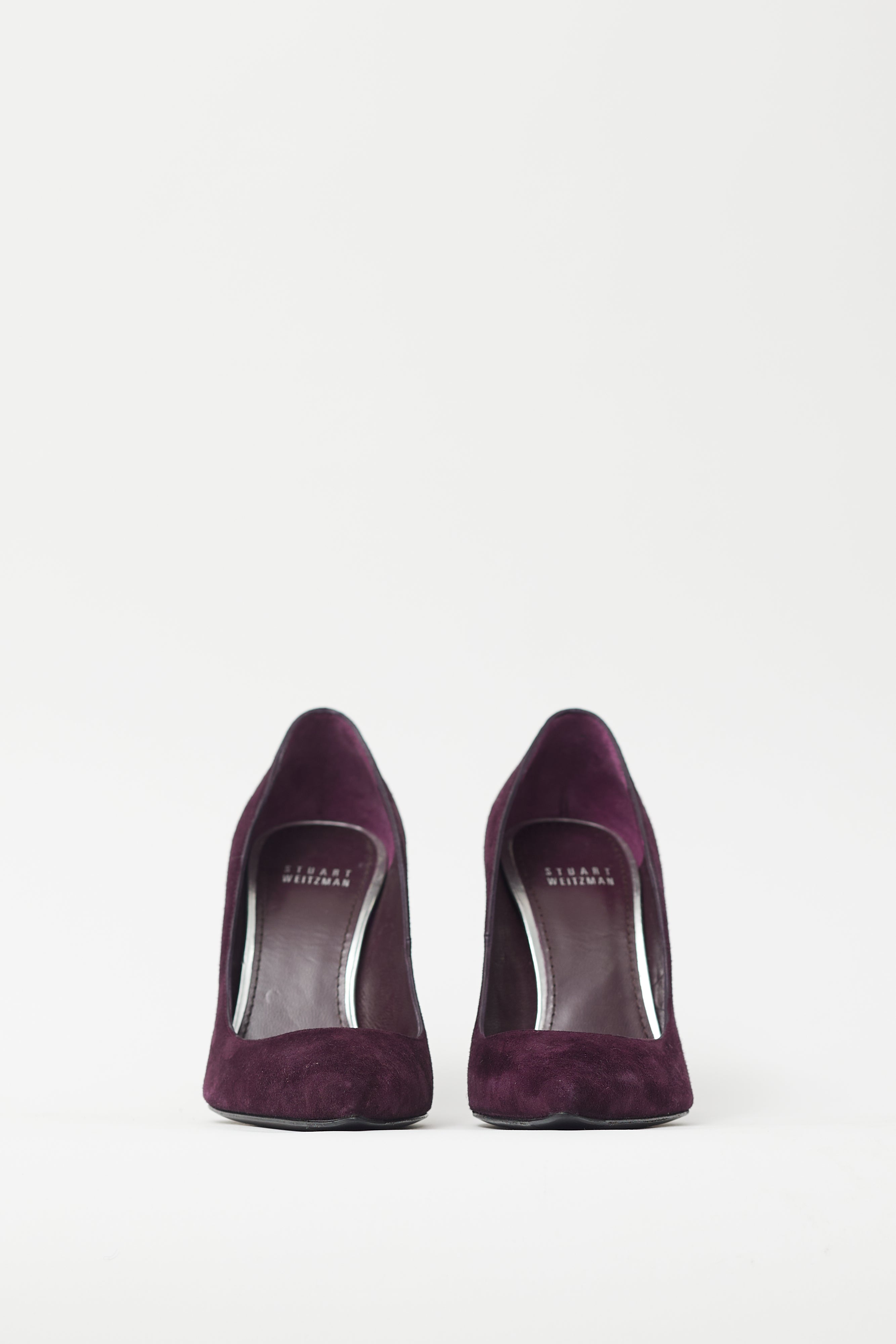 Pre-owned Stuart Weitzman purple suede pumps featuring a pointed toe, stiletto heel, and leather insole.