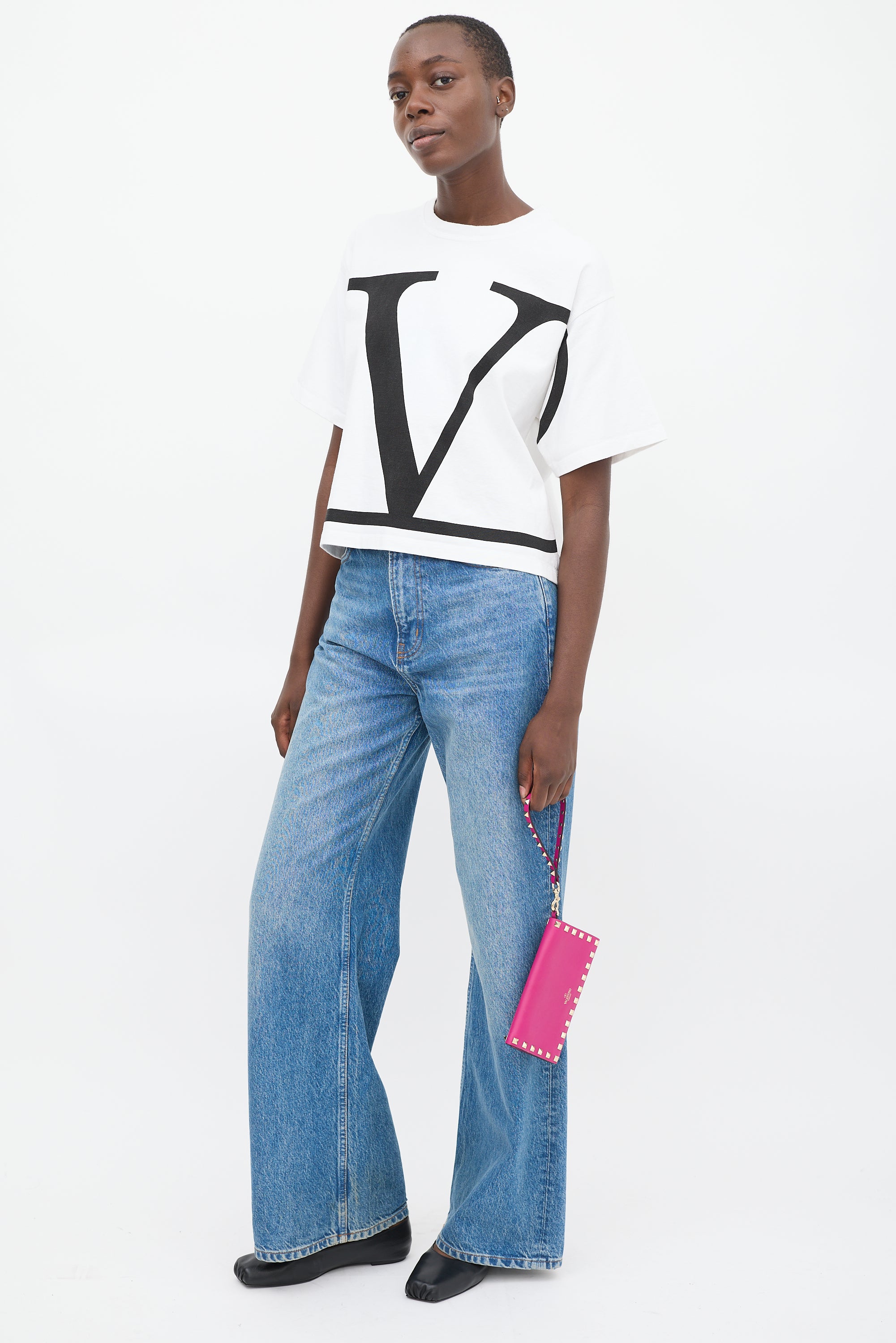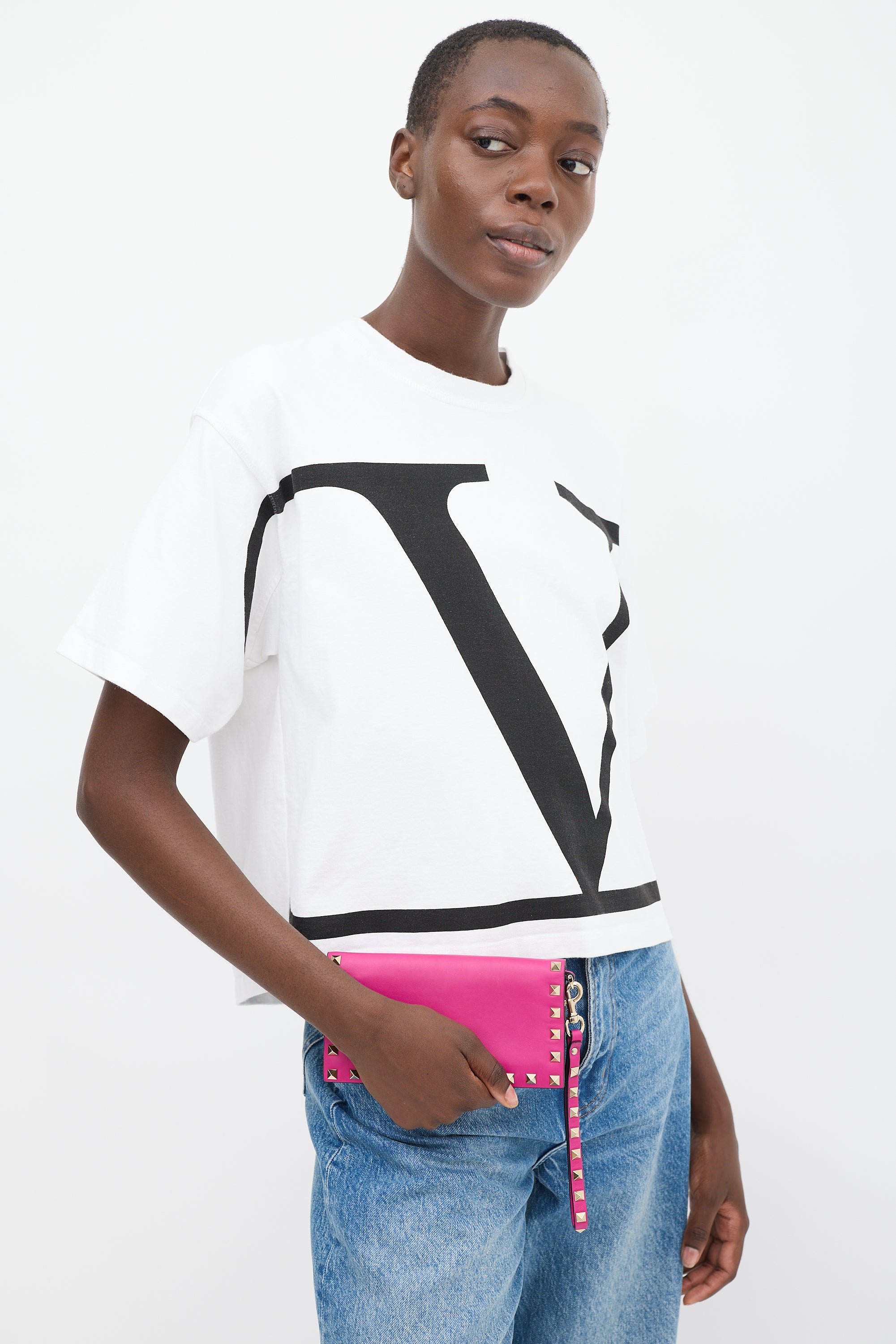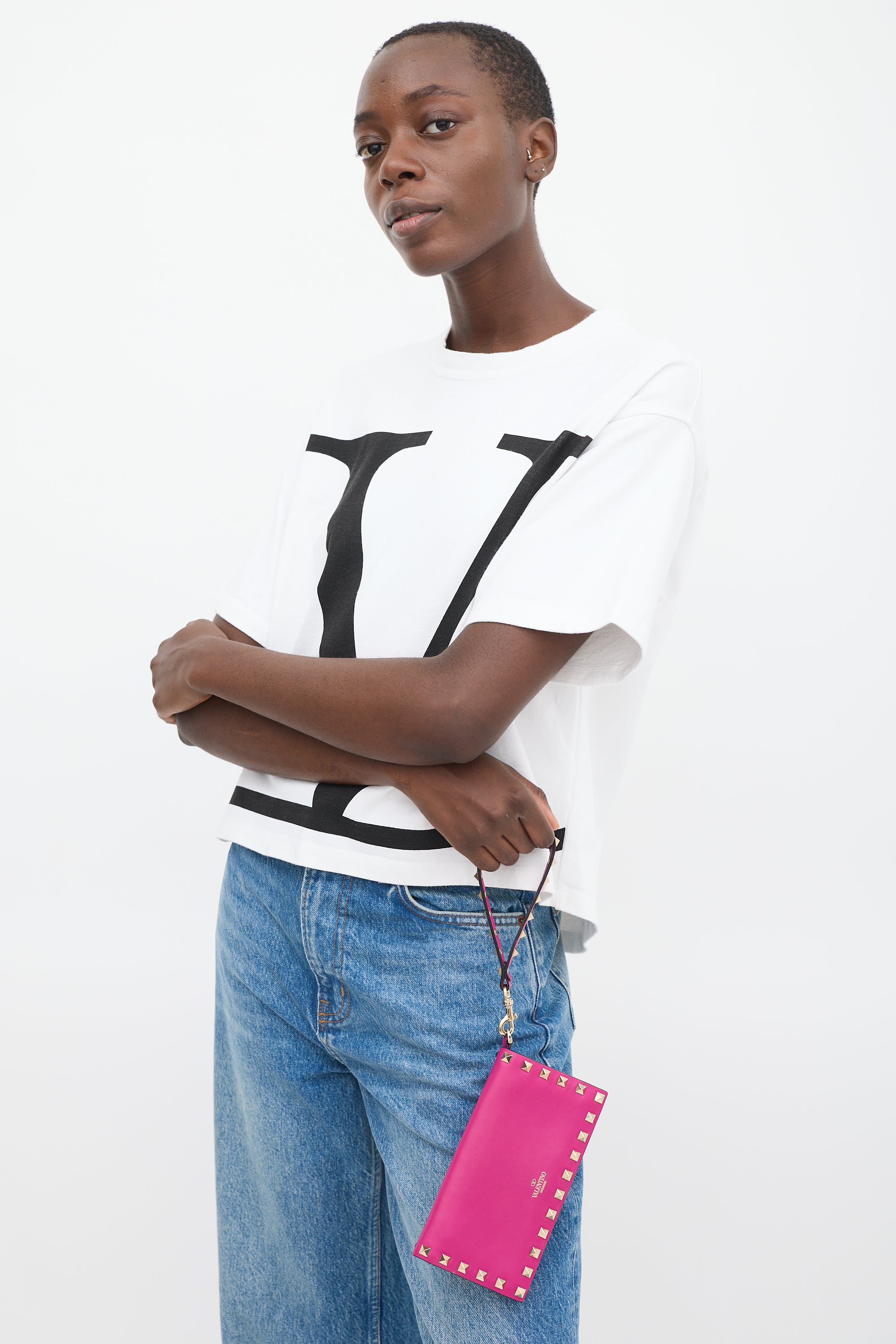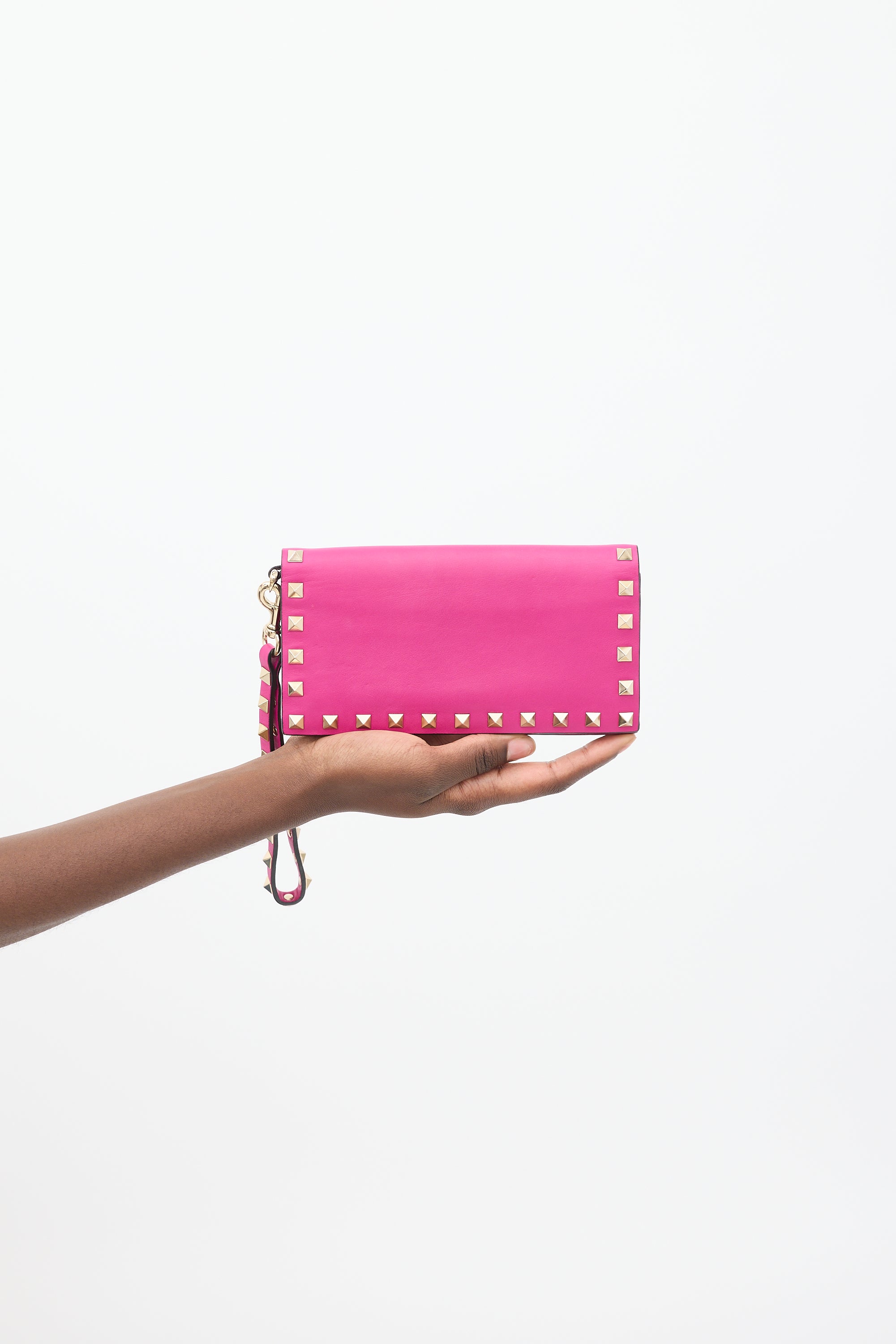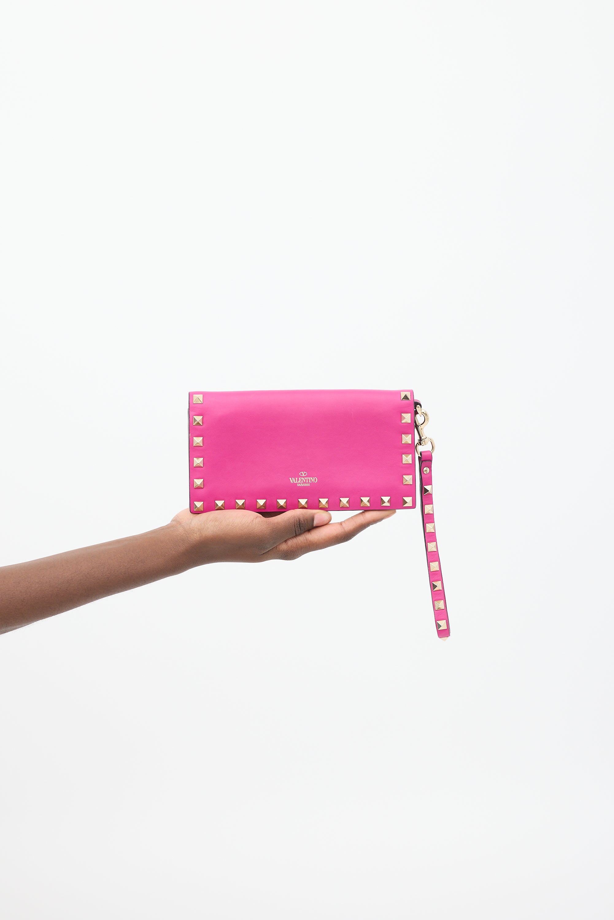 Pre-owned Valentino fuchsia leather long bifold wallet featuring gold tone foil logo stamped at bottom centre front, gold tone hardware, detachable wrist strap, Rockstud hardware throughout edges and strap, snap button closure, one zip pocket, three interior slip pockets, and seven card slots. Comes with original dust bag.