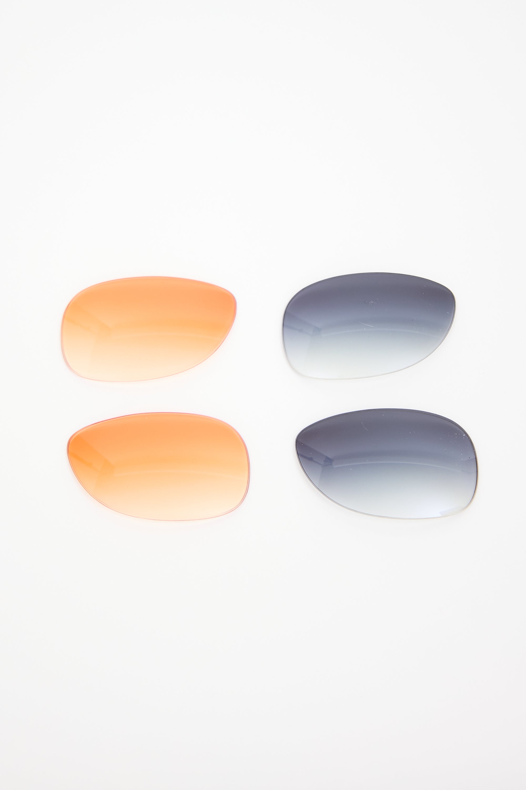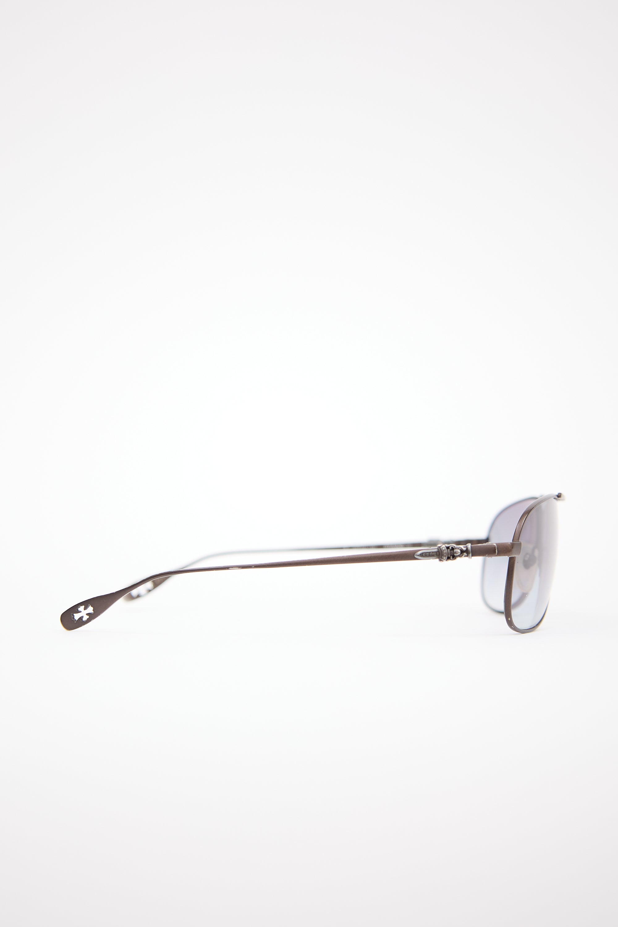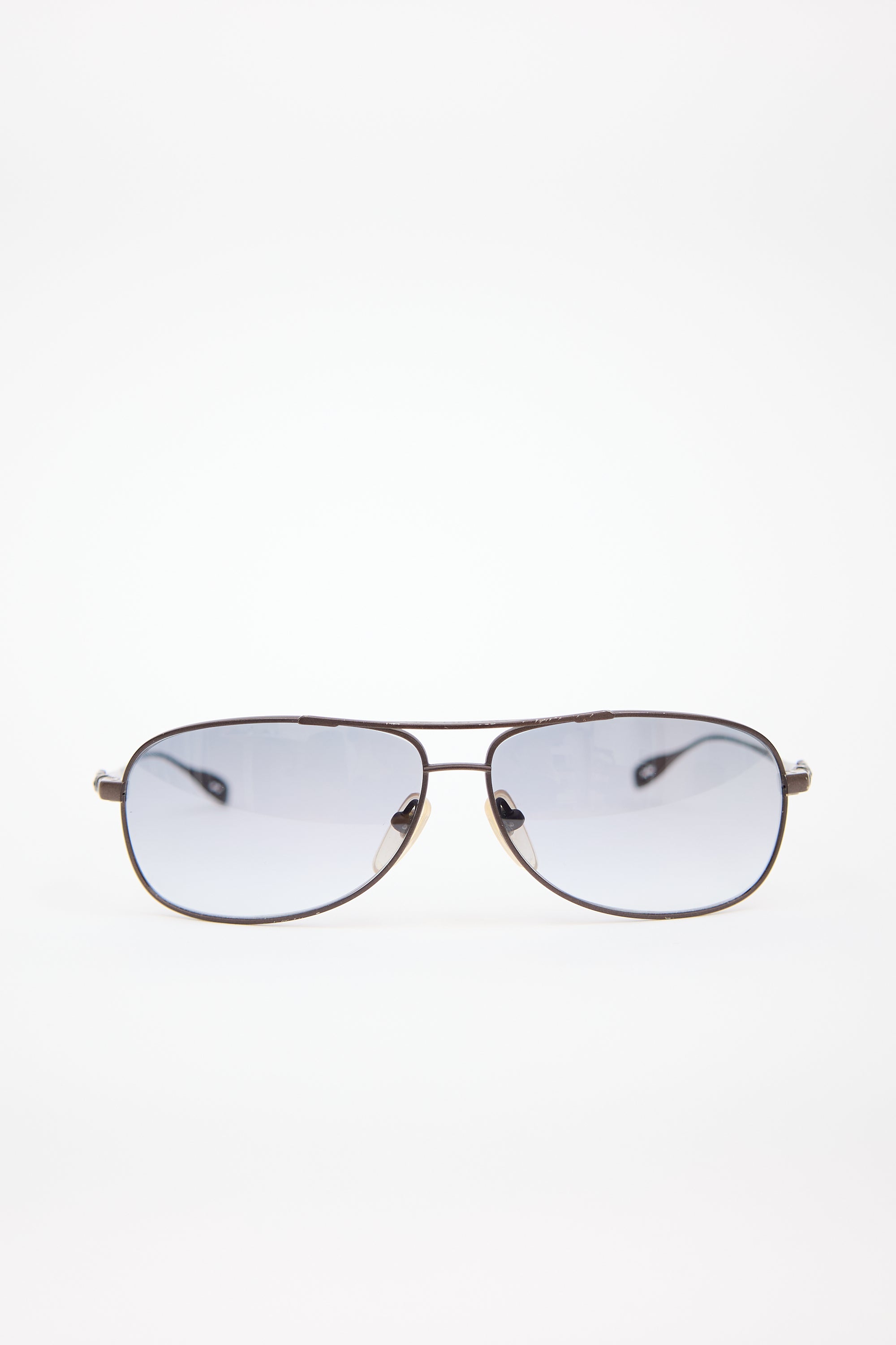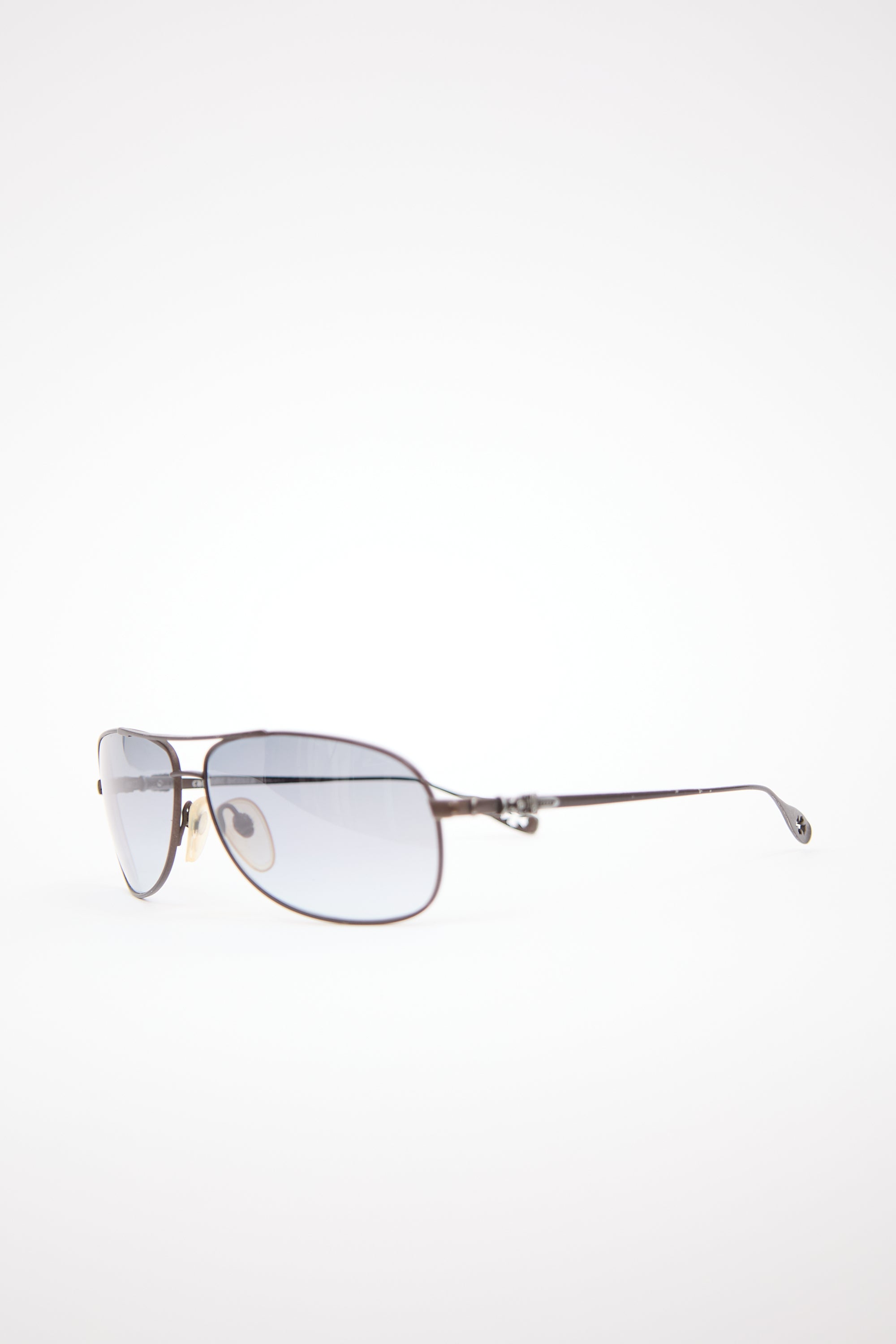 Pre-owned Chrome Hearts dark grey Stains II sunglasses featuring grey gradient tinted lenses, wire Aviator frame, signature dagger logo embellishment at temples, and cross logo cutouts at arm ends. Comes with extra set of convertible orange and blue gradient tinted lenses.