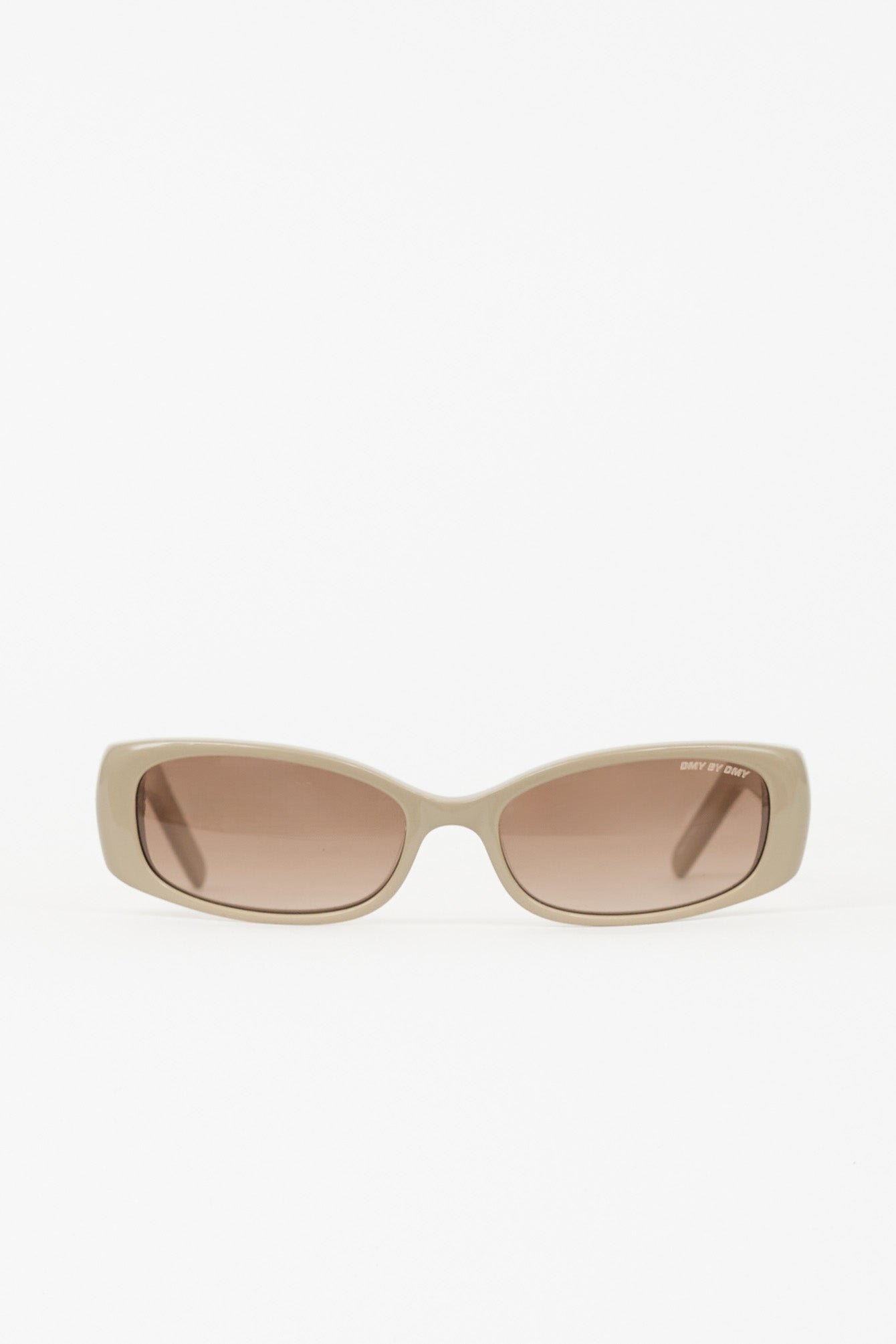 Pre-owned DMY BY DMY beige DMY08ST Billy sunglasses featuring brown tinted lenses, acetate rectangle frame, and debossed logo at left temple. Comes with original box and case.