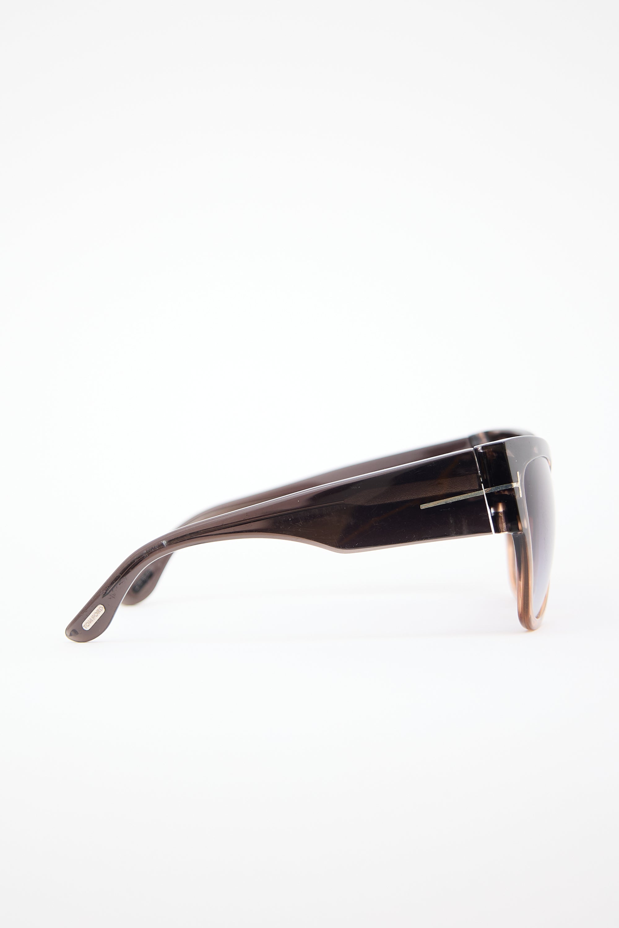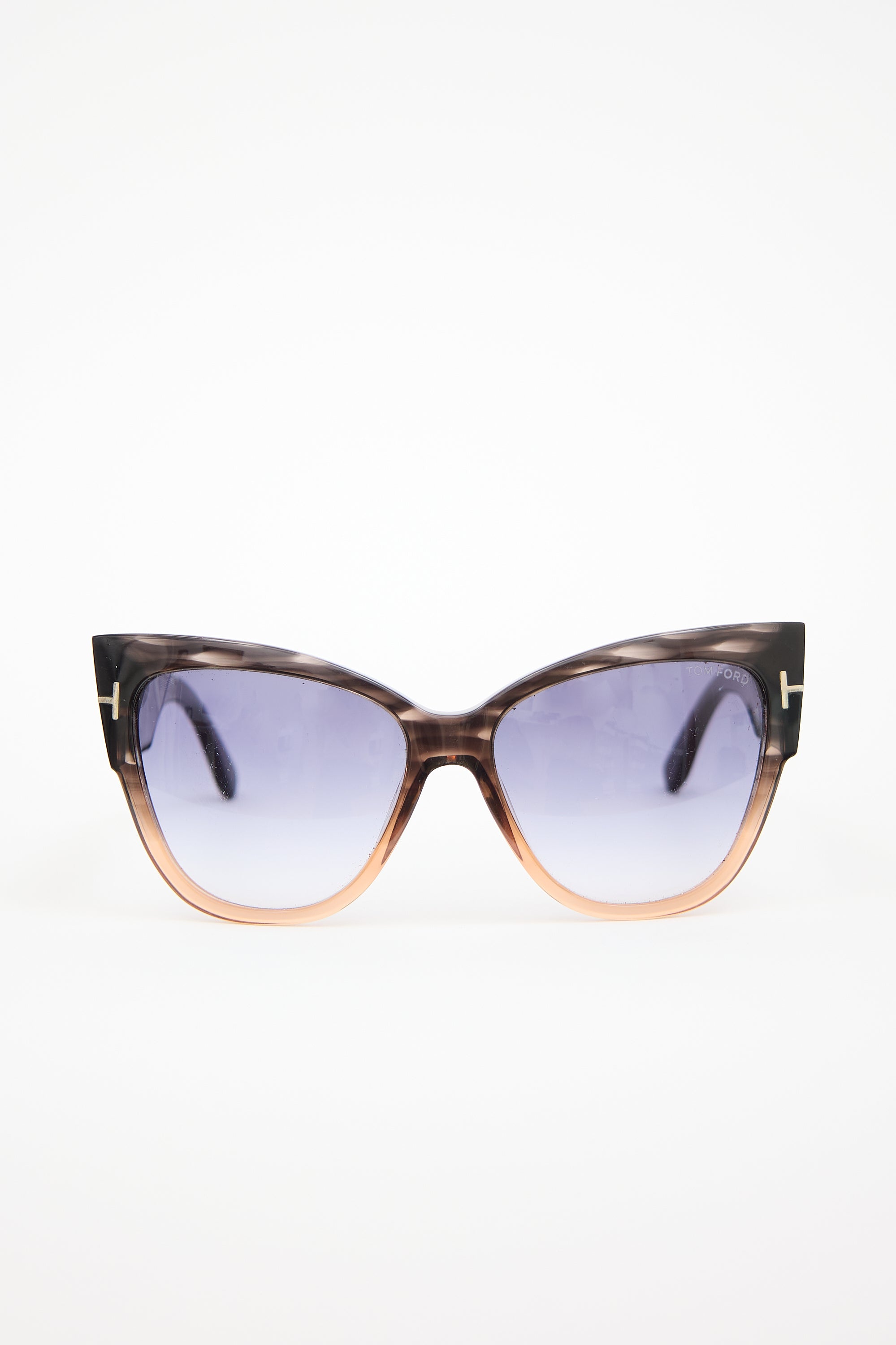 Pre-owned Tom Ford brown TF371 Anoushka sunglasses featuring blue gradient tinted lenses, acetate cateye frame, and inset gold tone T logo hardware at temples. Comes with original case.
