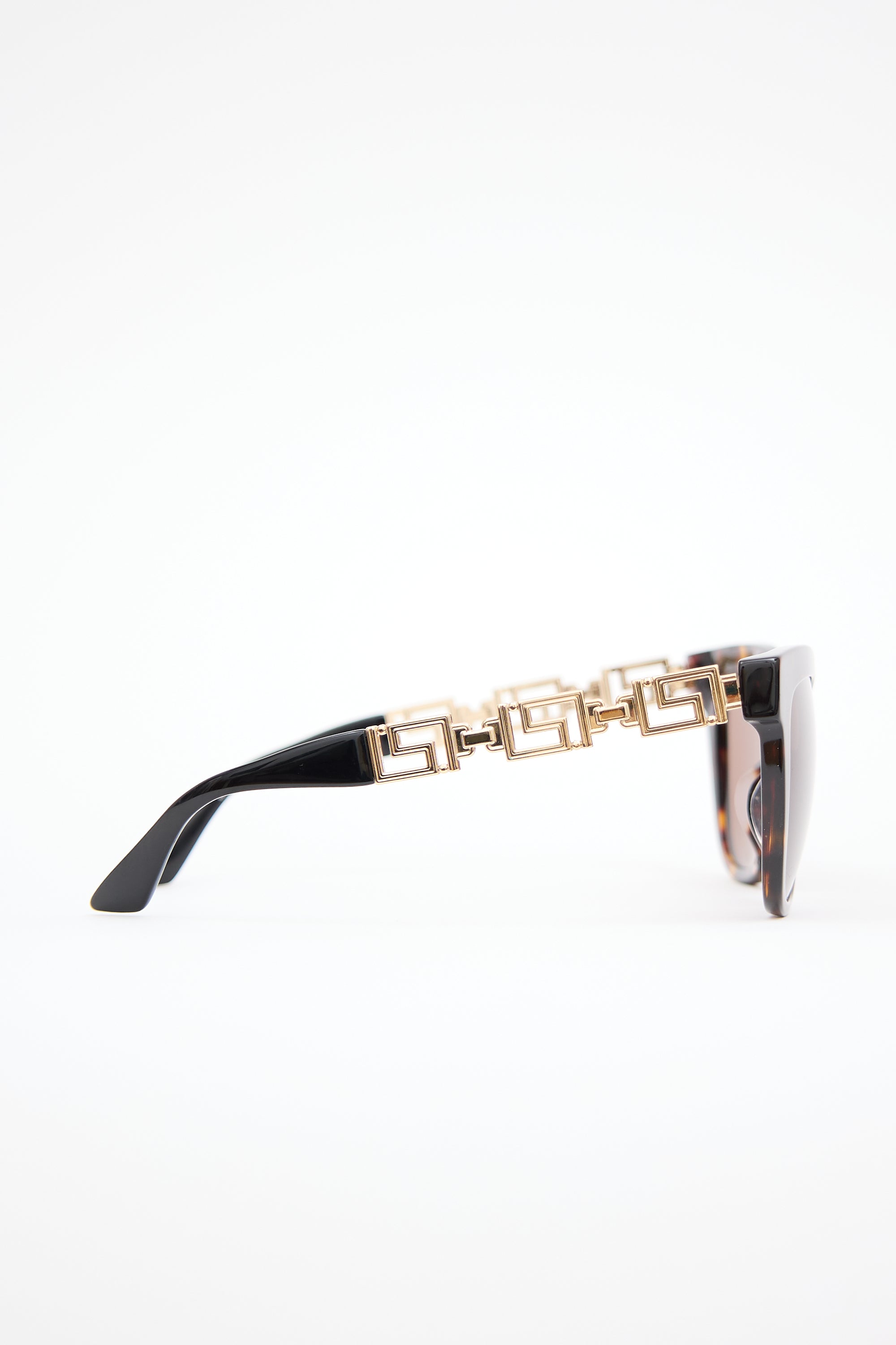 Pre-owned Versace tortoiseshell 4394F sunglasses featuring brown tinted lenses, acetate Cateye frame, and gold tone Greca hardware at temples. Comes with original box and case.
