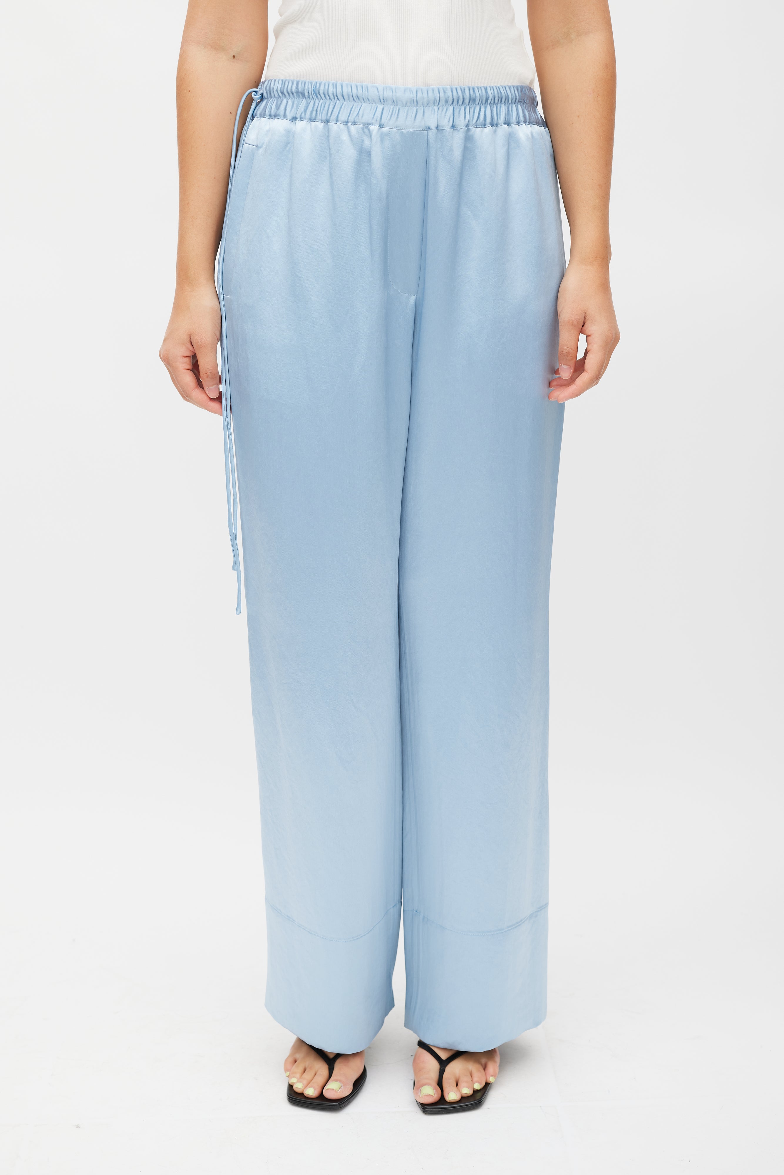 Pre-owned Acne Studios blue satin trousers featuring an elasticized drawstring waist, two slip pockets at hip, one patch pocket at back, wide leg, faux fly, and tie detail at side.