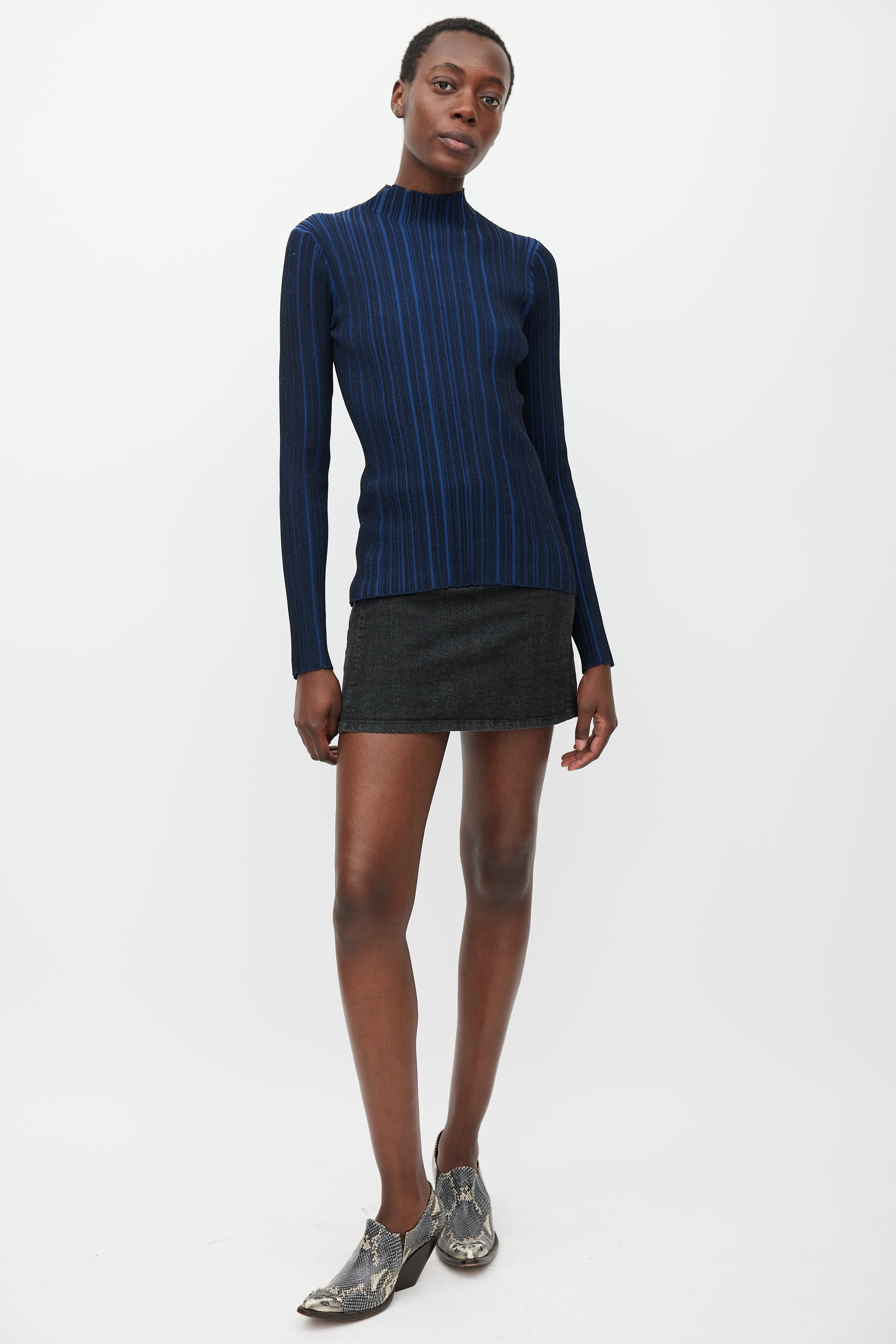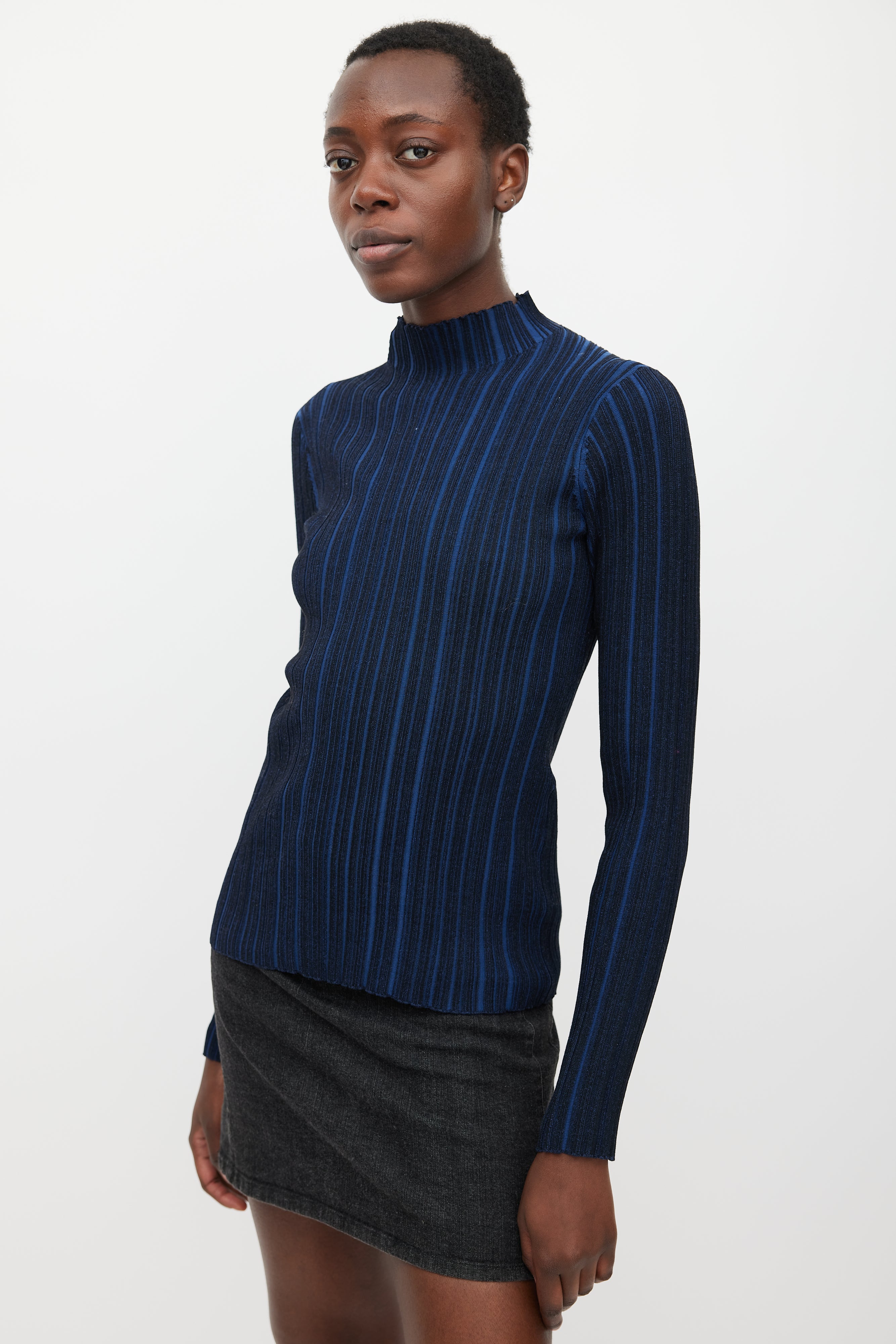 Pre-owned Acne Studios navy and black top featuring a mock neck, long sleeves, and irregular ribbing throughout.