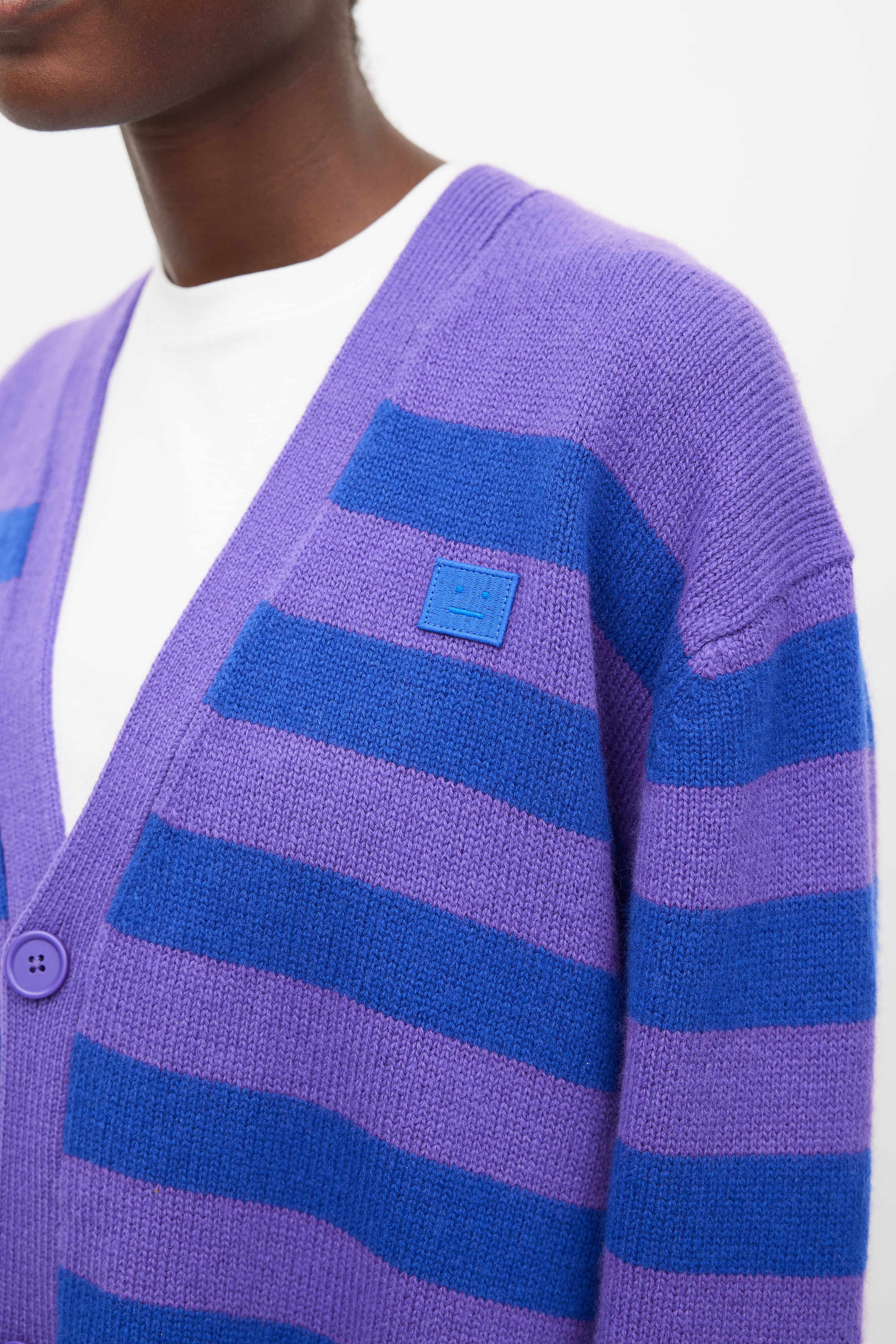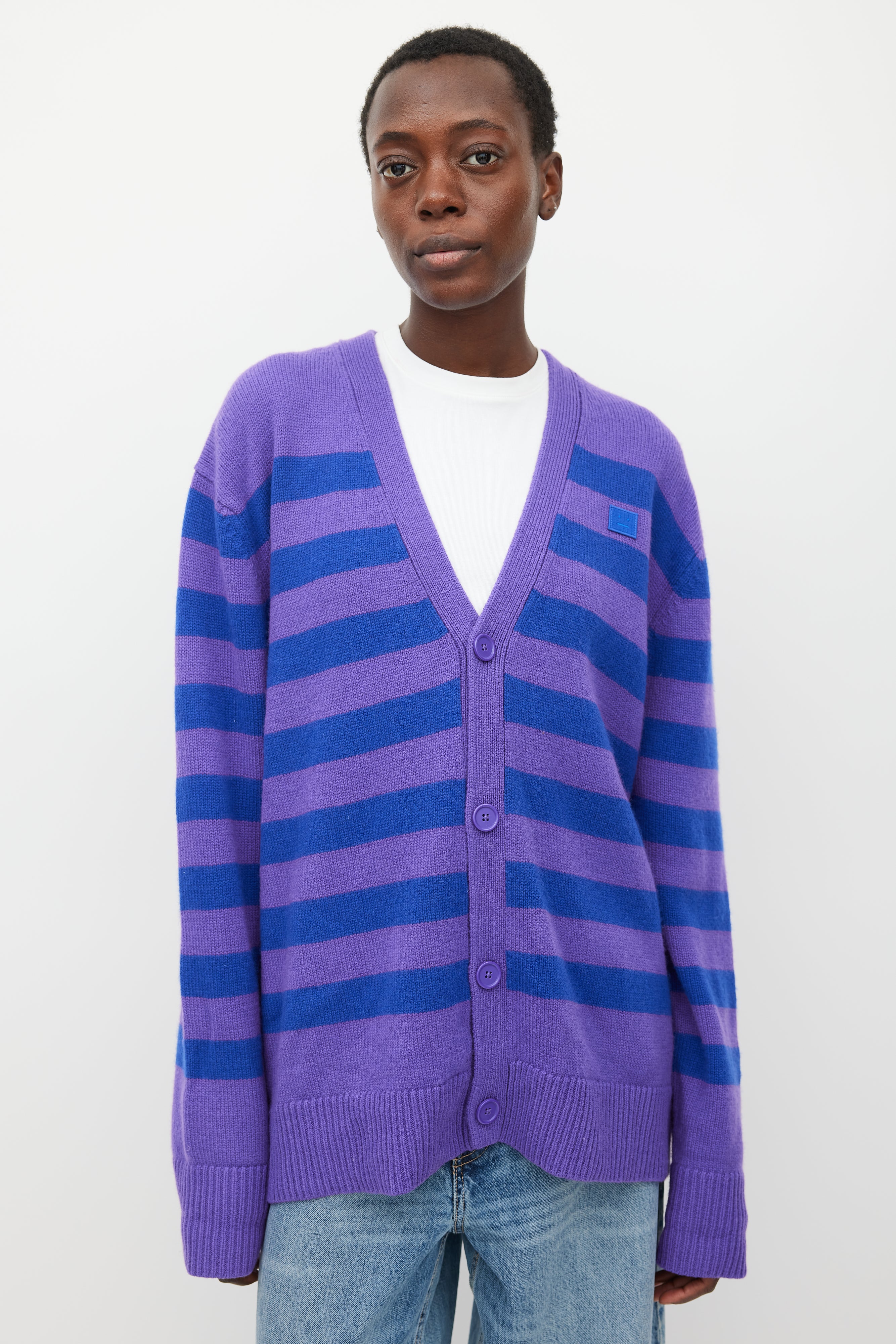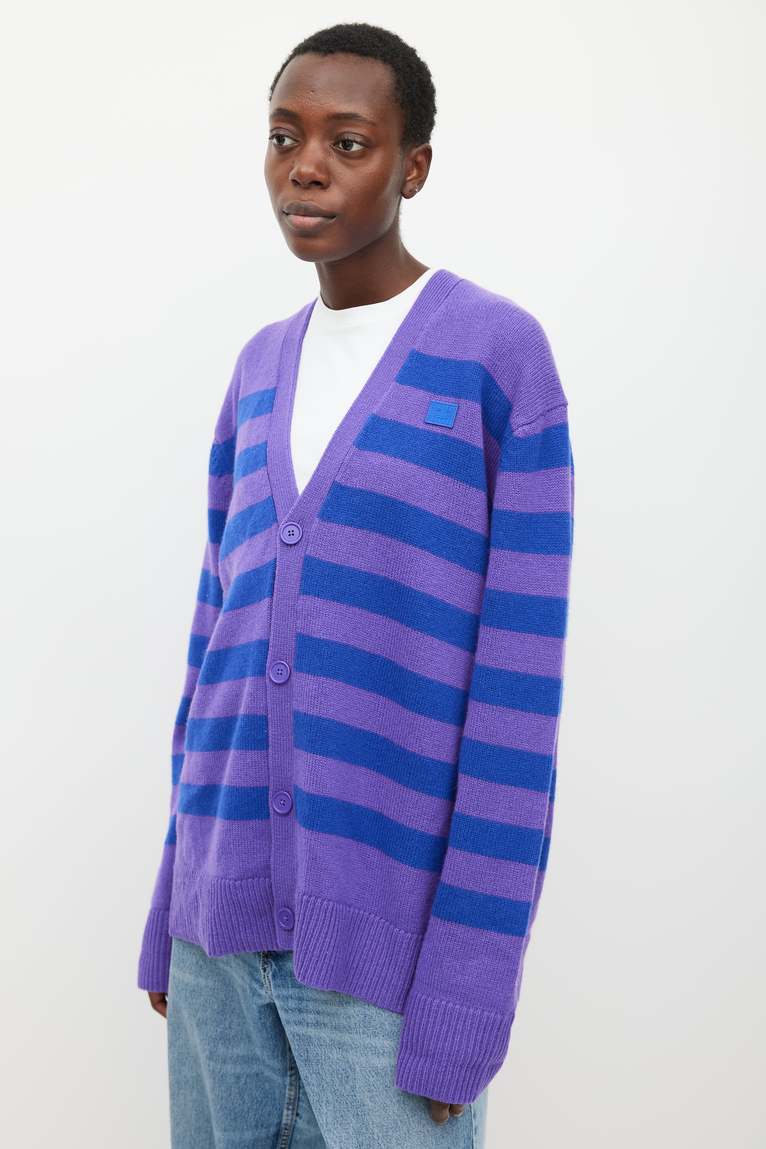 Pre-owned Acne Studios purple and blue wool cardigan featuring a V-neckline, striped pattern throughout, face logo patch at left chest, button up front, long sleeves, and ribbed trim.