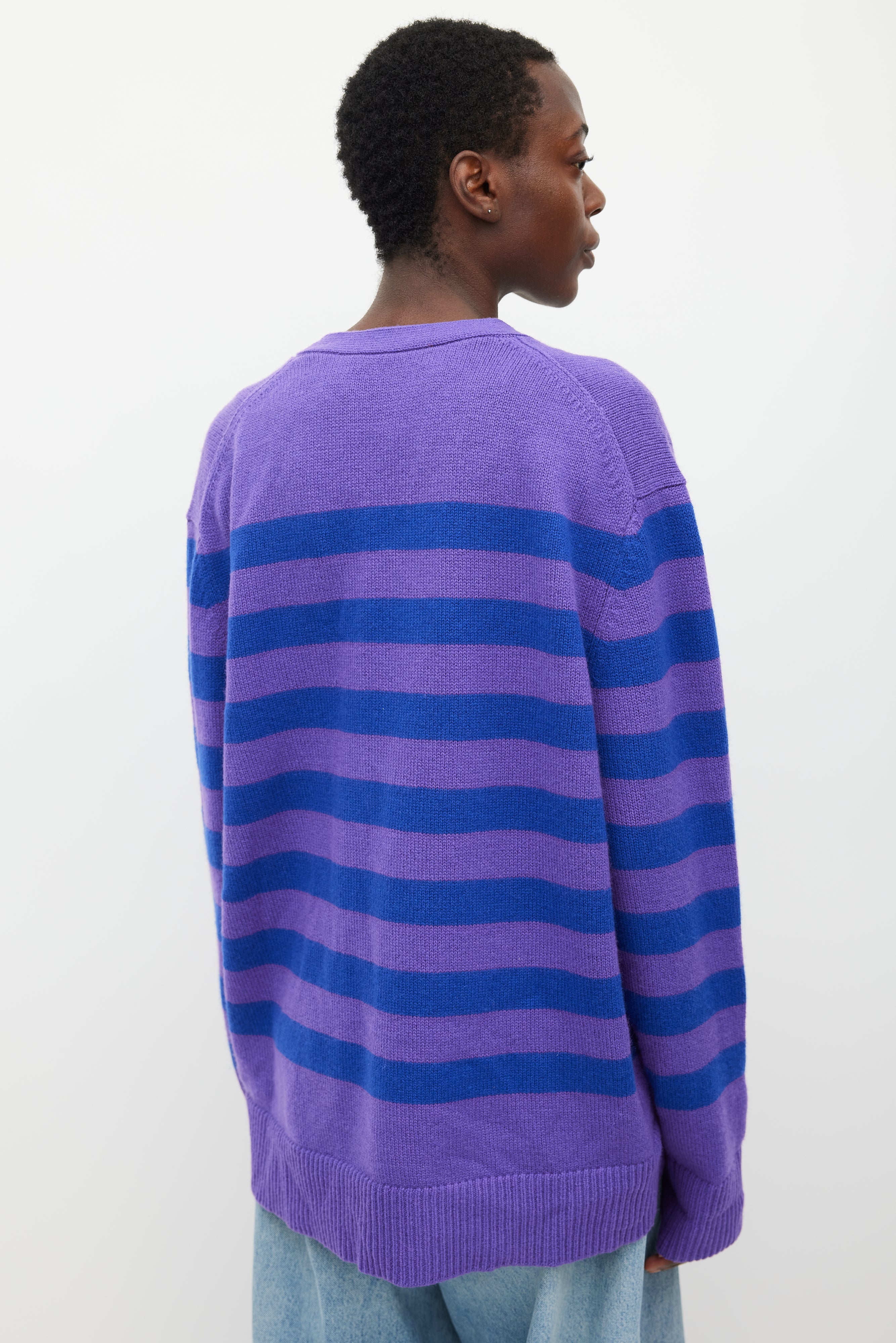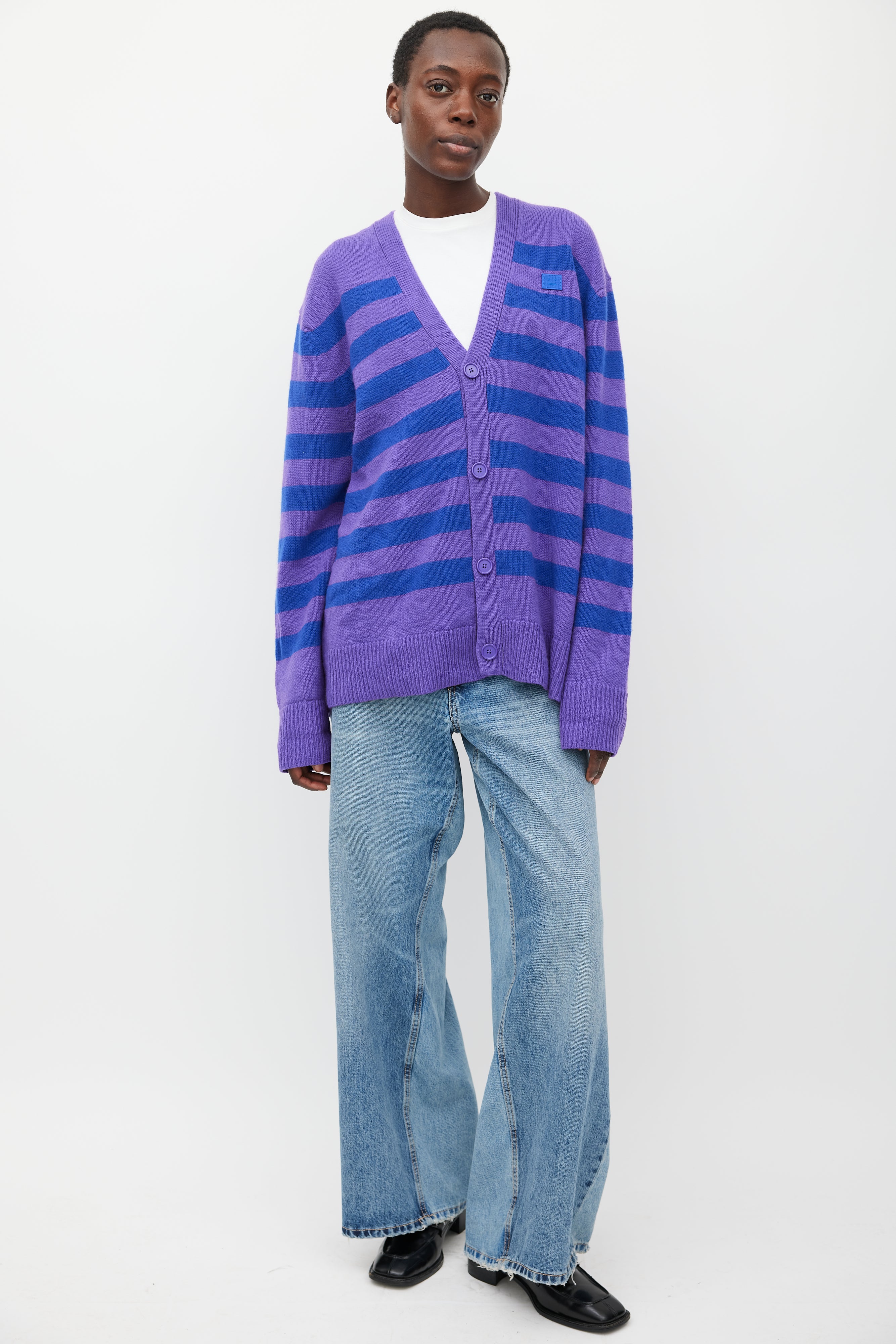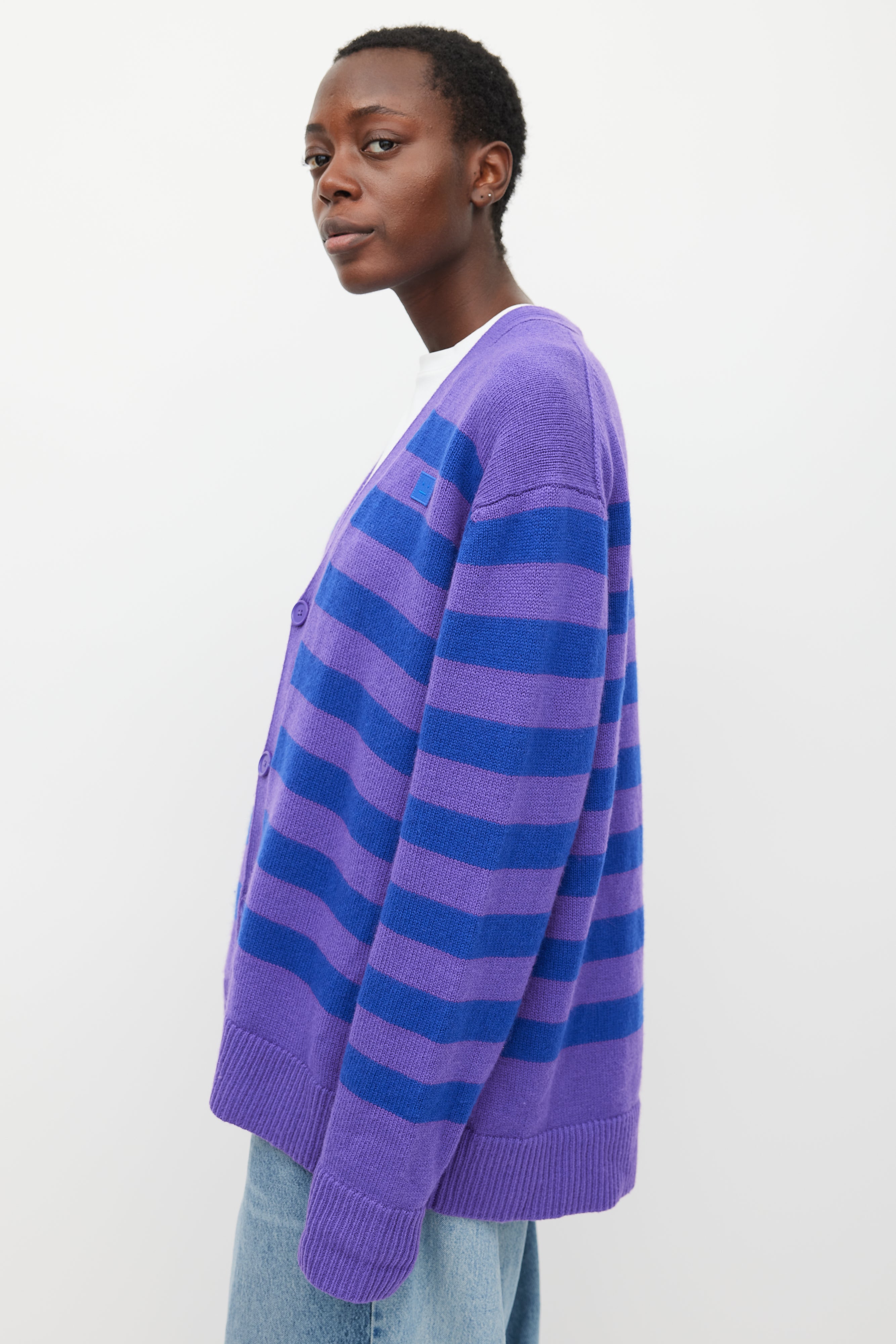 Pre-owned Acne Studios purple and blue wool cardigan featuring a V-neckline, striped pattern throughout, face logo patch at left chest, button up front, long sleeves, and ribbed trim.