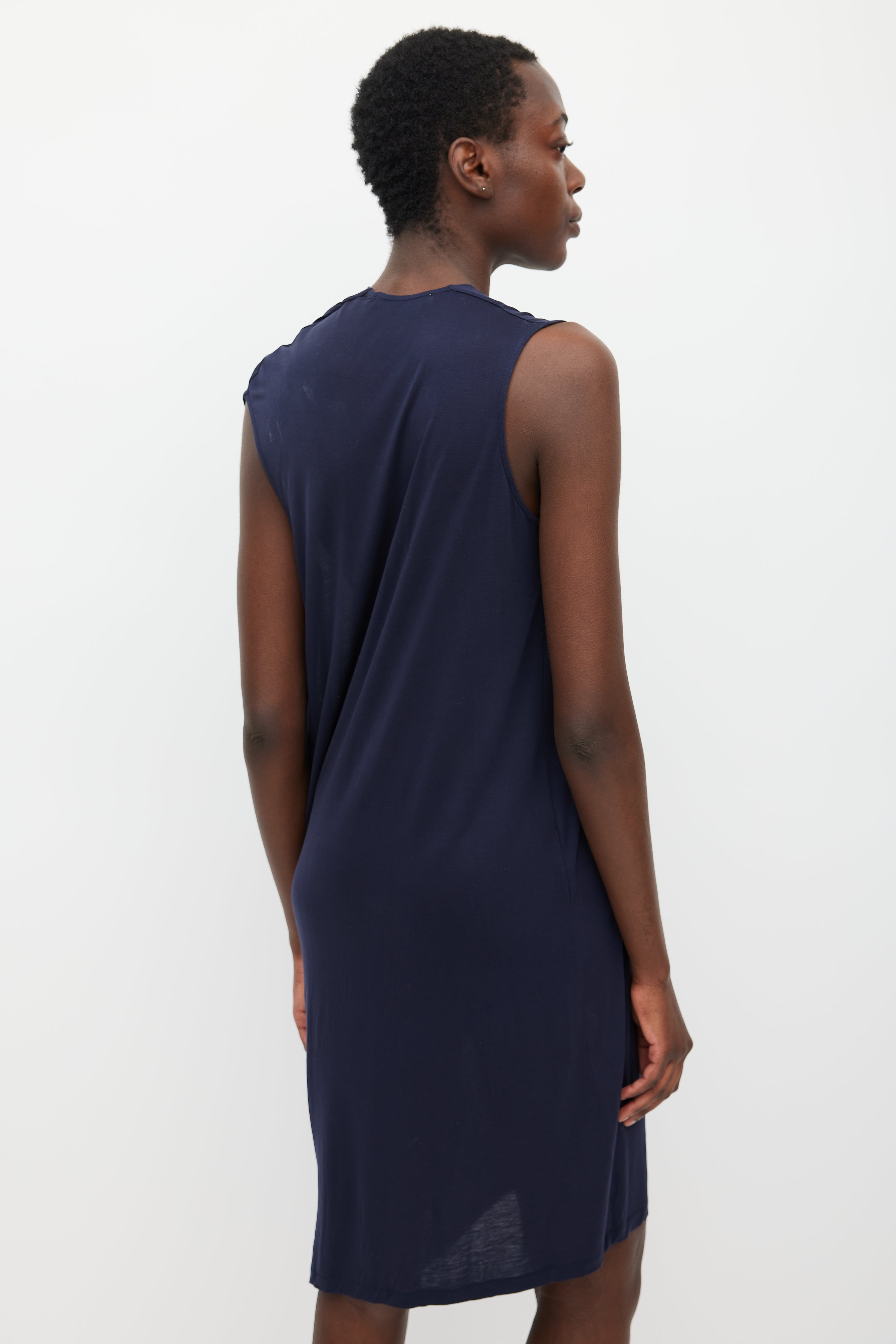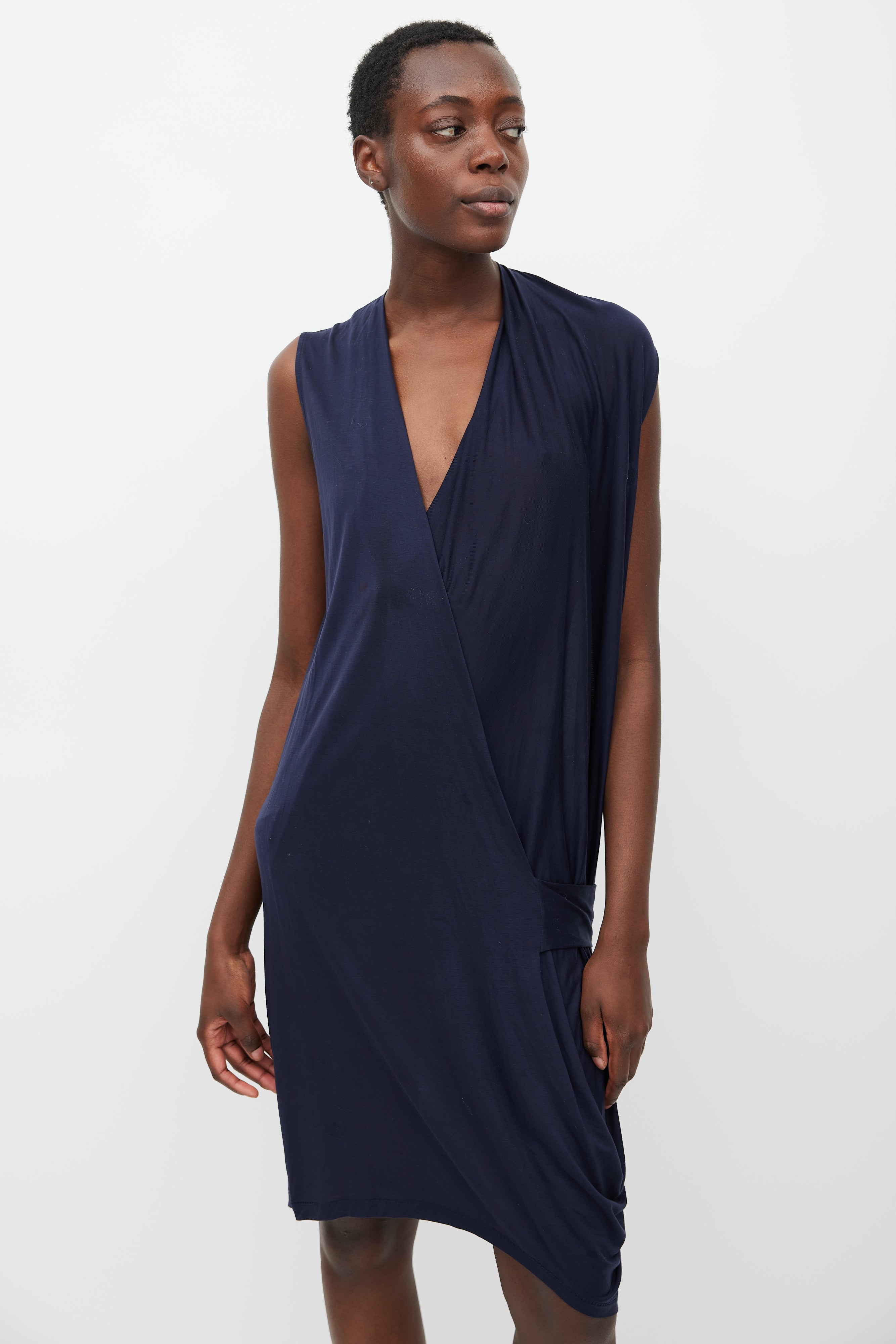 Pre-owned Acne Studios Spring/Summer 2015 navy Natifa sleeveless midi dress featuring a V-neckline, draped construction, and front wrapped effect.