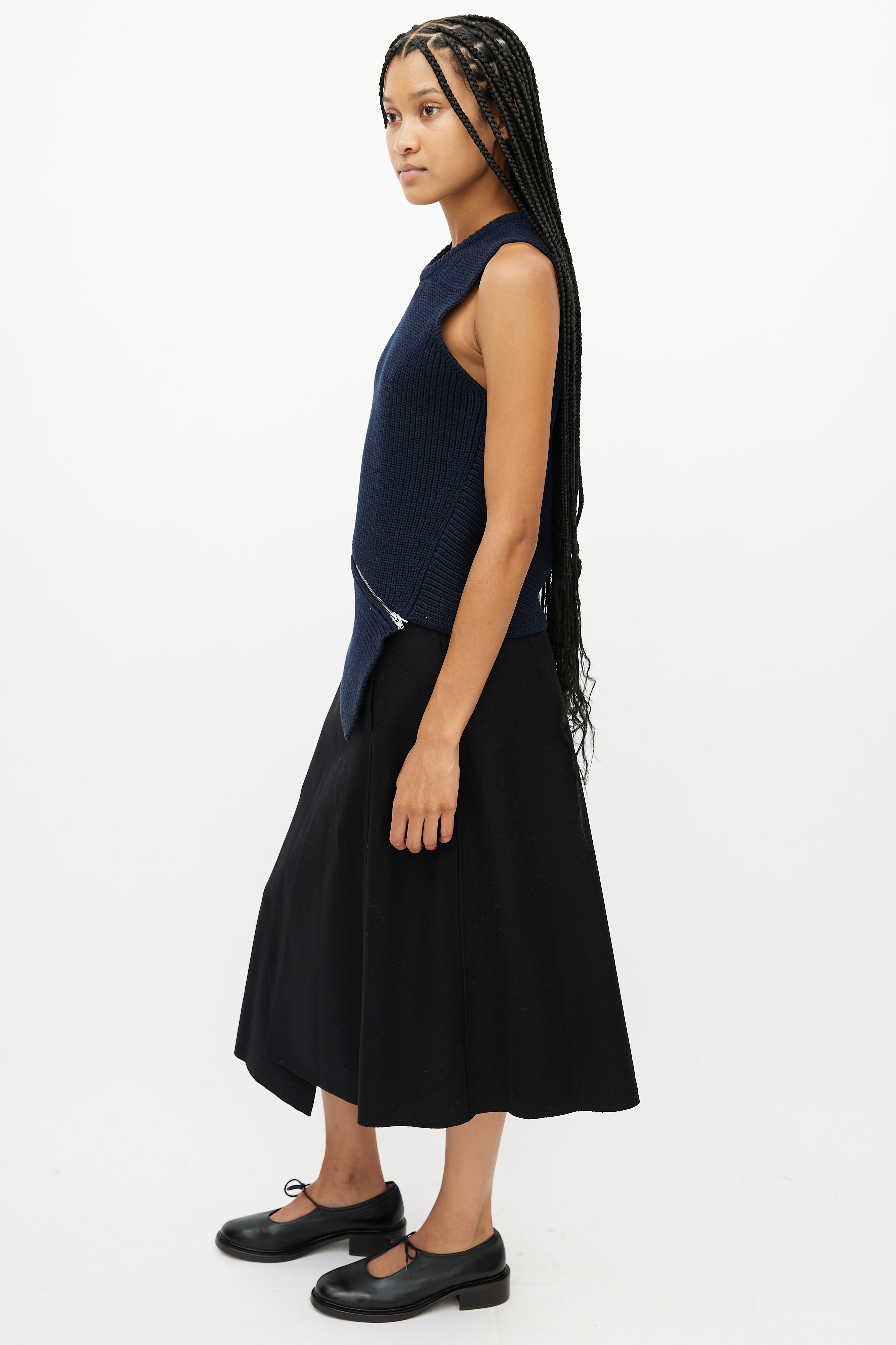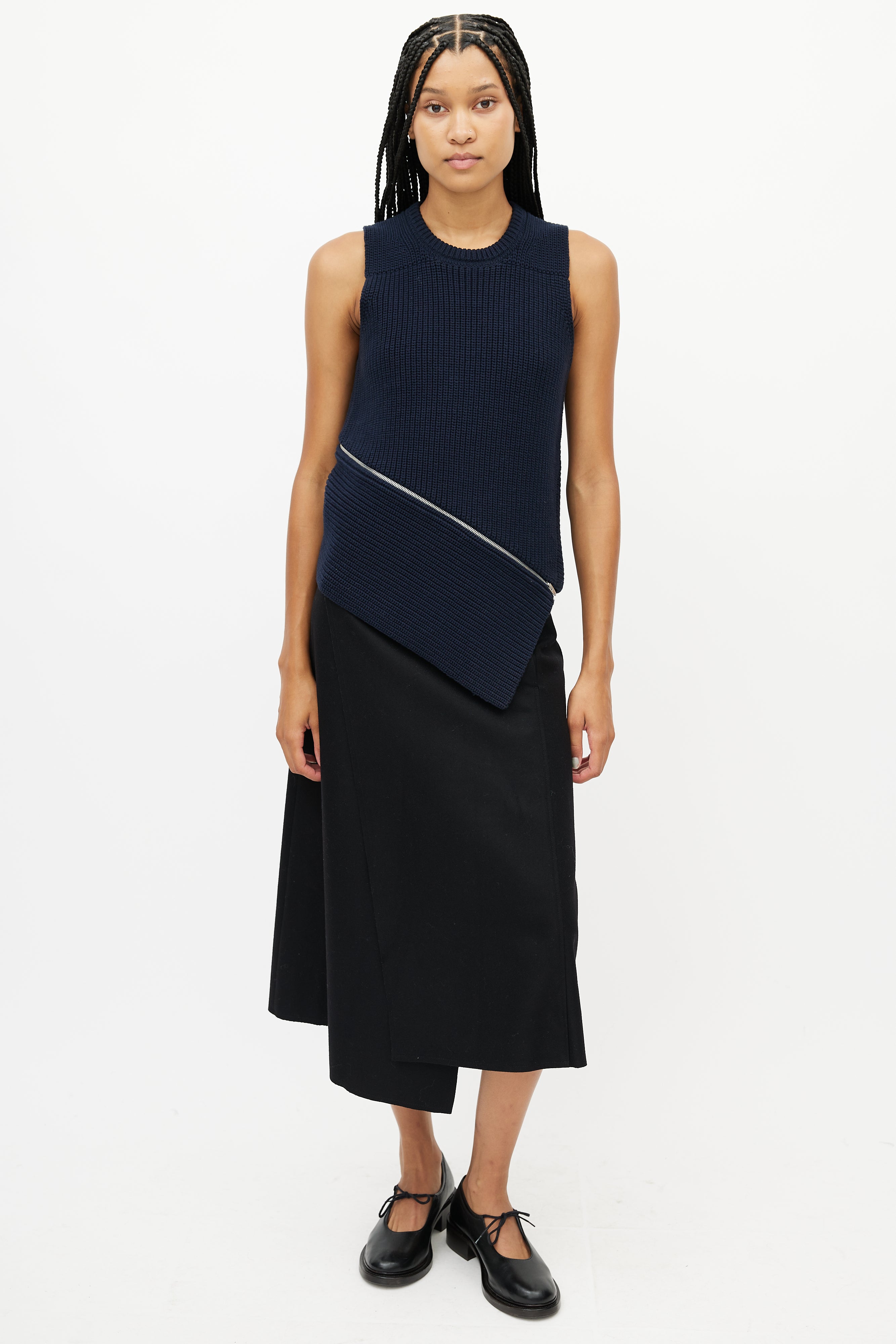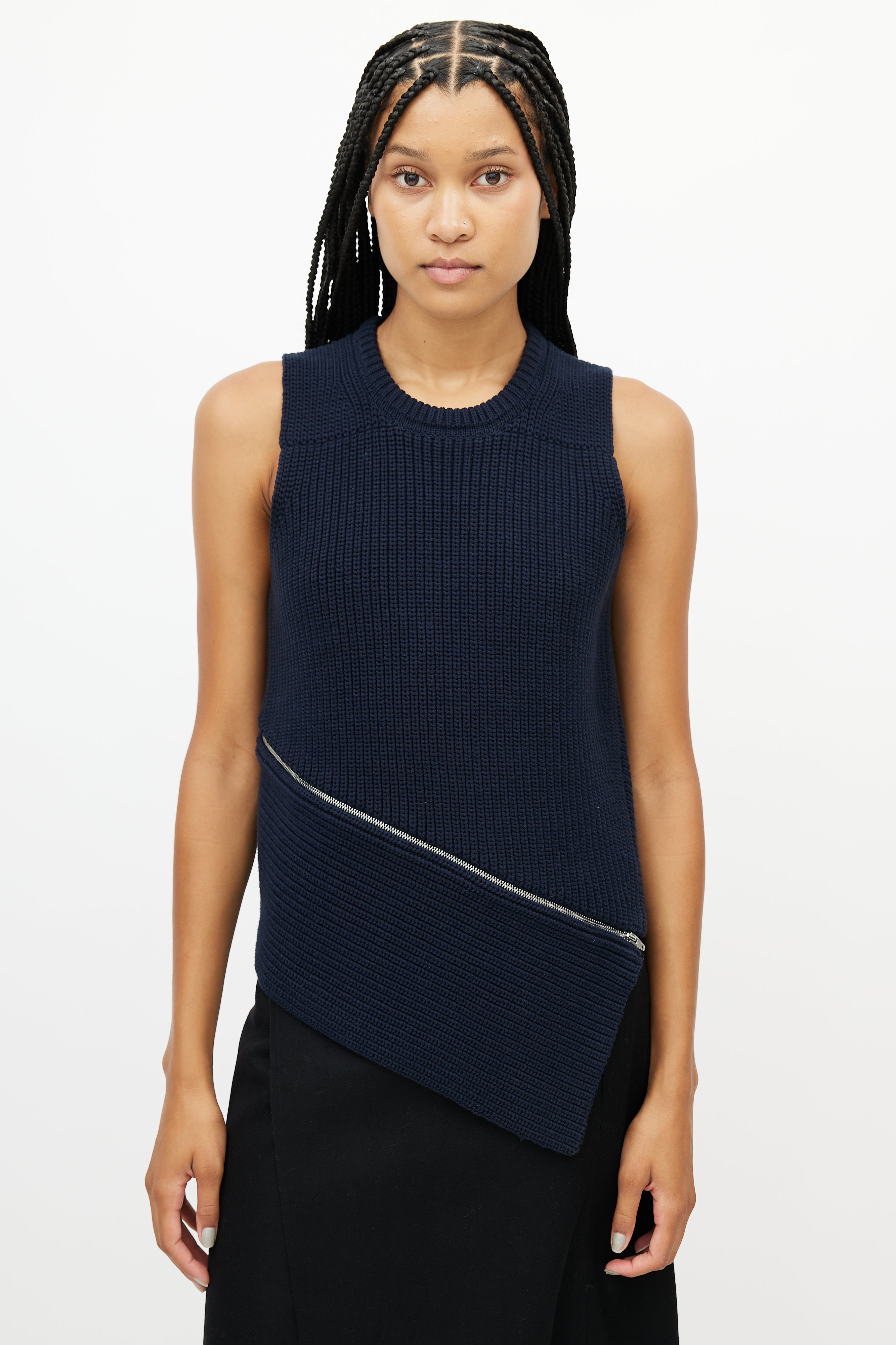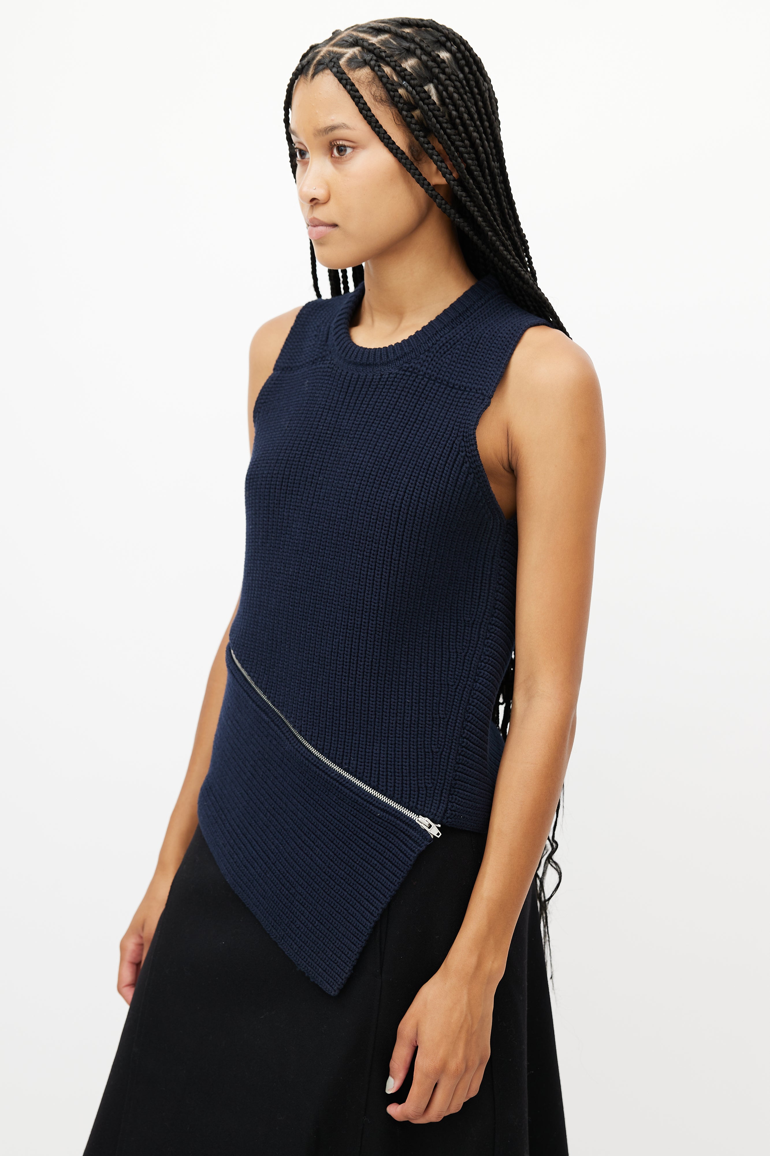 Pre-owned Alexander Wang navy knit top featuring a silver tone diagonal zip detail throughout, crew neckline, and sleeveless styling.