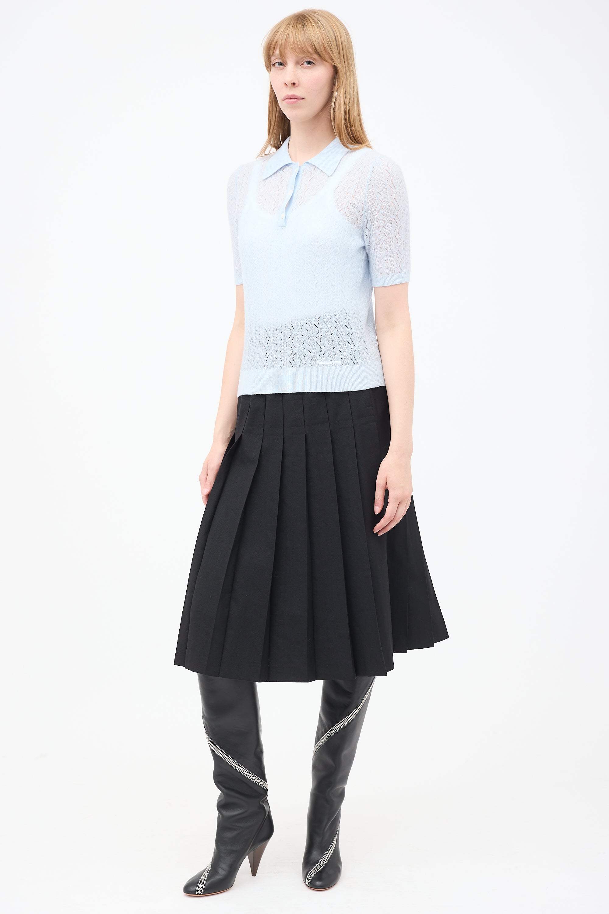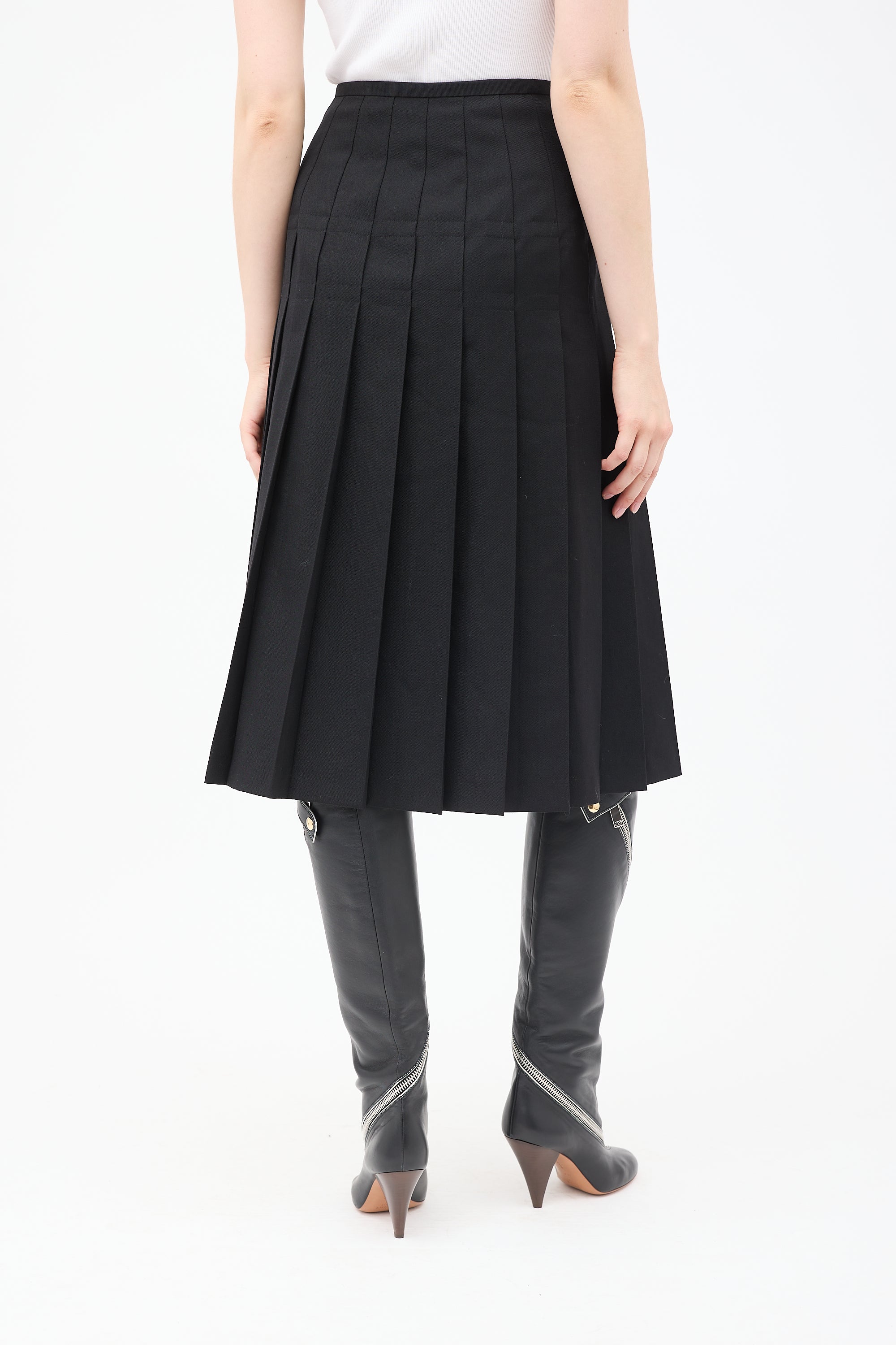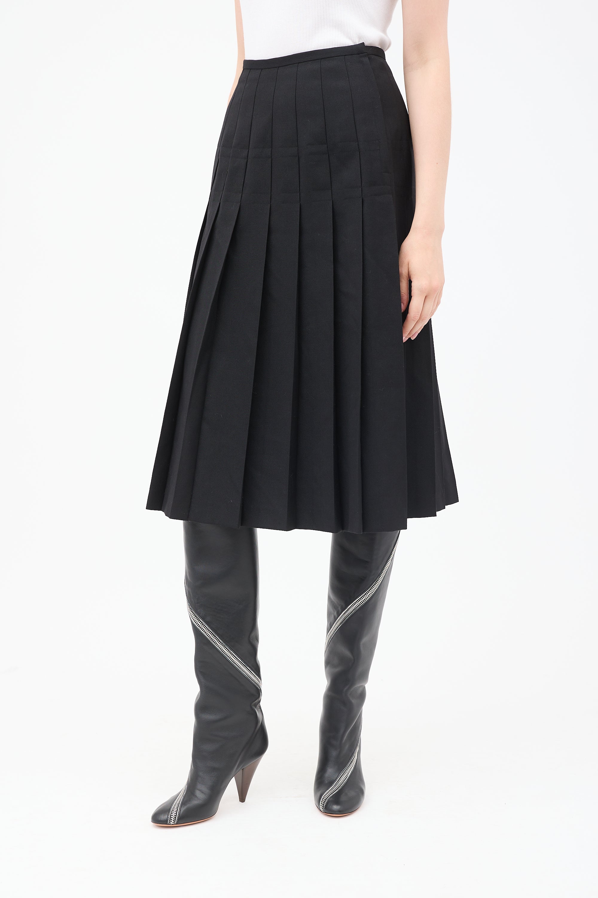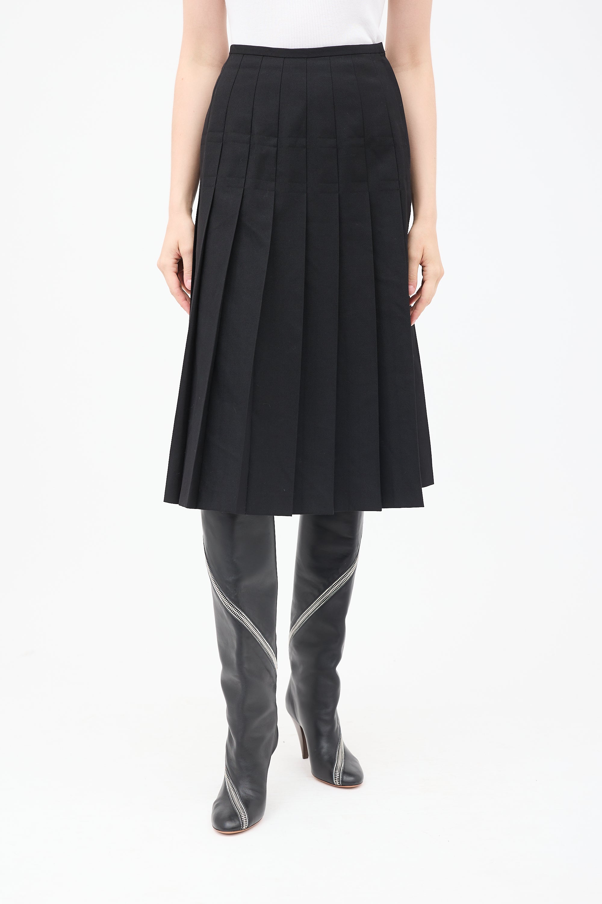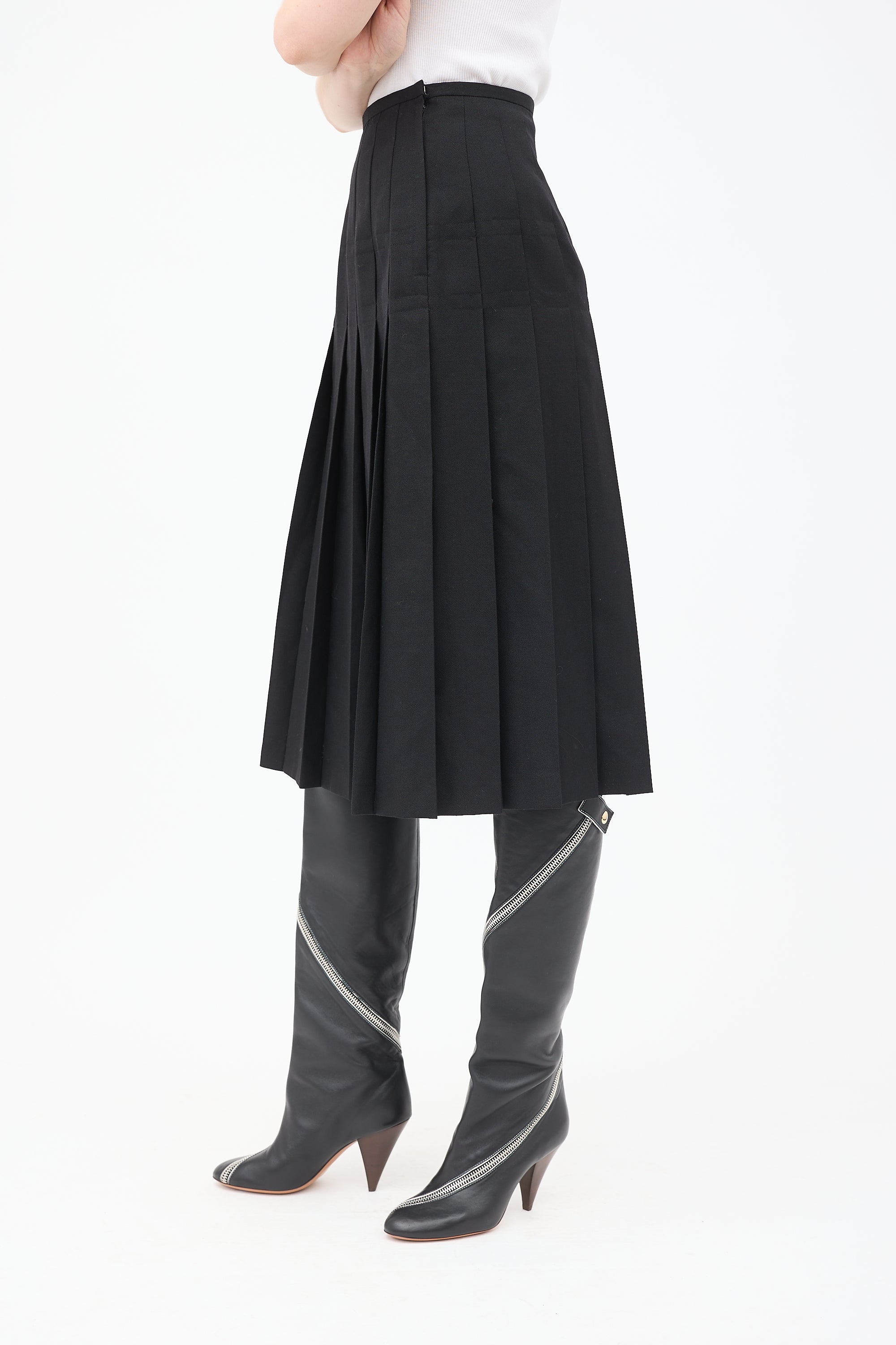 Pre-owned Comme des Garçons vintage Fall/Winter 1990 black wool midi skirt featuring a high waist with grosgrain trim, knife pleating throughout, and concealed side zip.