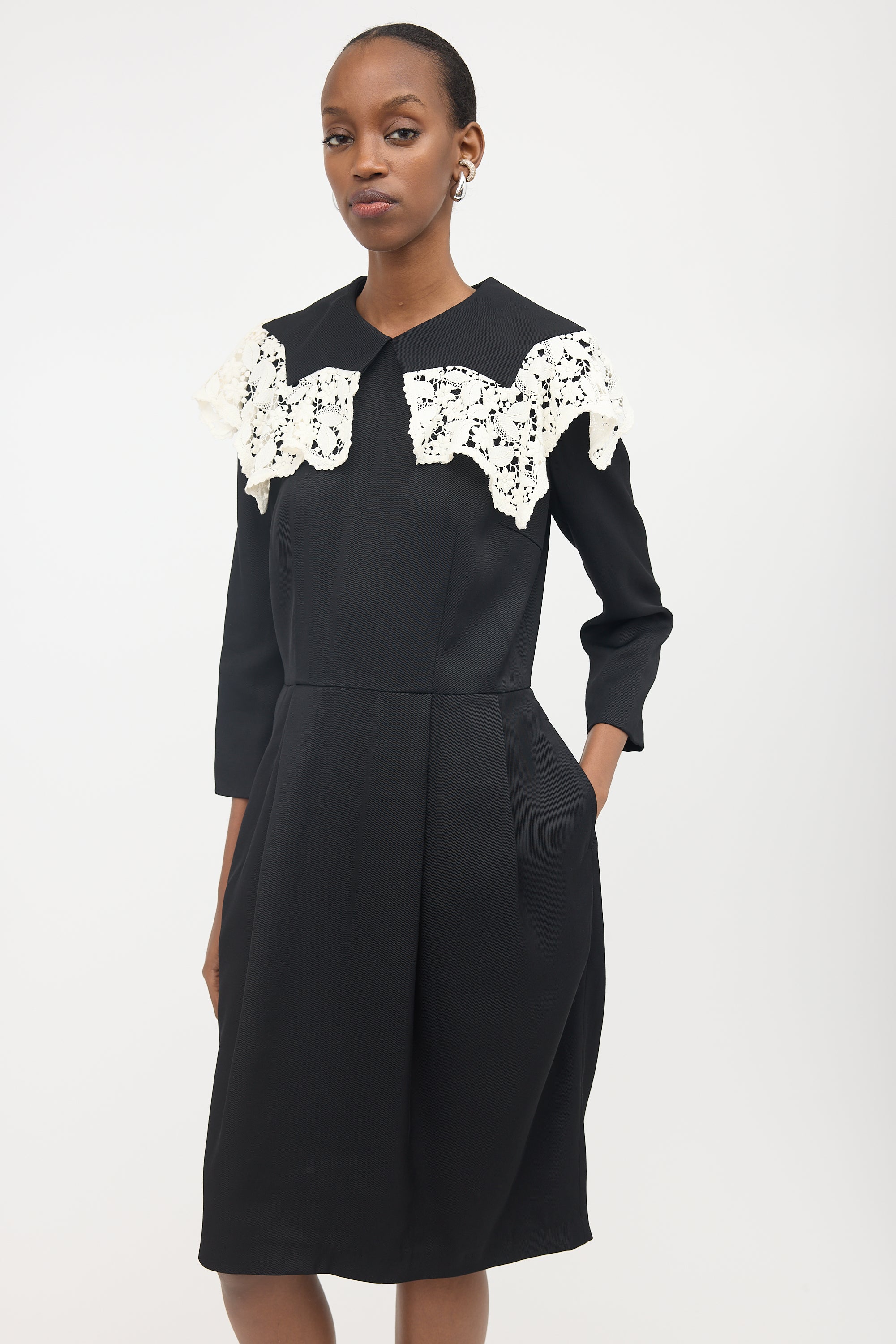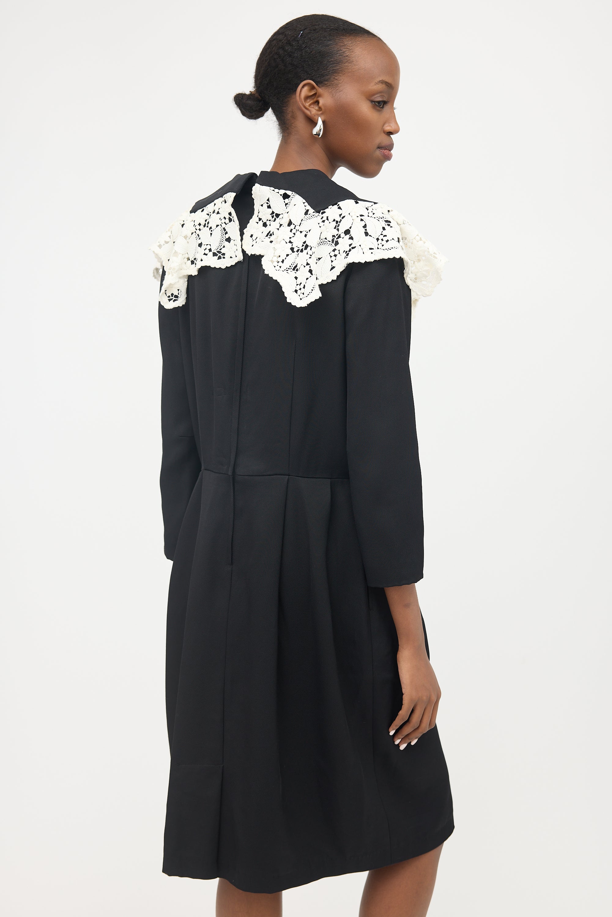 Pre-owned Comme des Garçons black gabardine midi dress featuring a wide collar with white lace trim, concealed side zip, and in seam pockets. Lined.
