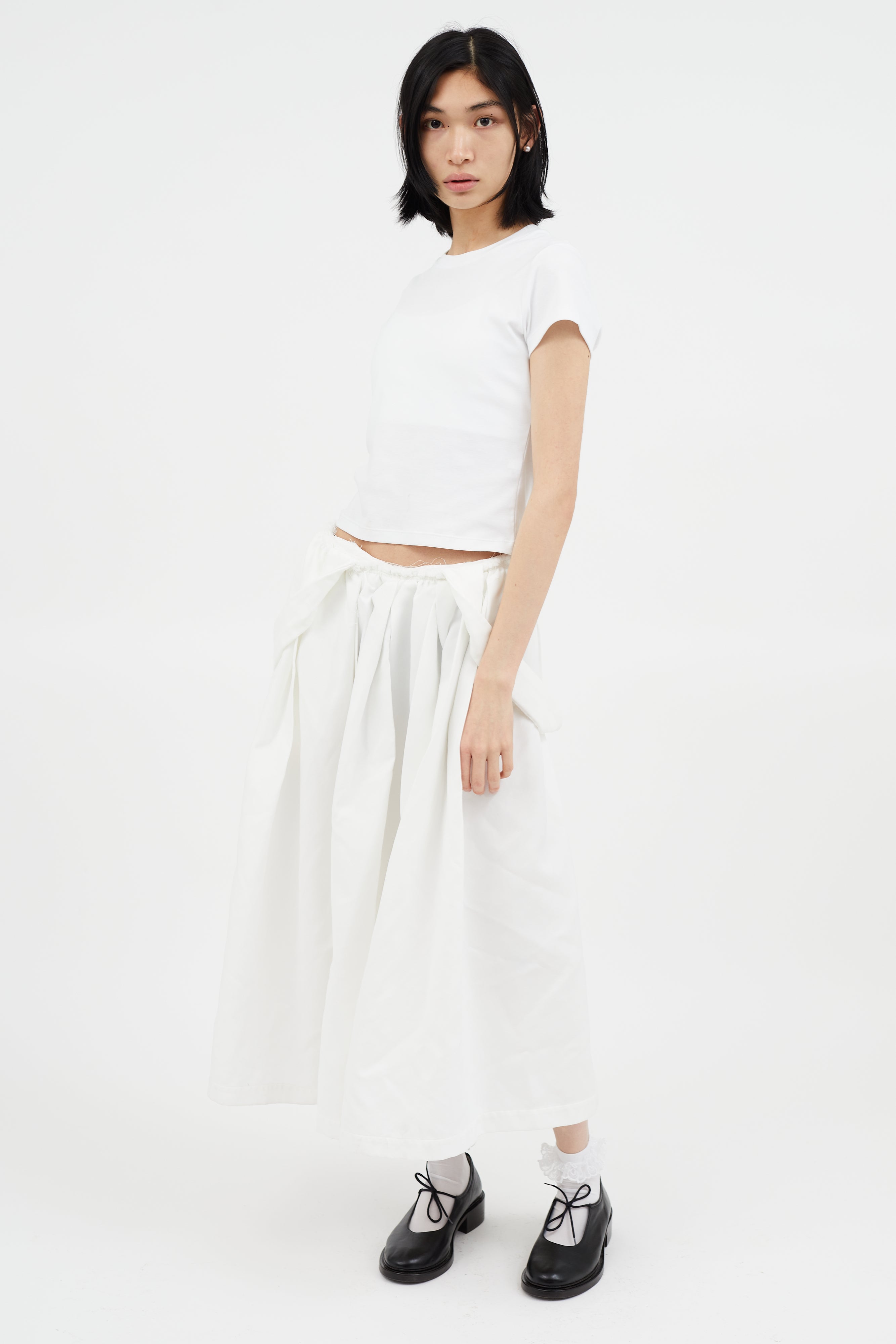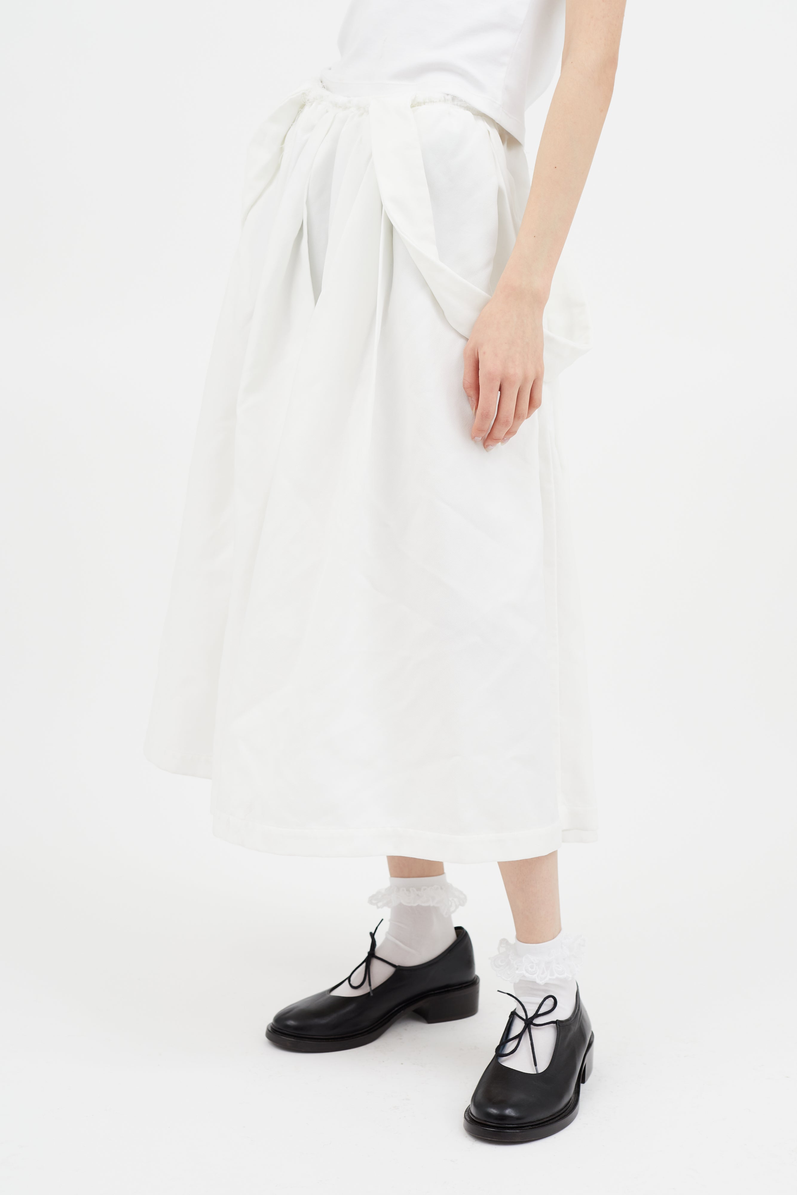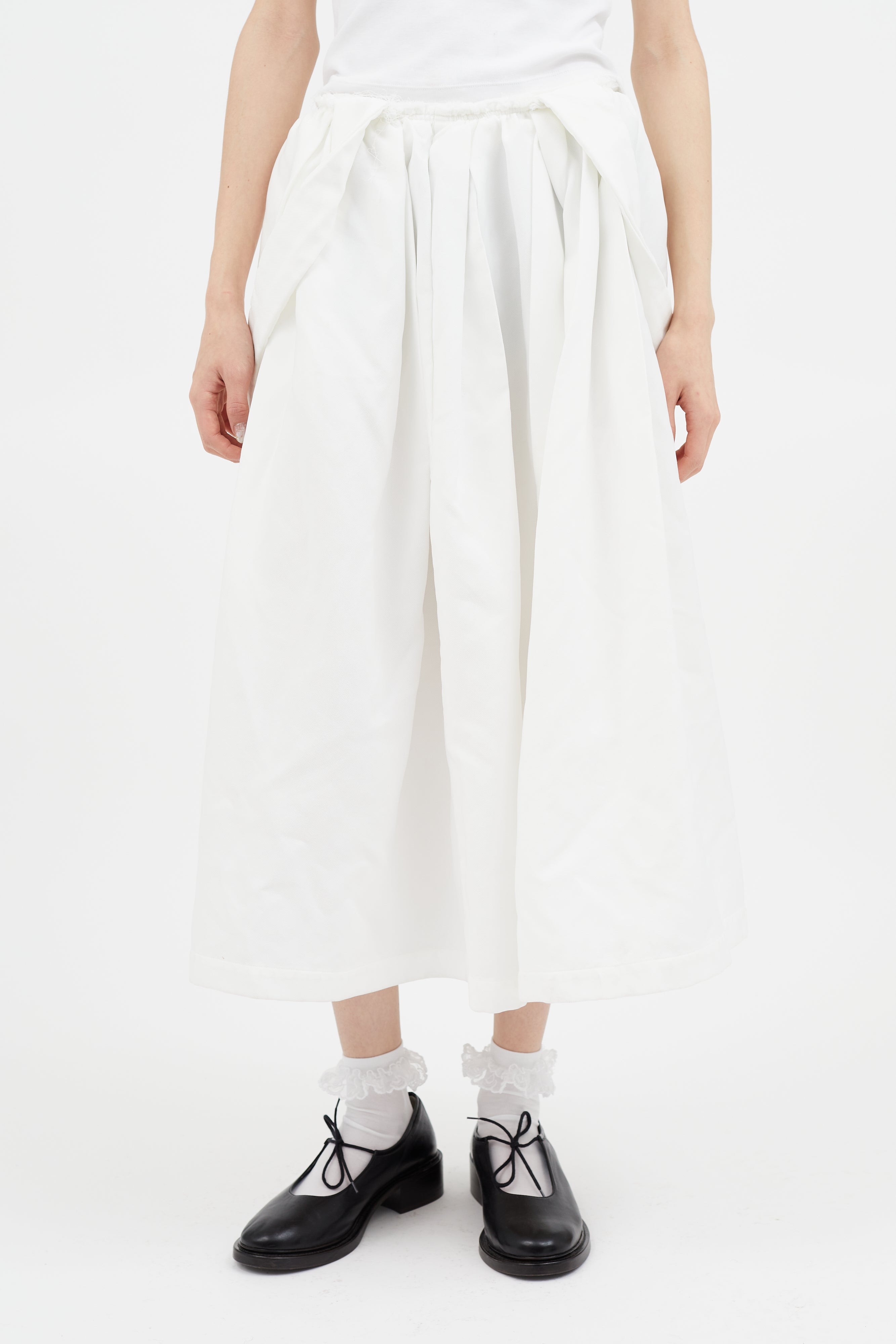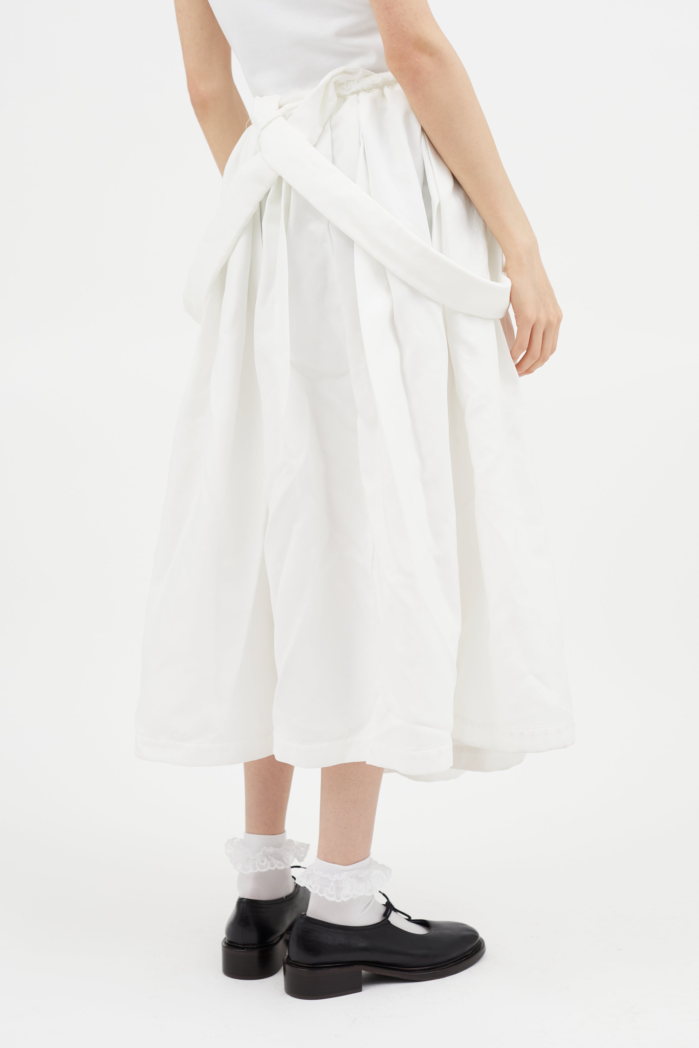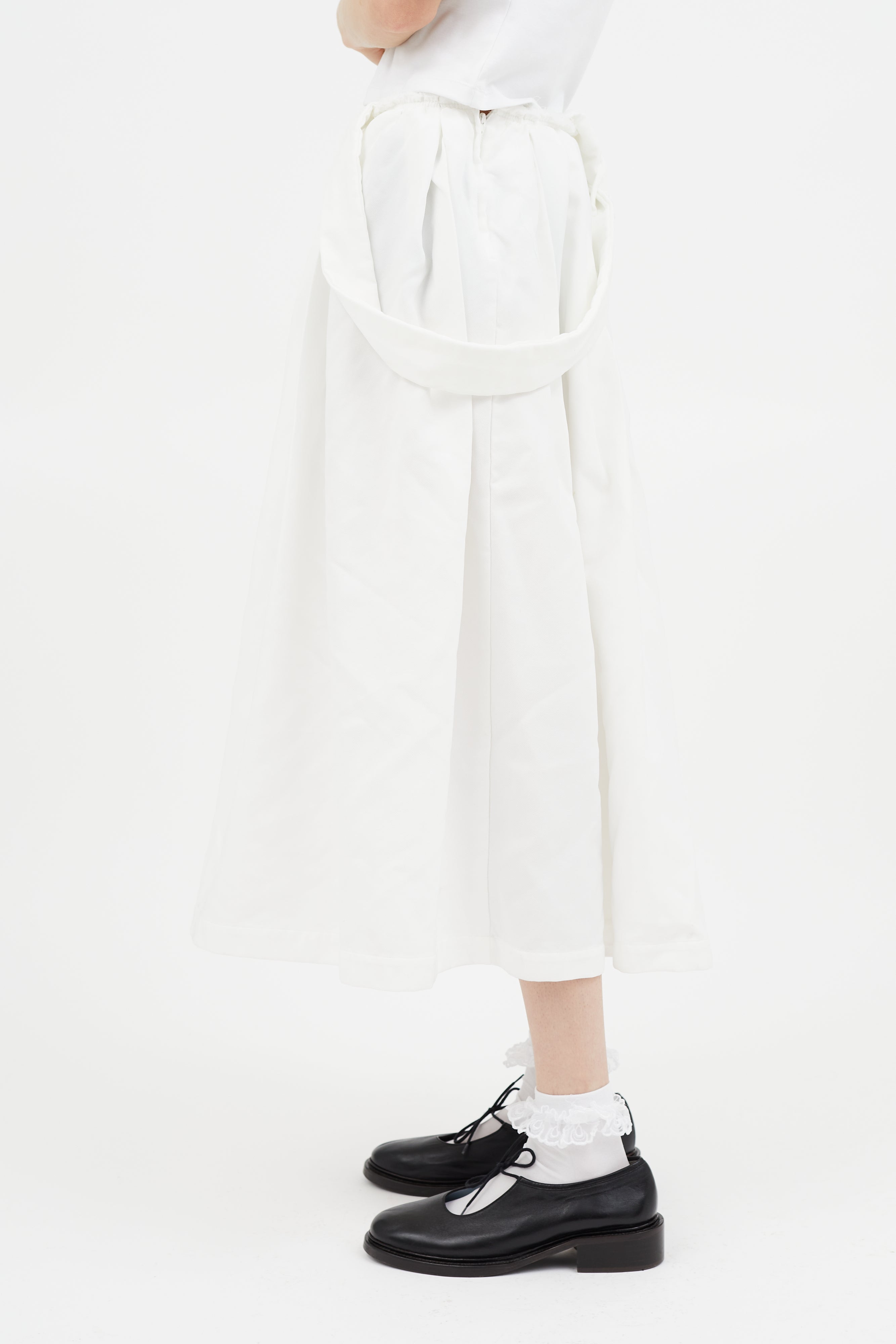 Pre-owned Comme des Garçons white flared skirt featuring raw hem at waistband, attached suspenders concealed zip closure at side, and one hip pocket. Clipped to fit model.