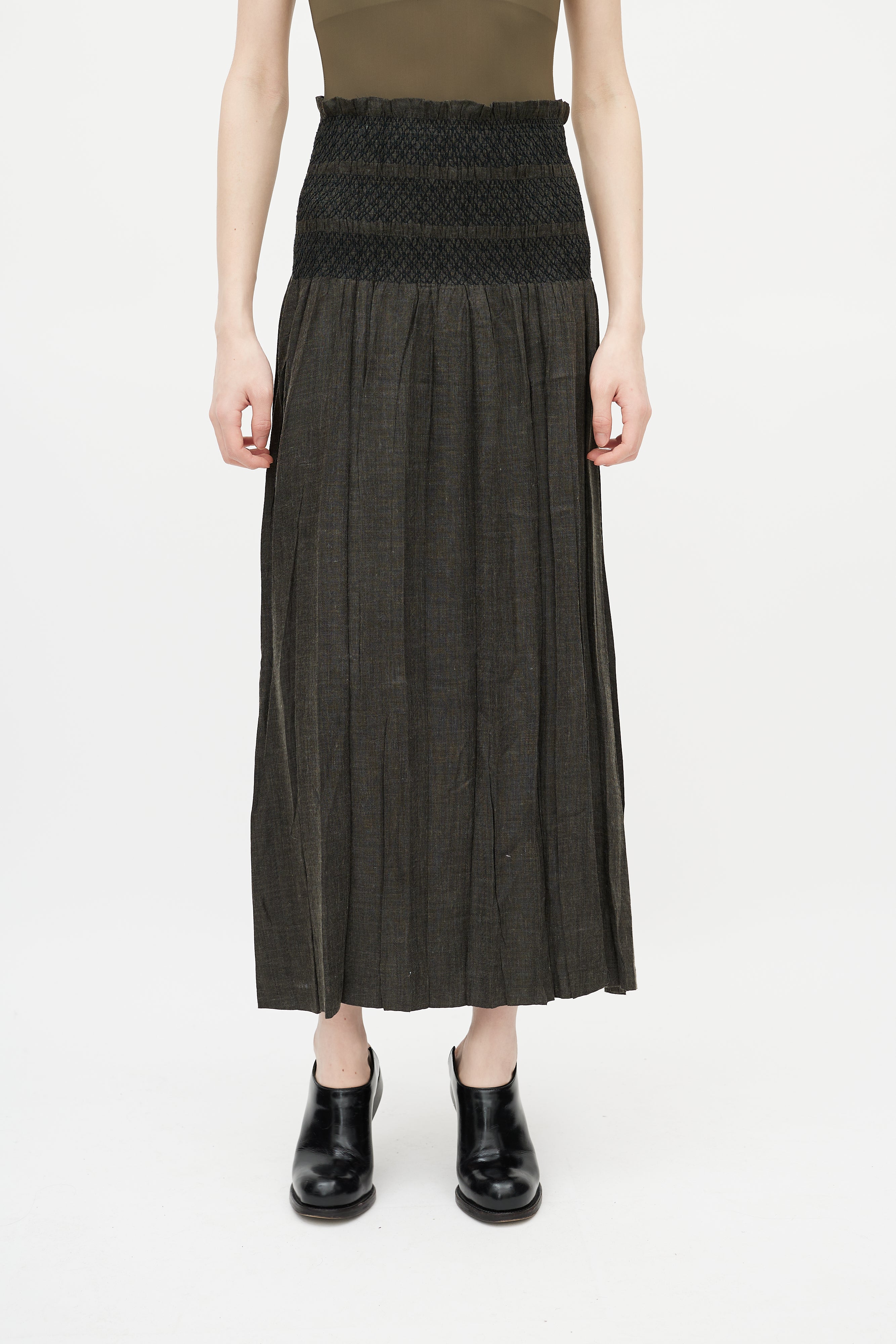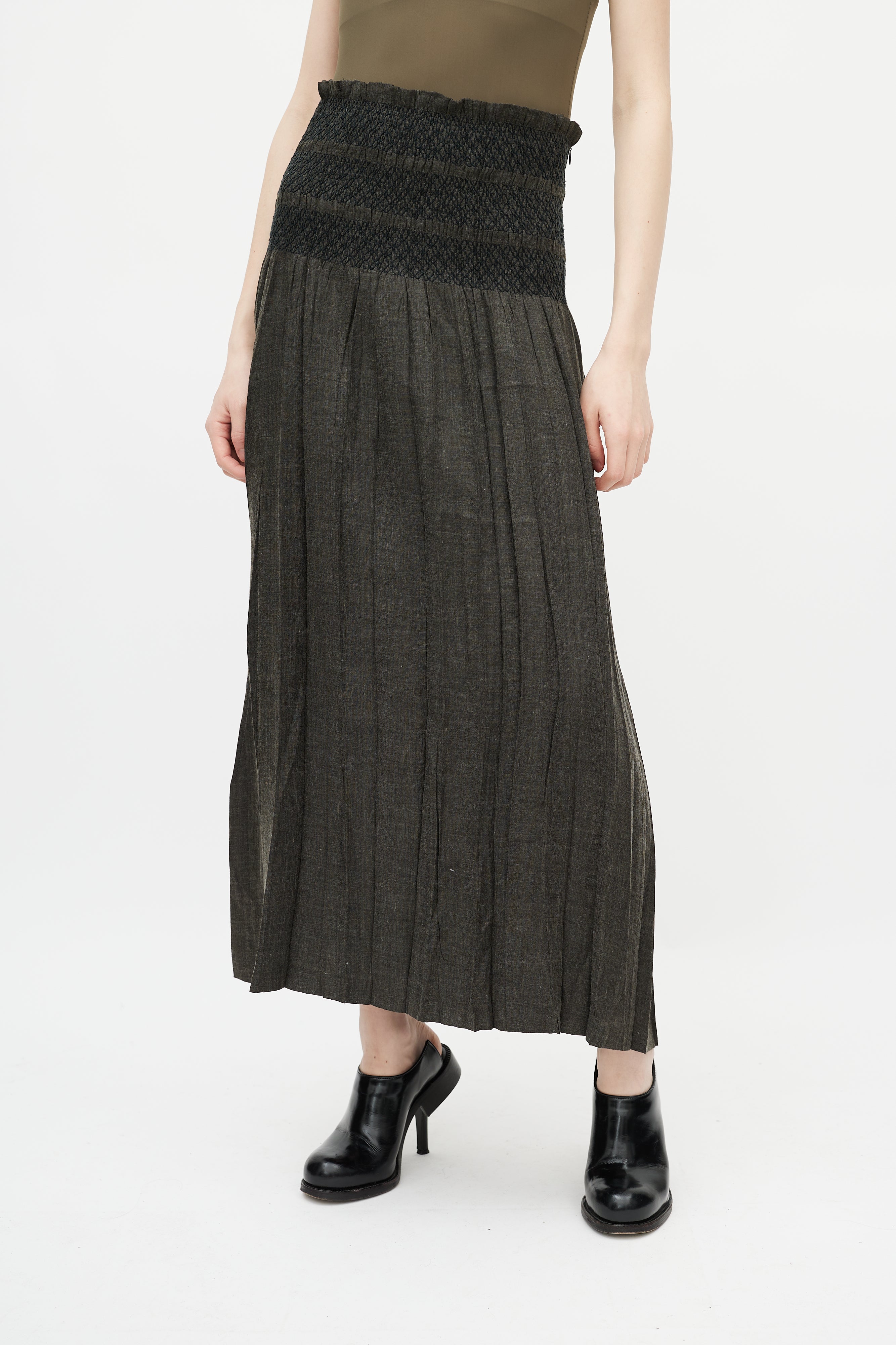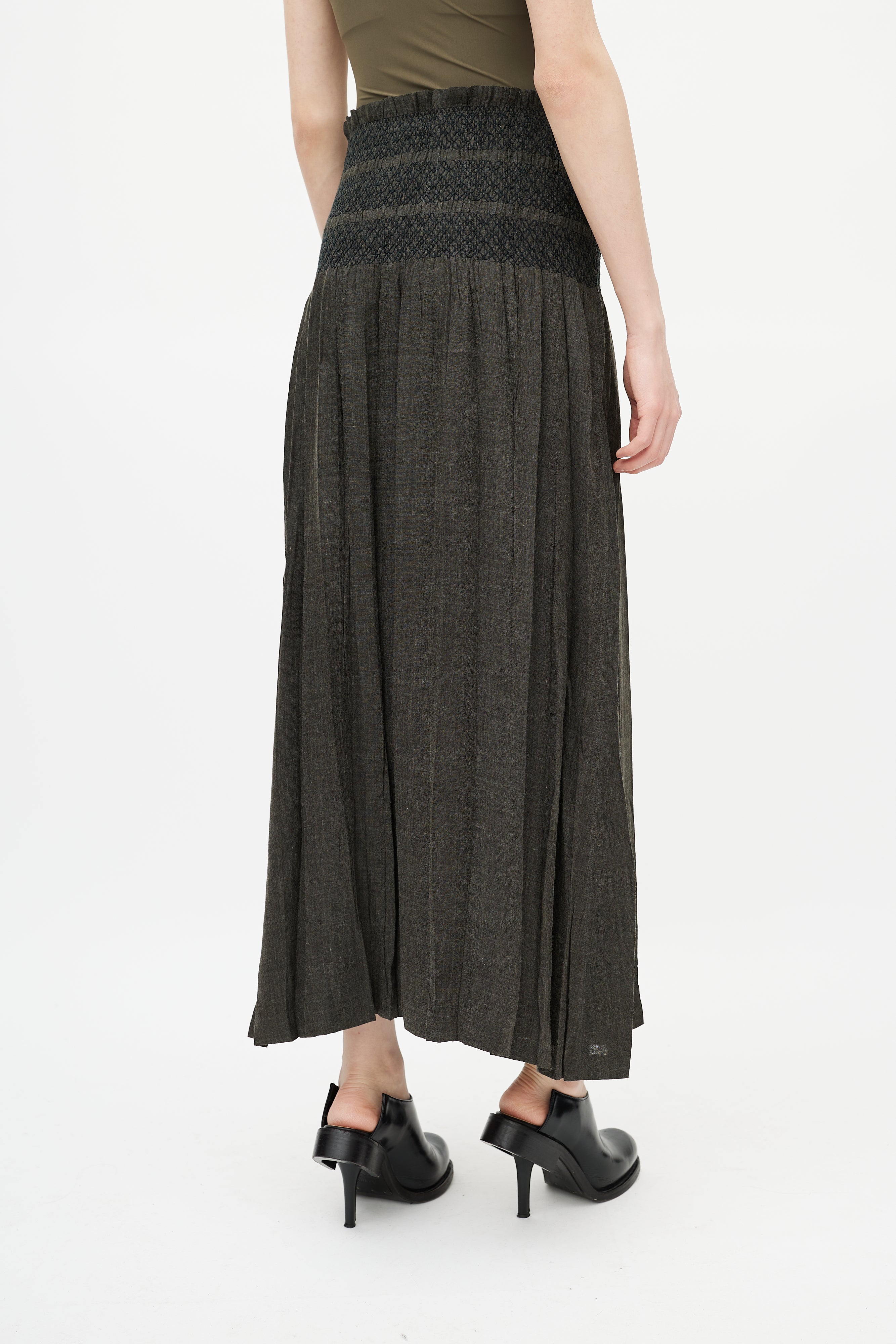 Pre-owned Issey Miyake grey skirt featuring elasticized waist, shirring at waist with black embroidery, loose pleats, and zip closure at side. Clipped to fit model.