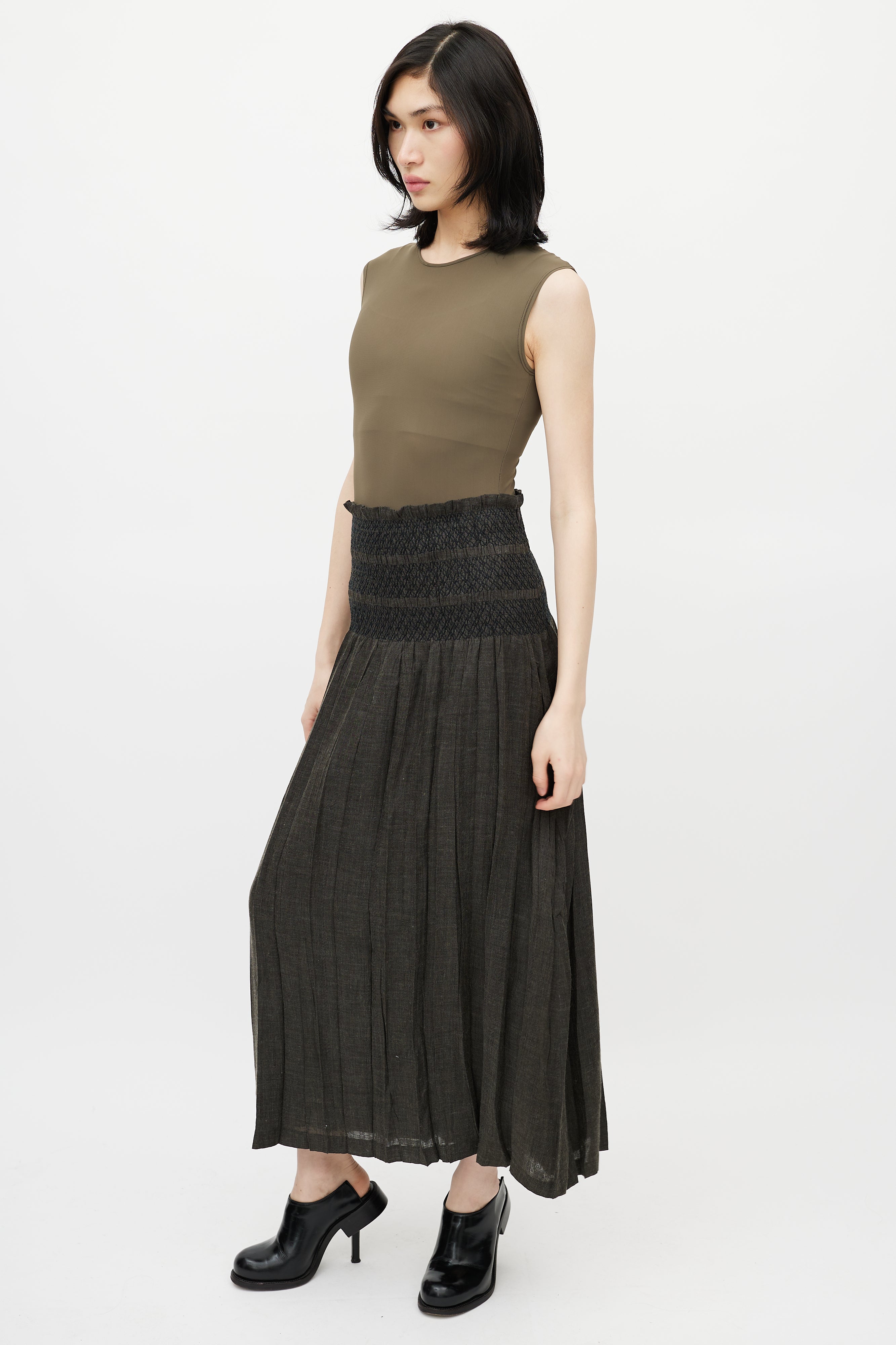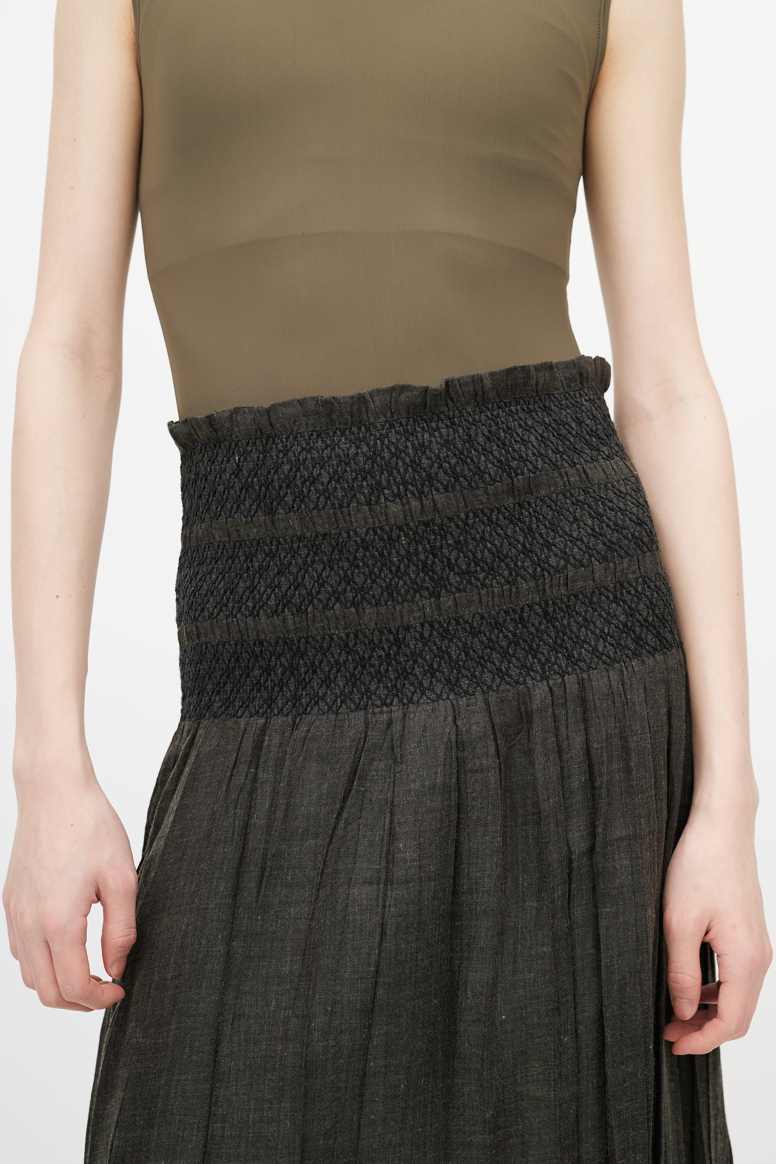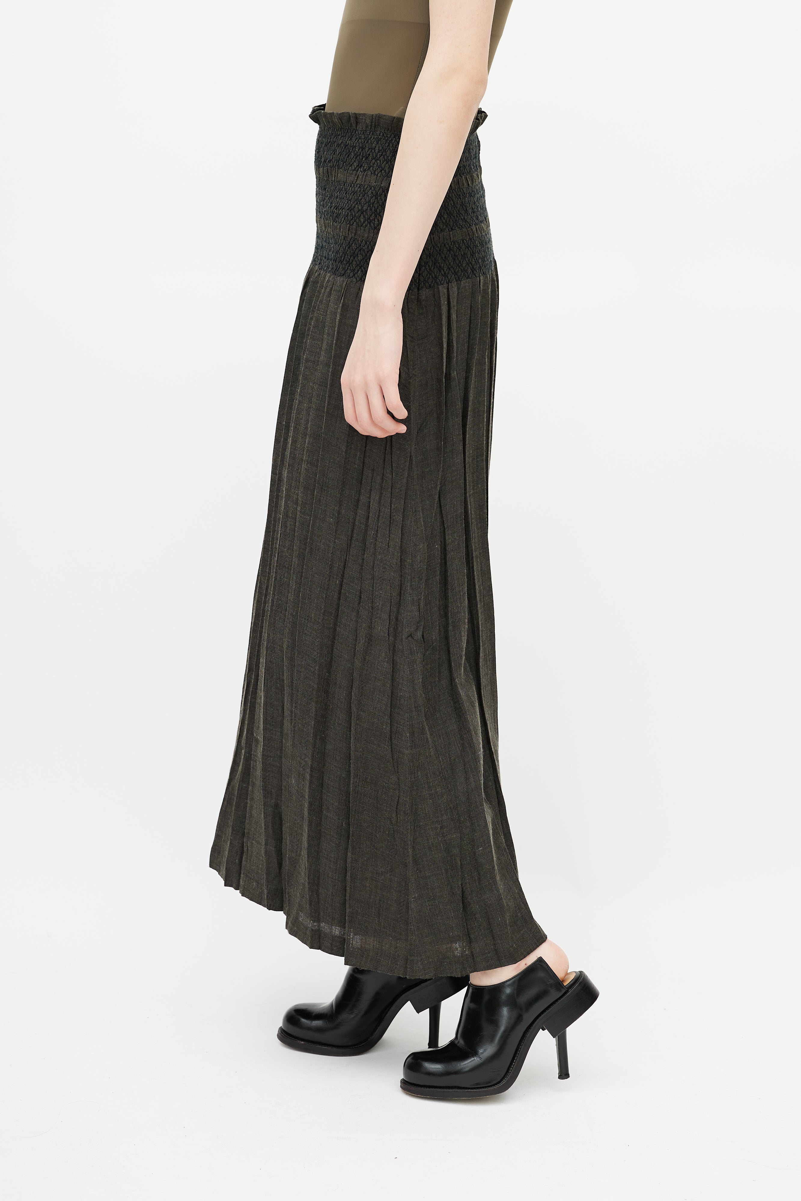 Pre-owned Issey Miyake grey skirt featuring elasticized waist, shirring at waist with black embroidery, loose pleats, and zip closure at side. Clipped to fit model.