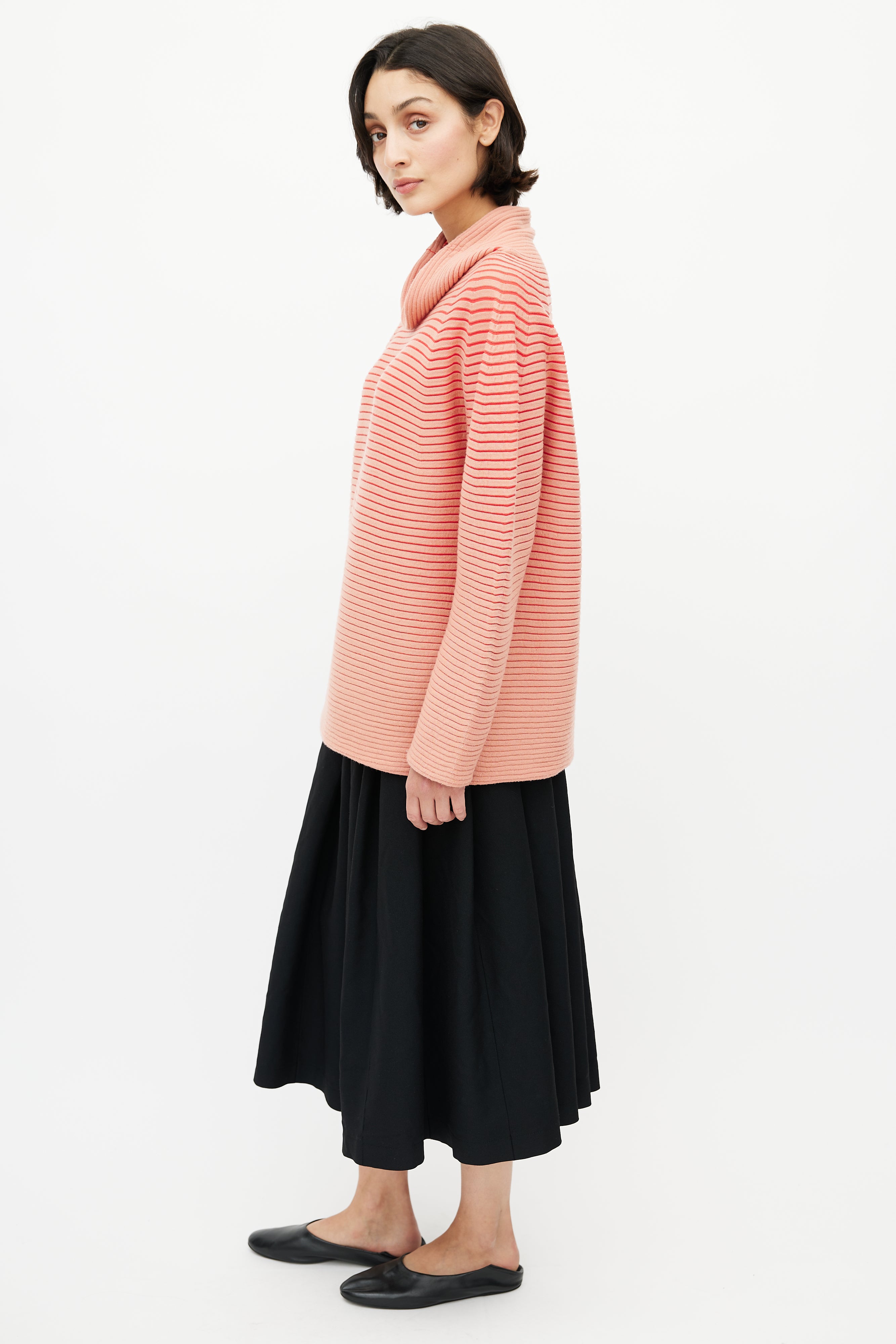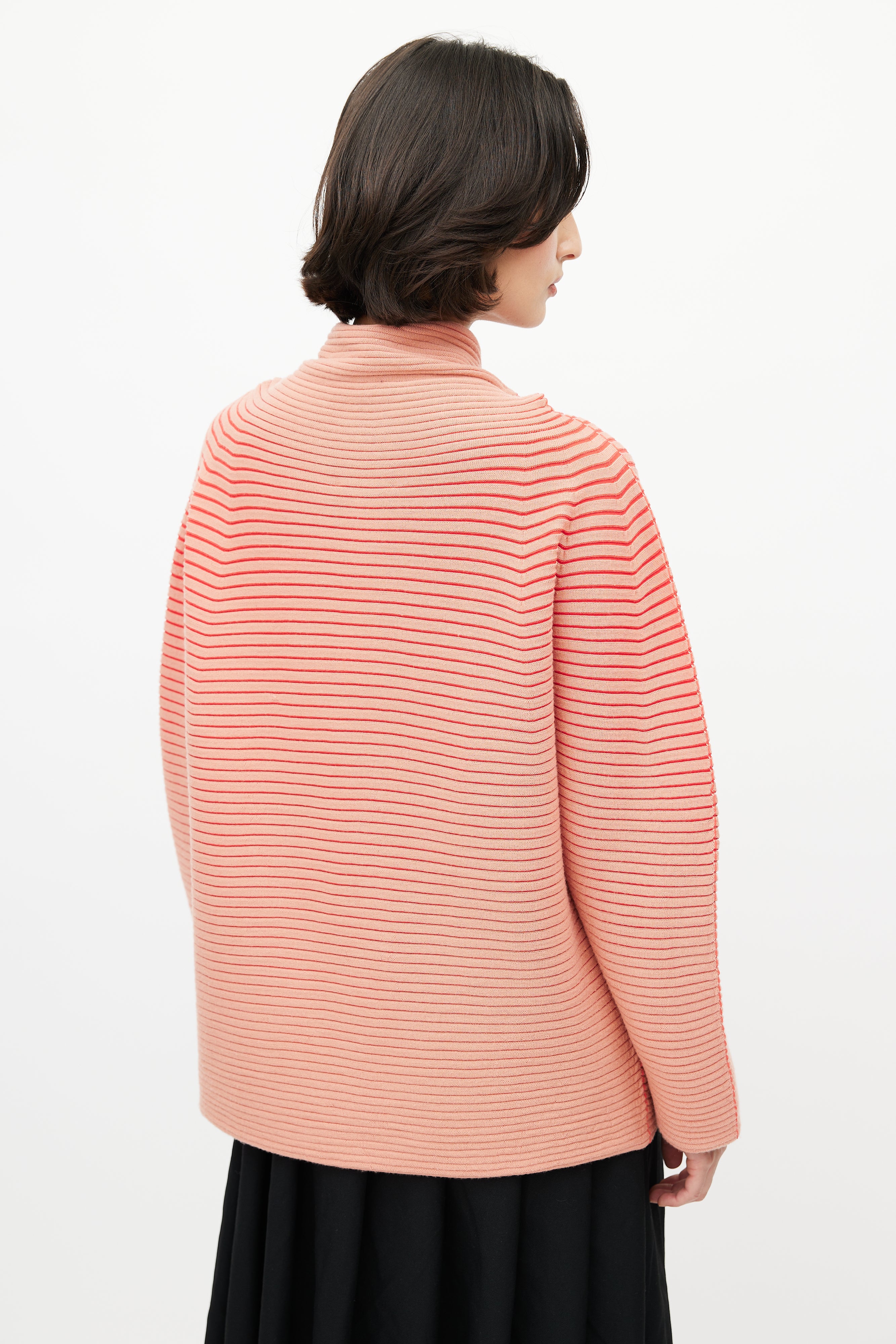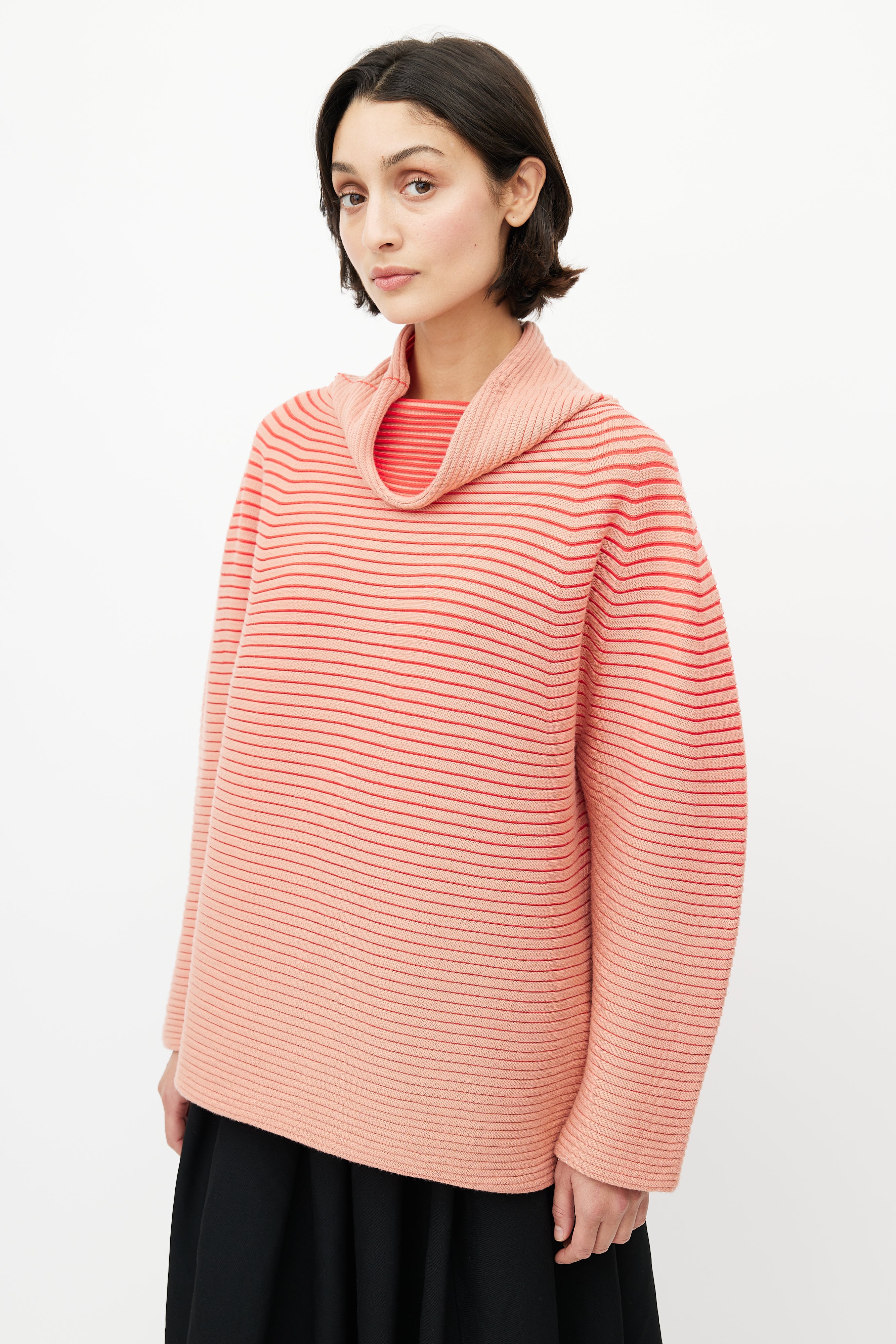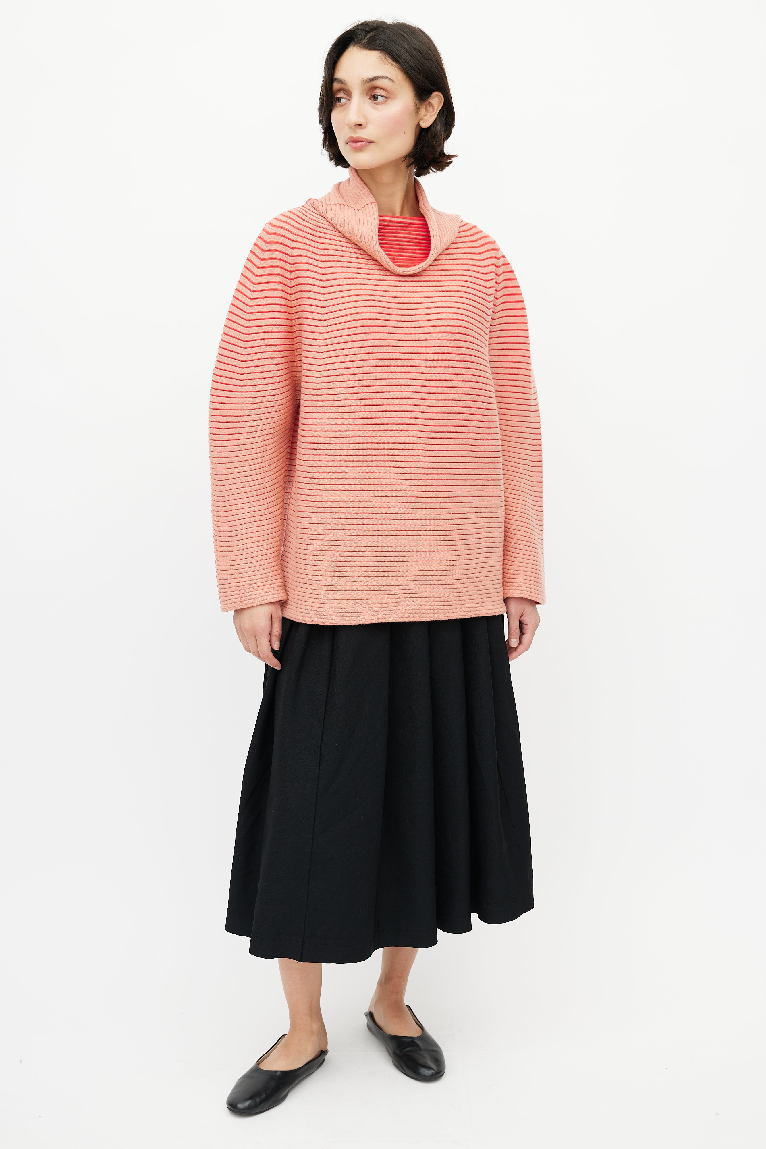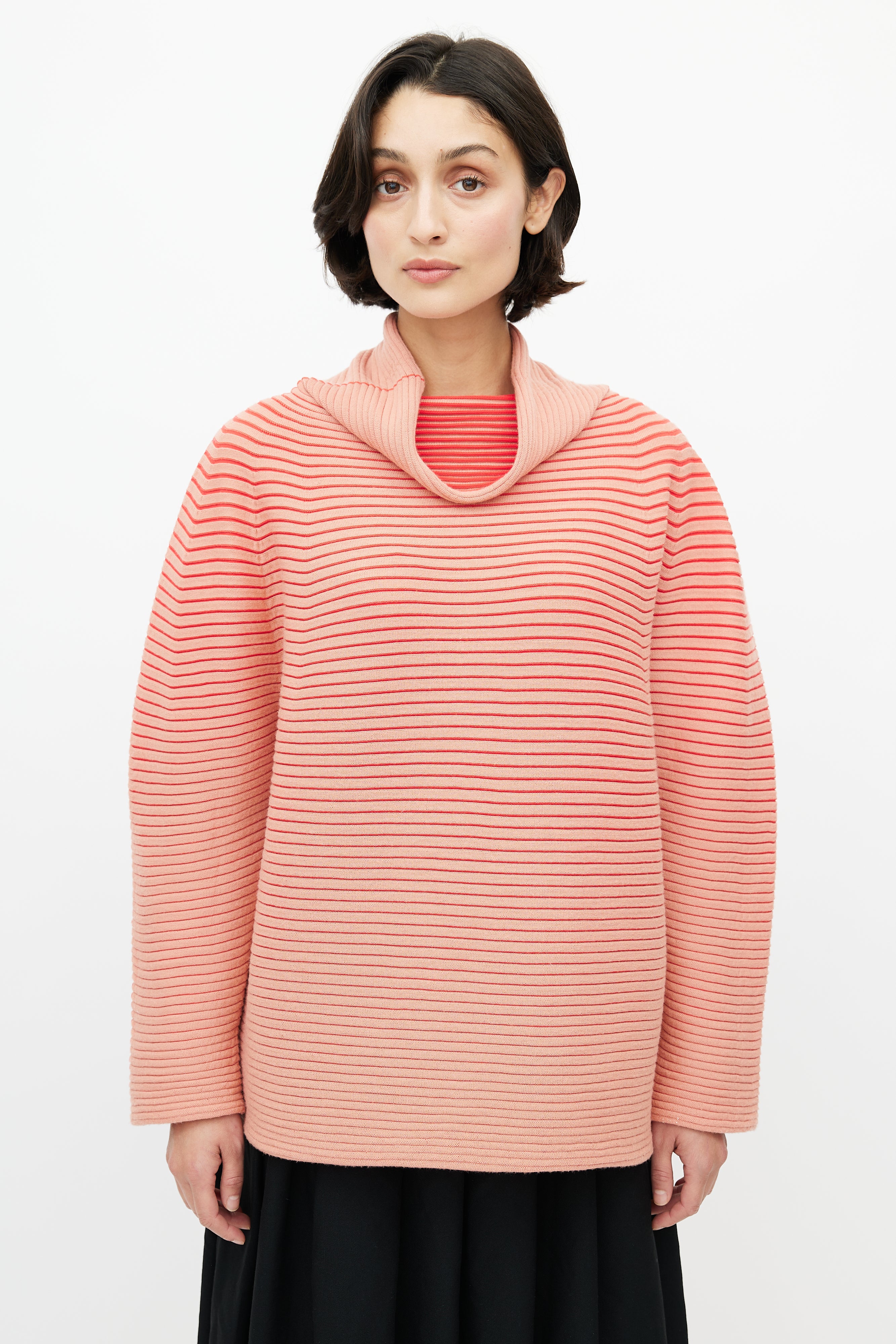 Pre-owned Issey Miyake pink sweater featuring a striped ribbed pleating throughout, cowl neck, and drop shoulders.