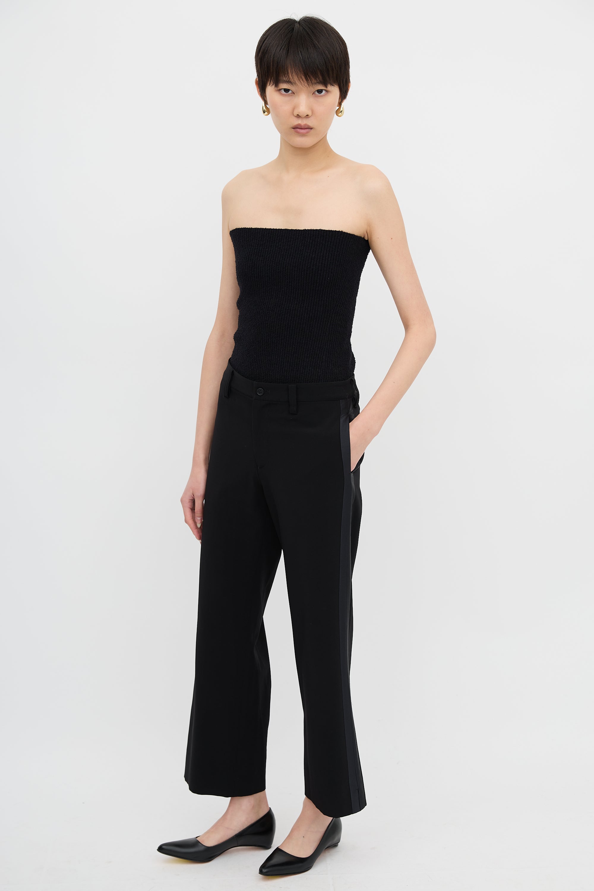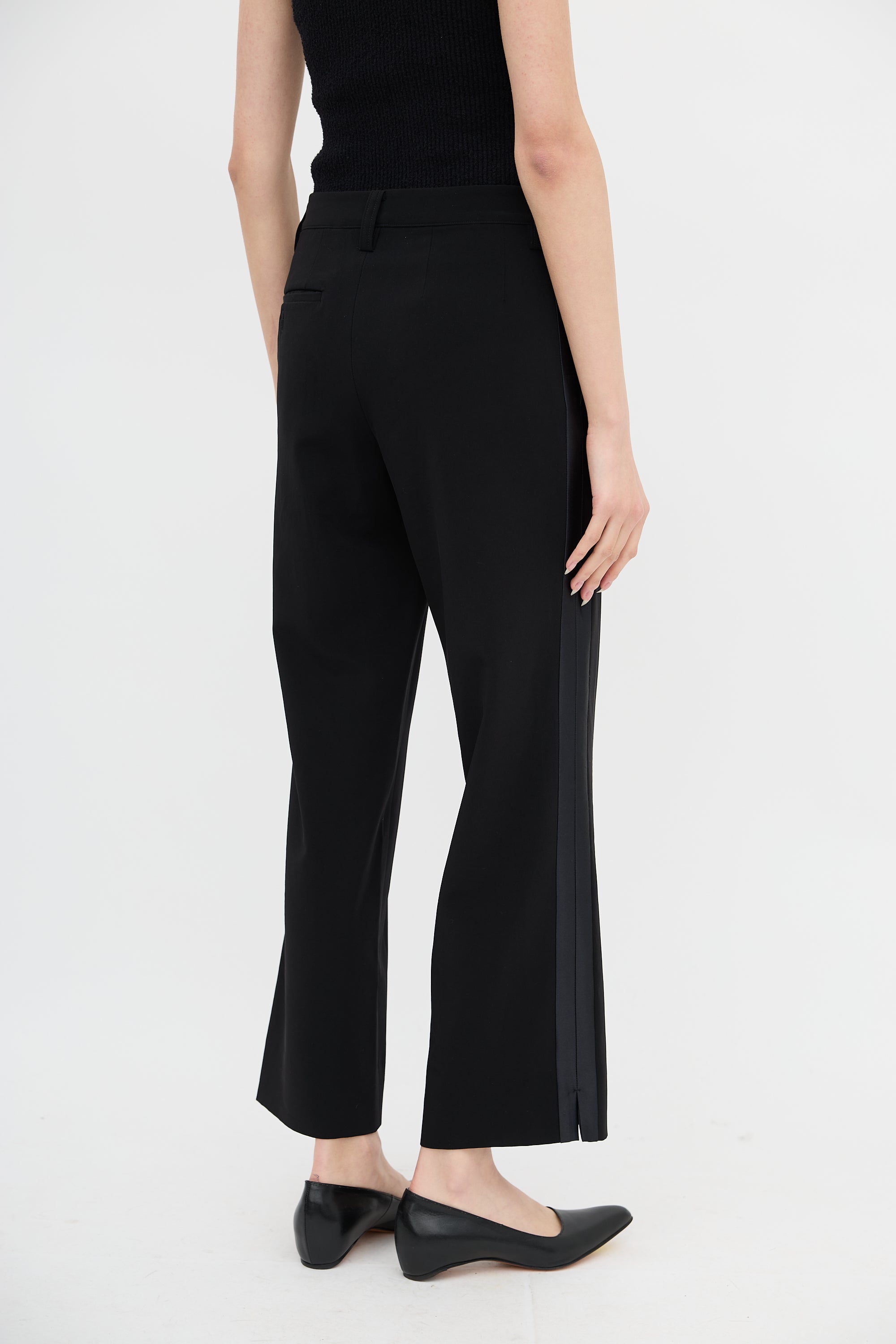 Pre-owned Issey Miyake black trousers featuring straight leg, satin Tuxedo side stripes, four pocket styling, and zip fly.