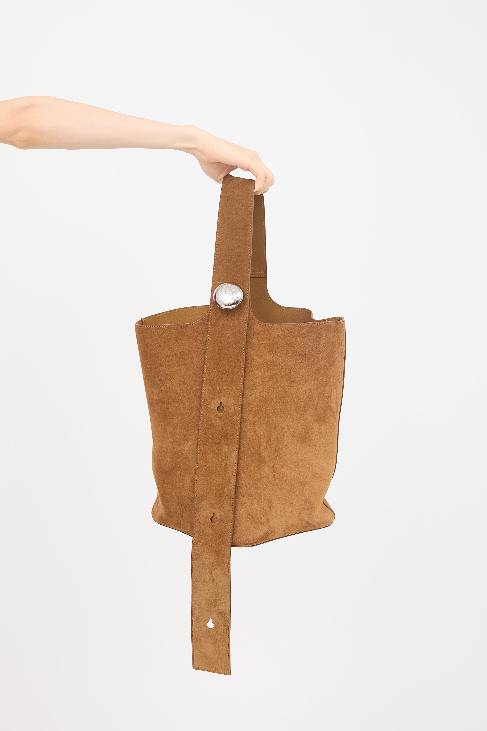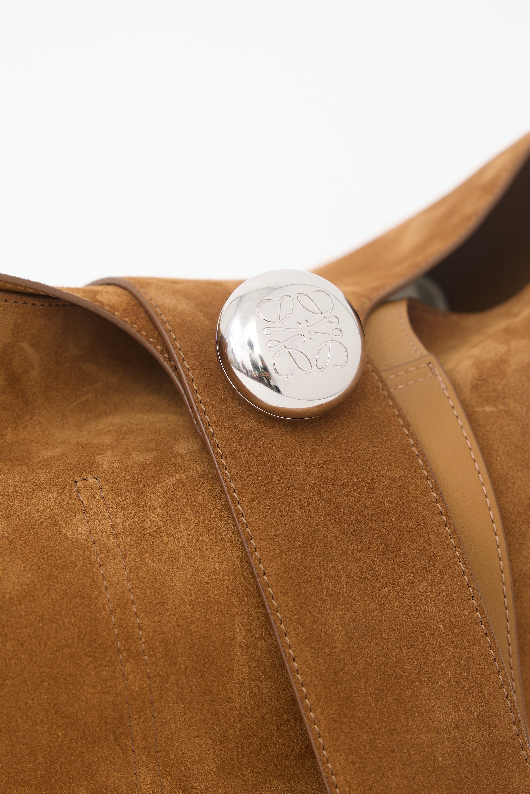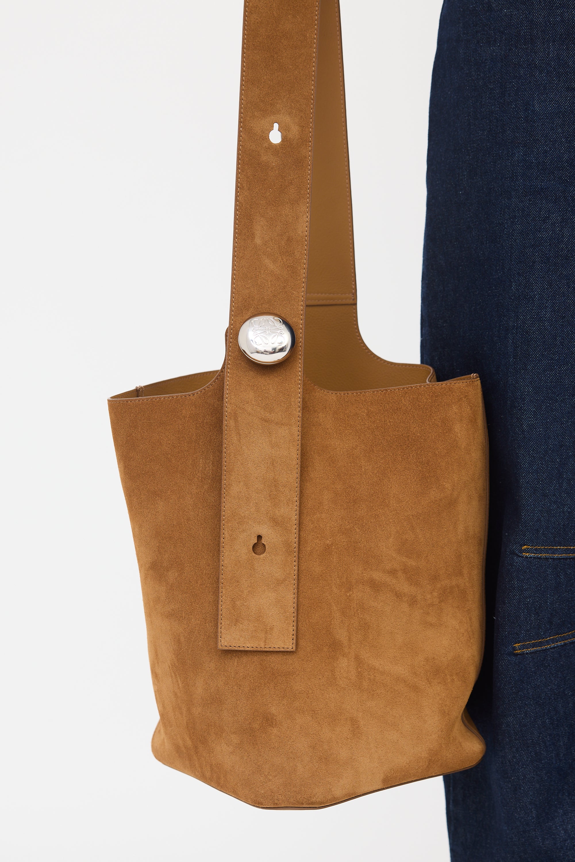 Pre-owned Loewe brown suede large Pebble Bucket bag featuring an adjustable flat shoulder strap, silver tone pin hardware with debossed Anagram logo, open top compartment, and one interior slip pocket. Comes with original dust bag.