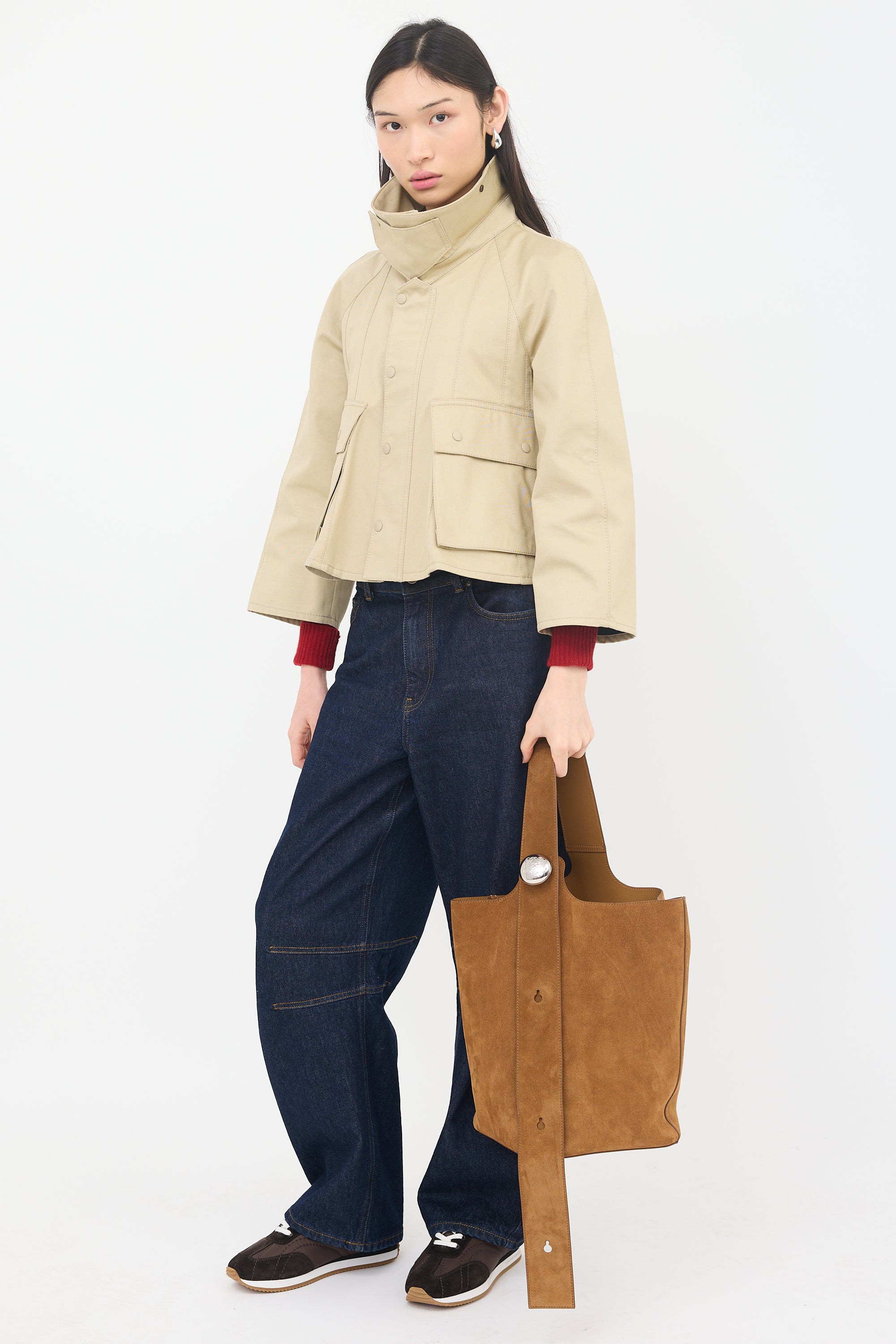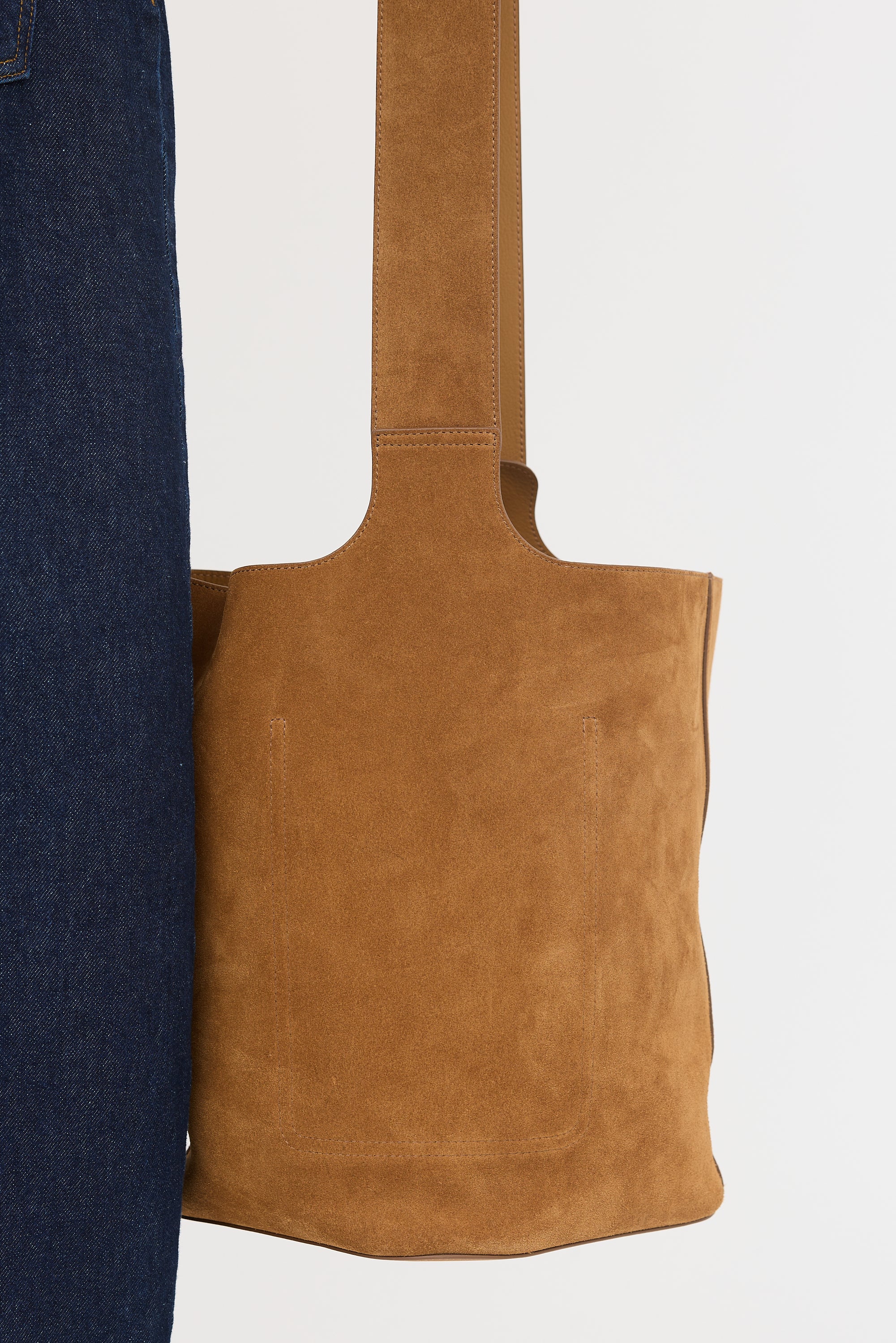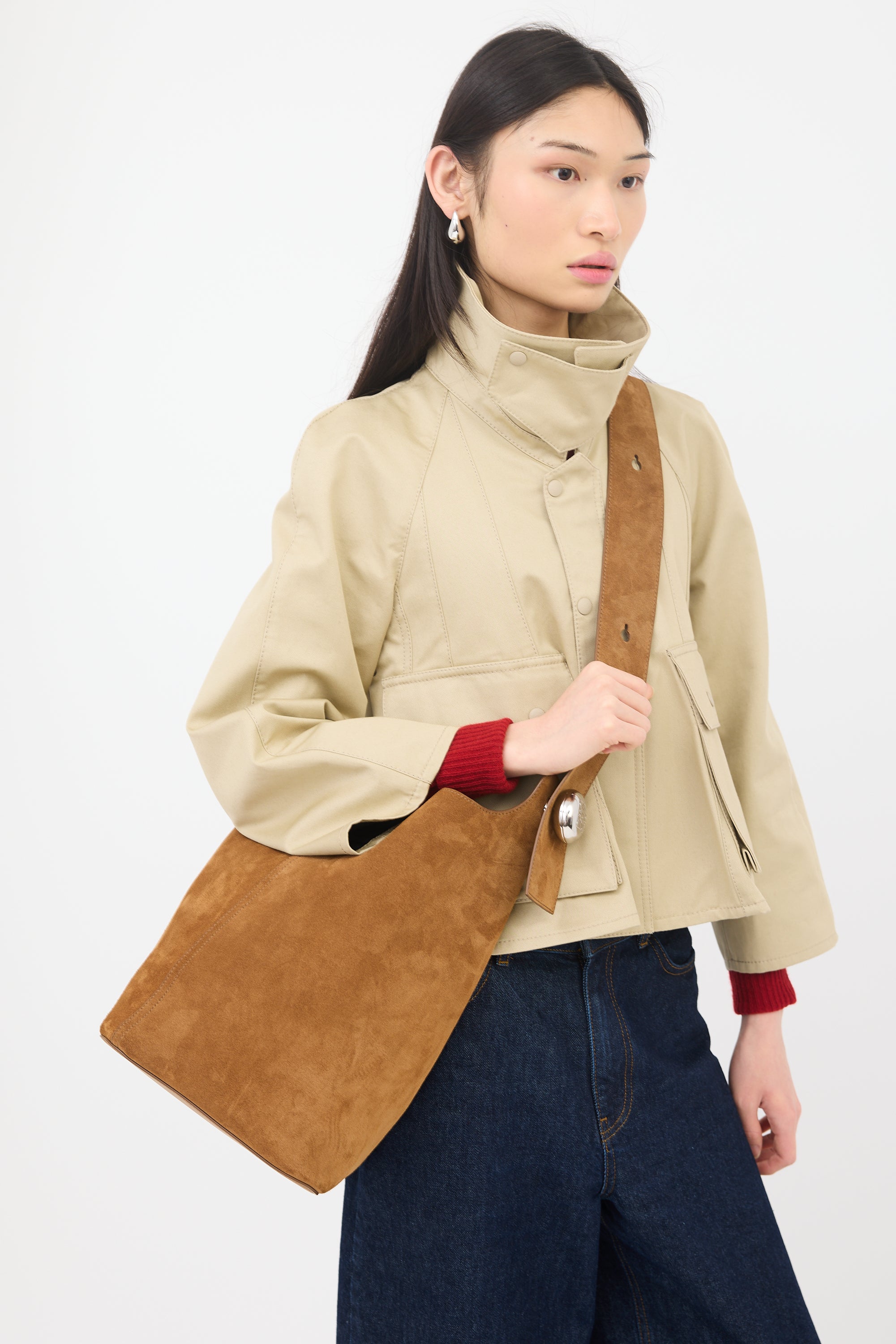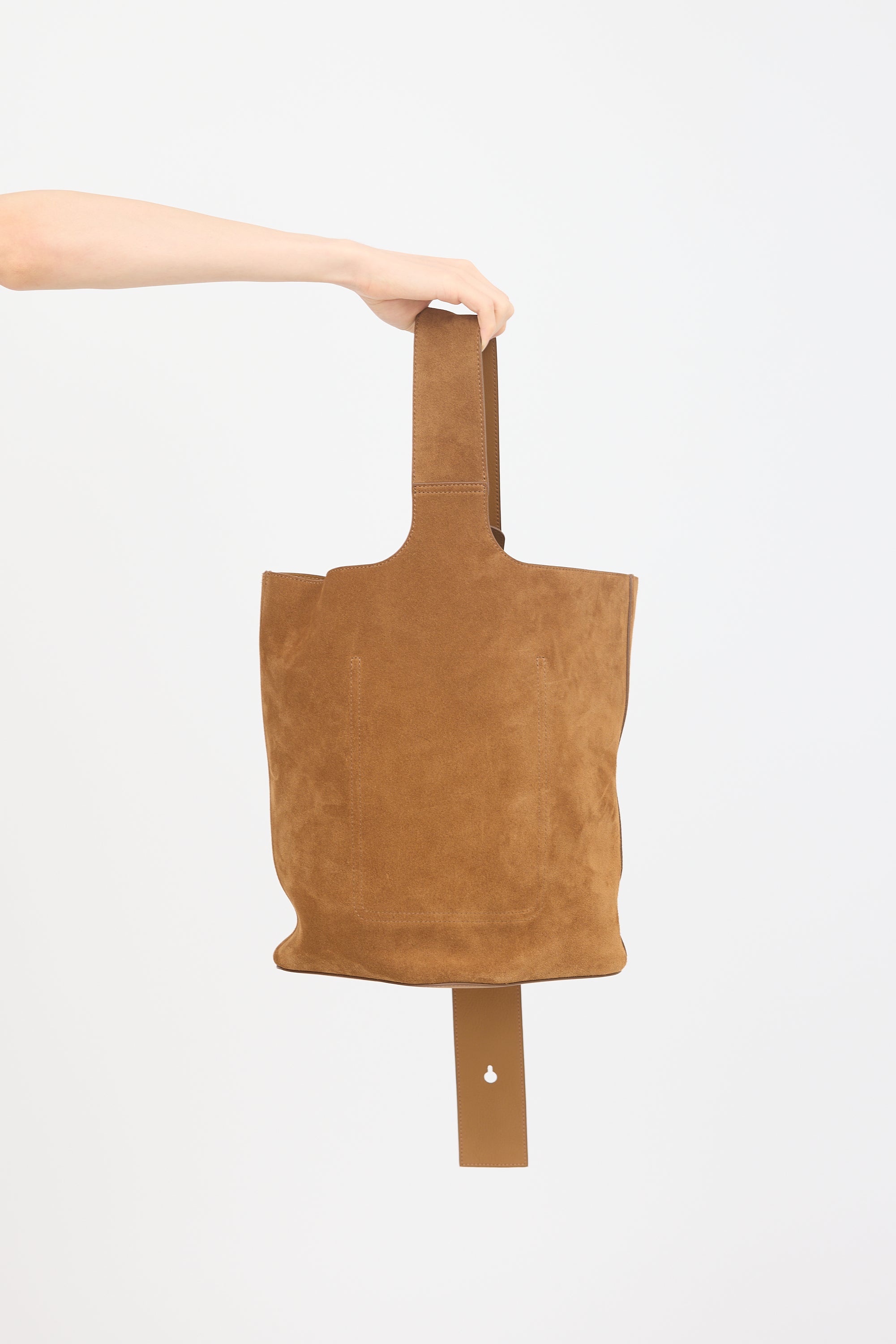 Pre-owned Loewe brown suede large Pebble Bucket bag featuring an adjustable flat shoulder strap, silver tone pin hardware with debossed Anagram logo, open top compartment, and one interior slip pocket. Comes with original dust bag.