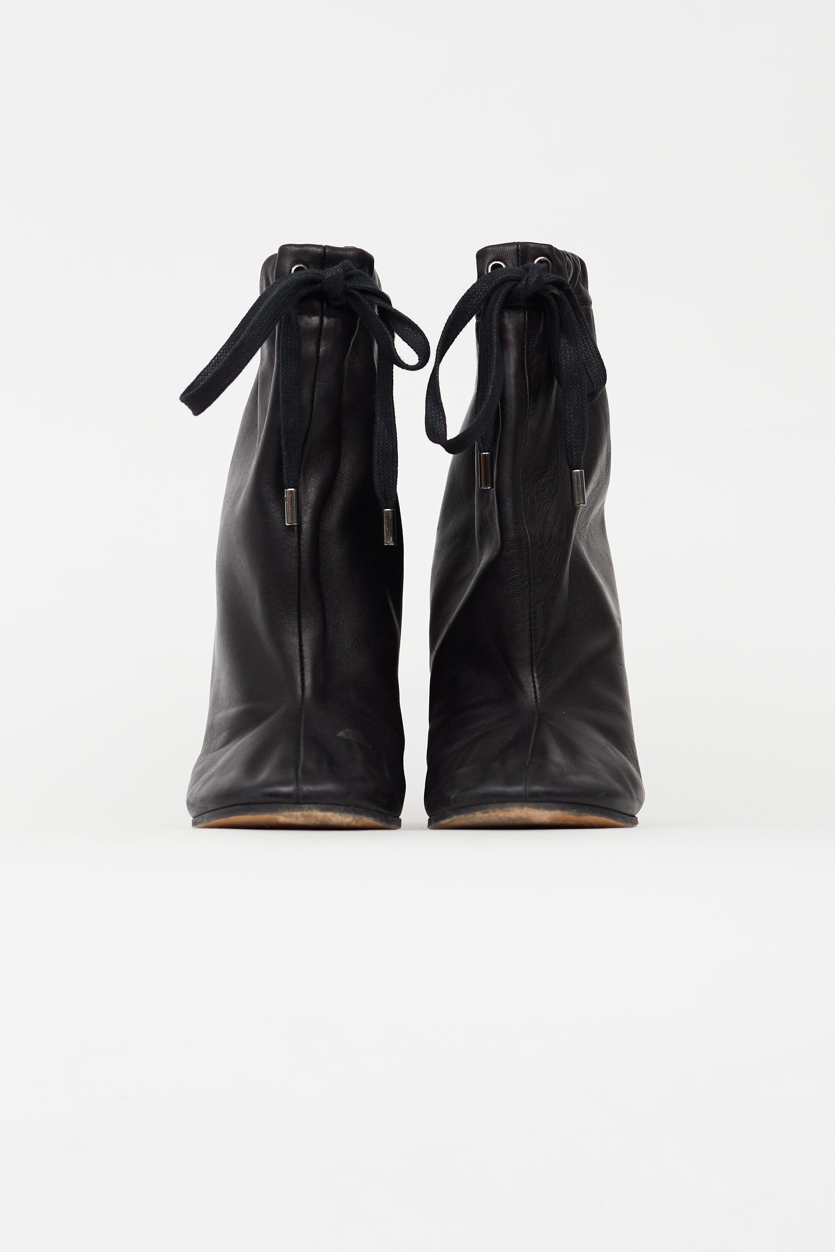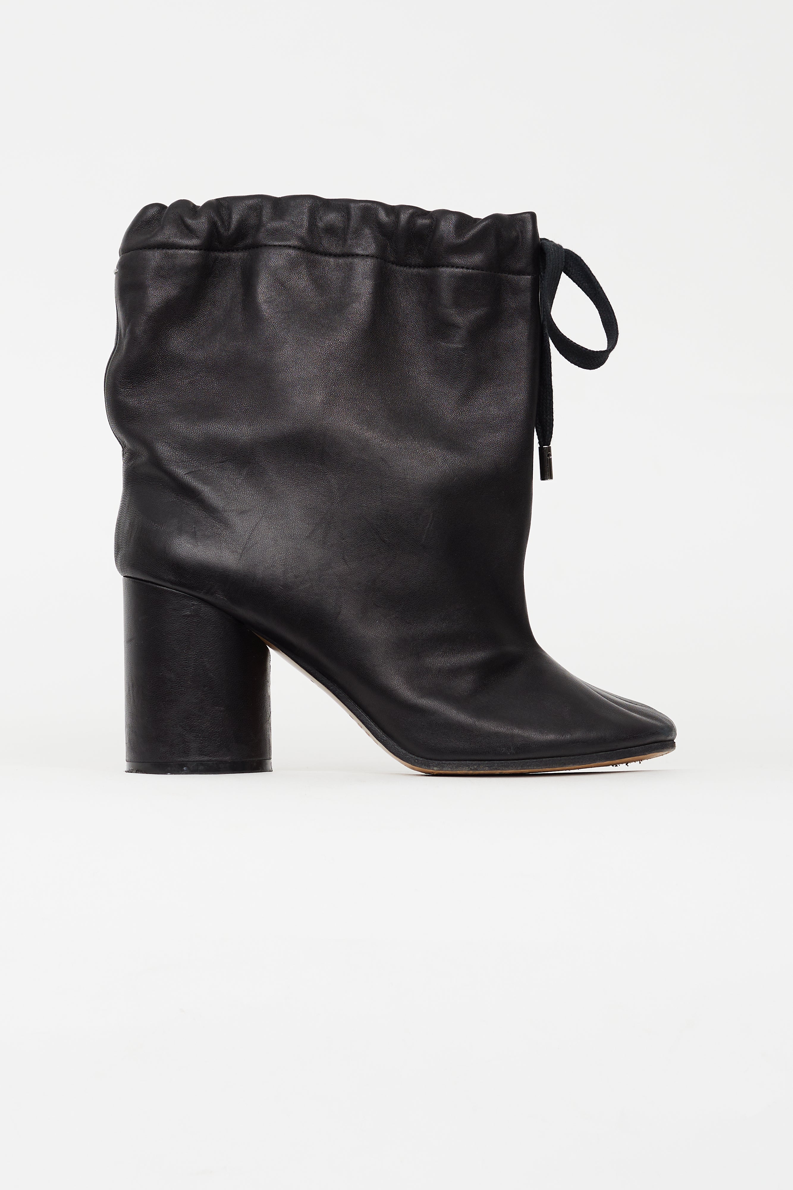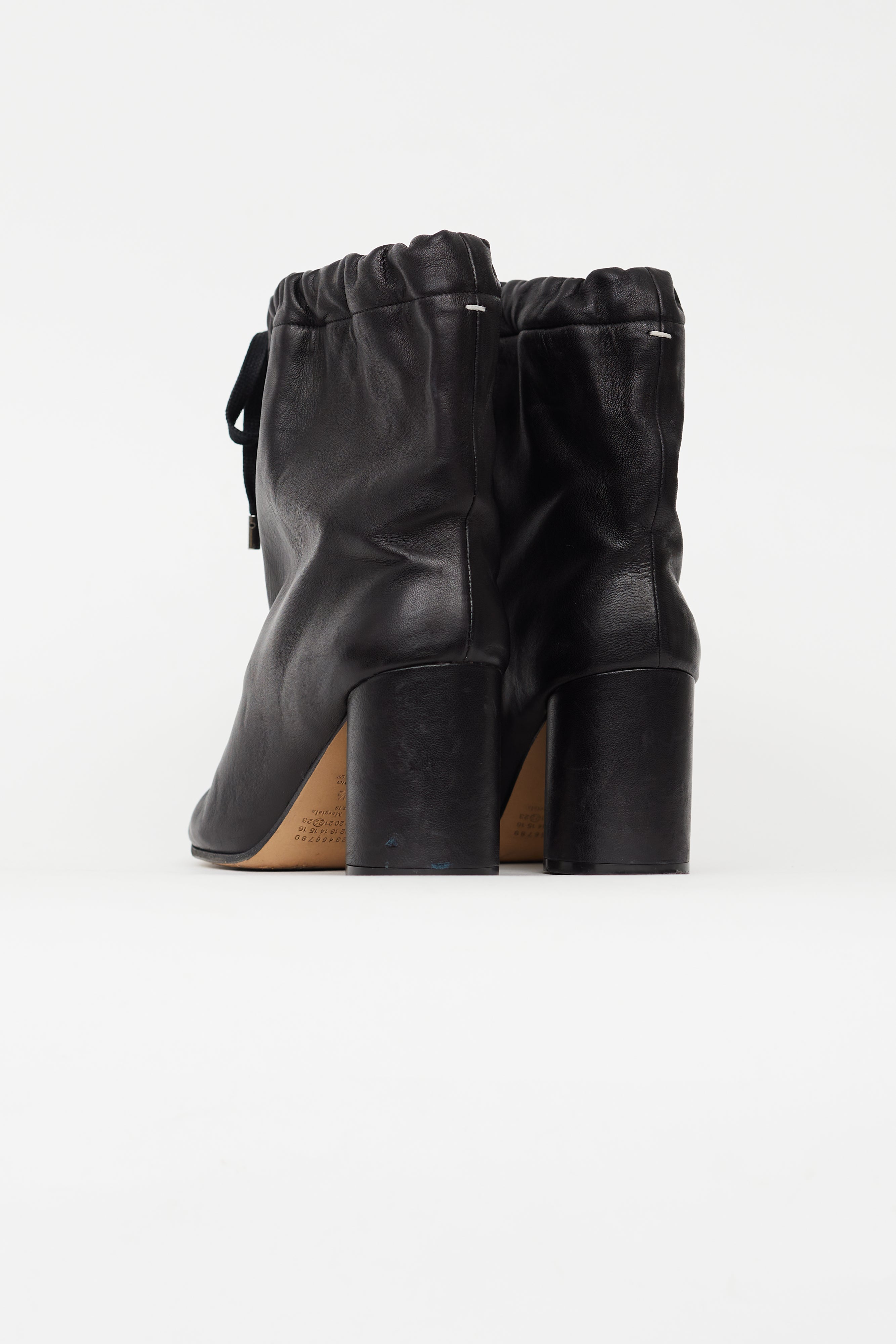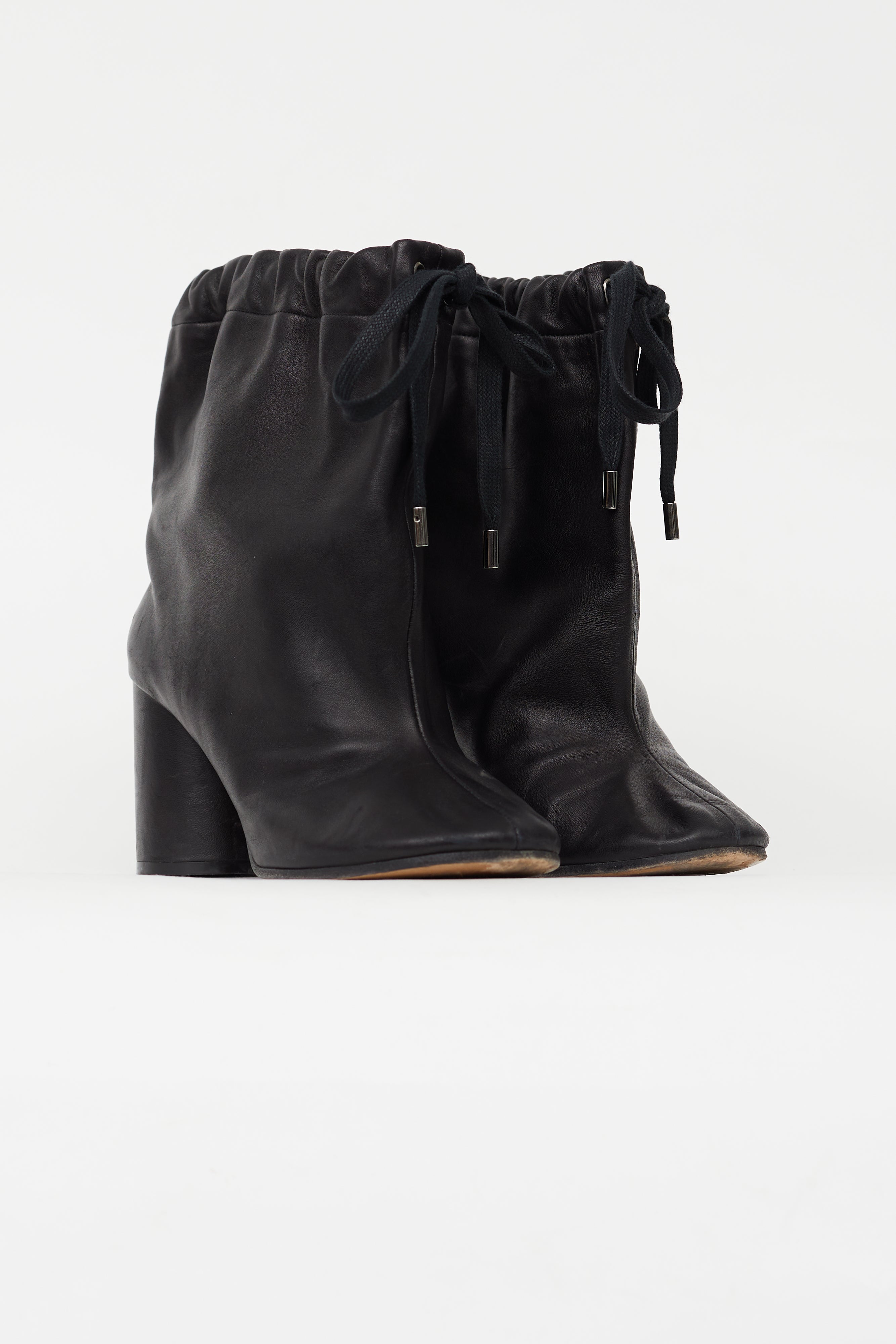 Pre-owned Maison Margiela black leather boots featuring a round toe, wrapped block heel, and shaft with drawstring tie closure.