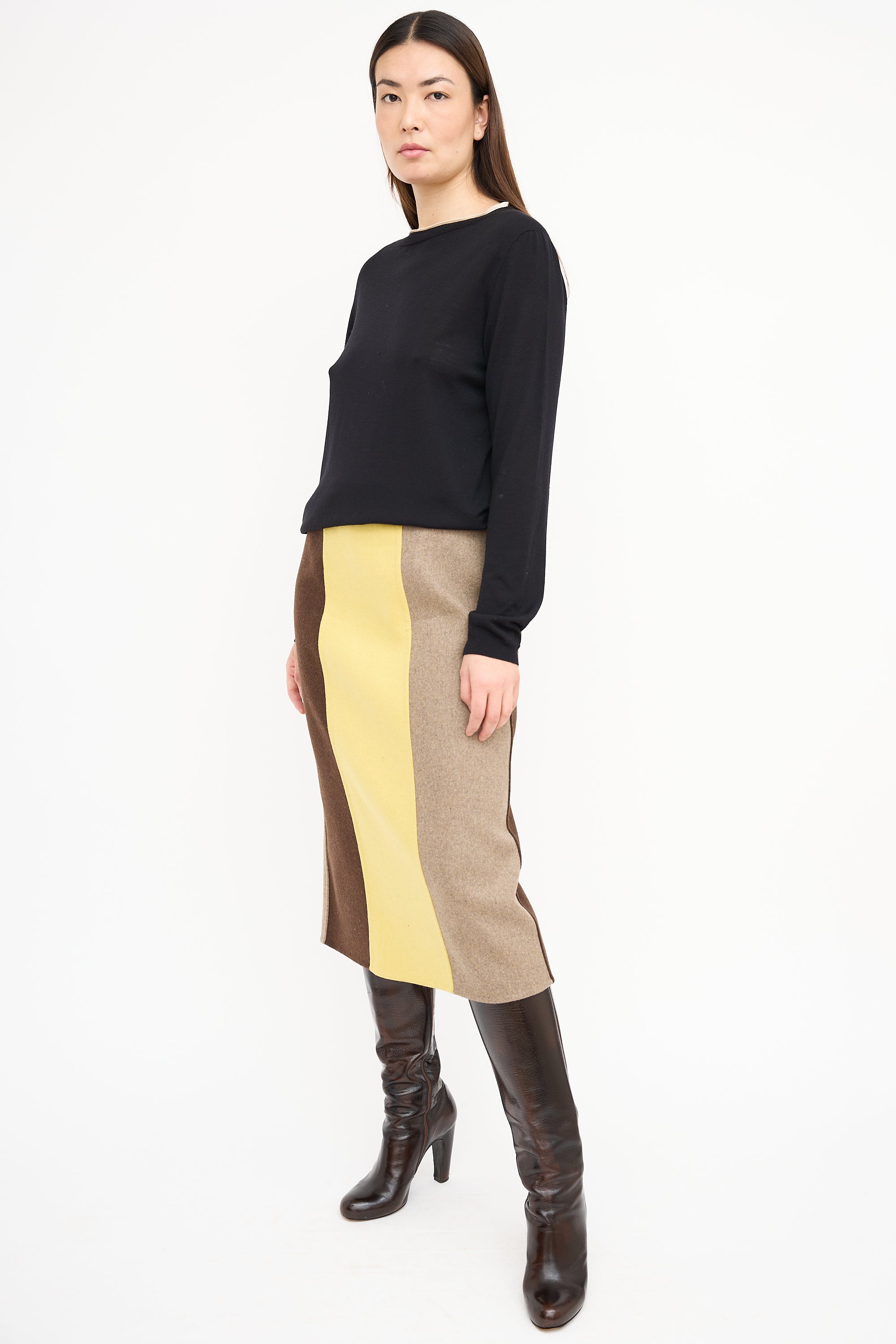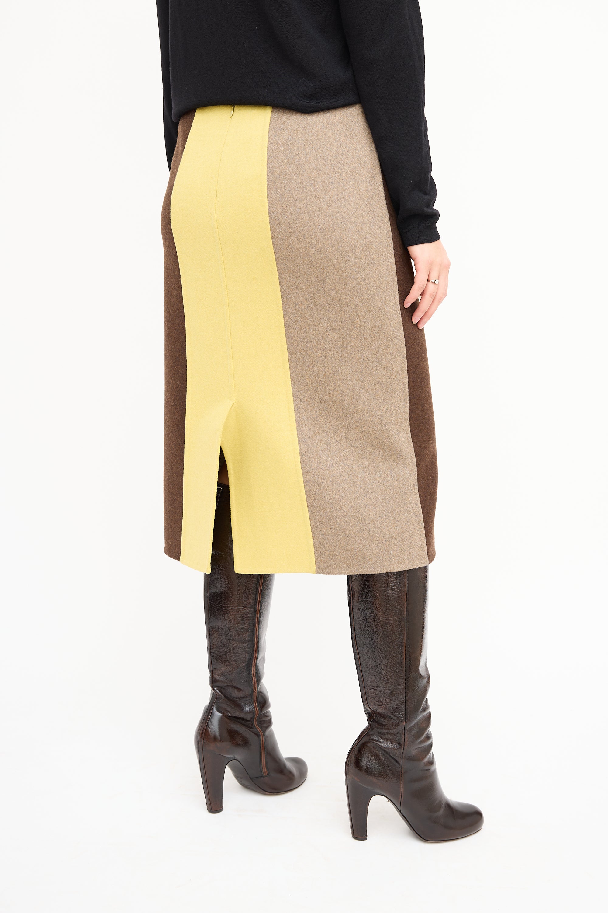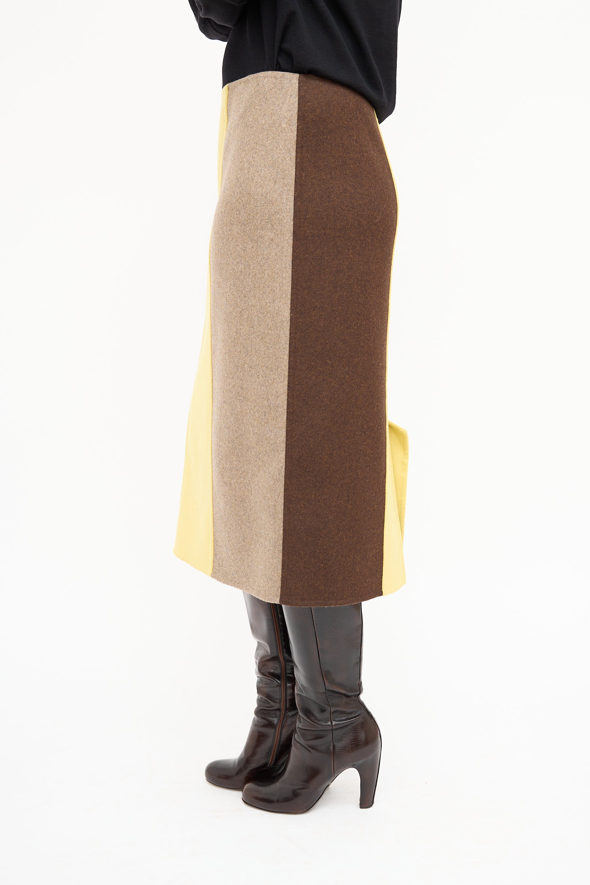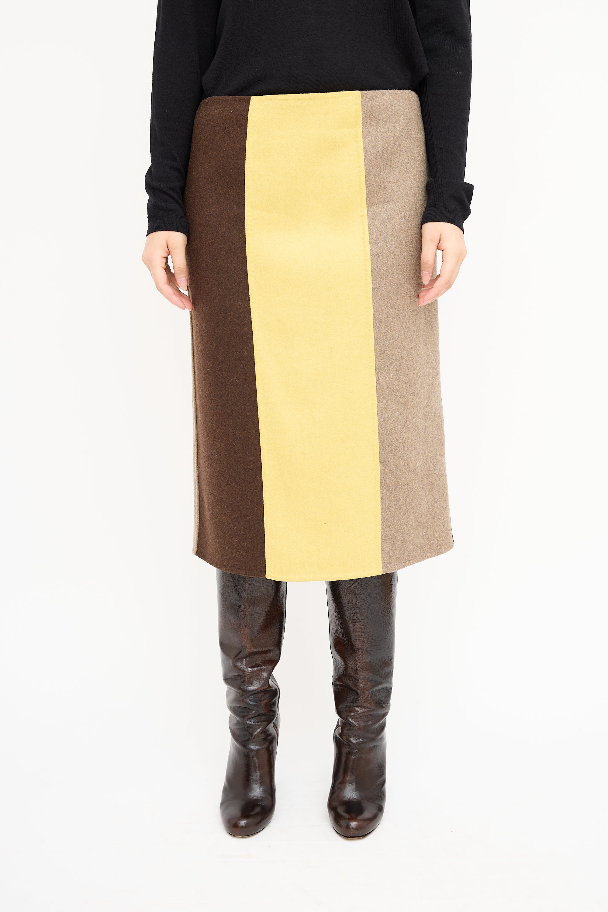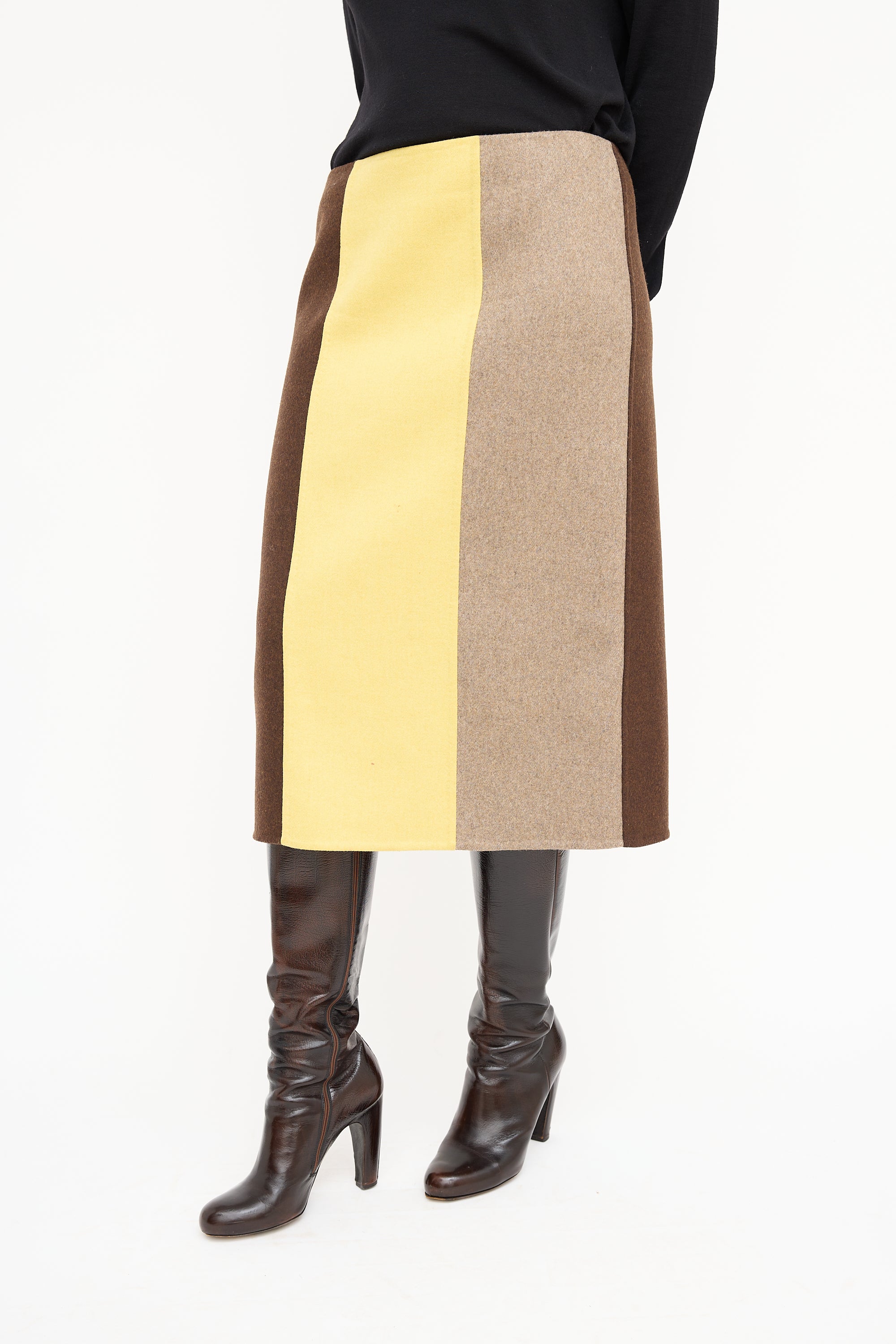 Pre-owned Marni brown and yellow wool midi skirt featuring a high waist, colour block design, back vent, and concealed back zip. Unlined.