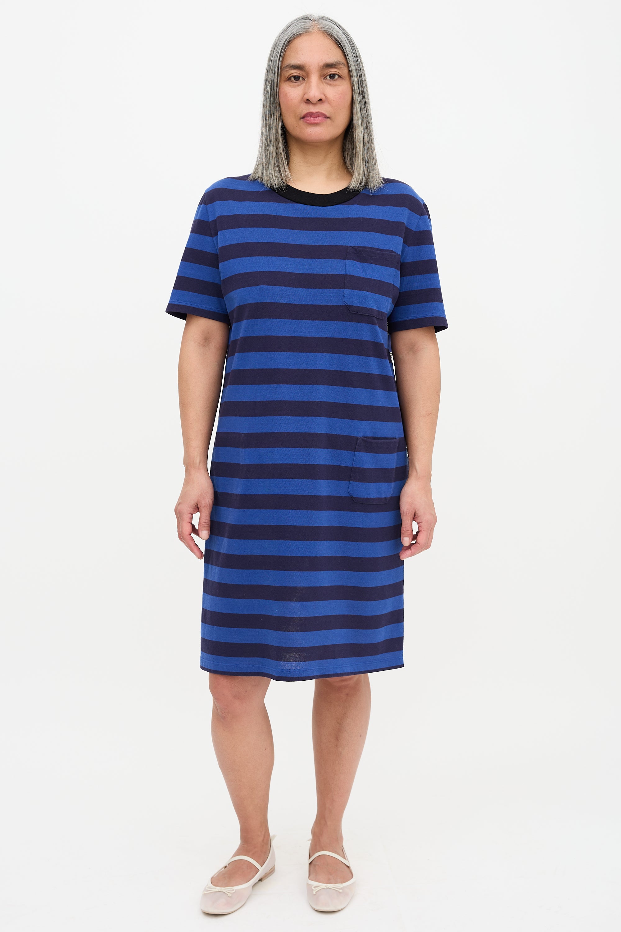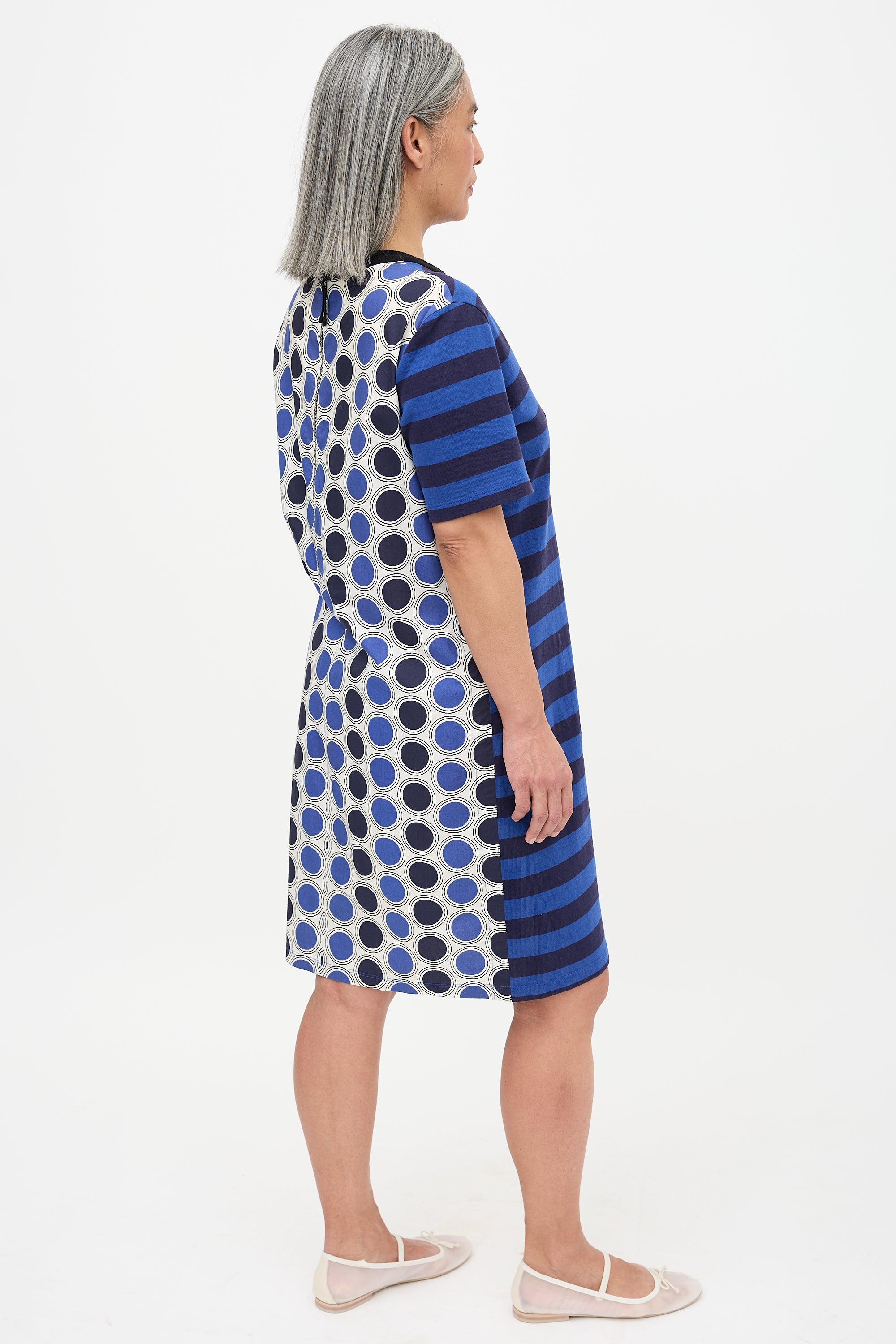 Pre-owned Marni blue, navy, and white mini T-shirt dress featuring ribbed round neckline, striped knit front, patch pocket at left chest, contrast back with dot pattern, and partial back zip.
