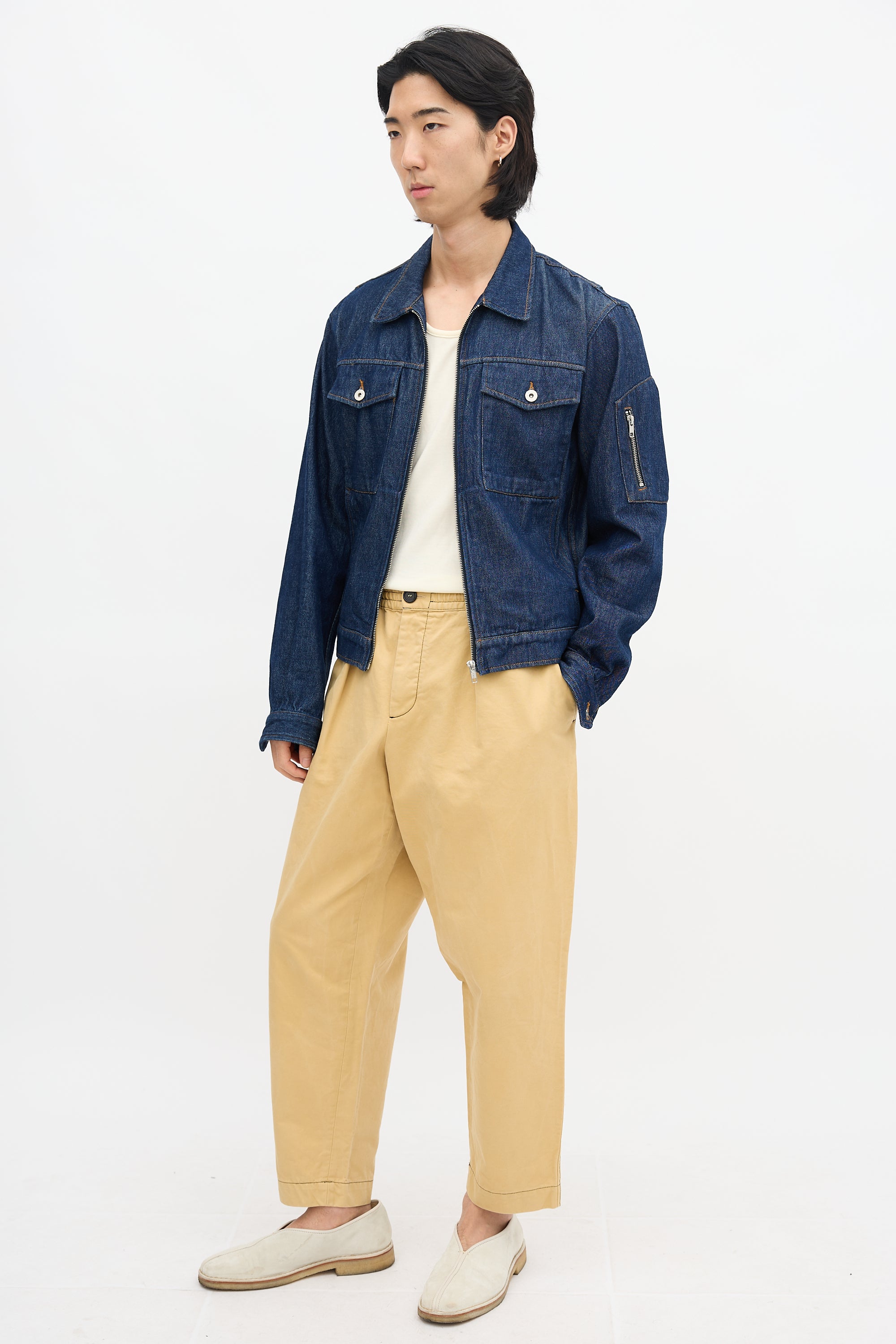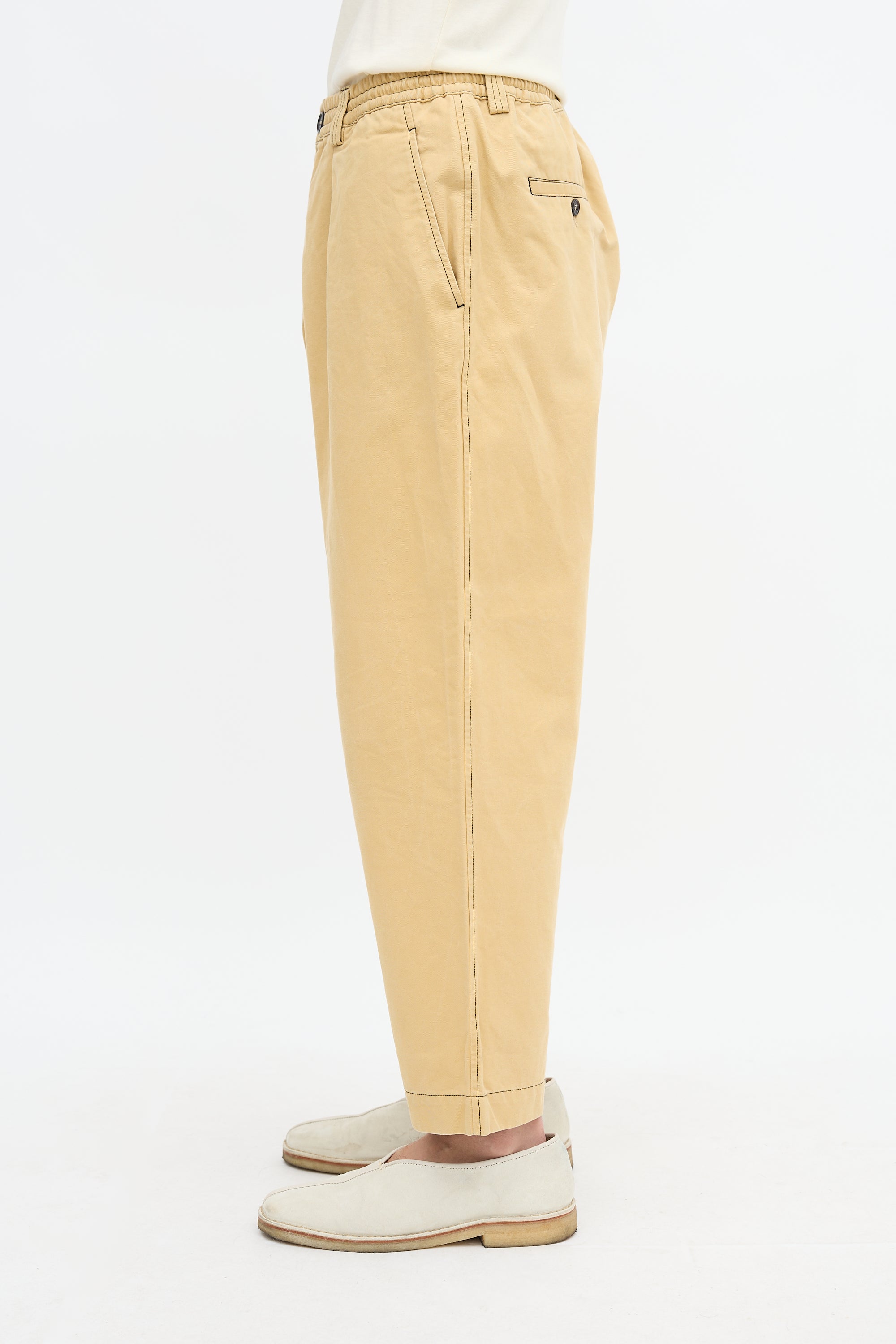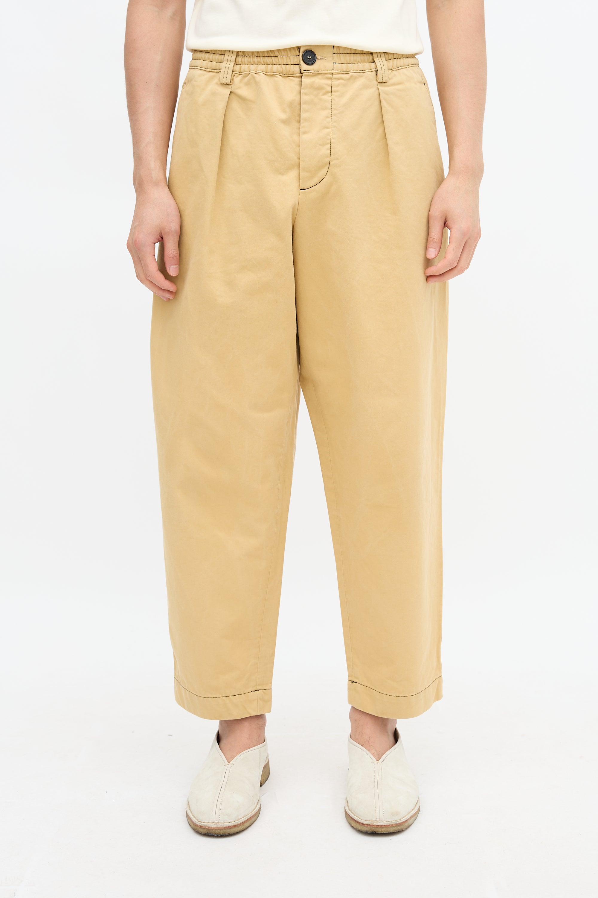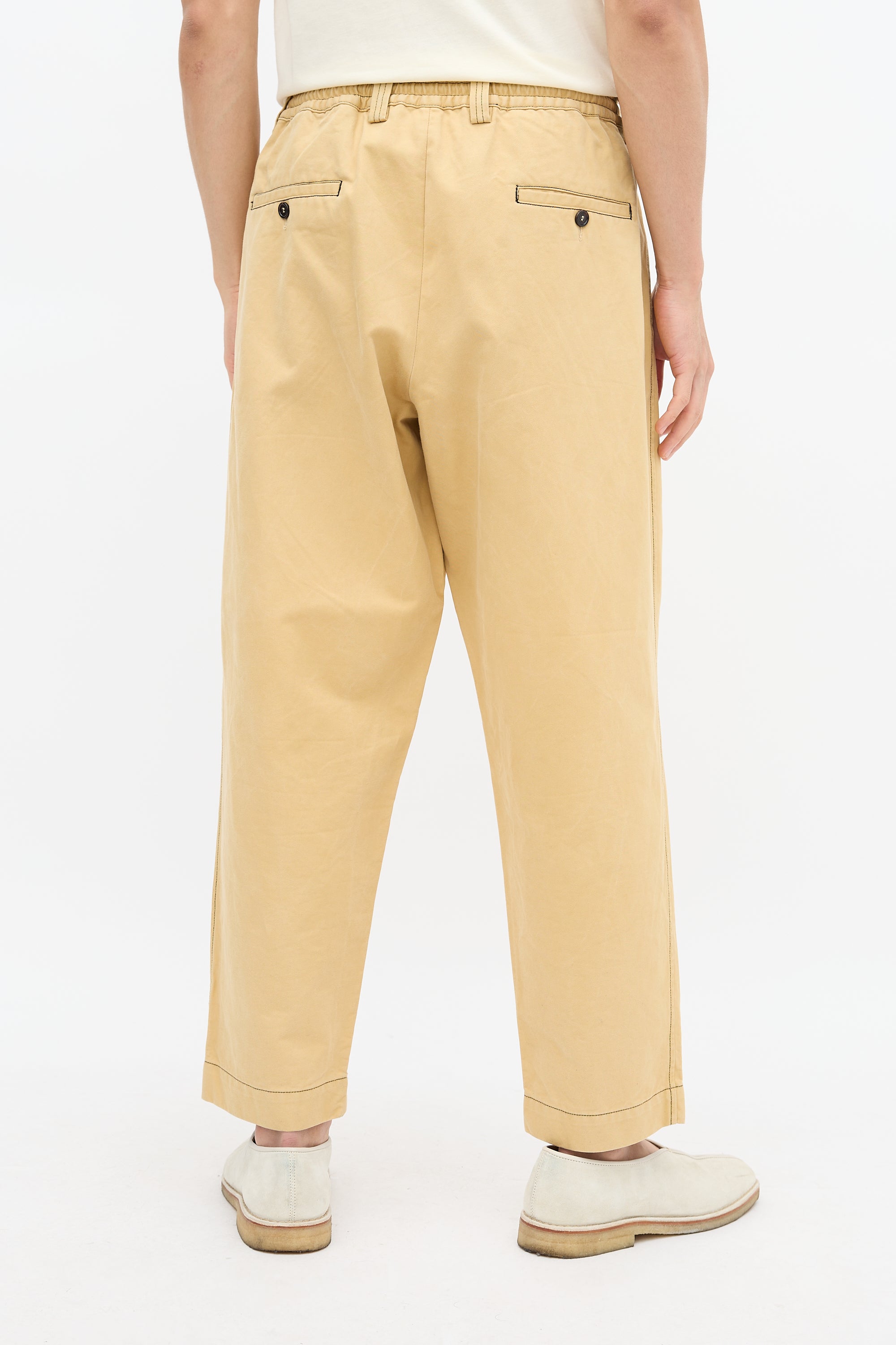 Pre-owned Marni yellow trousers featuring contrast stitching, elasticized drawstring waistband, pleated front, four pocket styling, and tapered leg. Unlined.