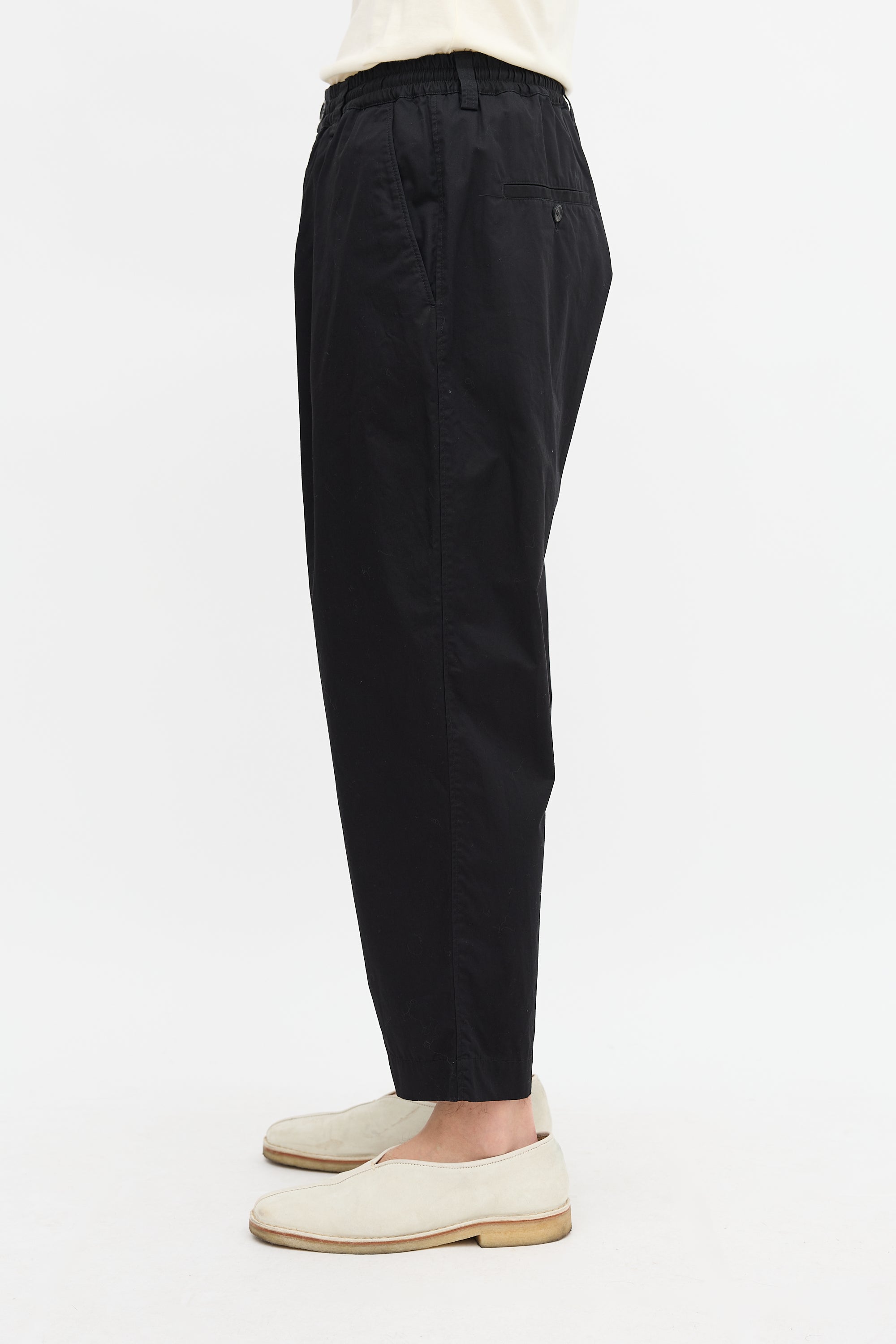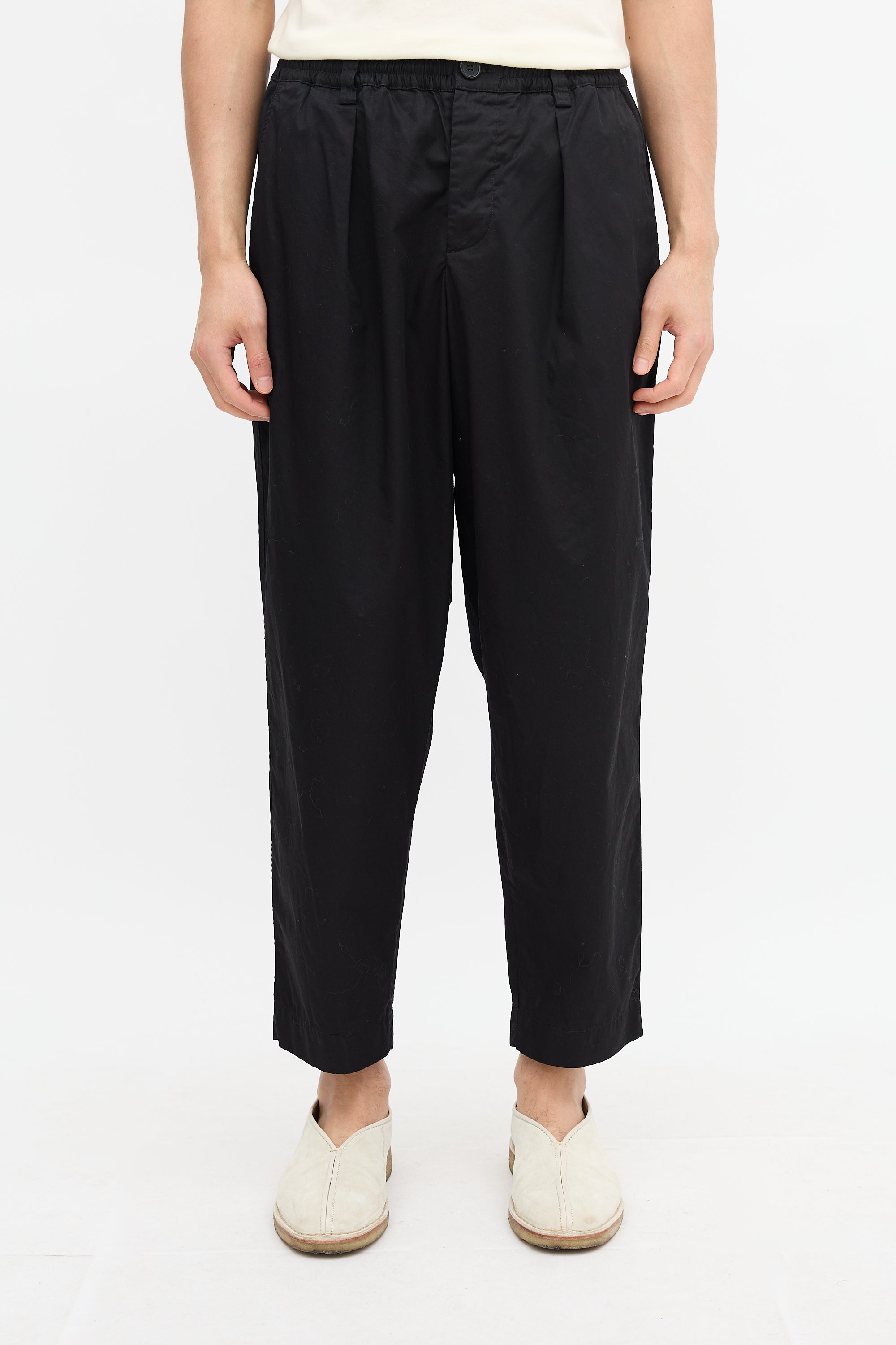 Pre-owned Marni black trousers featuring elasticized drawstring waistband, pleated front, four pocket styling, and tapered leg. Unlined.
