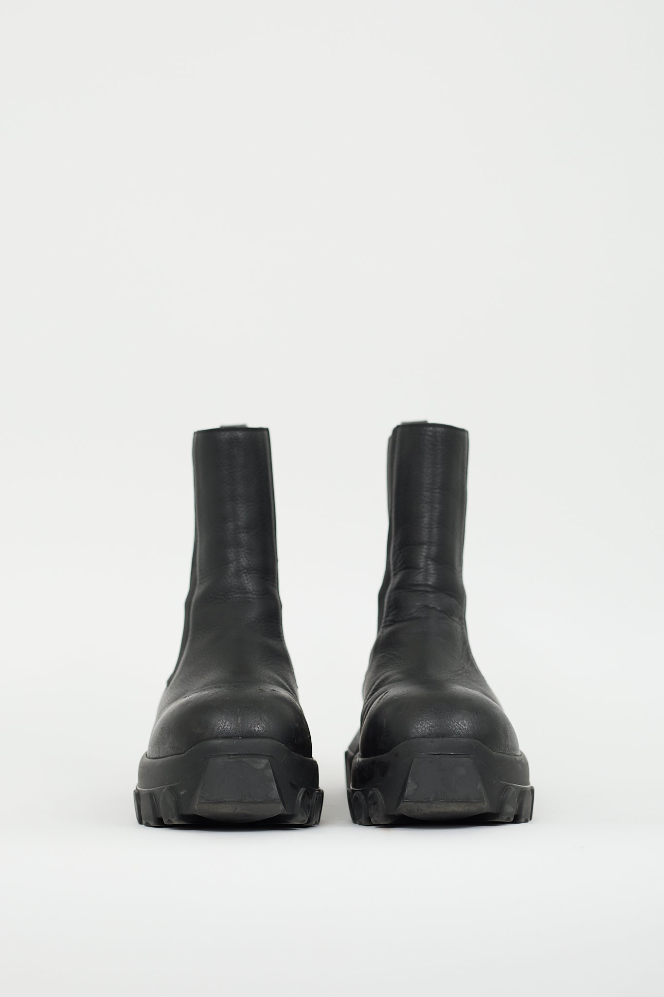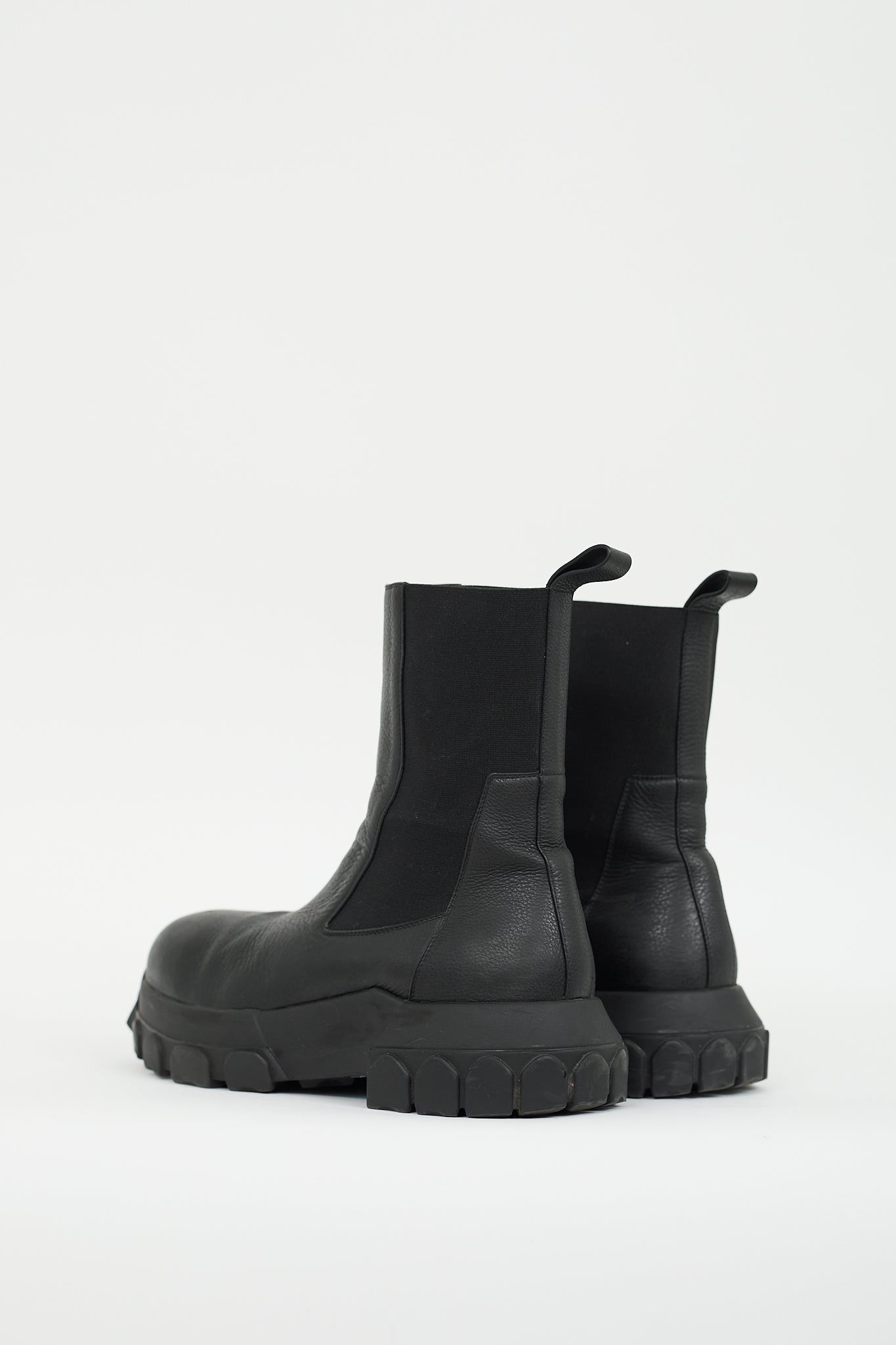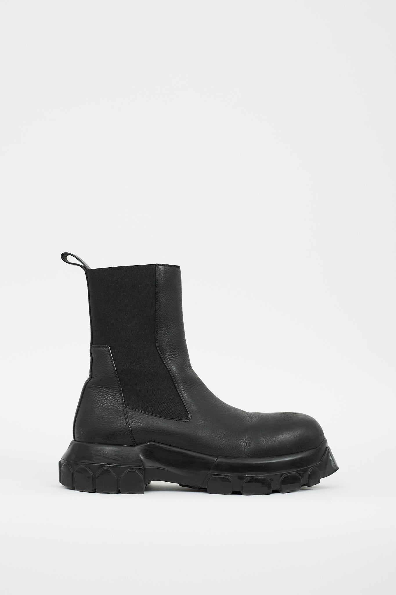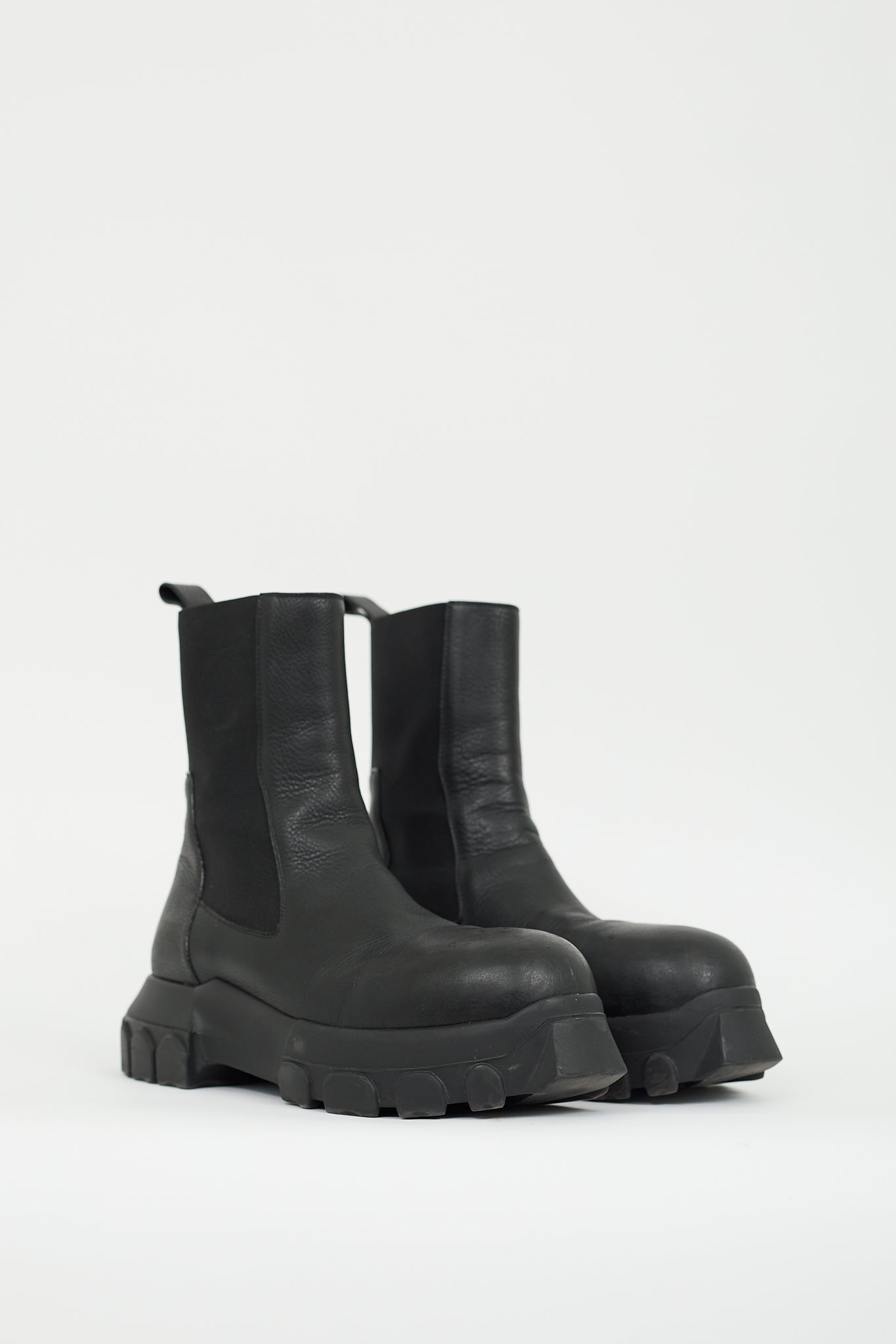Pre-owned Rick Owens black leather Bozo boots featuring rounded toe, elasticized gore, pull tab at back, pull on entry, and chunky rubber outsole.