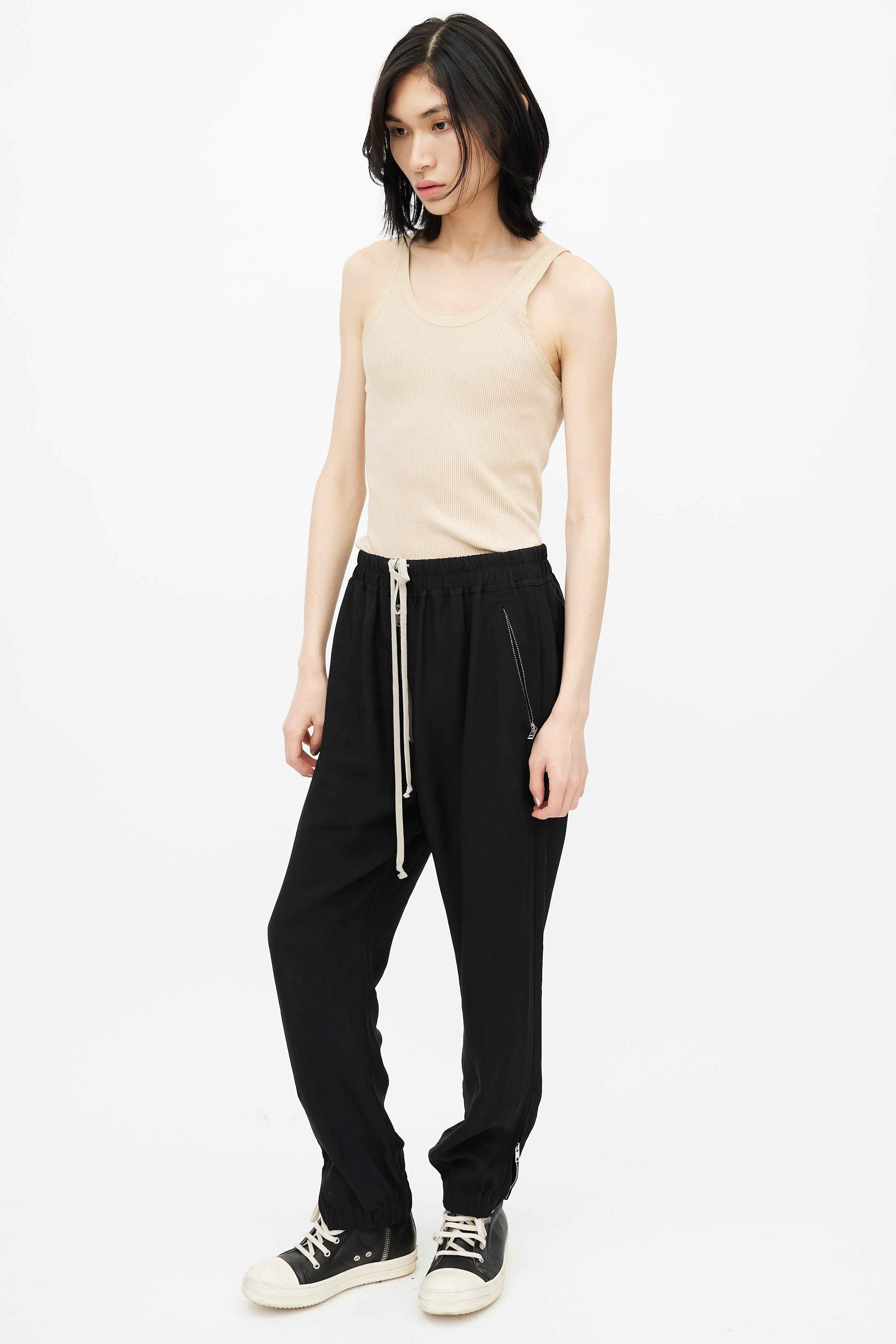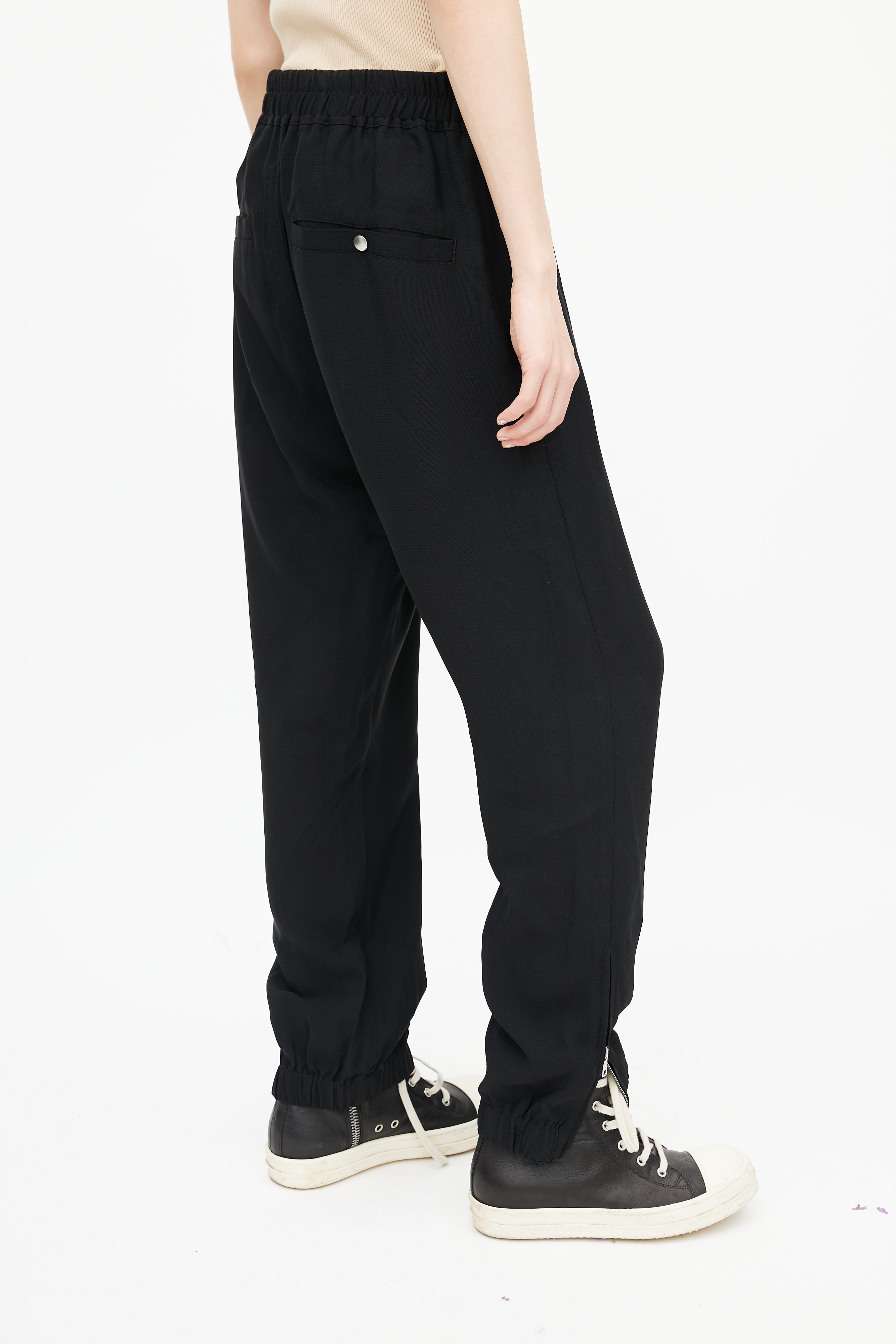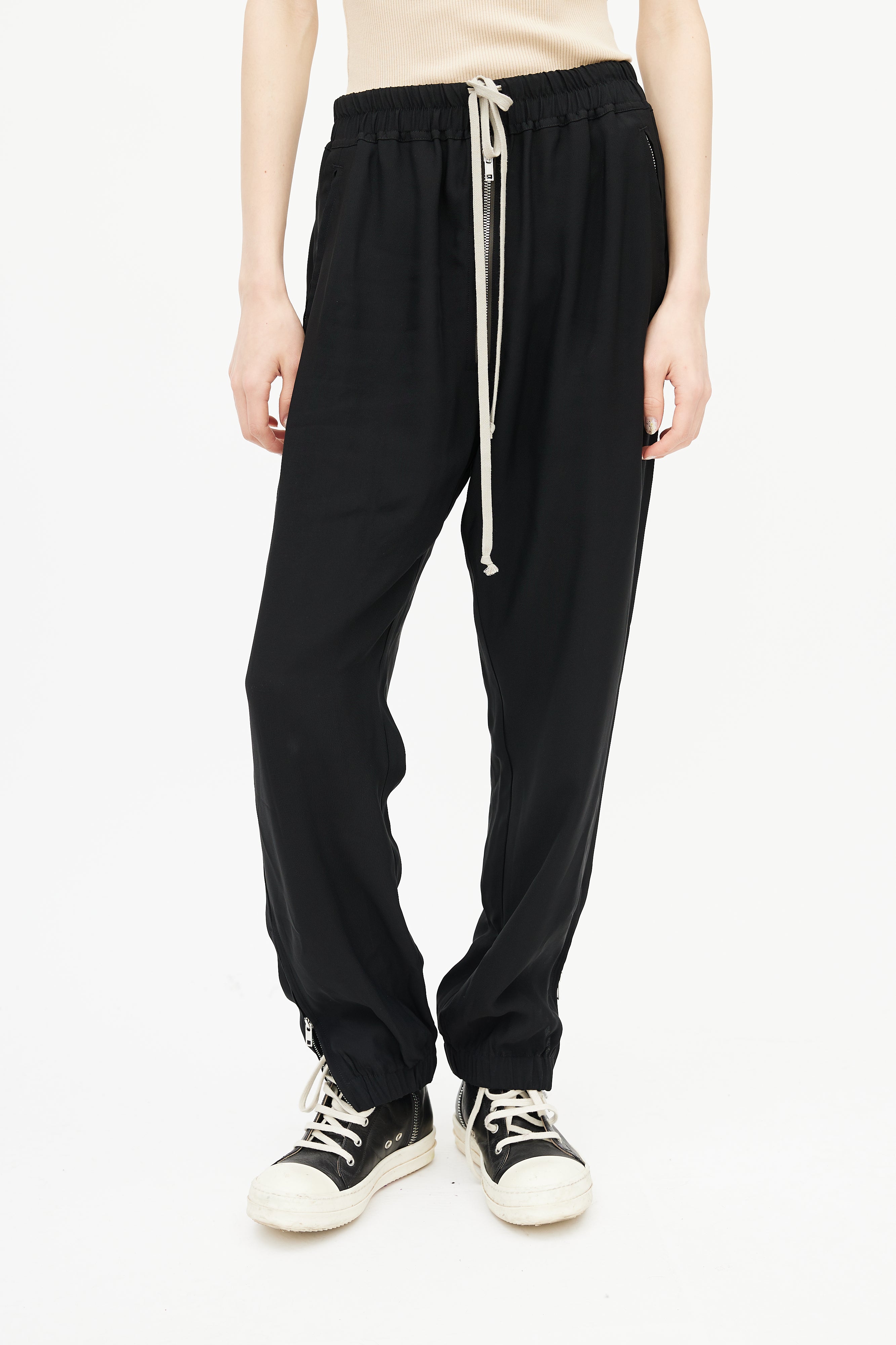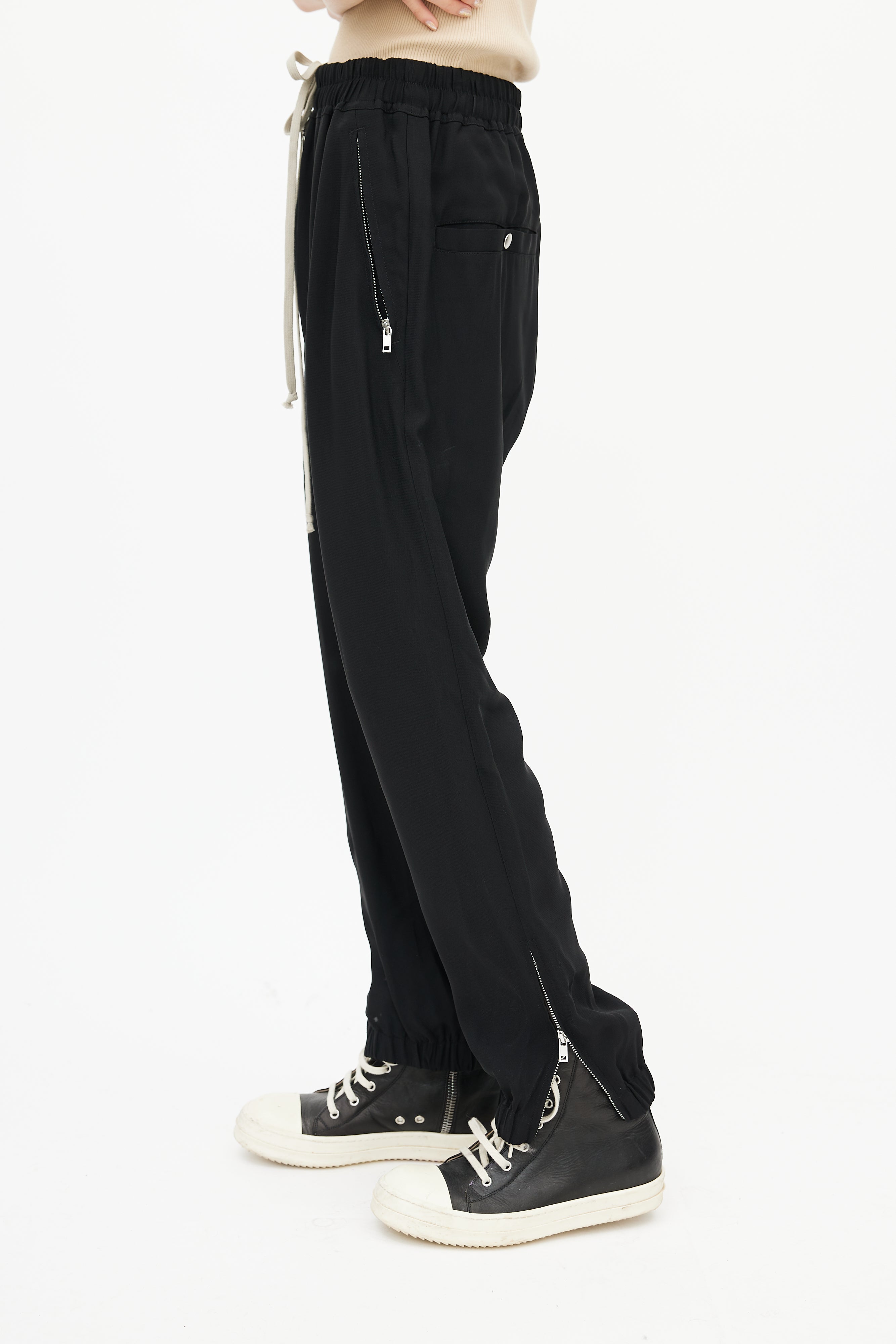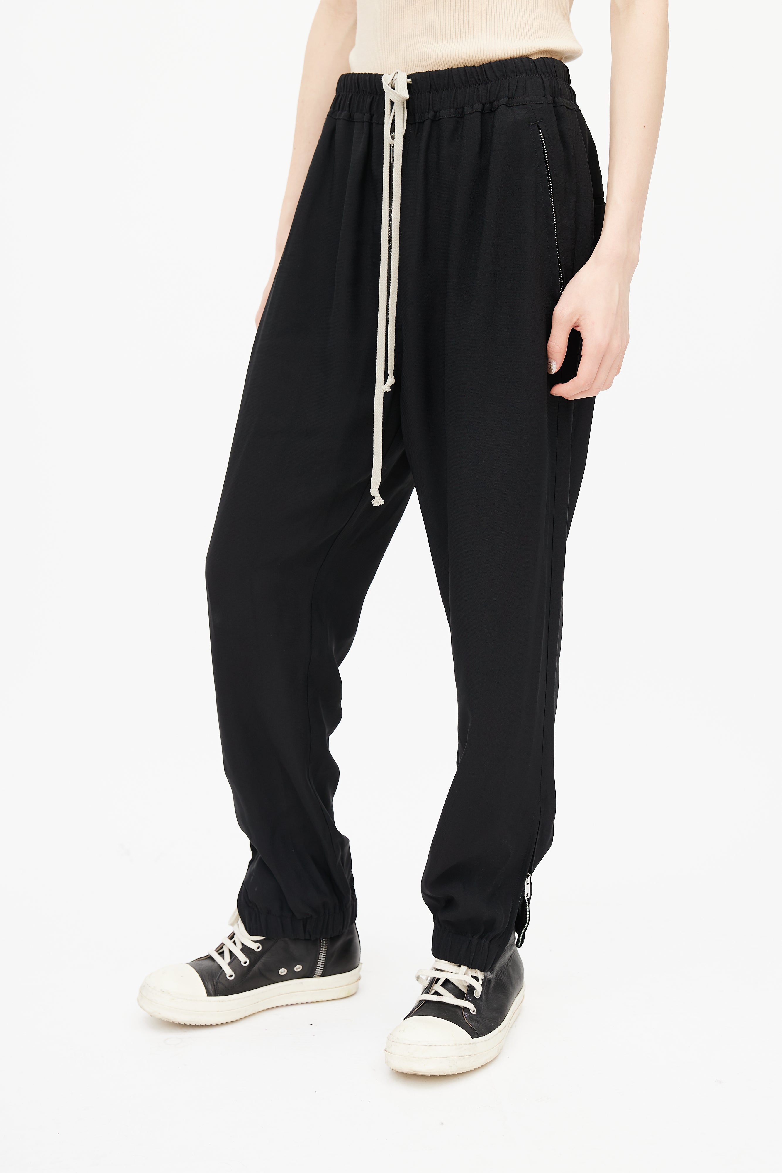 Pre-owned Spring/Summer 2021 Rick Owens black trousers featuring an elasticized drawstring waist, two zip pockets at waist, elasticized hem with zip detail, drop seat, and zip fly.