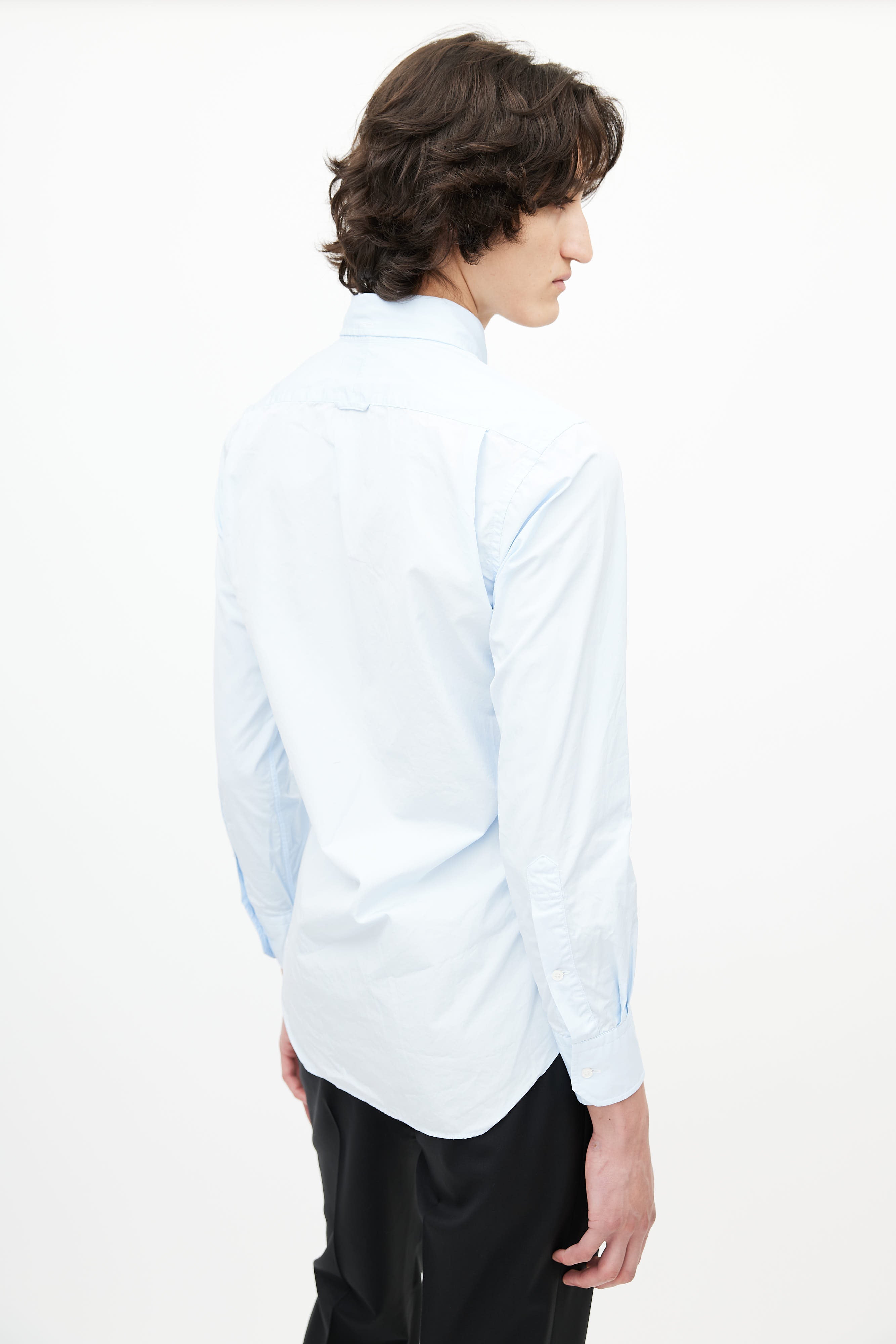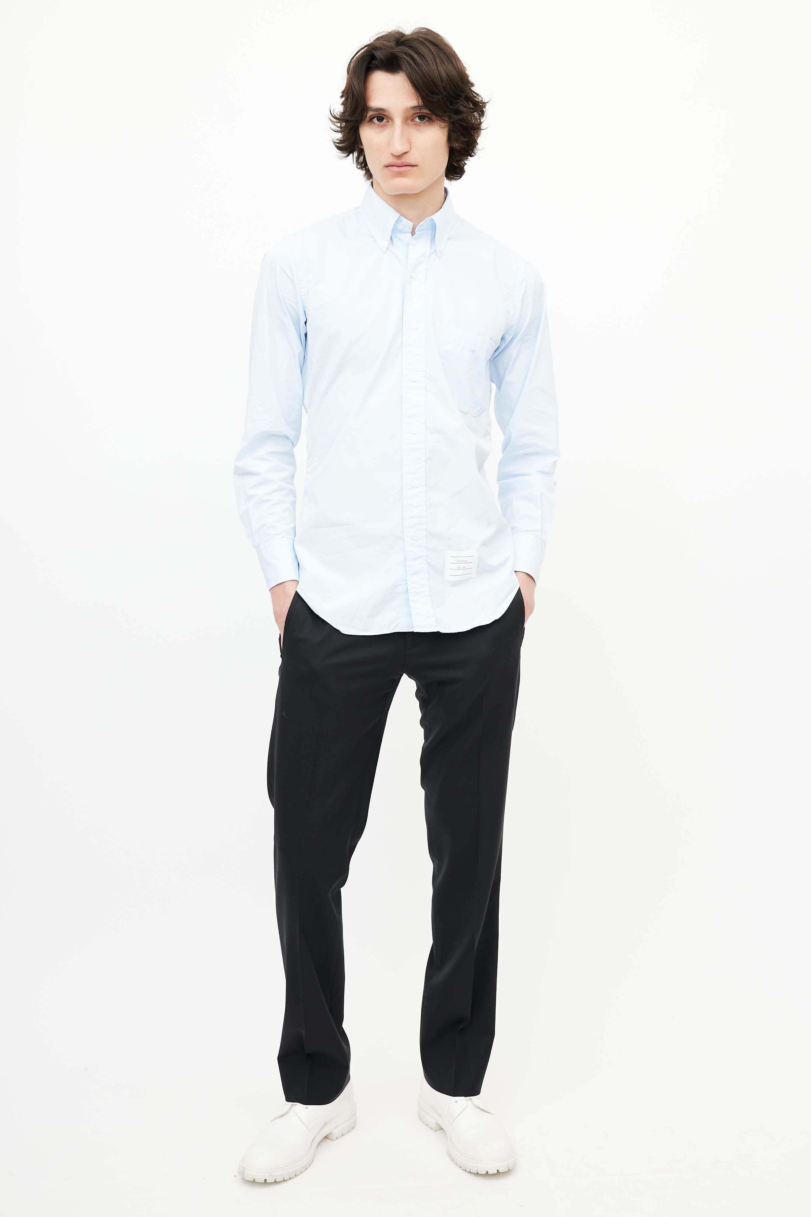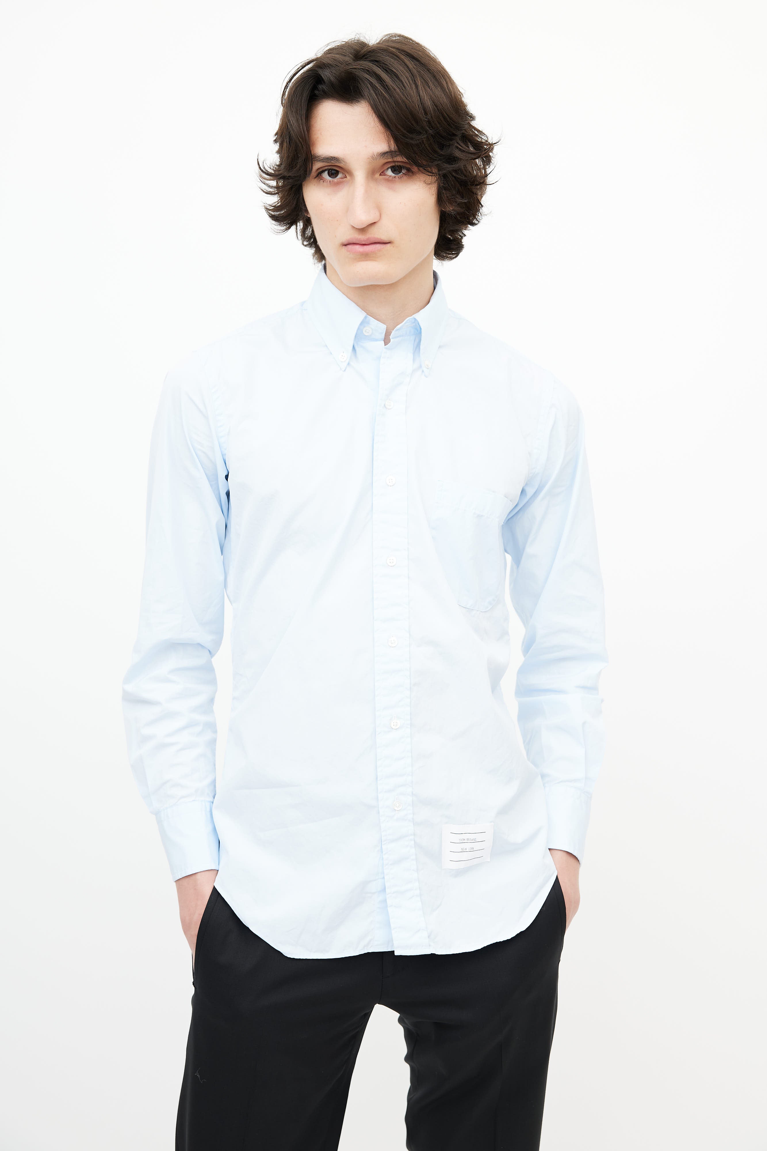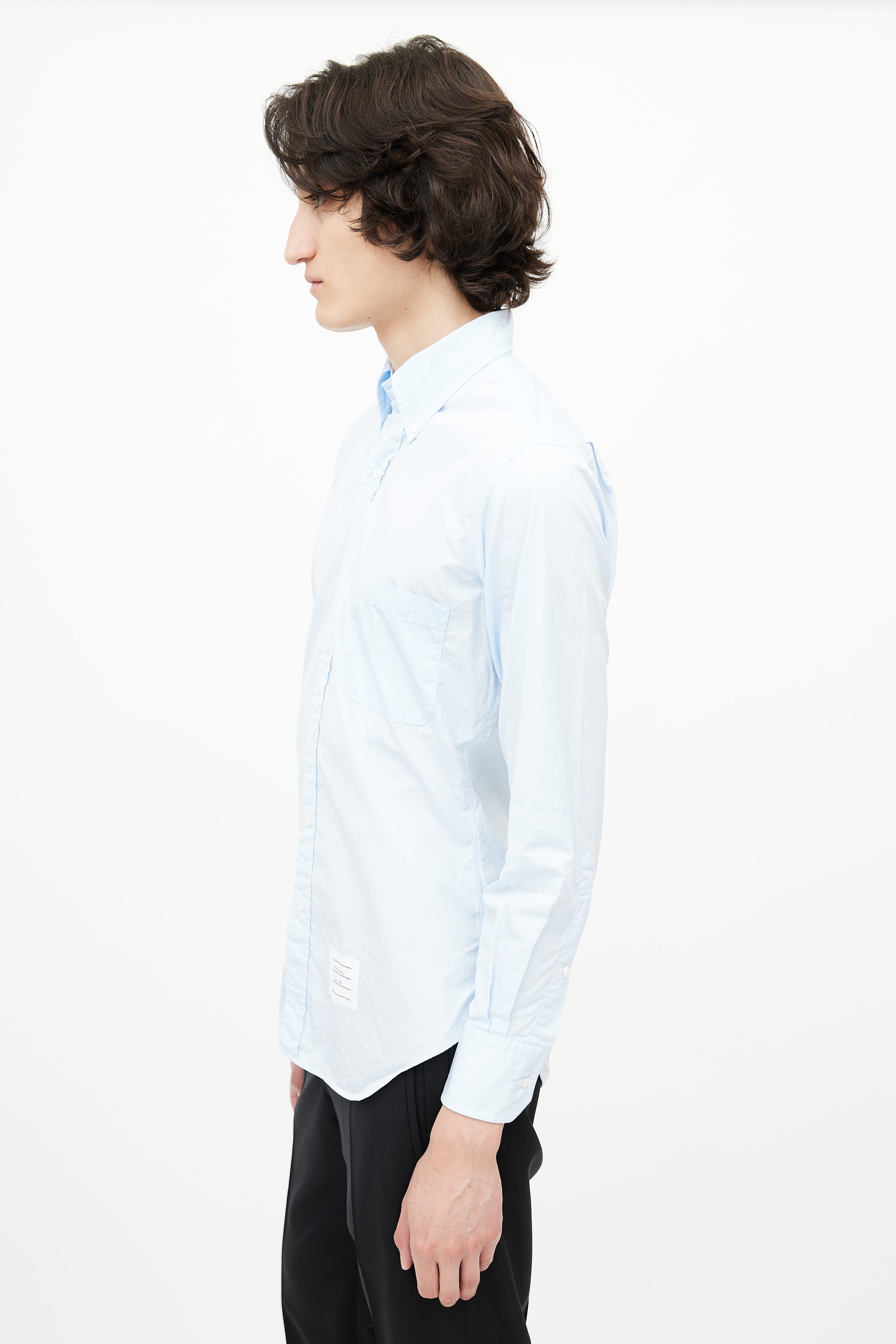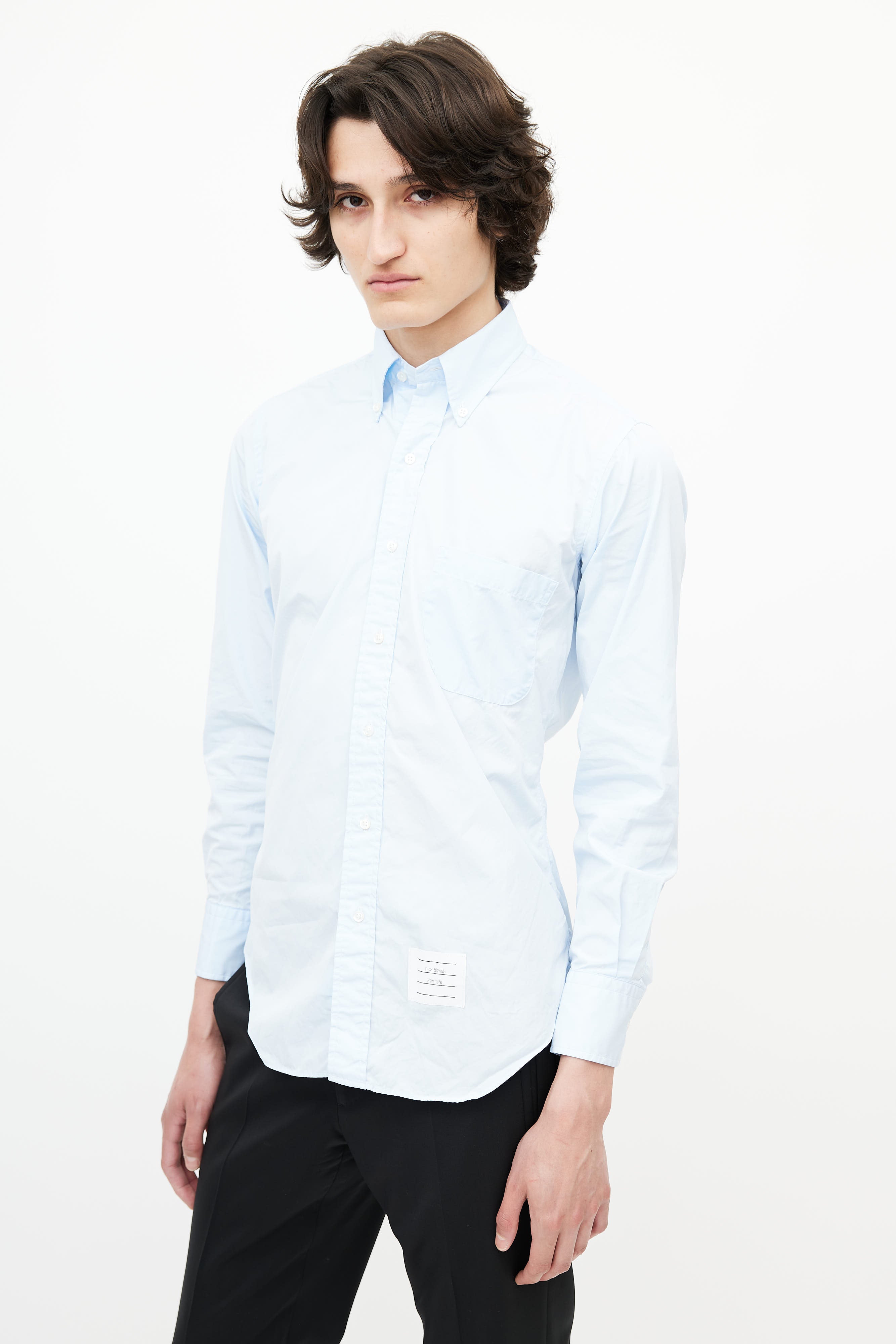 Pre-owned Thom Browne blue poplin shirt featuring pointed buttoned collar, long sleeves with buttoned cuffs, one patch pocket at chest, and a button up front.