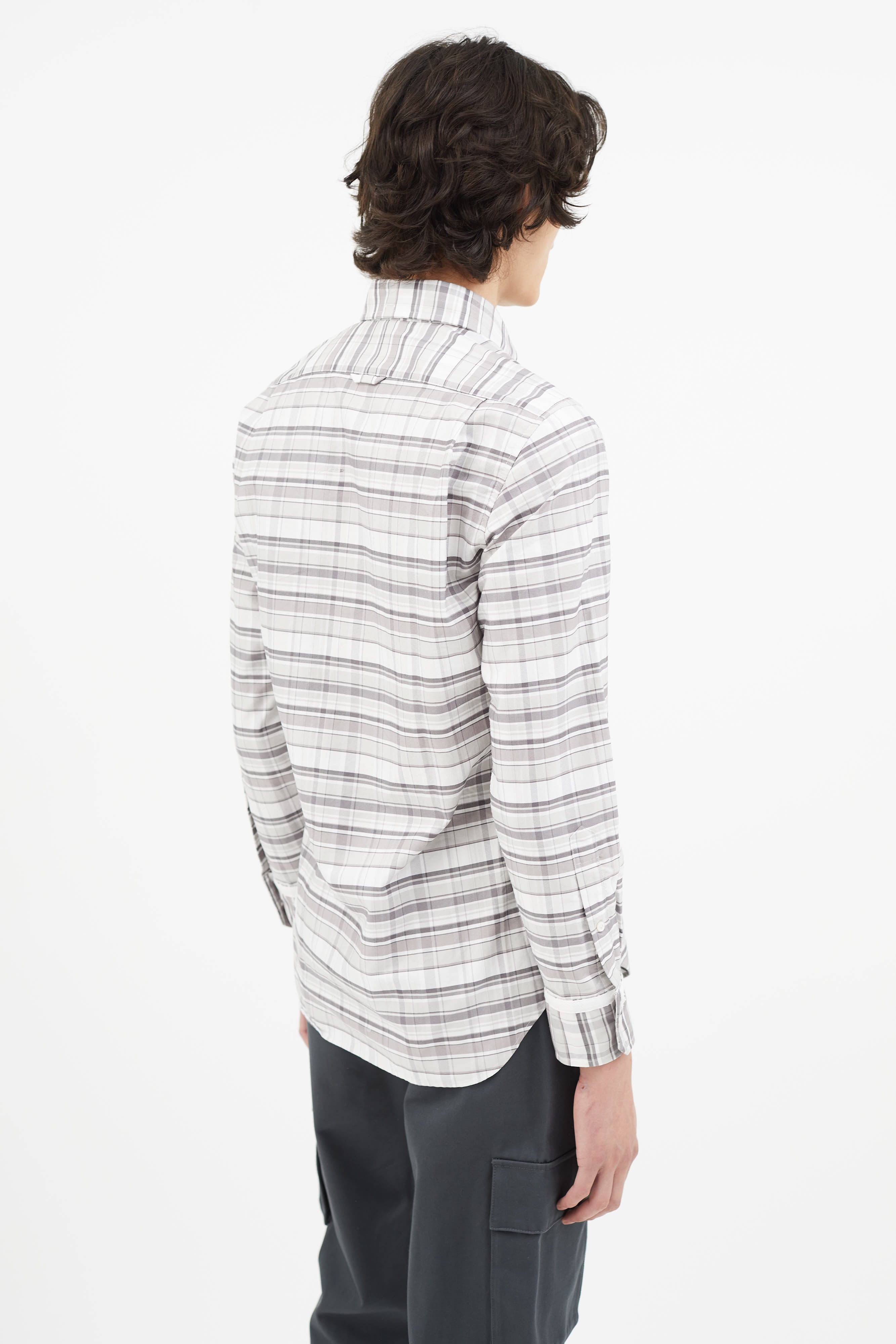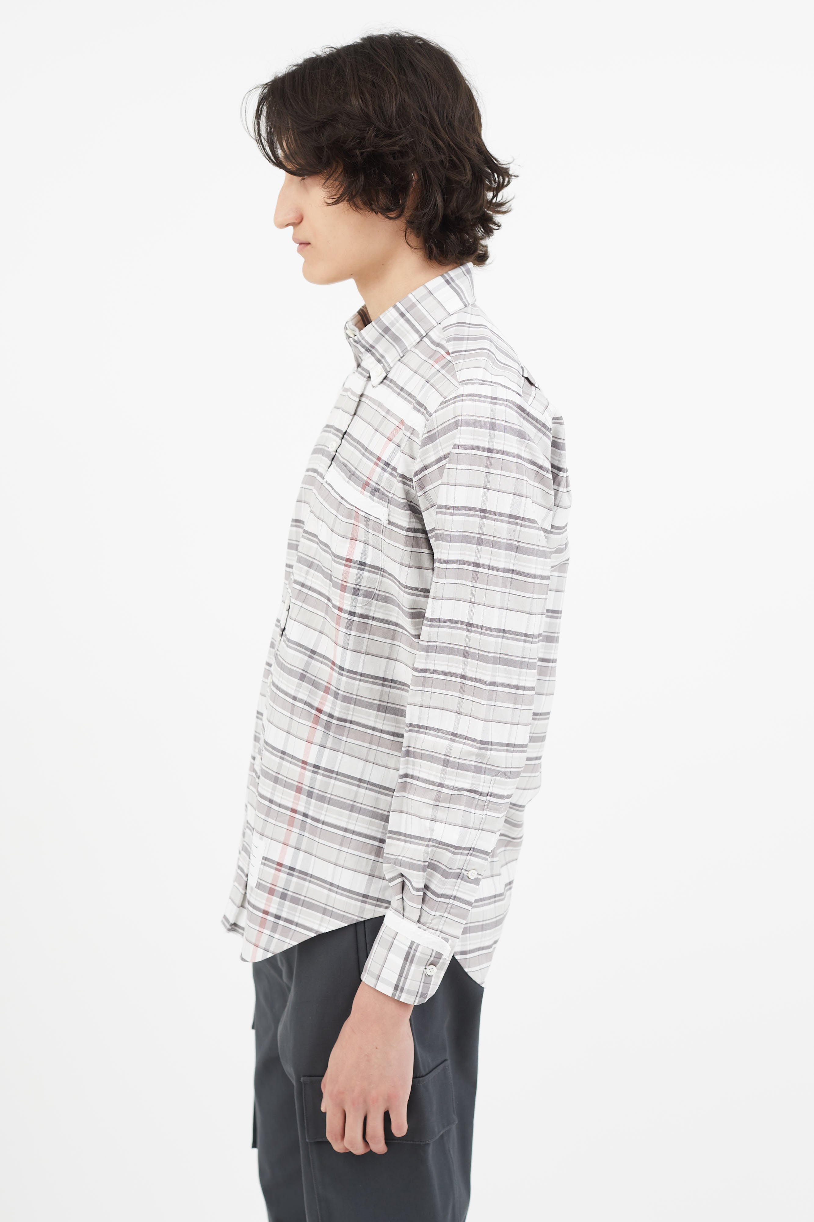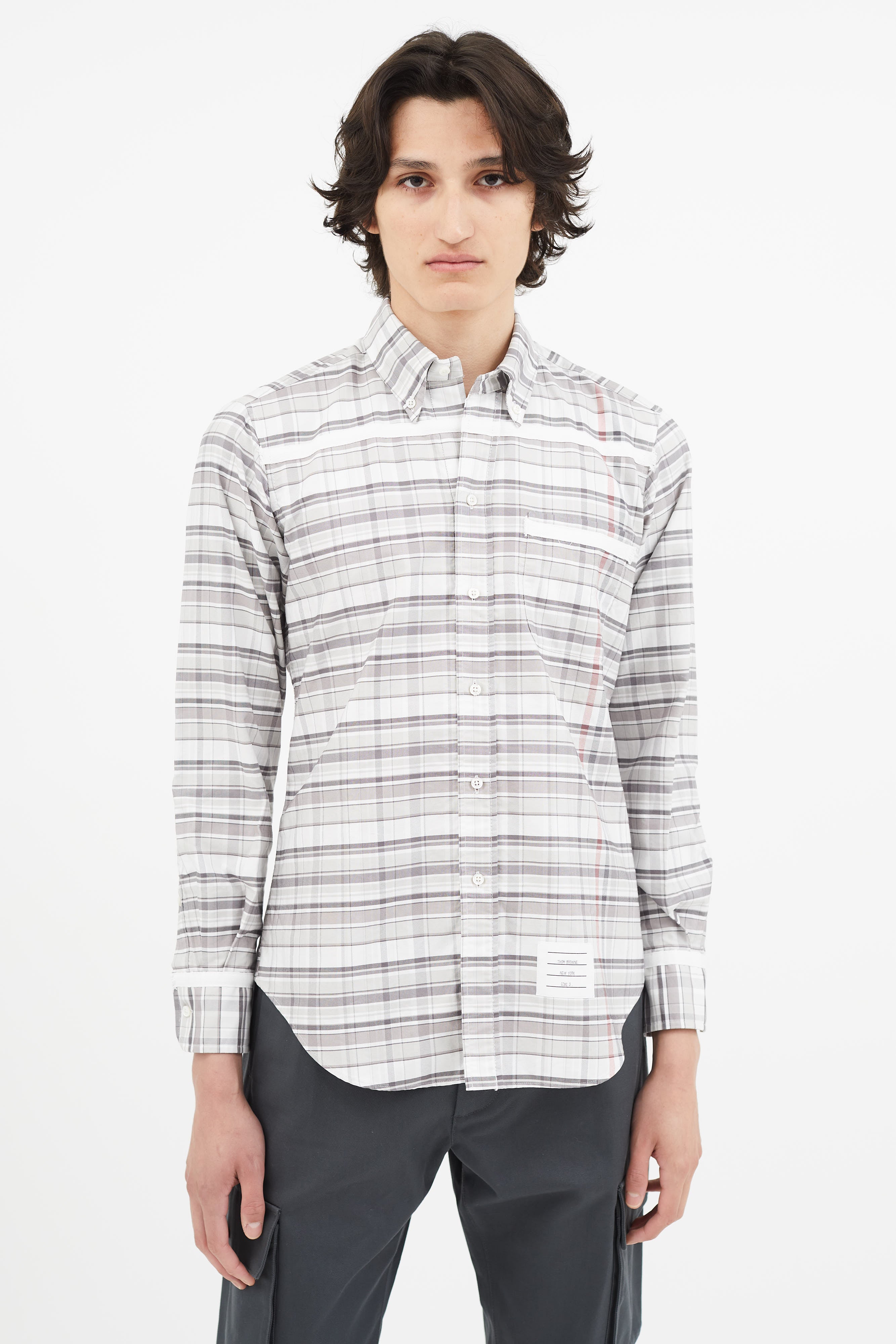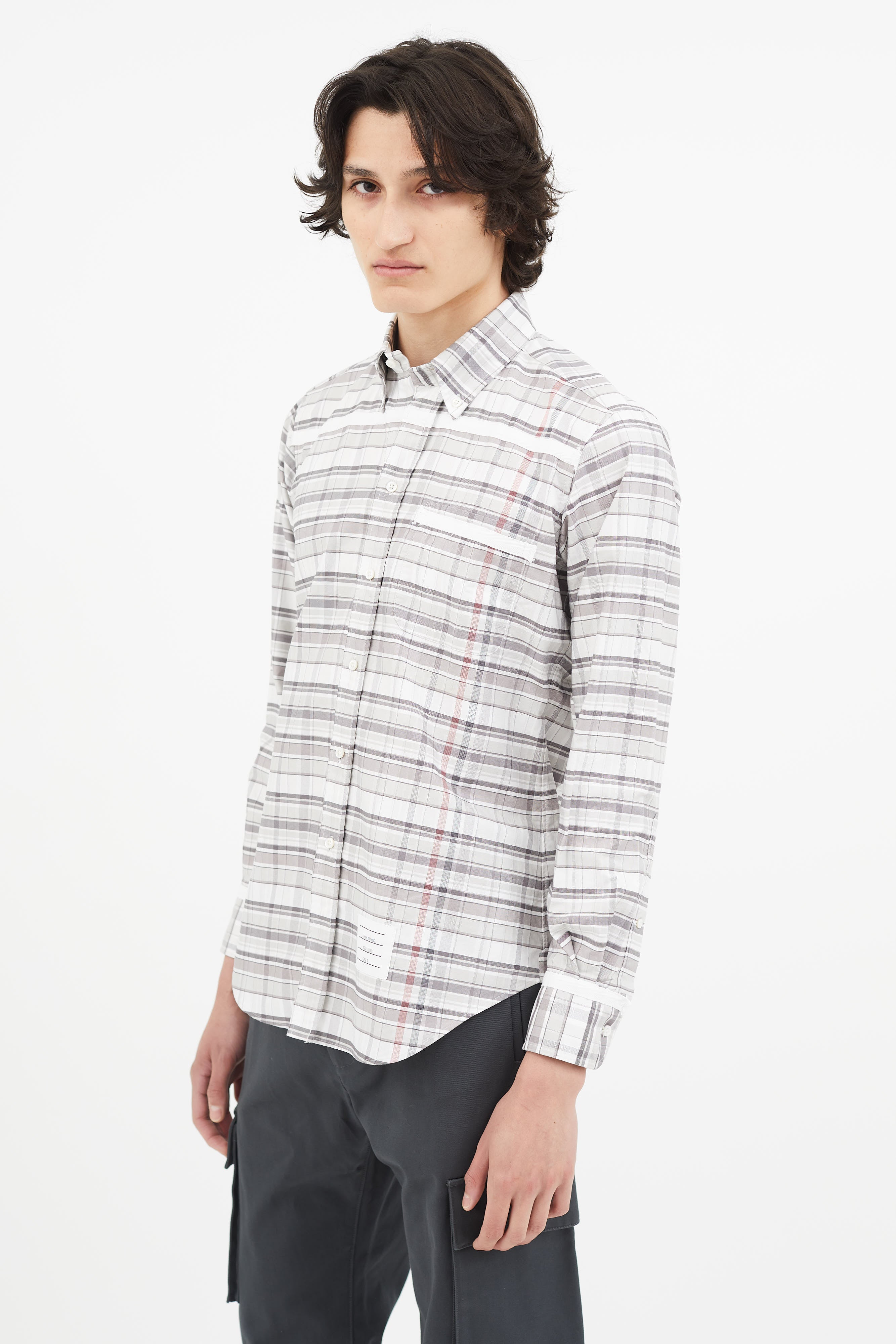 Pre-owned Thom Browne grey plaid shirt featuring button up front, red stripe at left, classic buttoned collars, chest pocket, logo tag at hem, and white grosgrain web detail at chest, pocket, and cuffs.