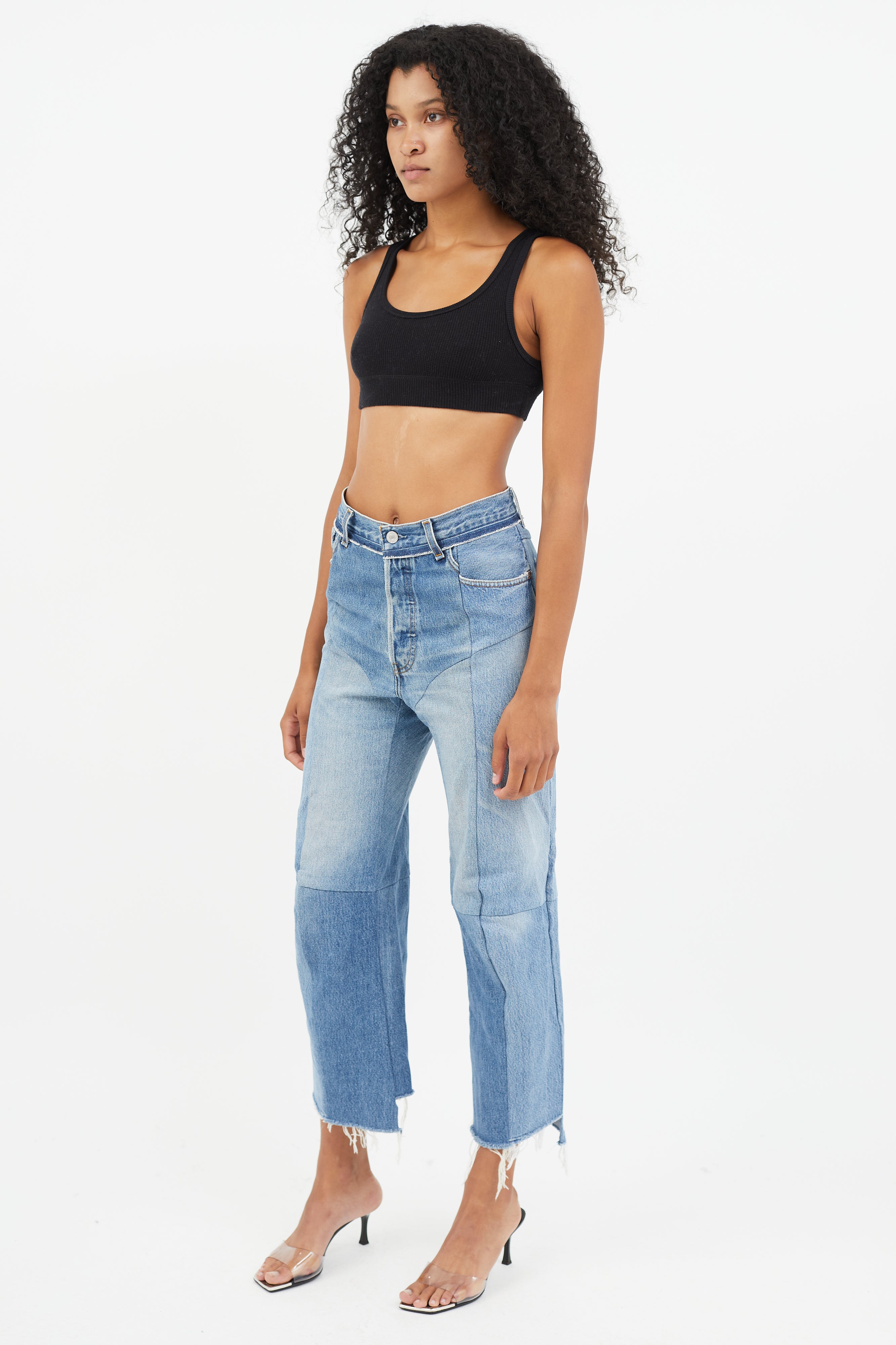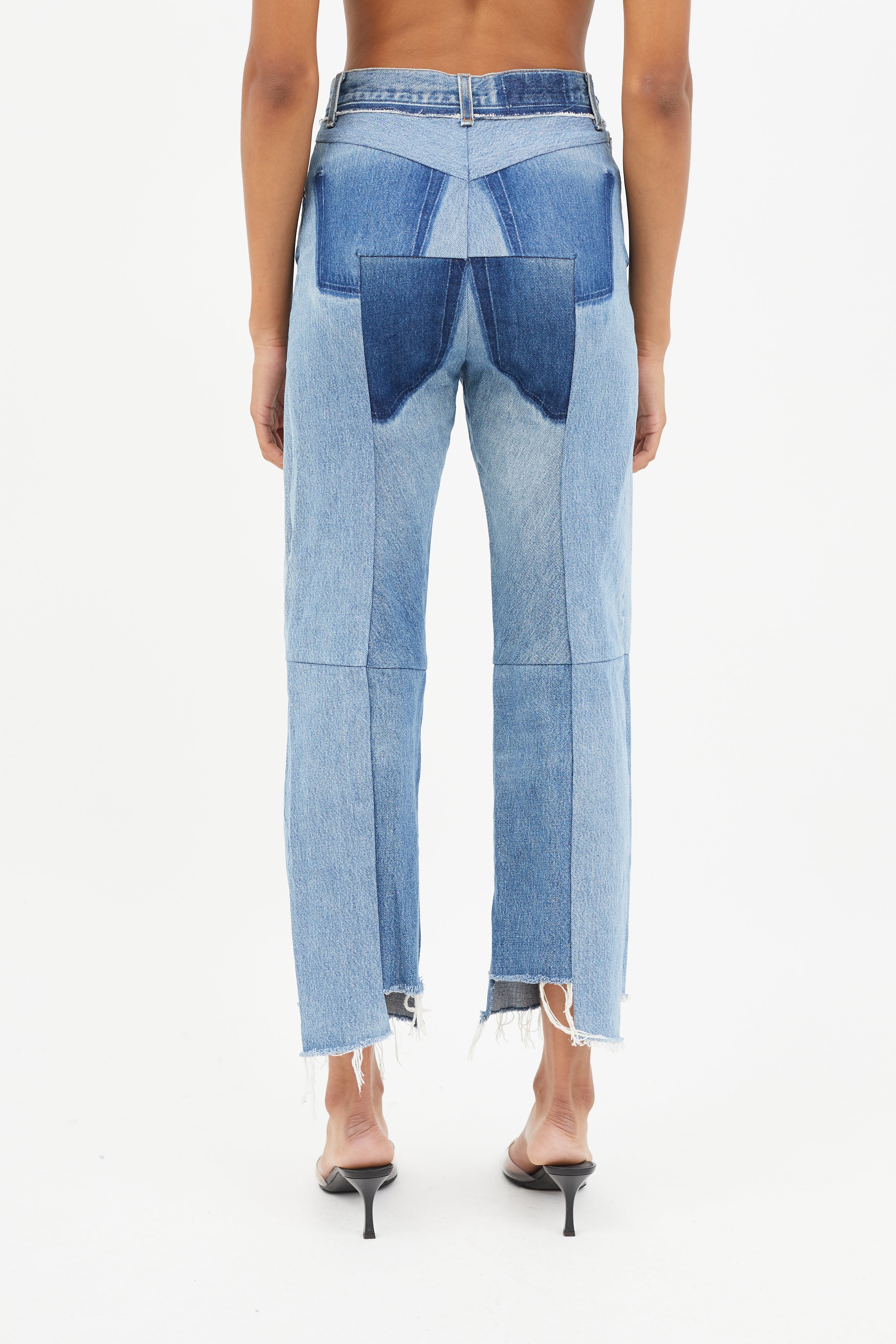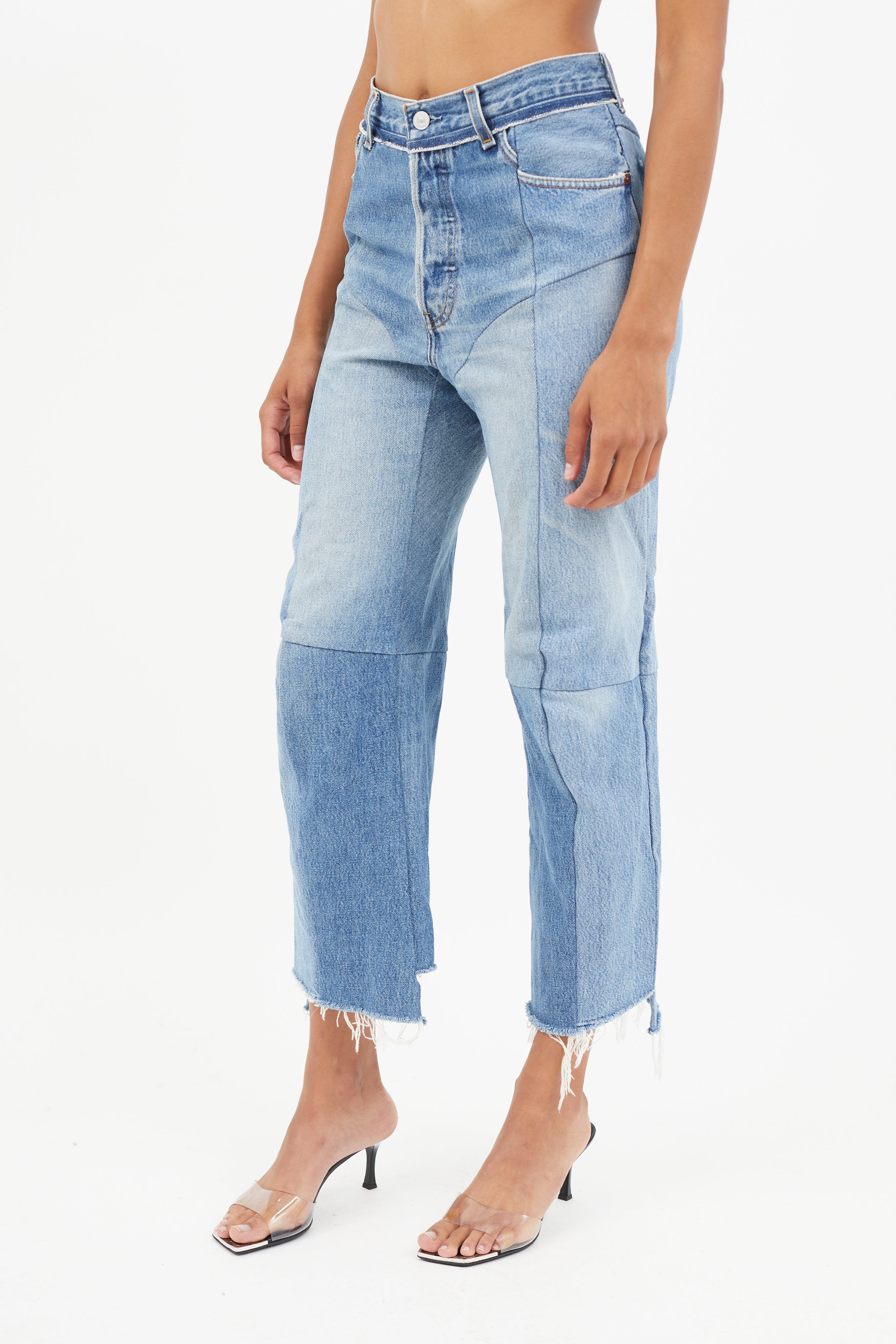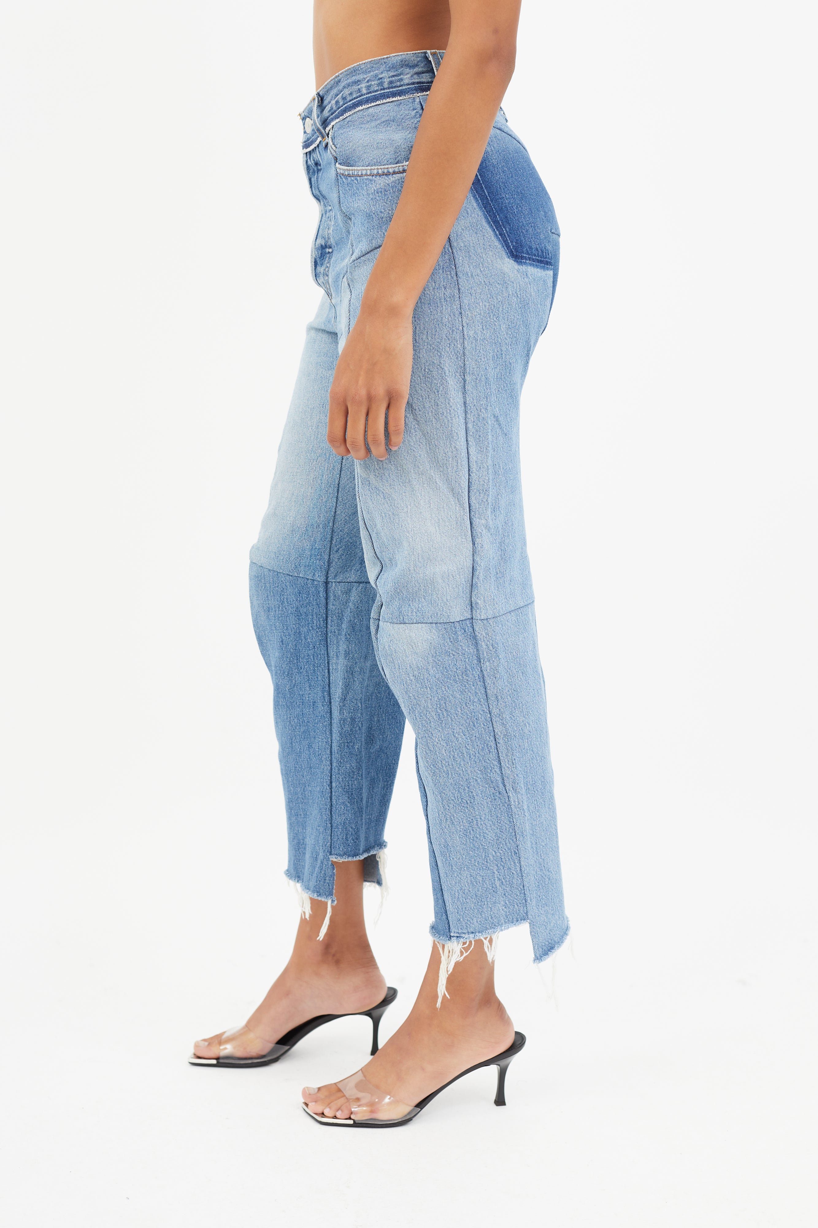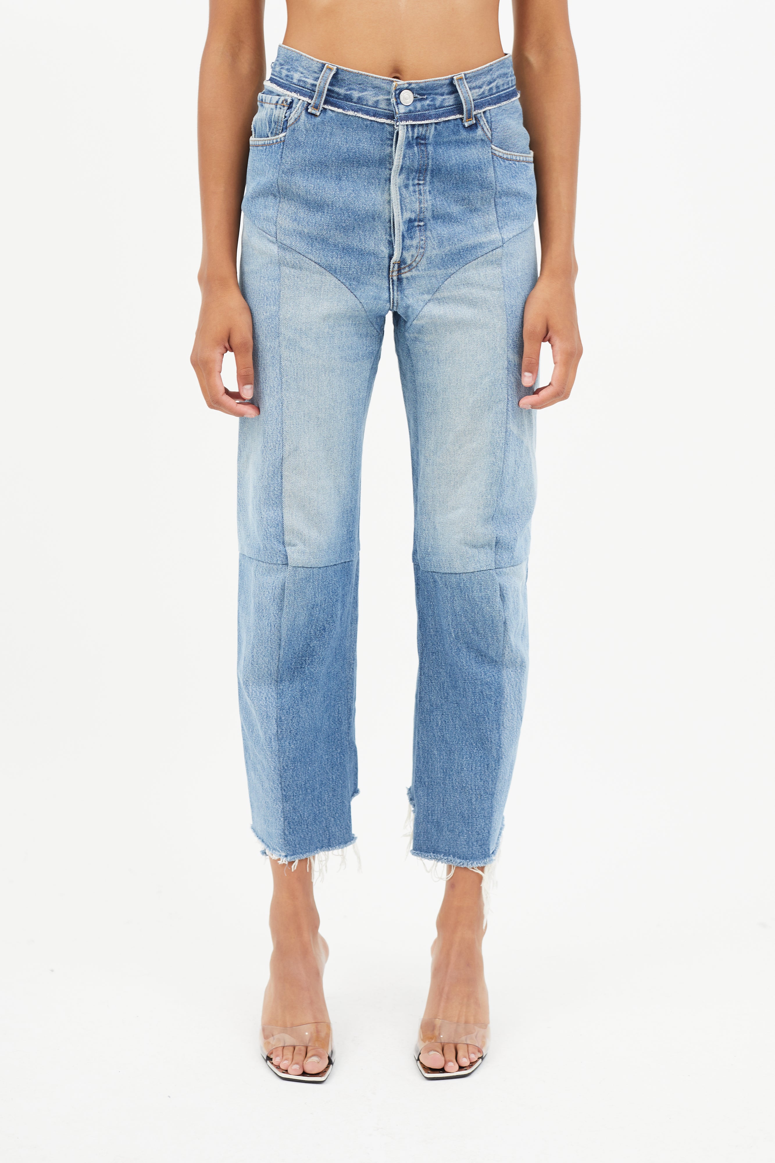 Pre-owned Vetements blue reconstructed denim jeans featuring panelling throughout, three slip pockets at hip, intentional distressing, and a button fly.