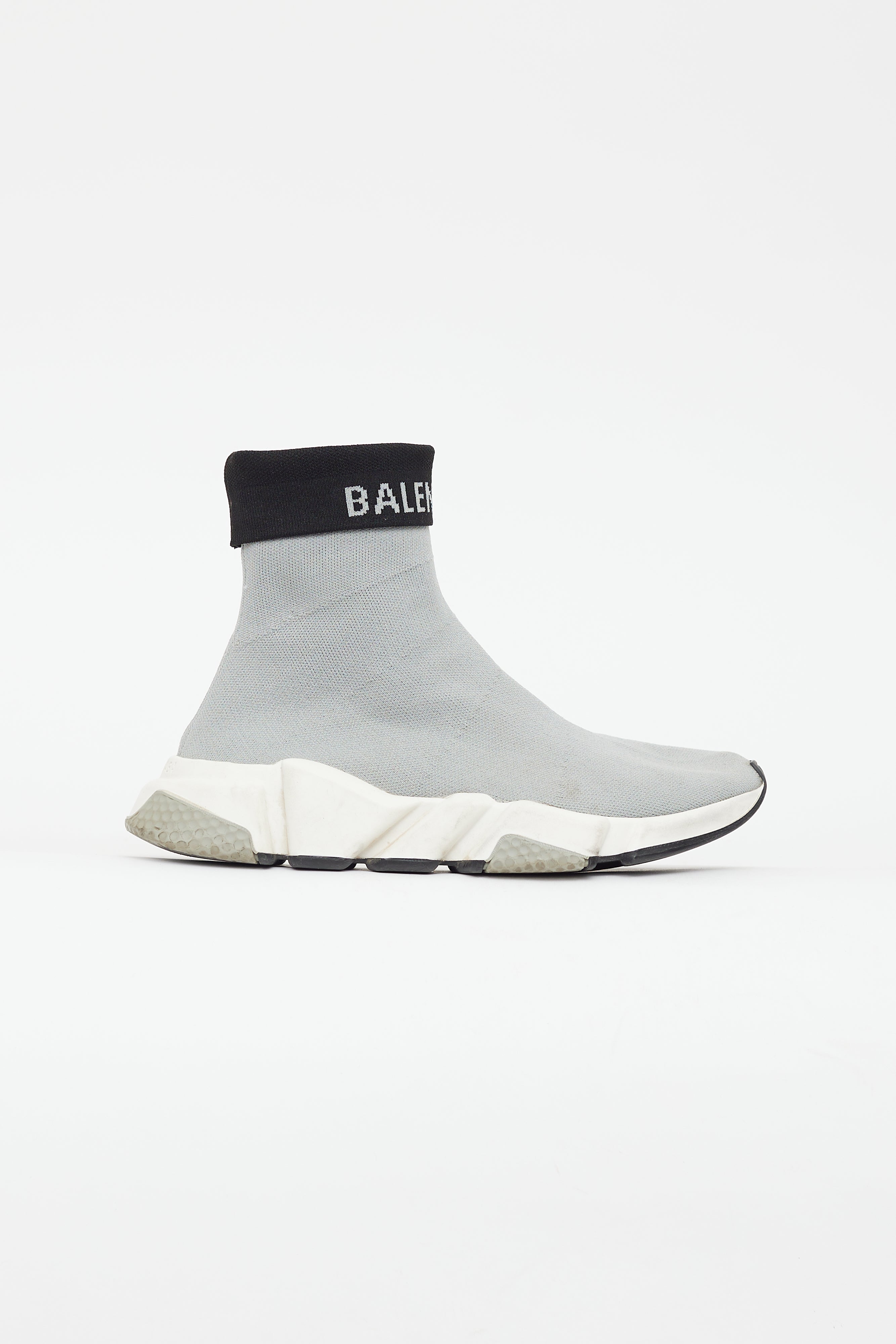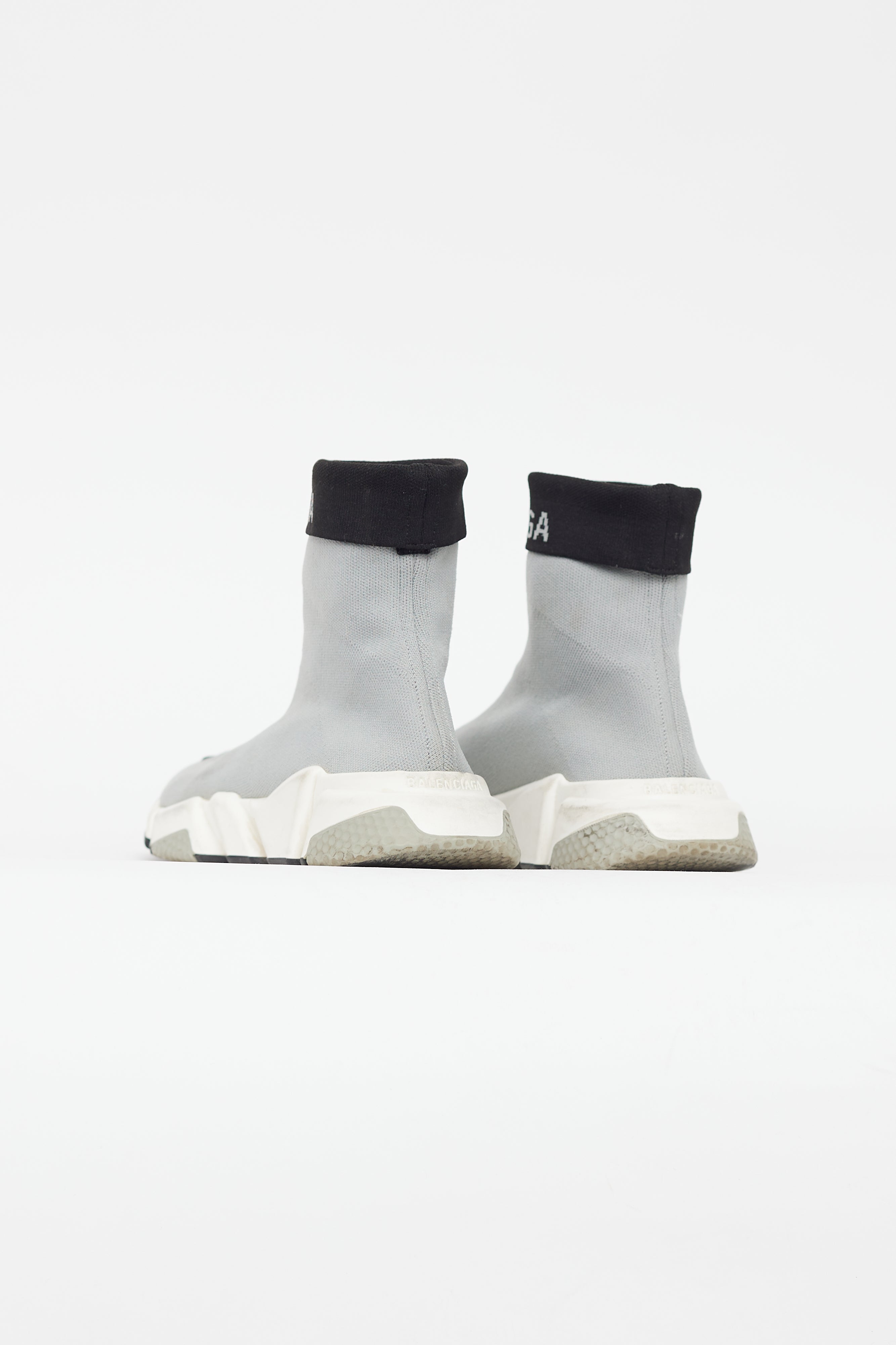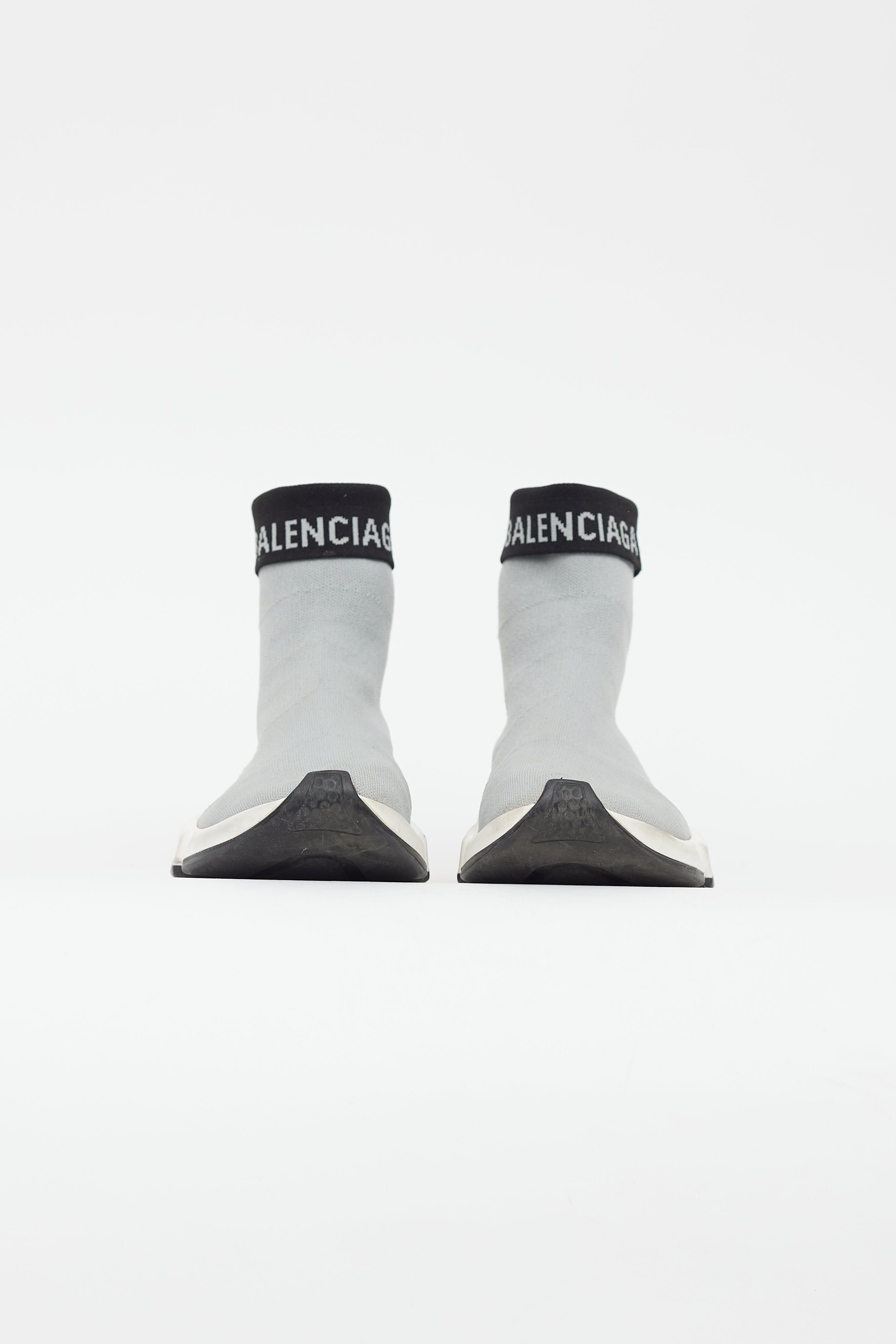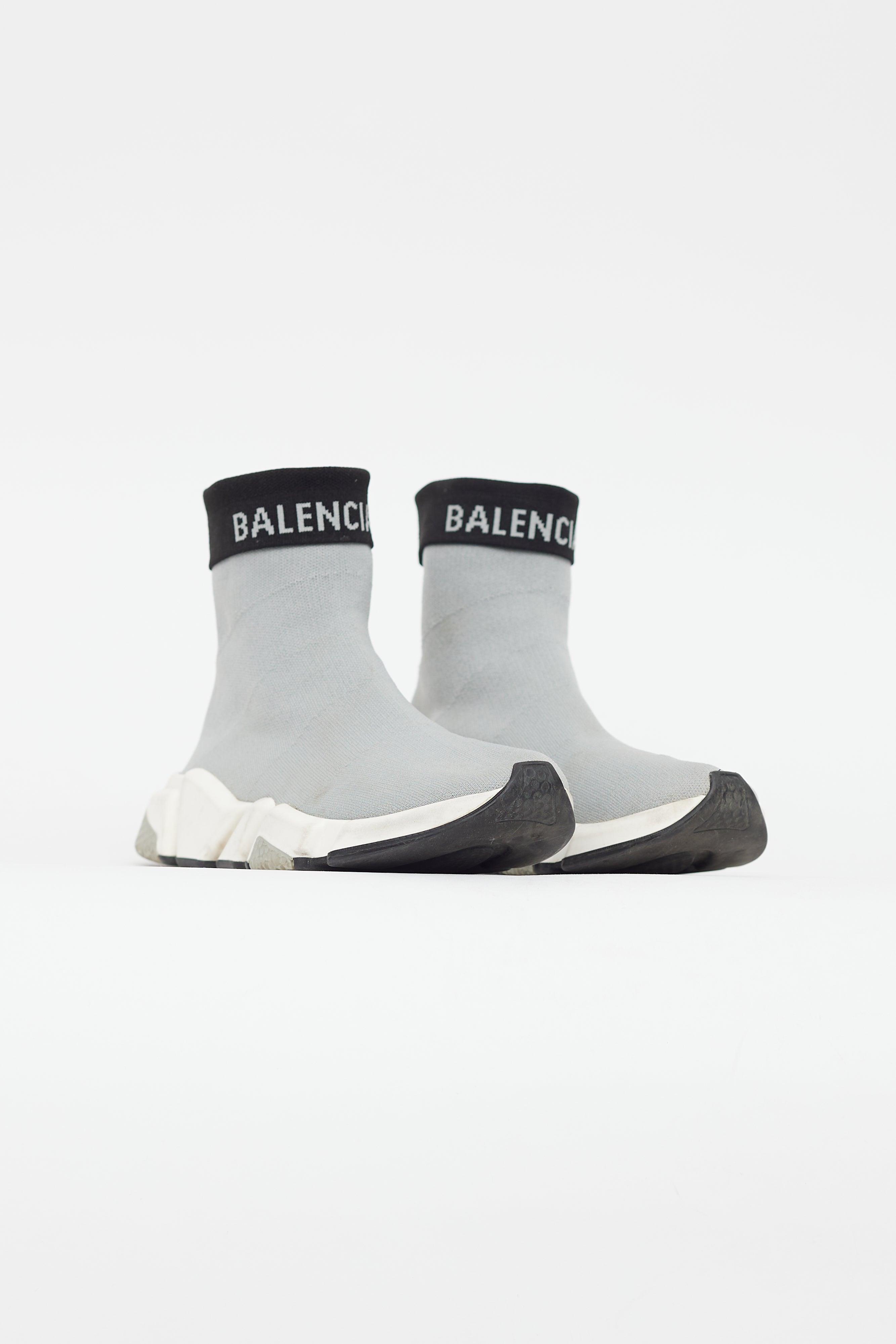 Pre-owned Balenciaga grey Speed sneakers featuring rounded toe, slip on entry, sock knit upper, folded opening with printed logo, and white rubber sole with embossed logo at back.