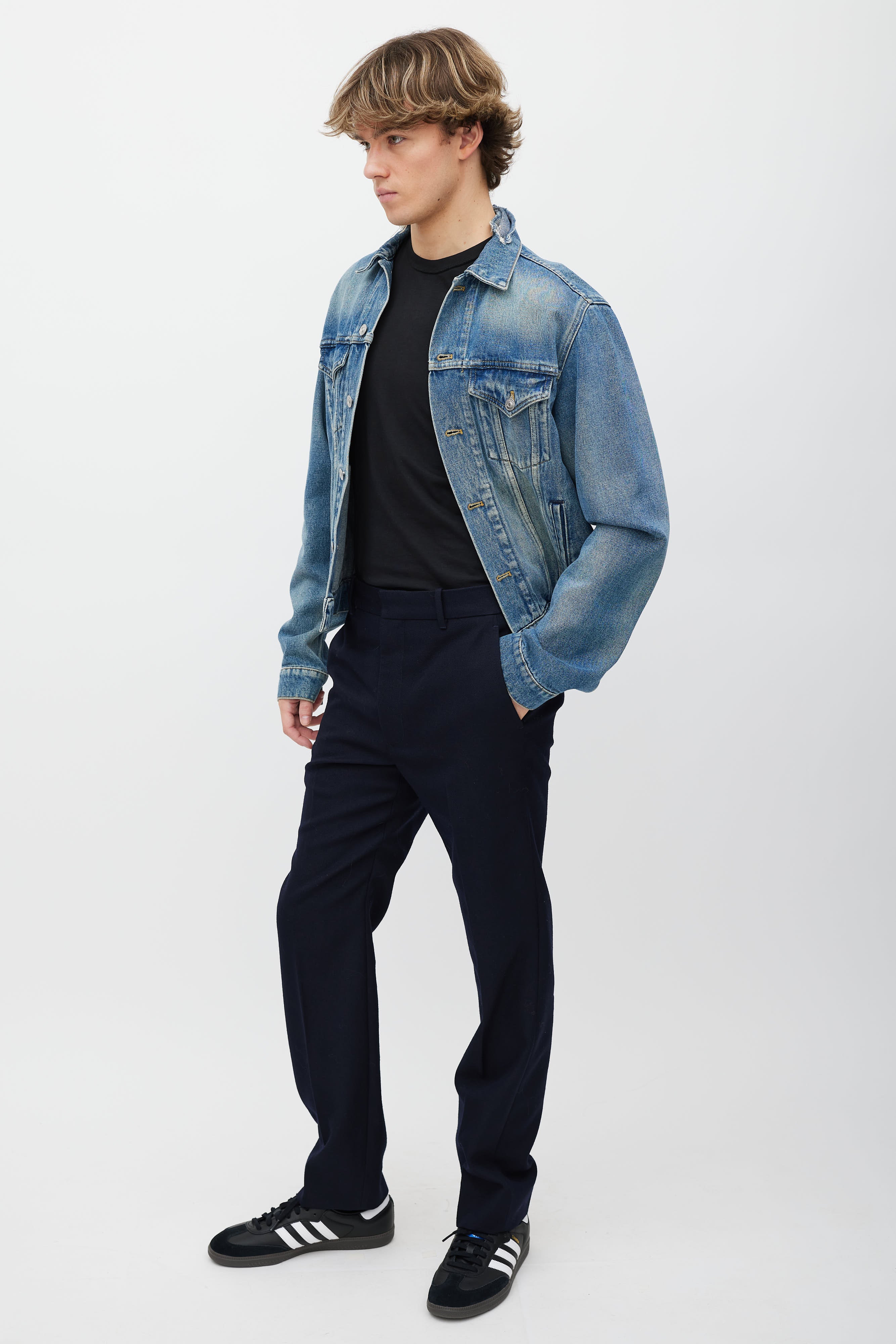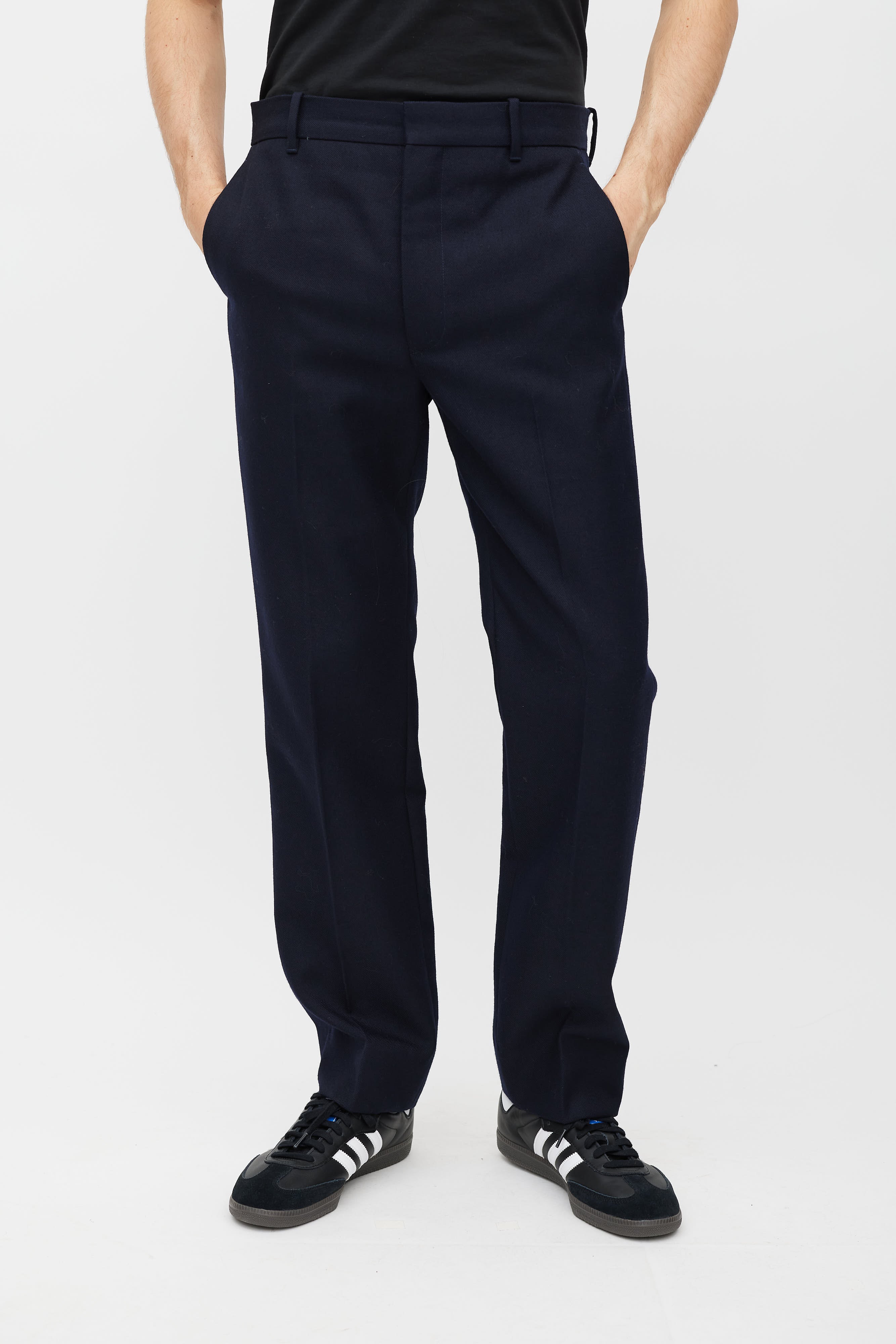 Pre-owned Balenciaga blue wool trousers featuring a straight leg with creases, two slash pockets at waist, one welt pocket at back right, and zip closure at front with top hook and eye fastening. Lined.