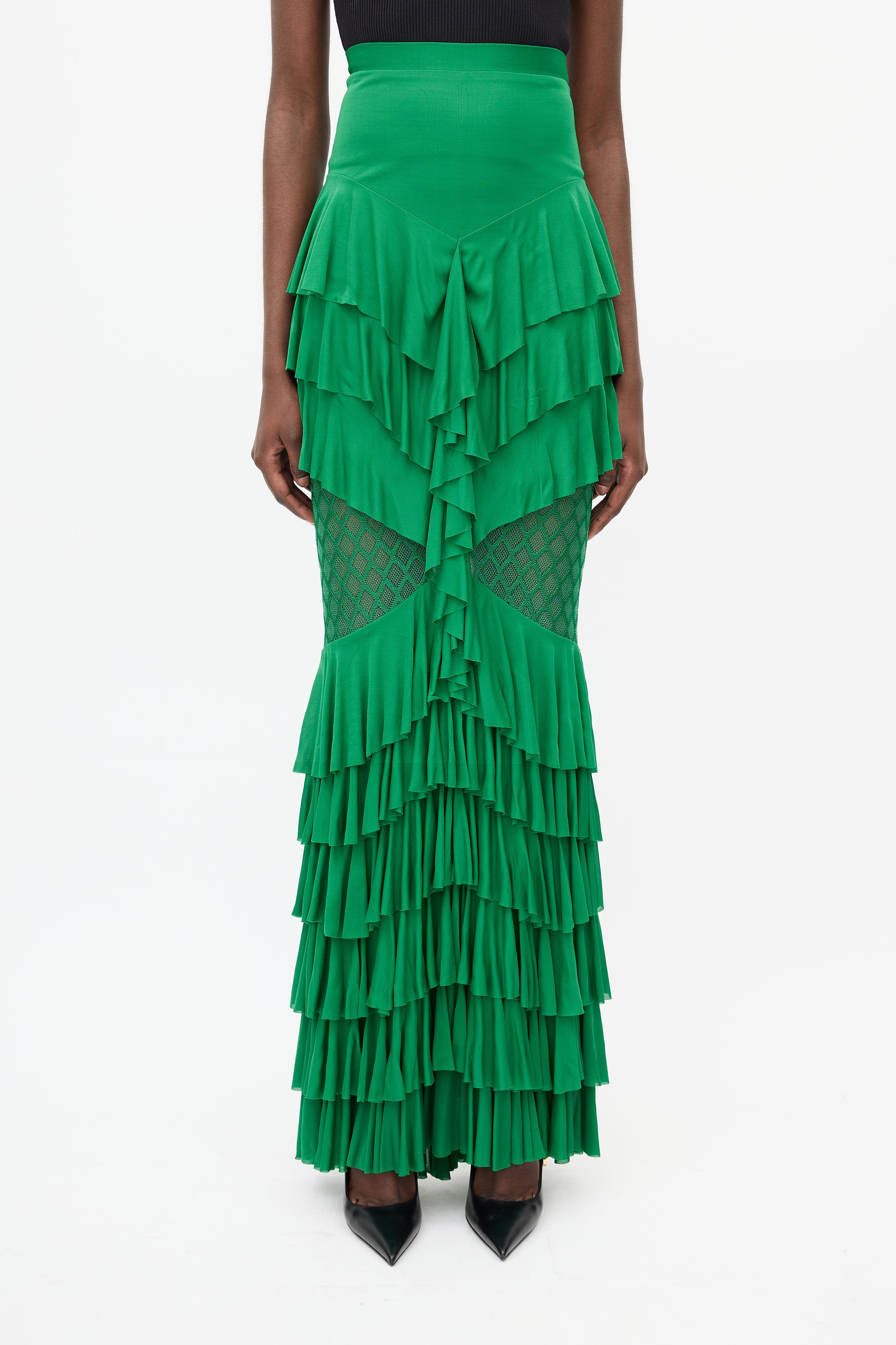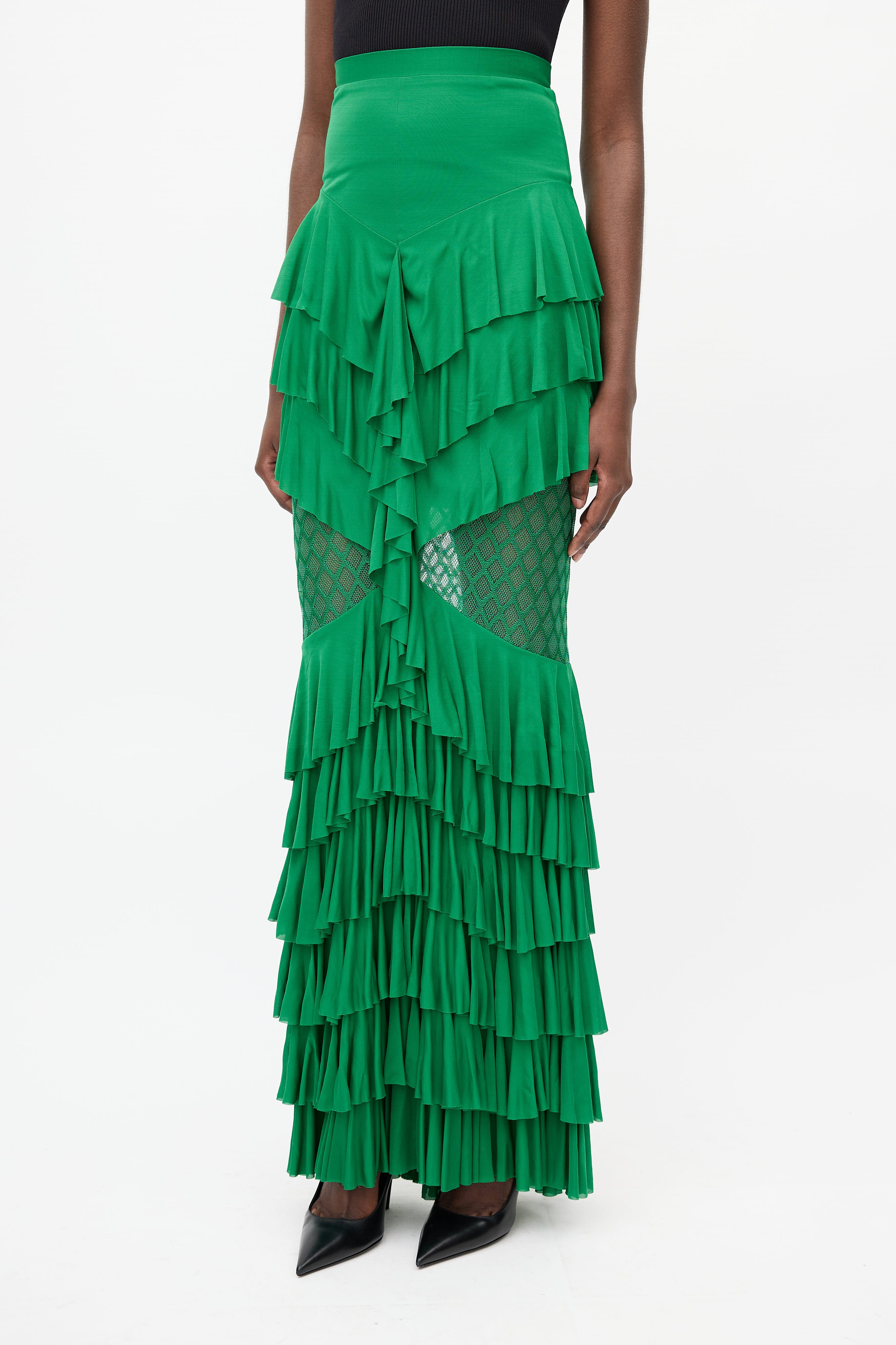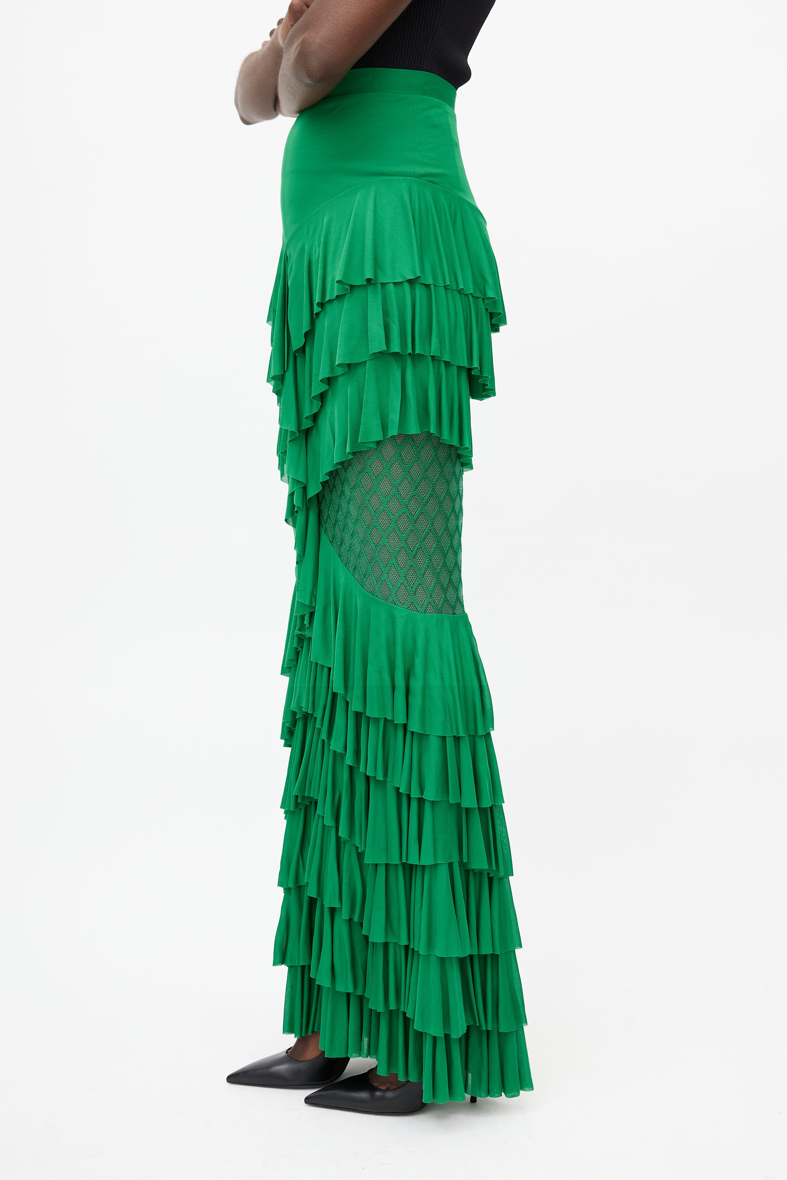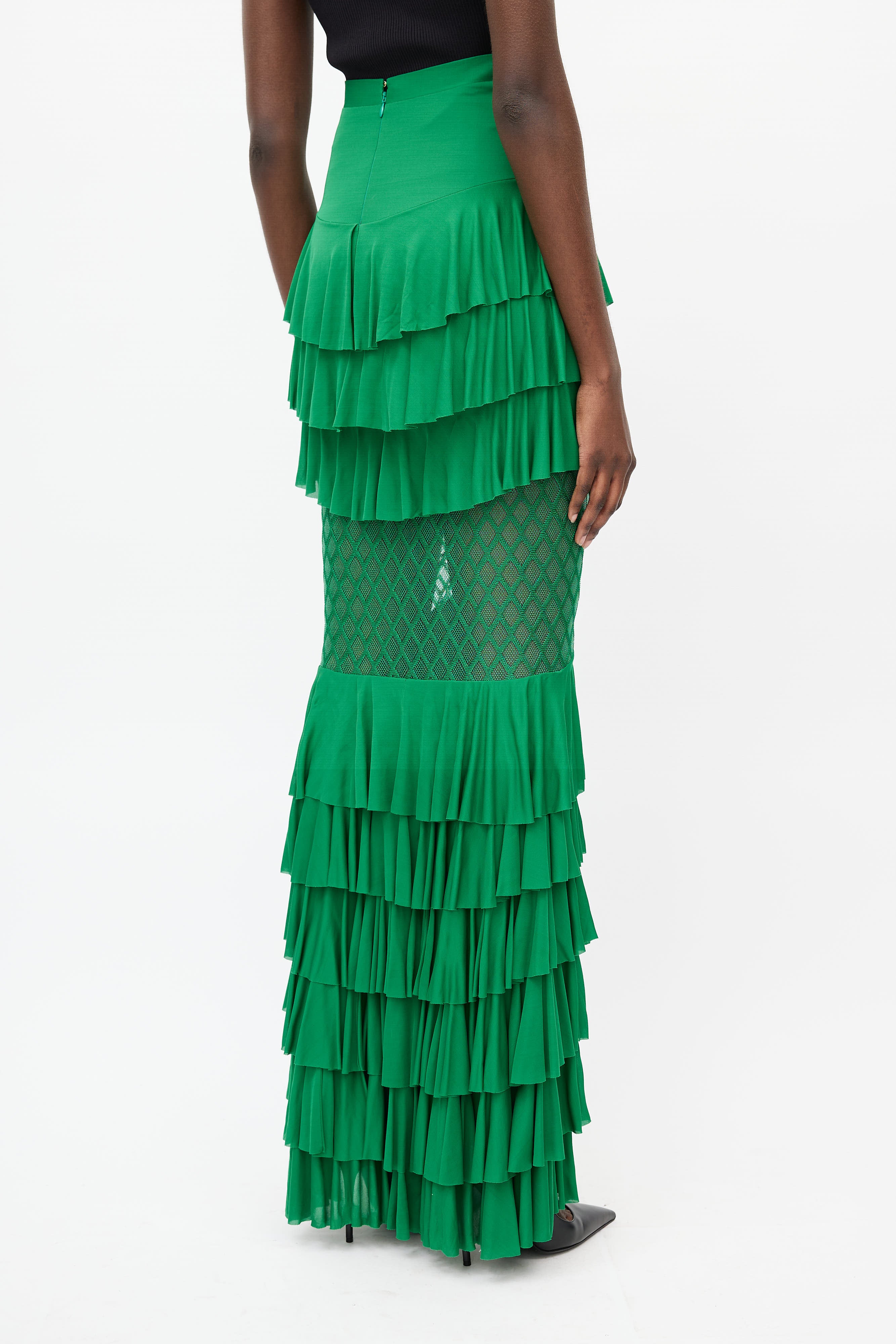 Pre-owned 2017 Balmain green skirt featuring ruffled tiered detailing throughout, lace knit insert at centre, and concealed zip at back with hook and eye closure. Lined.