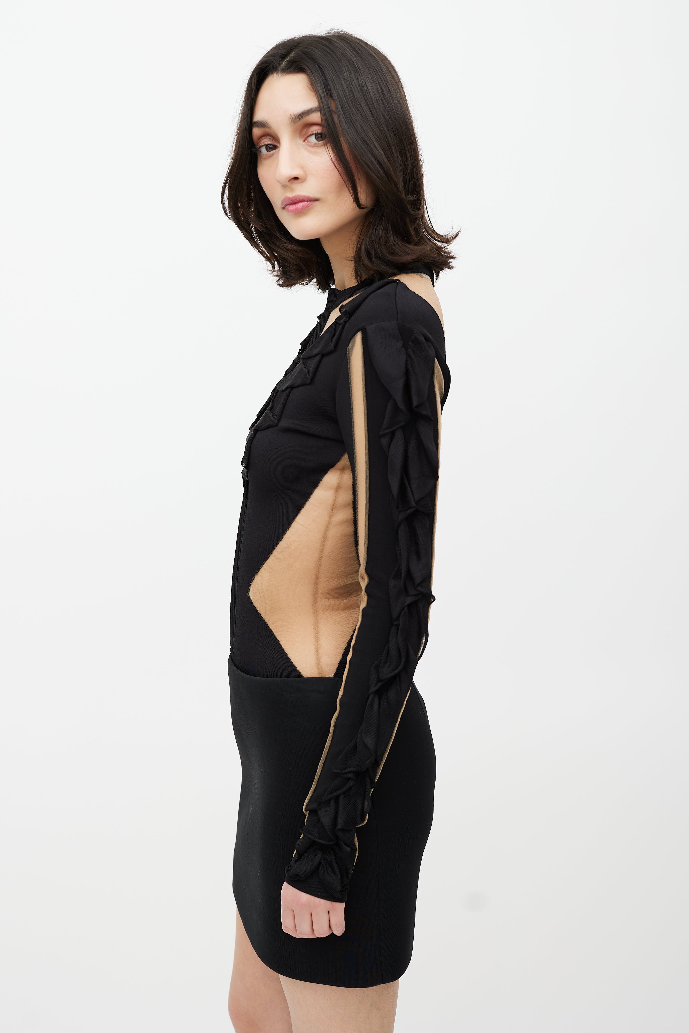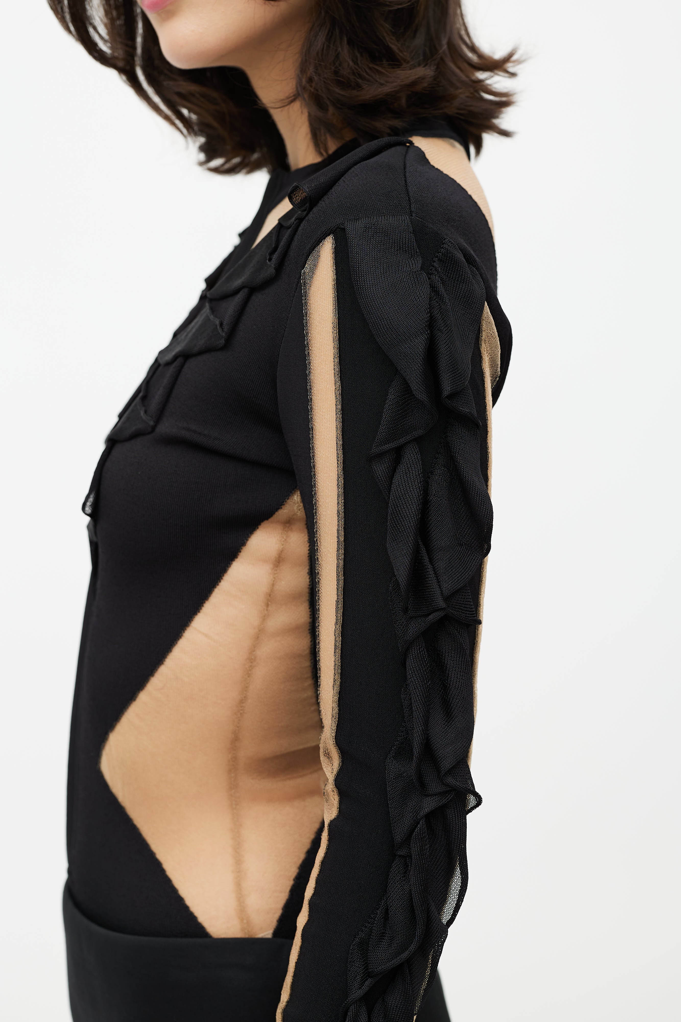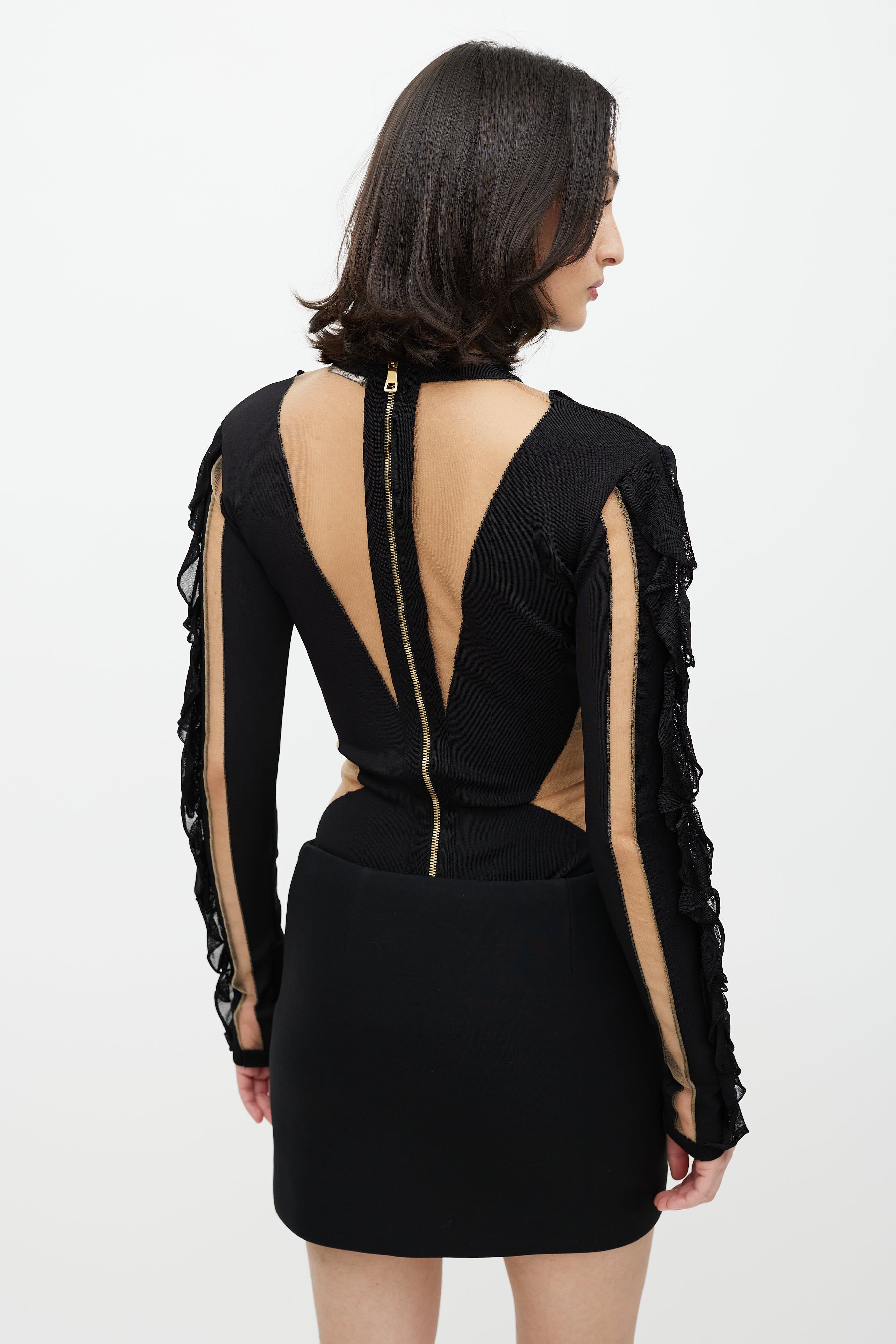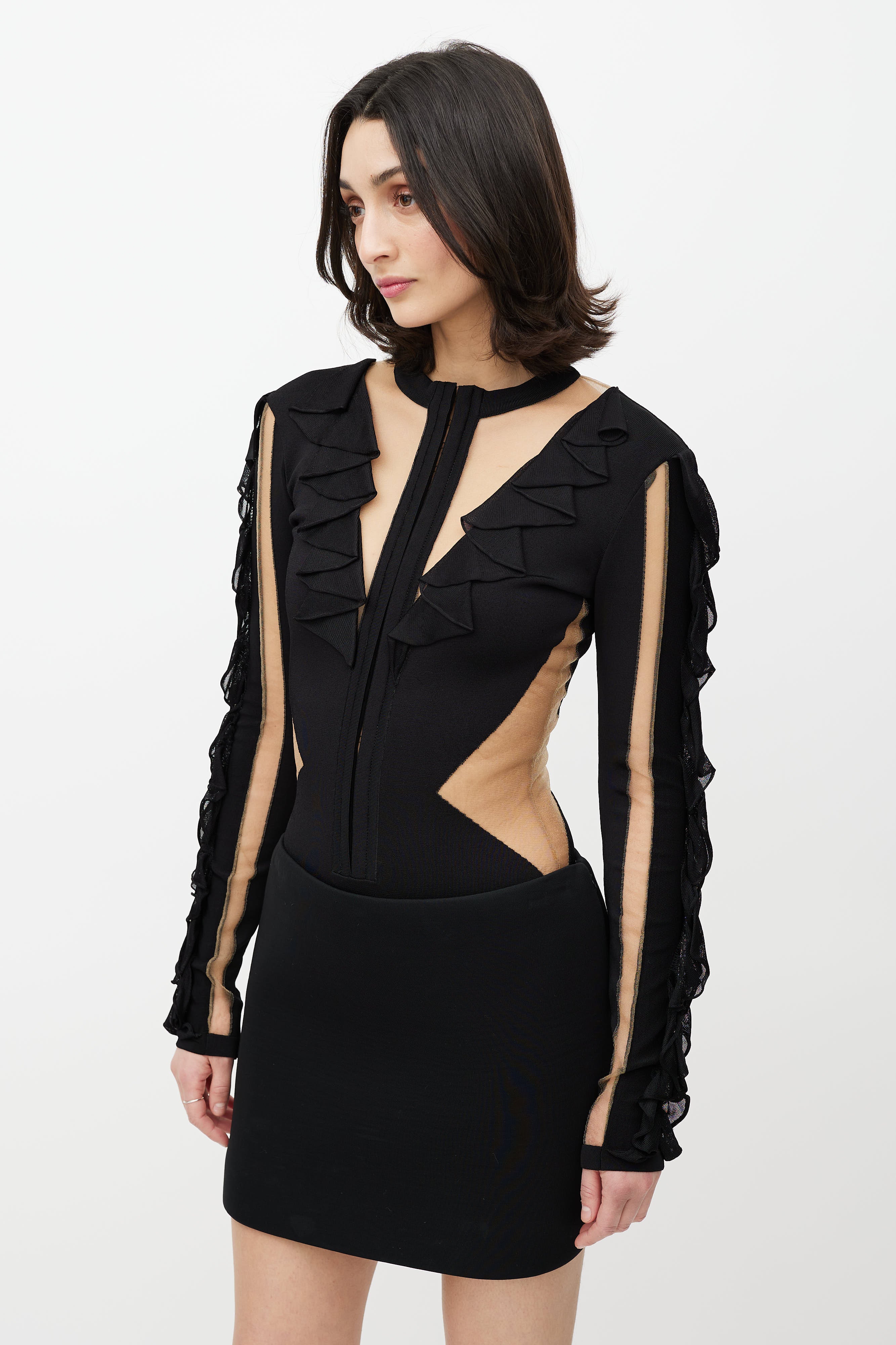 Balmain black bodysuit featuring beige mesh inserts, round neckline, long sleeves, ruffled detailing throughout, zip at back, snap detail at bottom, and front hook and eye closure.