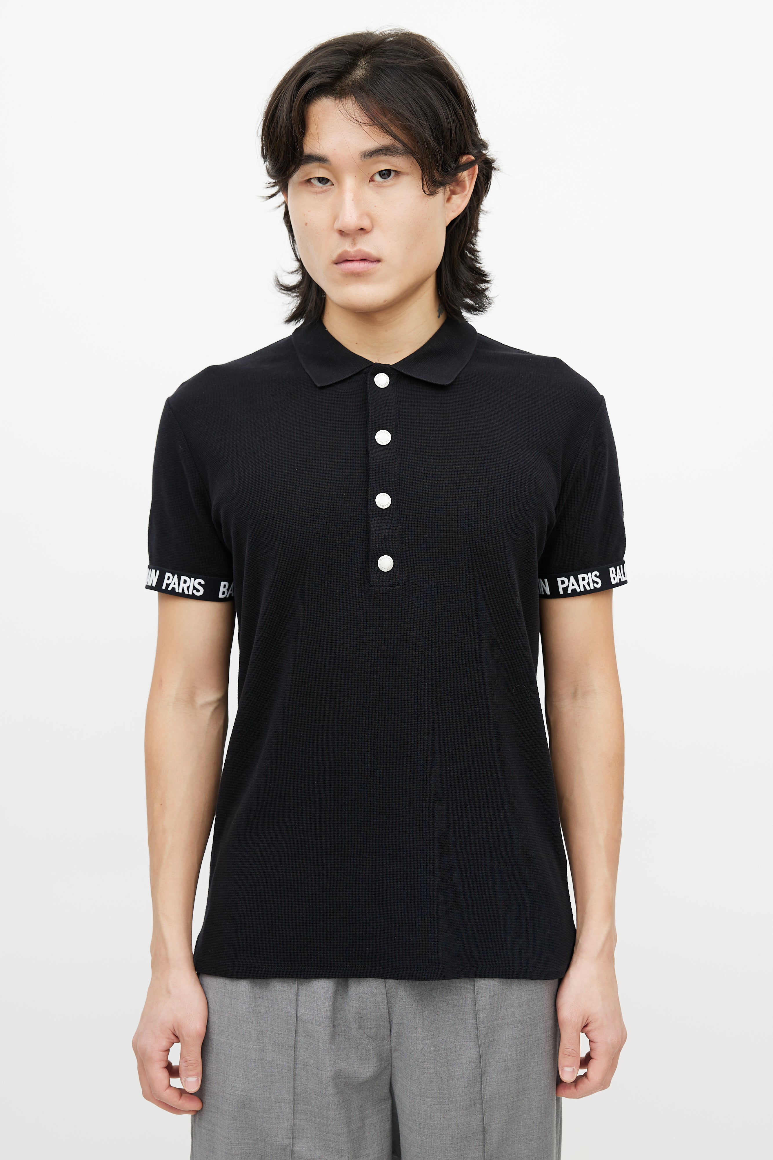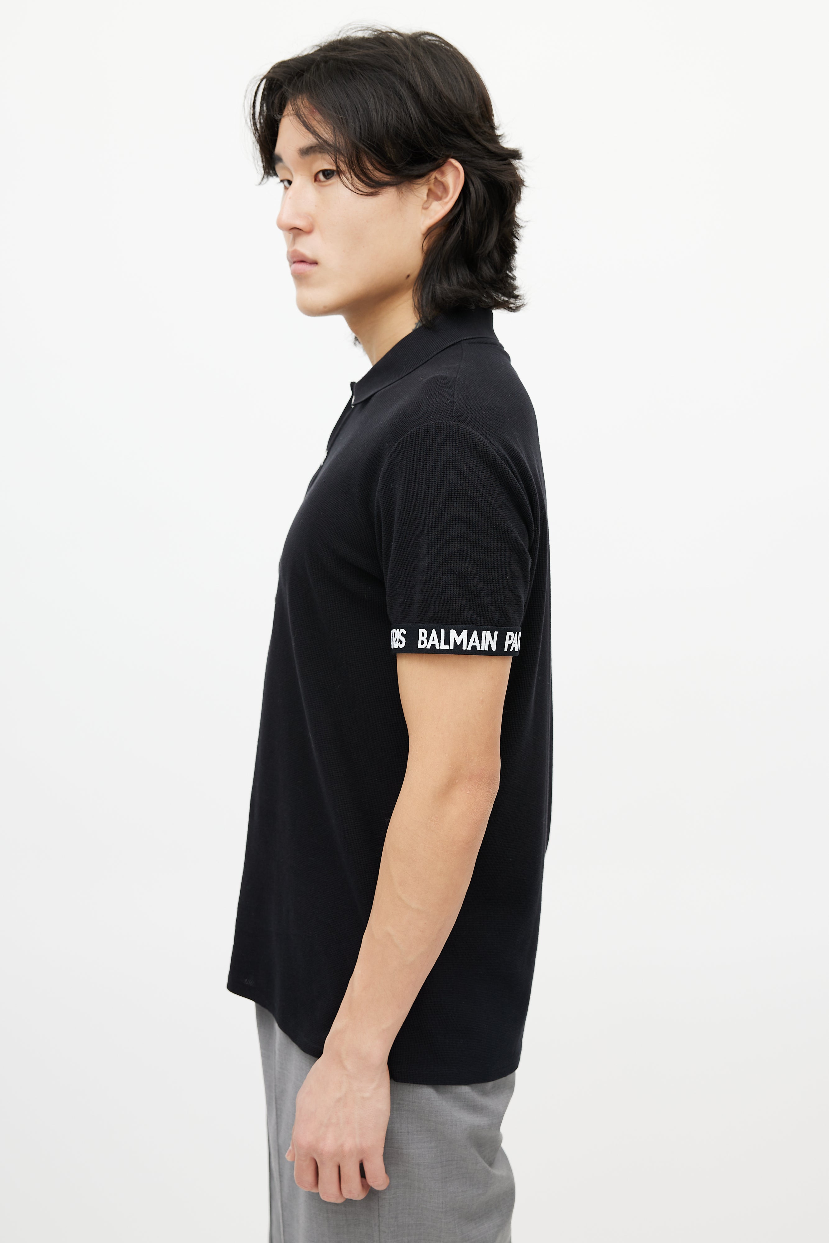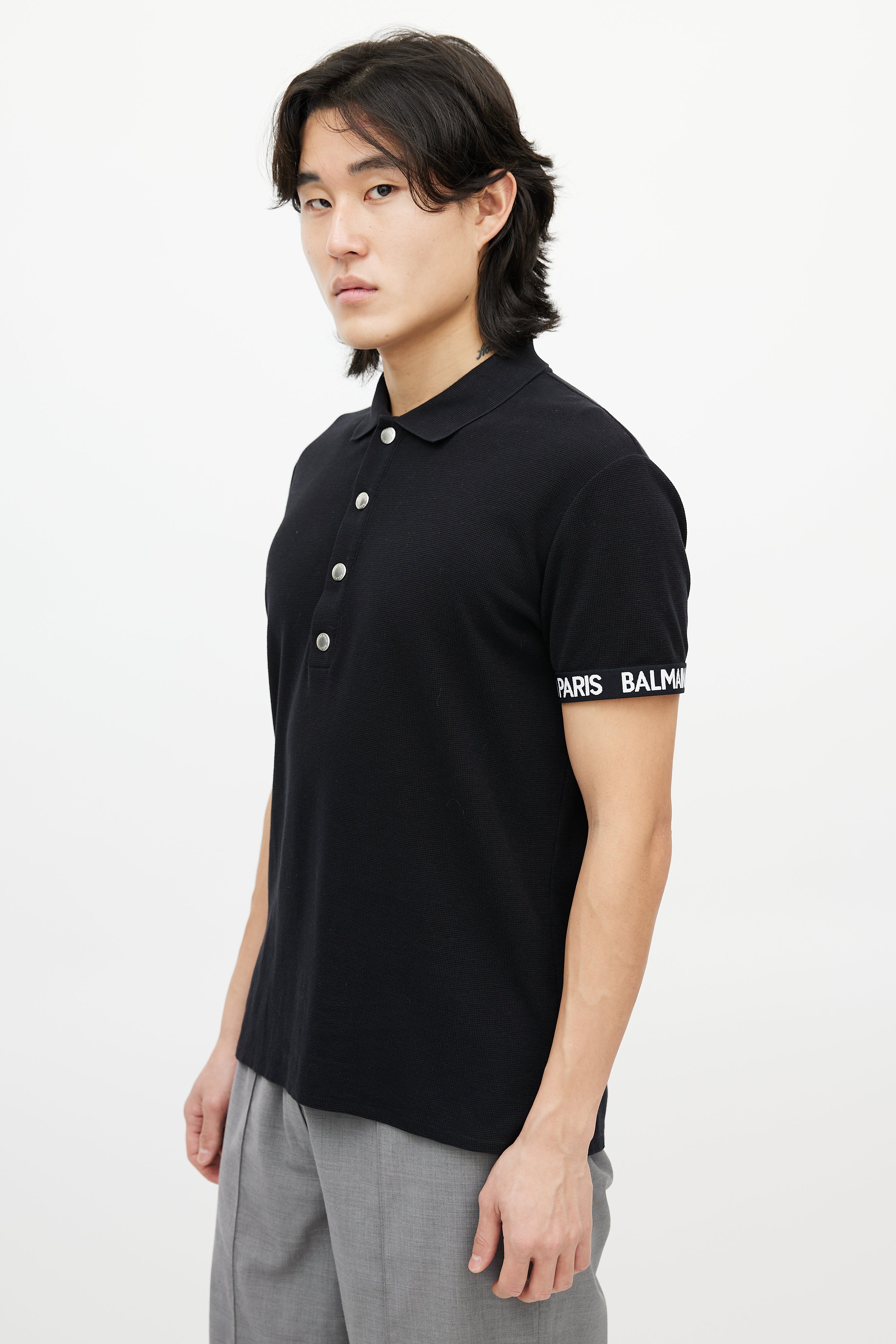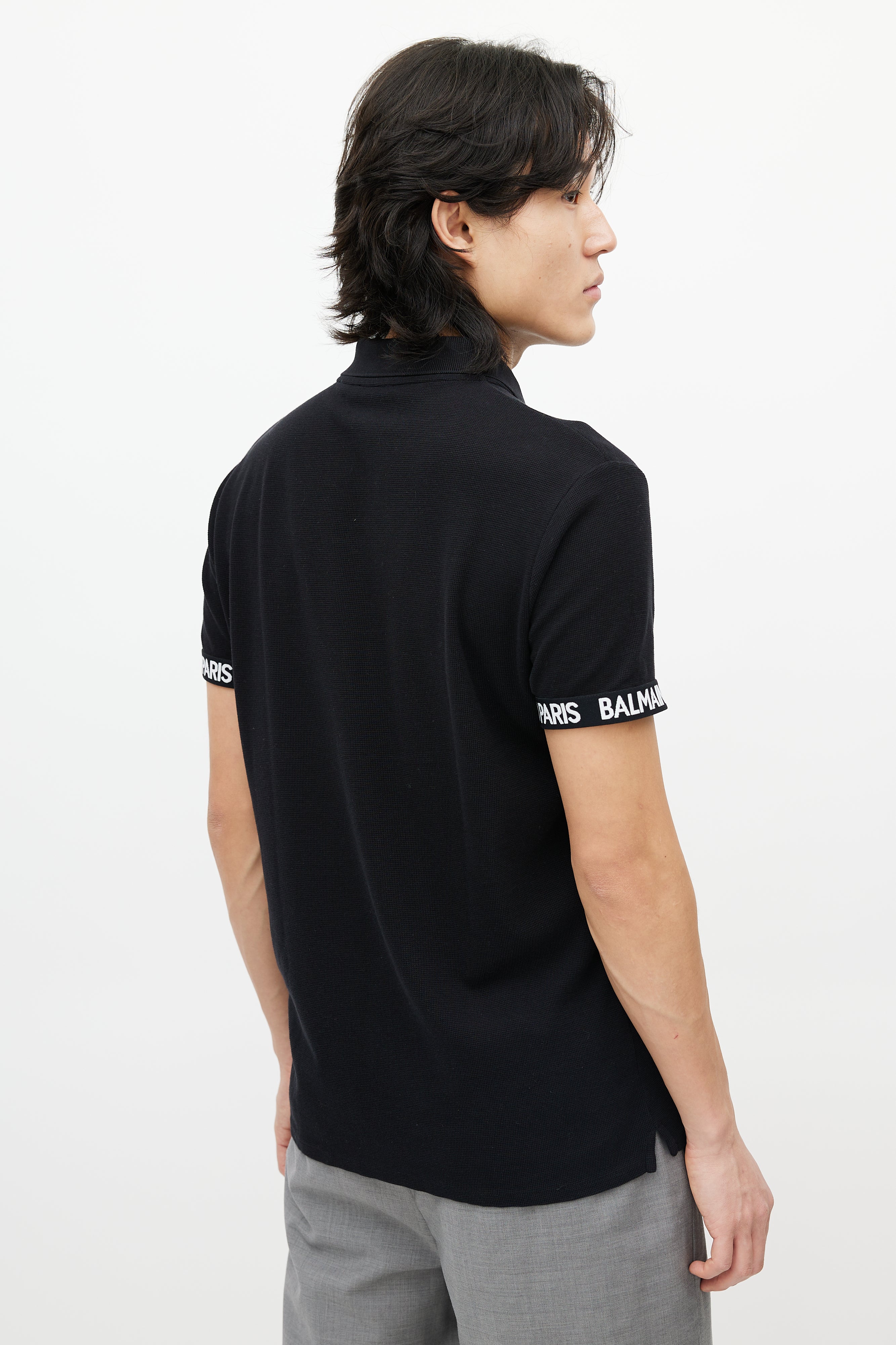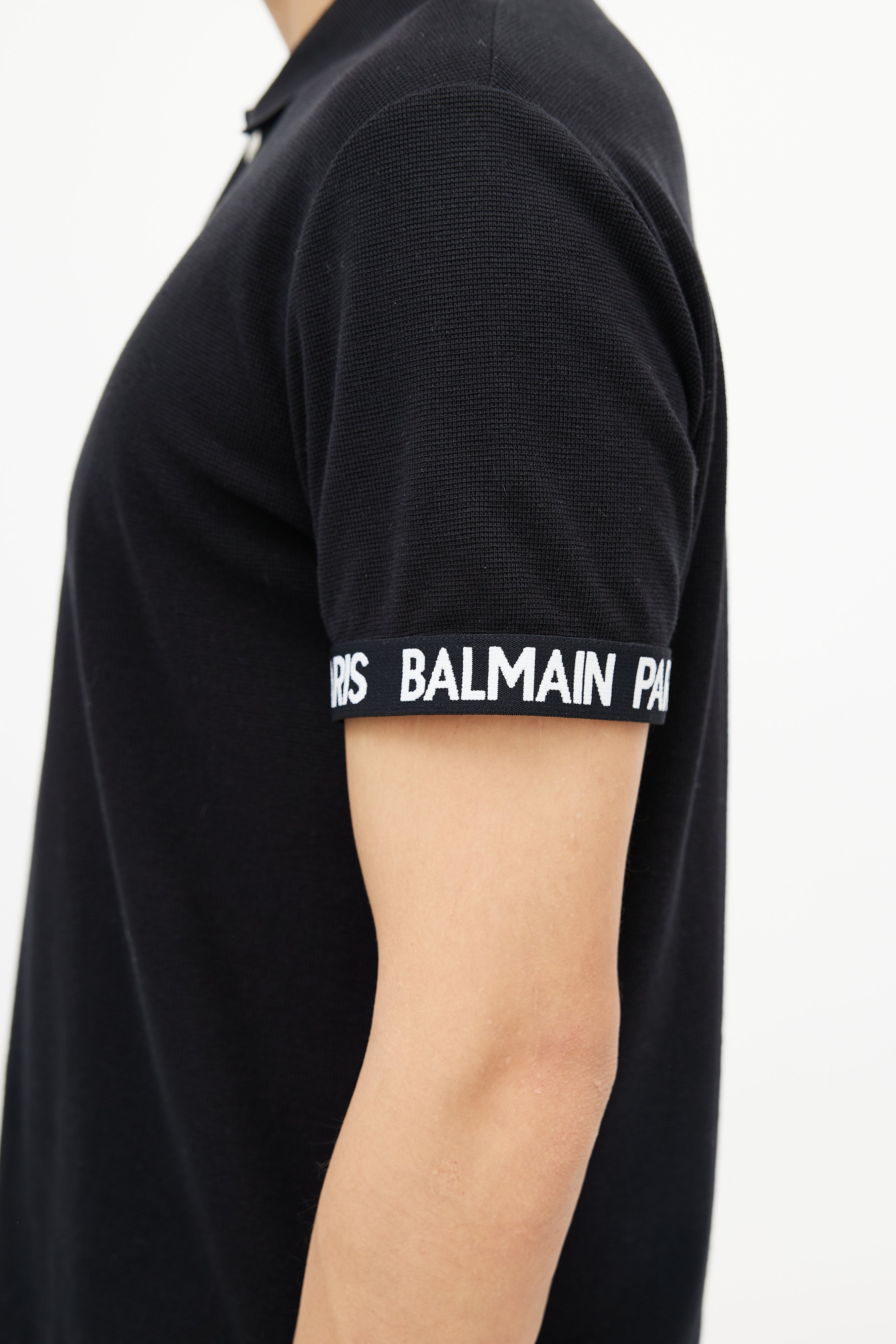 Pre-owned Balmain black knit polo shirt featuring a pointed collar, short sleeves with white logo cuffs, and quarter button up closure.