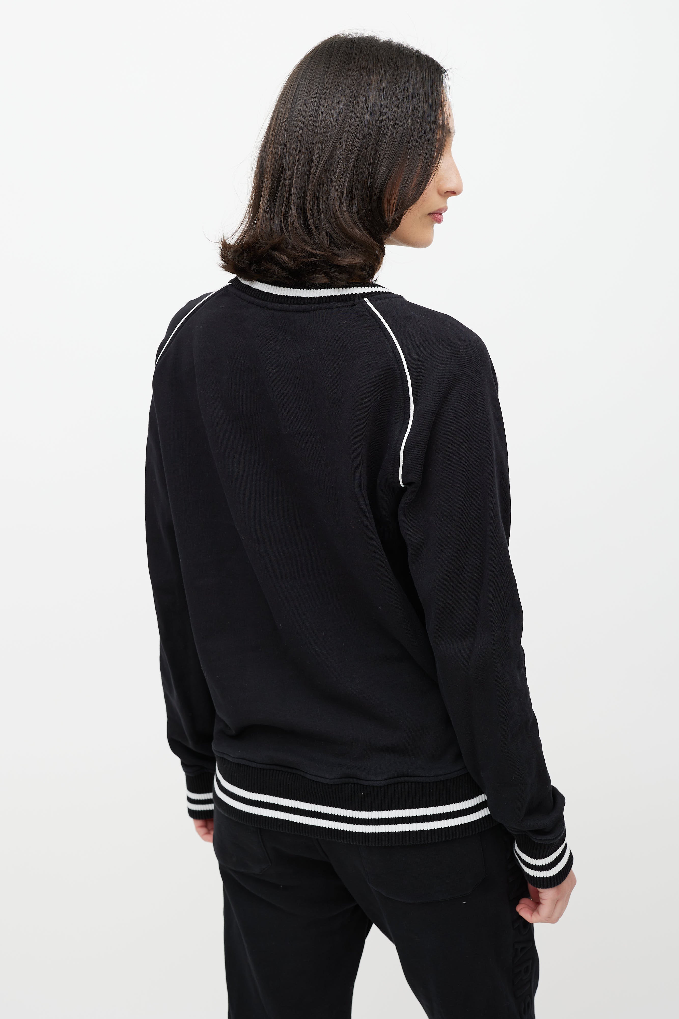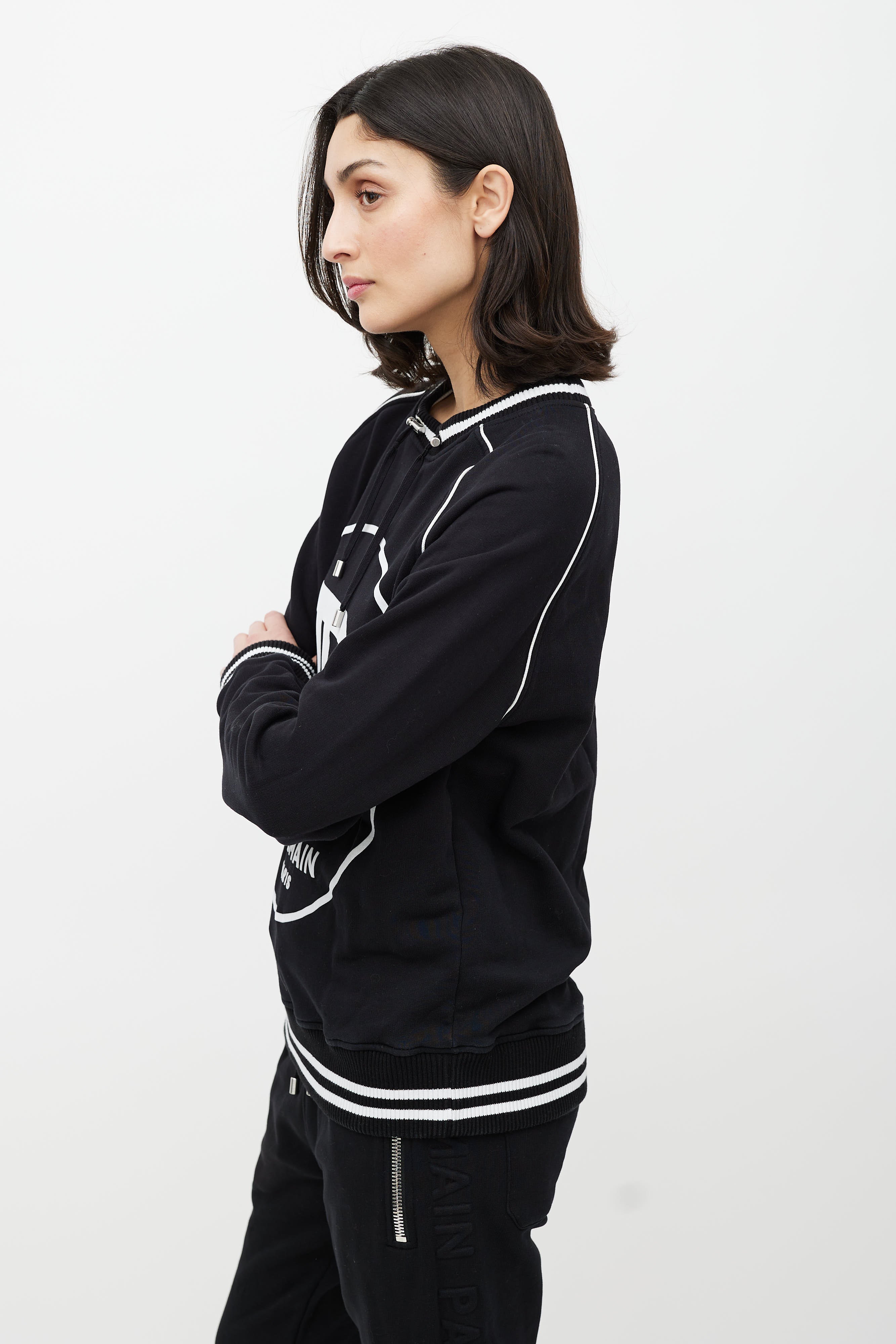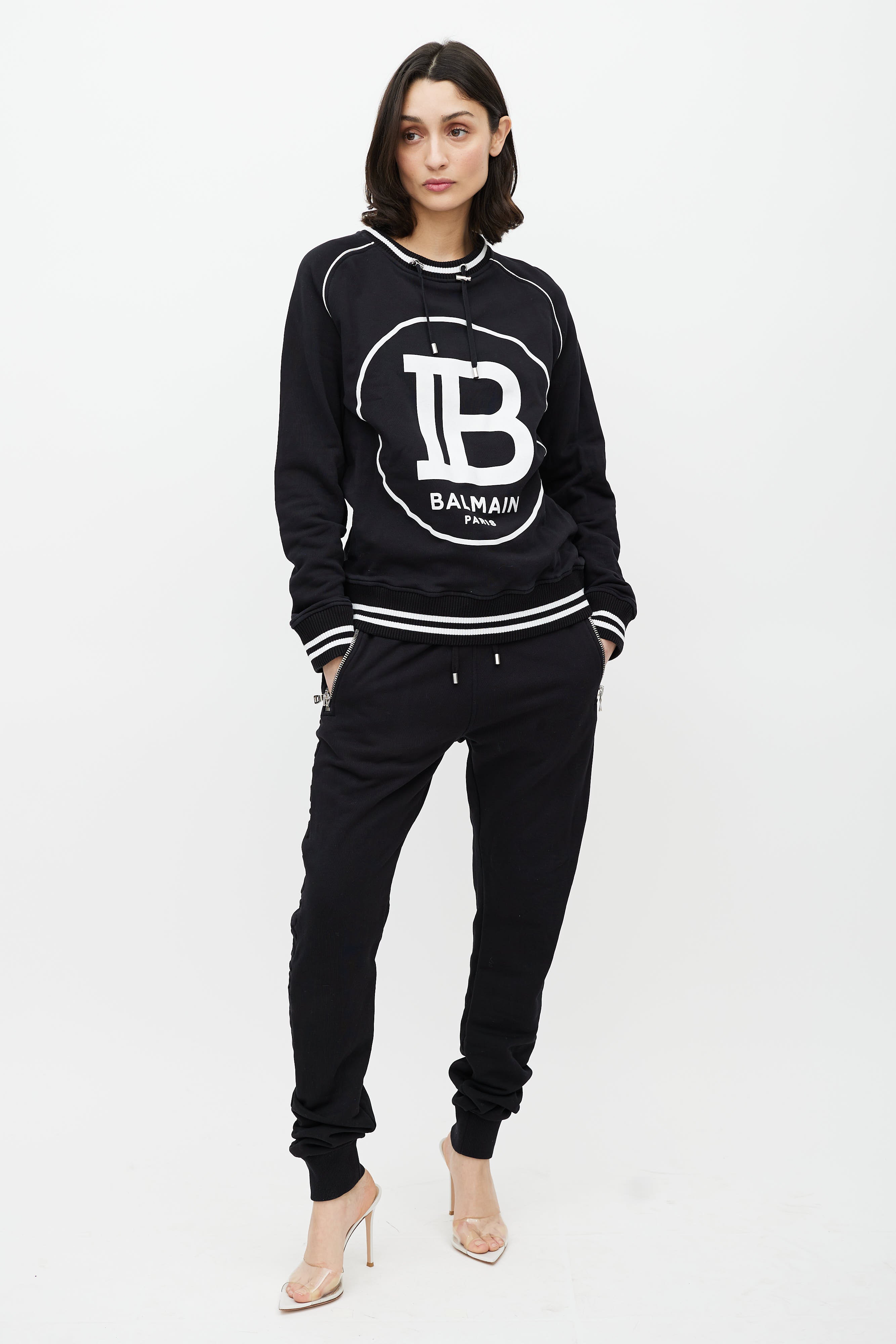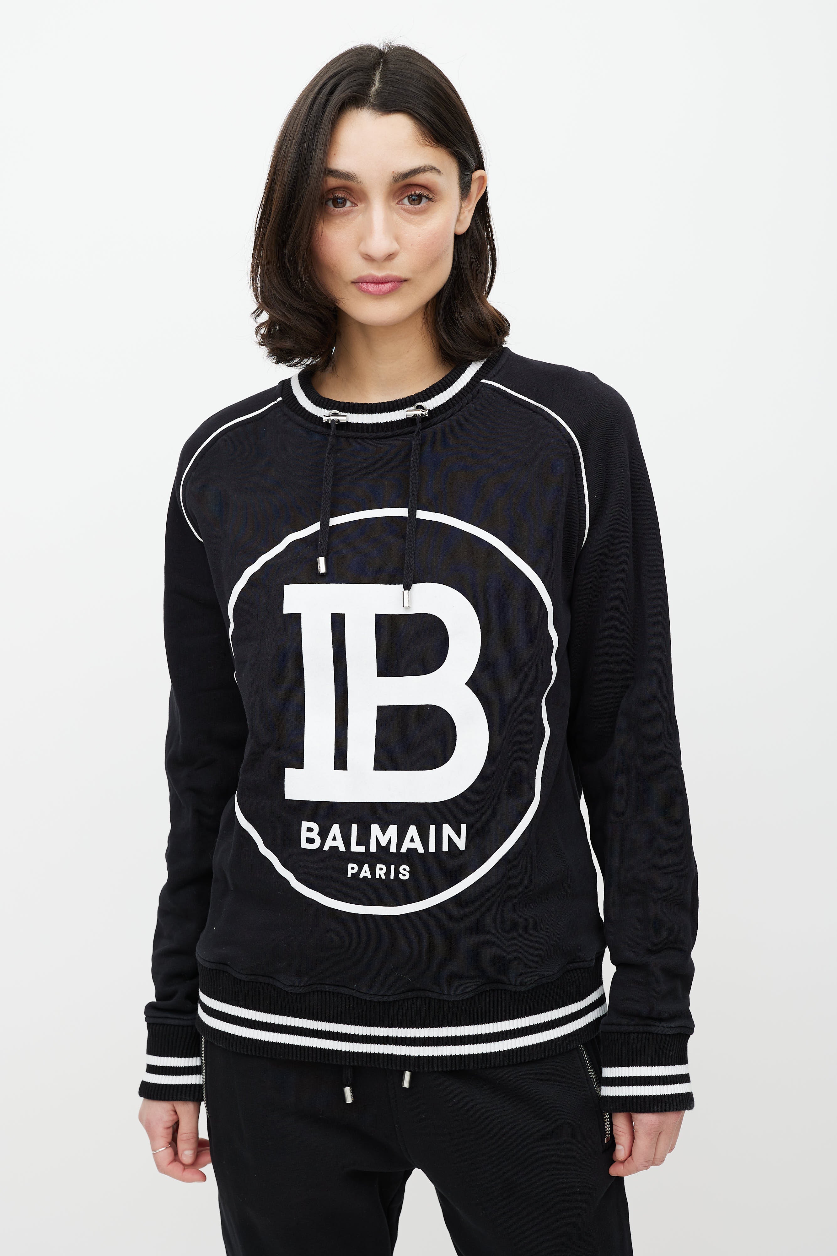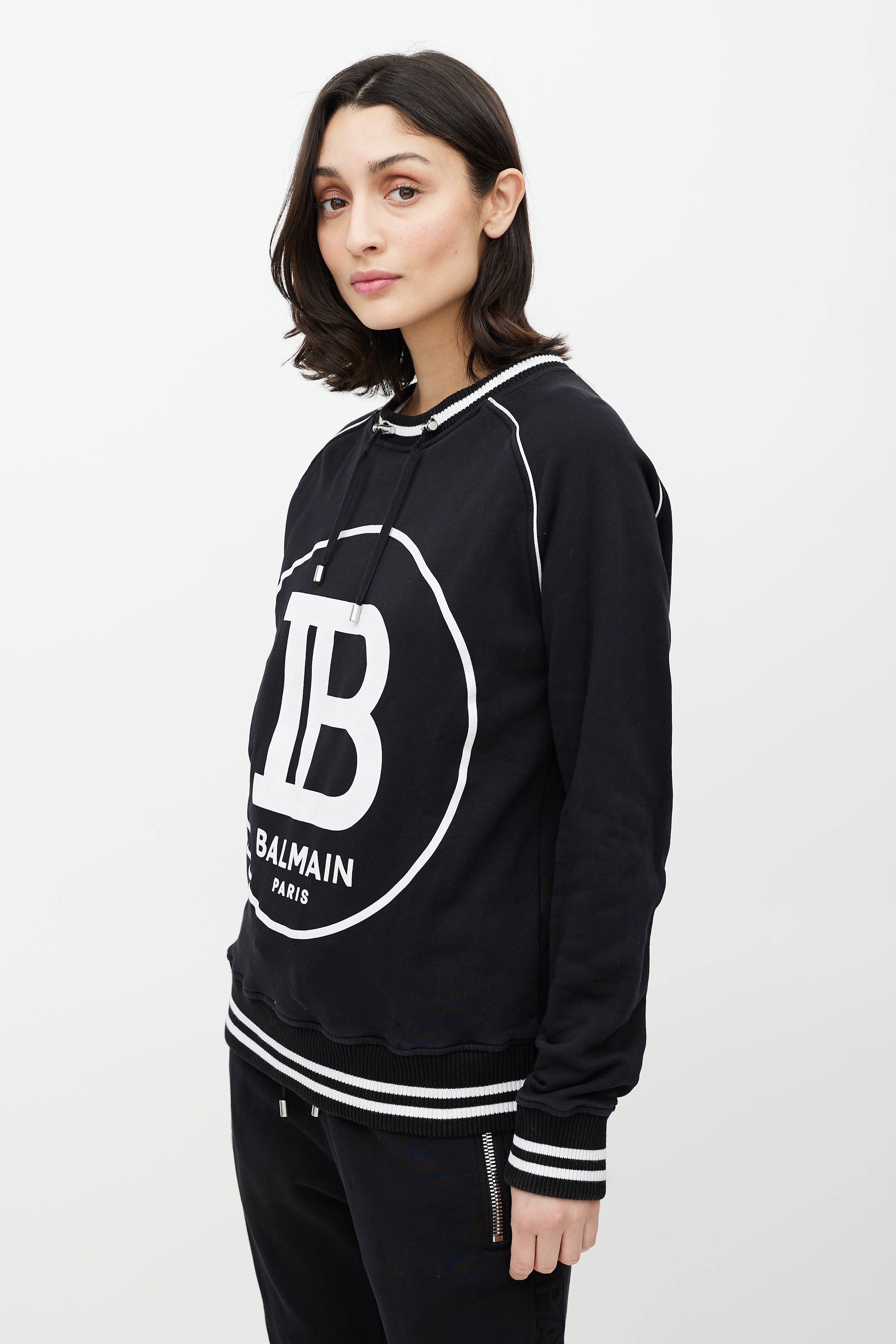 Pre-owned Balmain black sweatshirt featuring a white logo print at chest, round neck with drawstring detail, long sleeves, and ribbed hem.