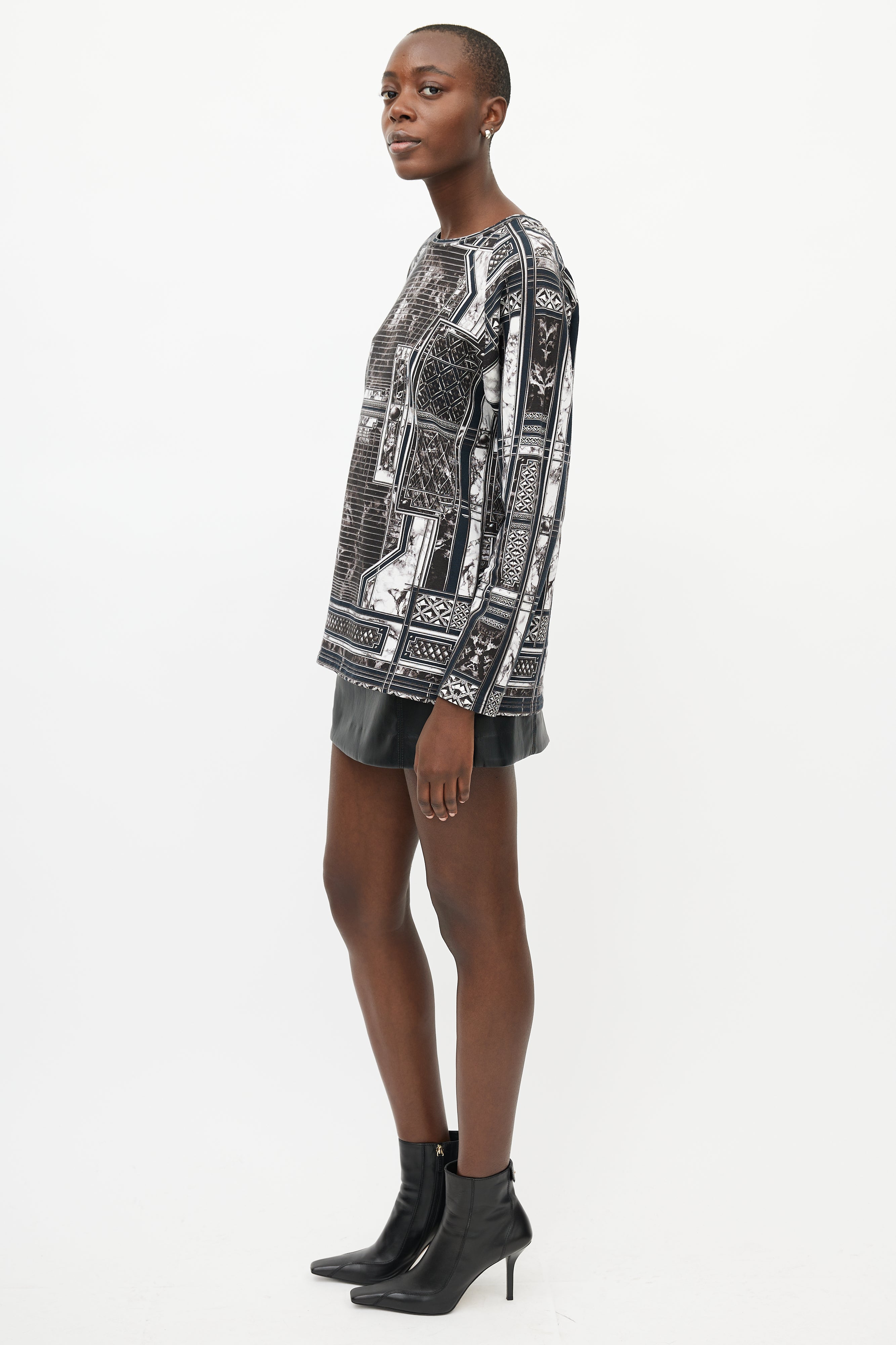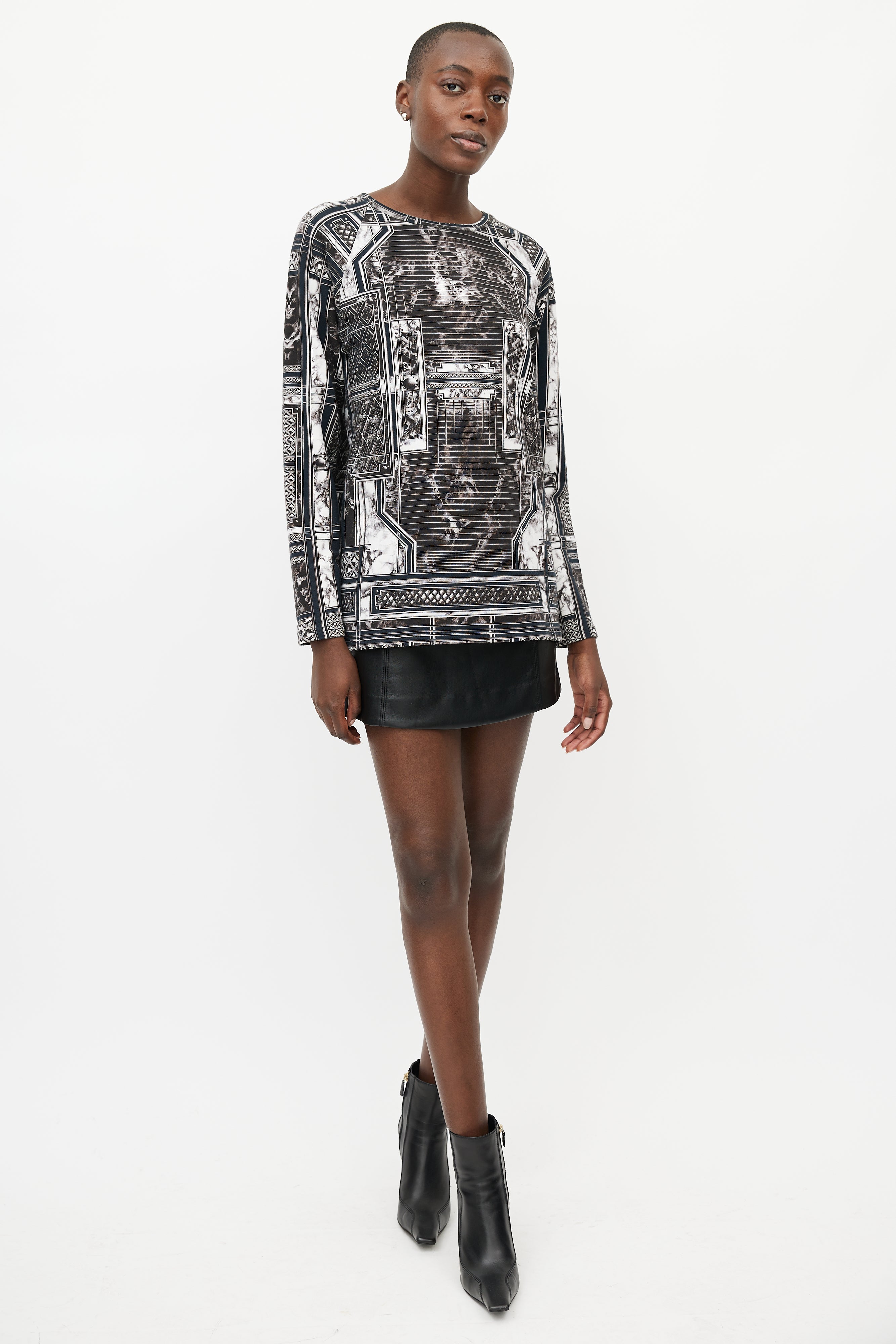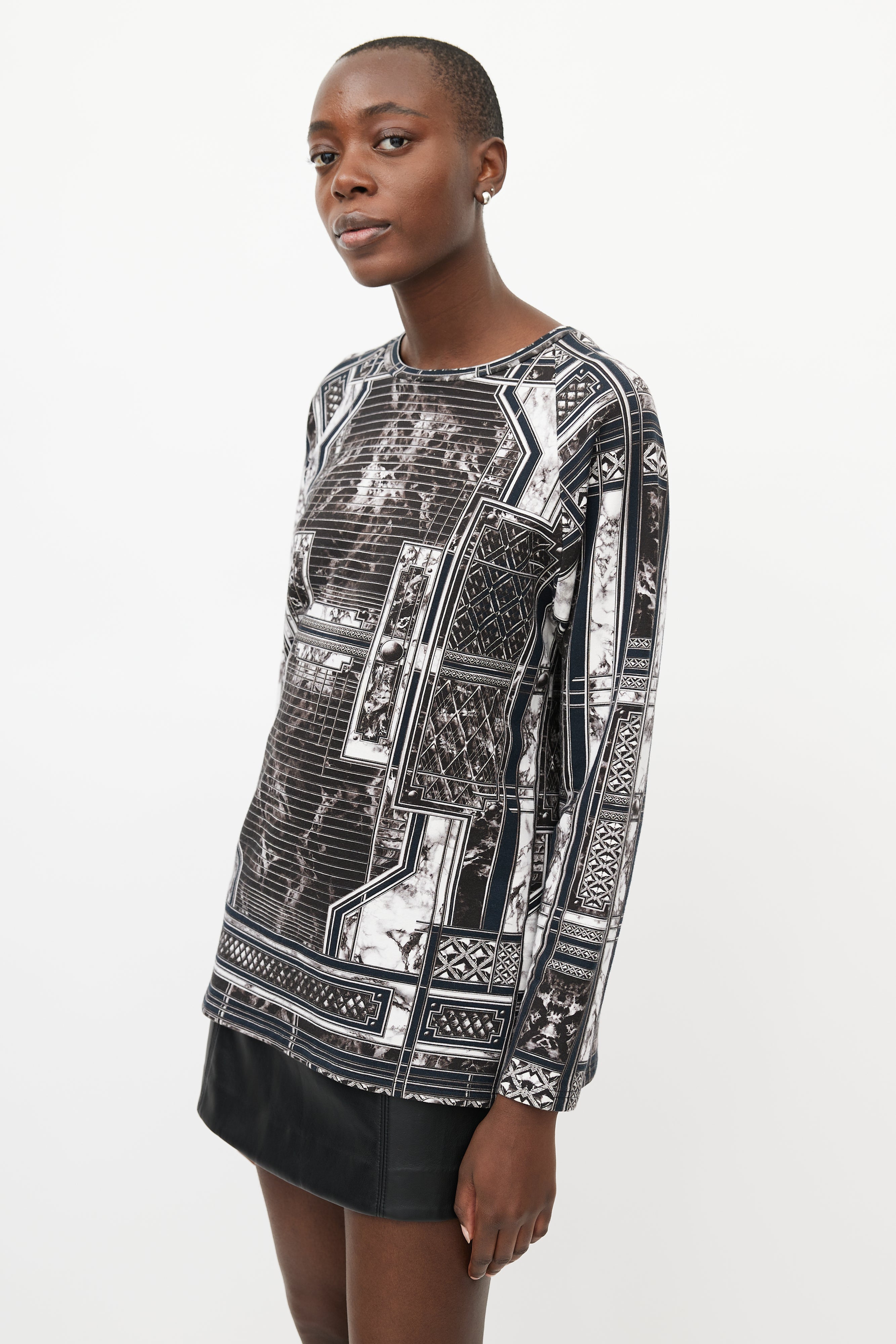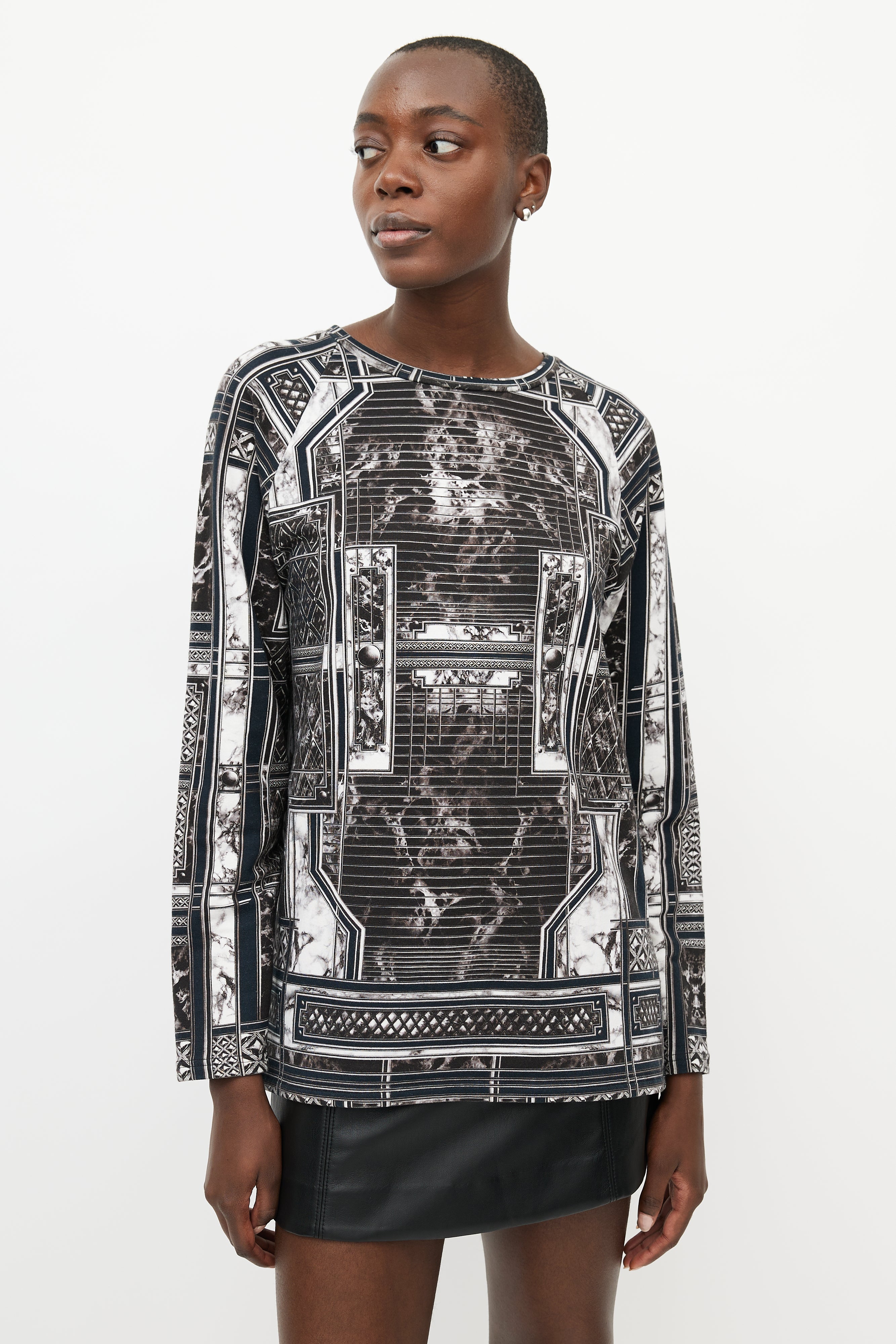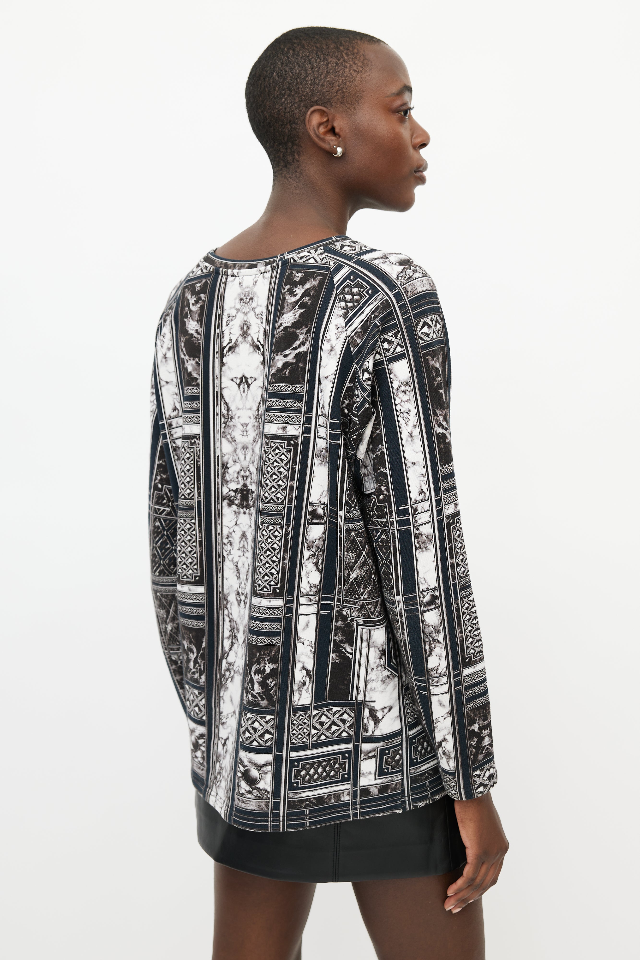 Pre-owned Balmain black top featuring a white marble print throughout, round neckline, and long raglan sleeves.