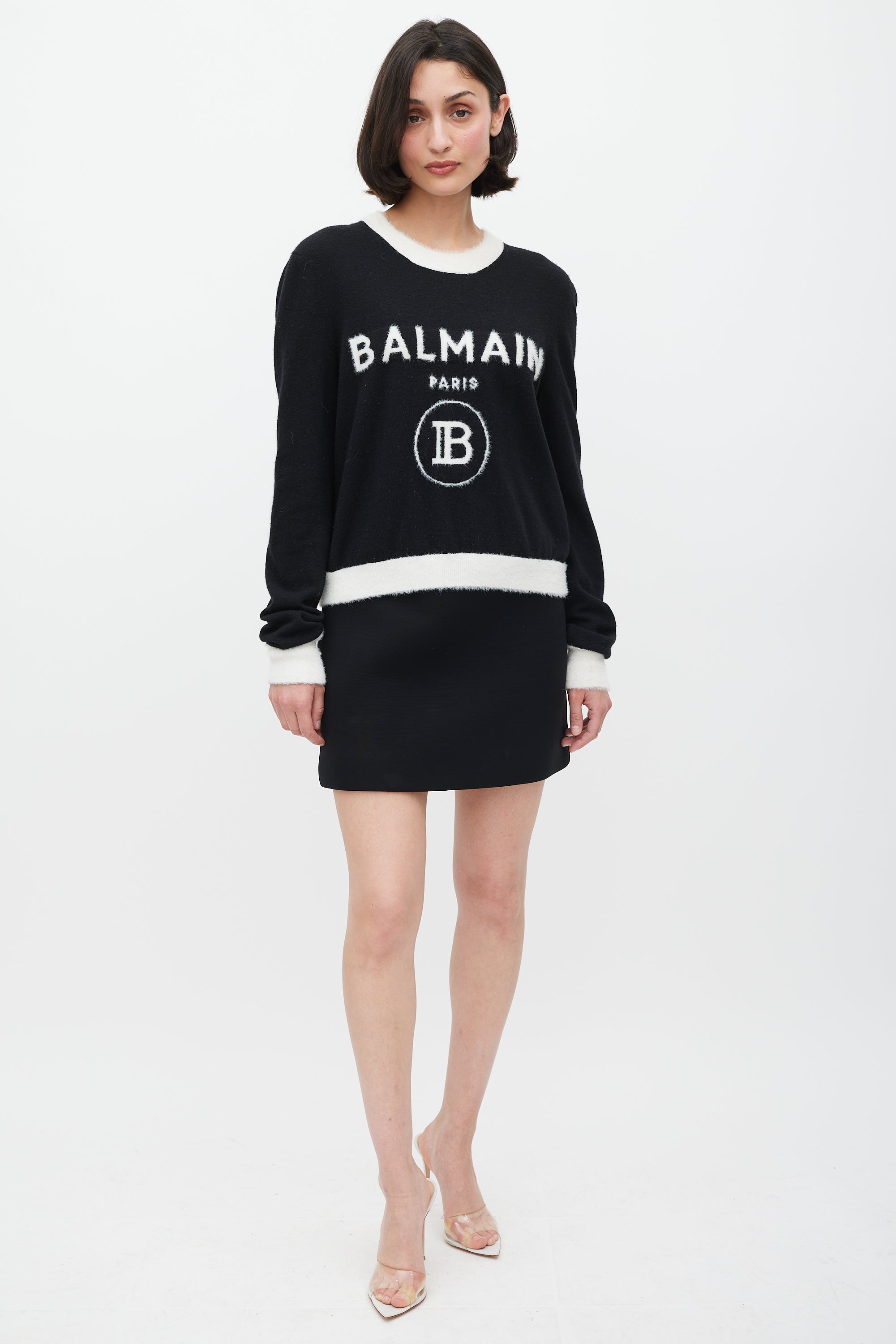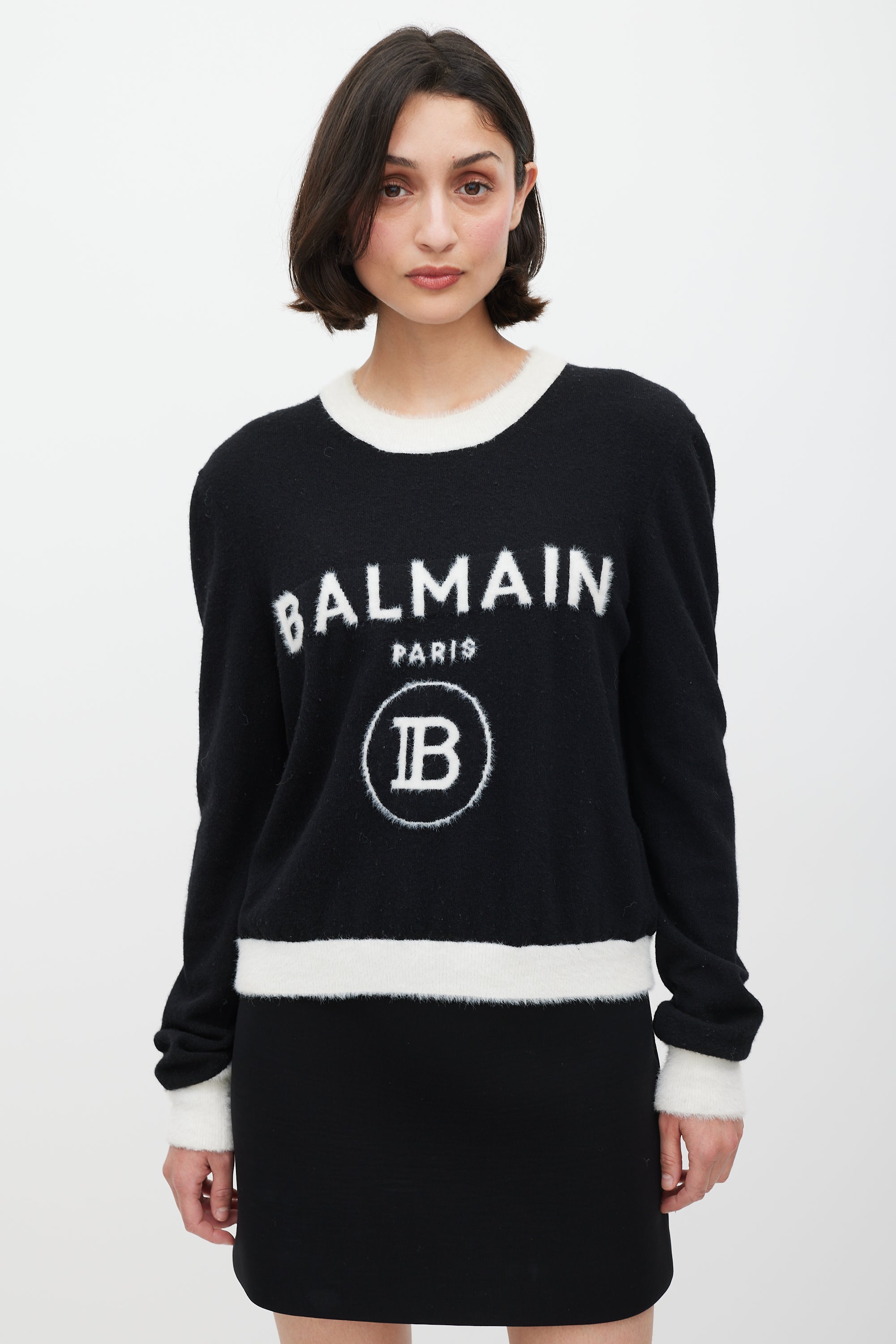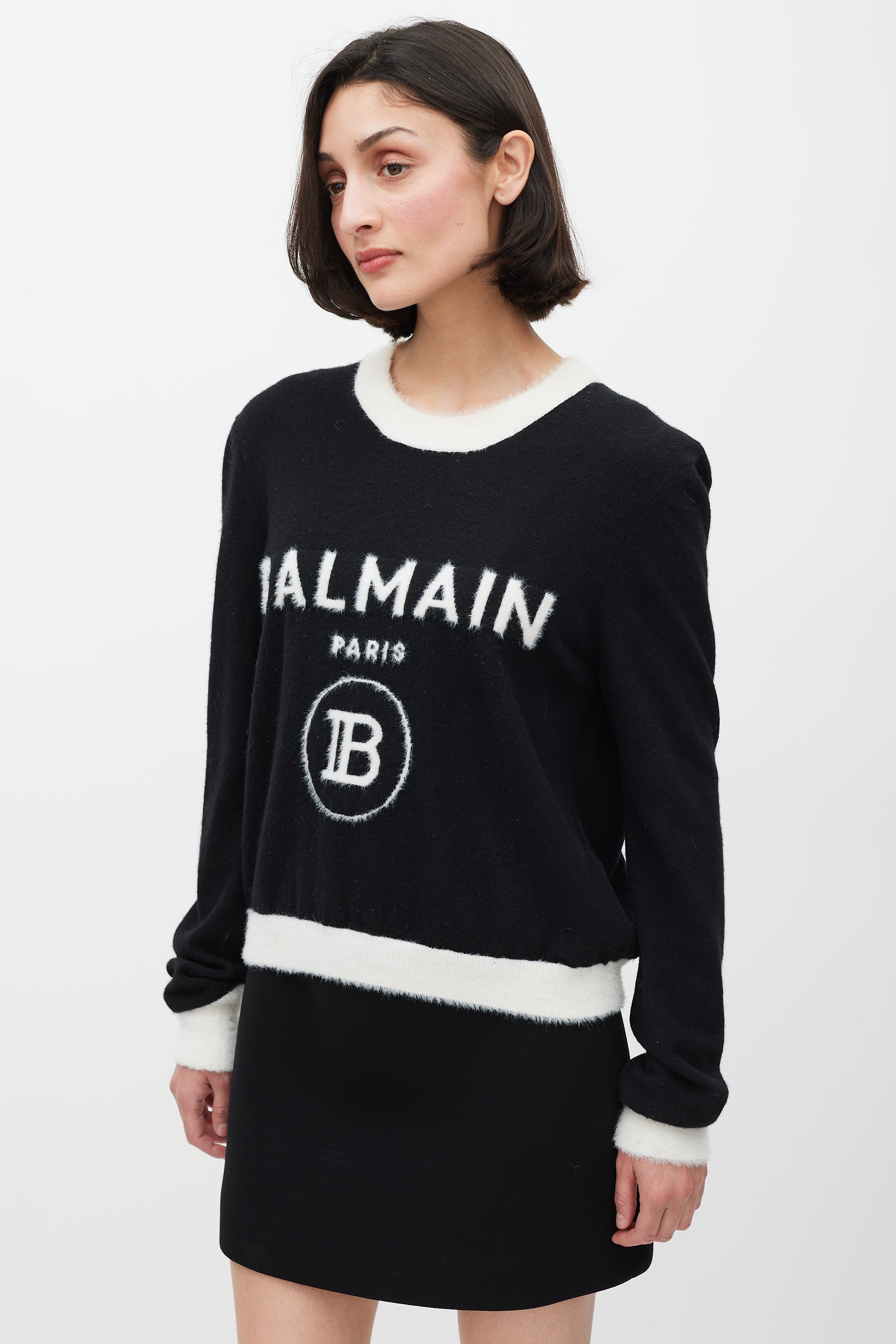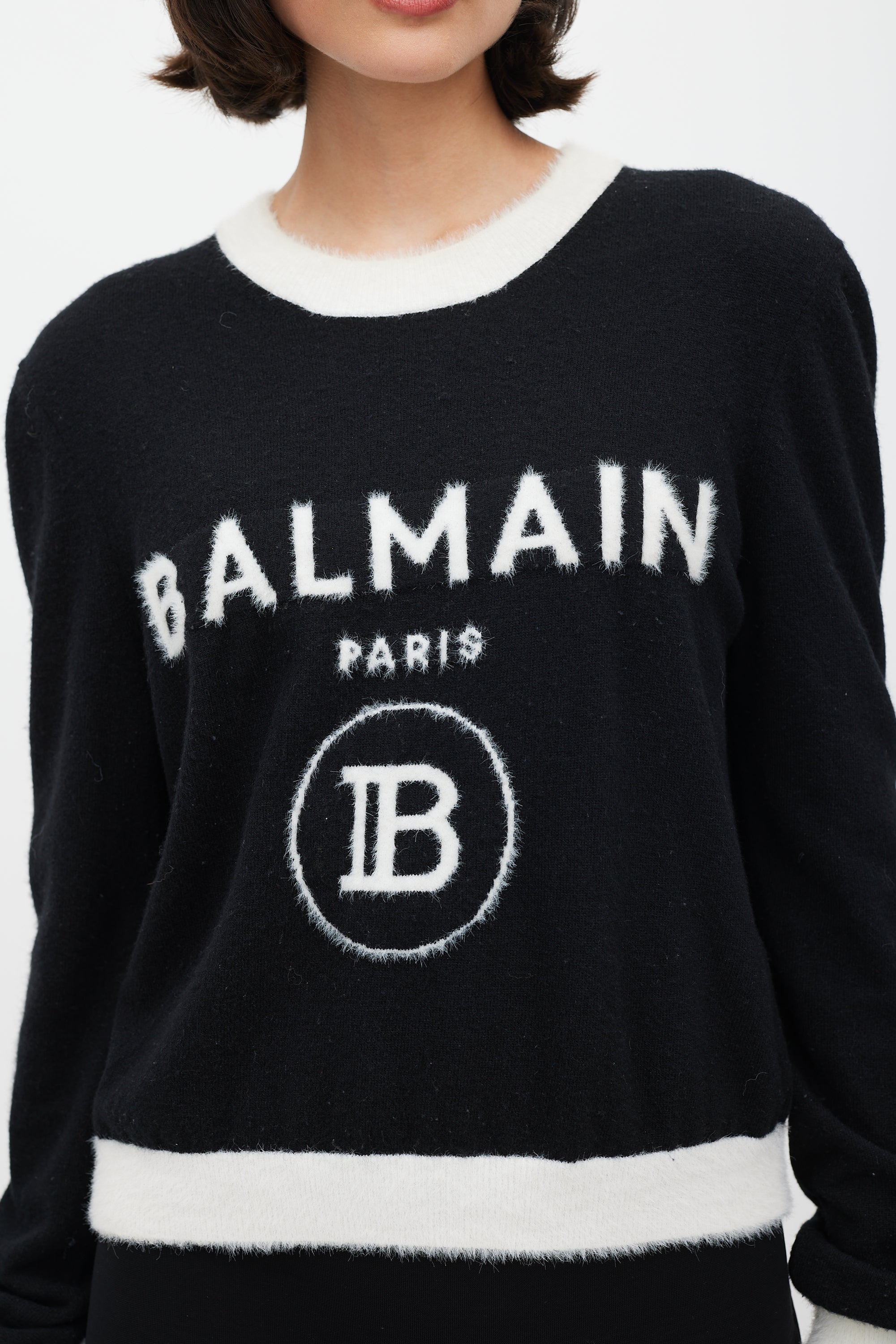 Pre-owned Balmain black wool knit sweater featuring a white woven logo at chest, round neckline, white trim throughout, long sleeves, and ribbed hem.