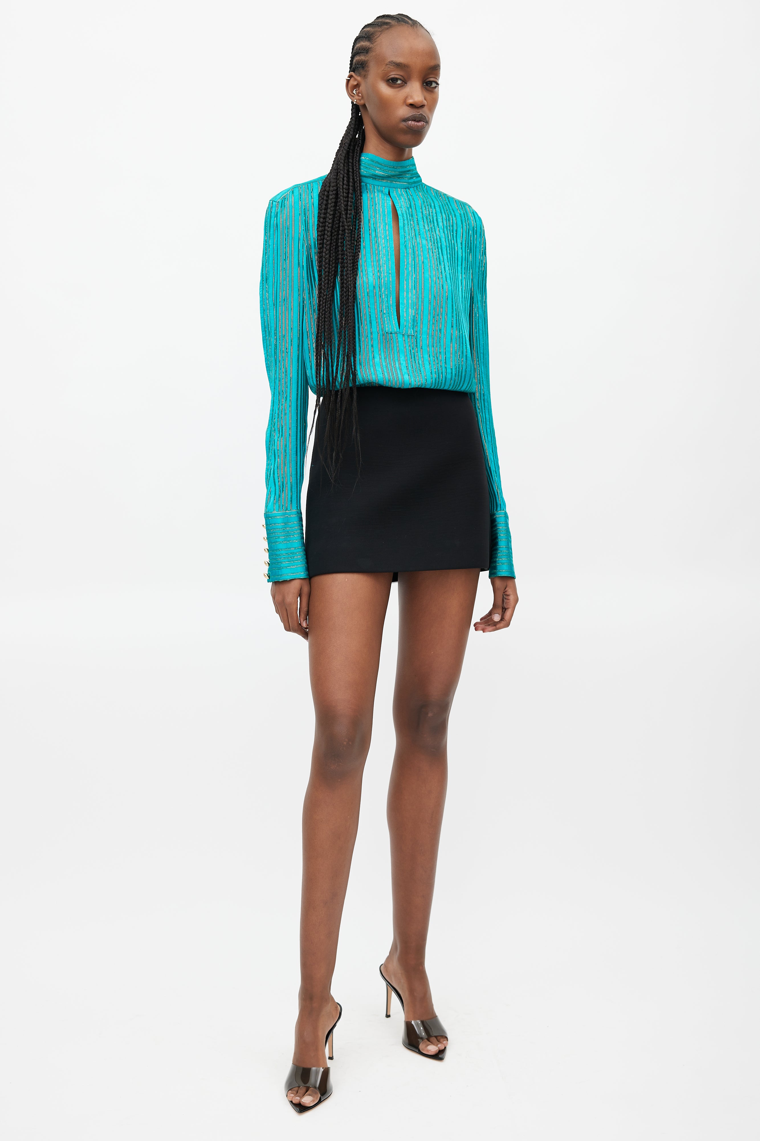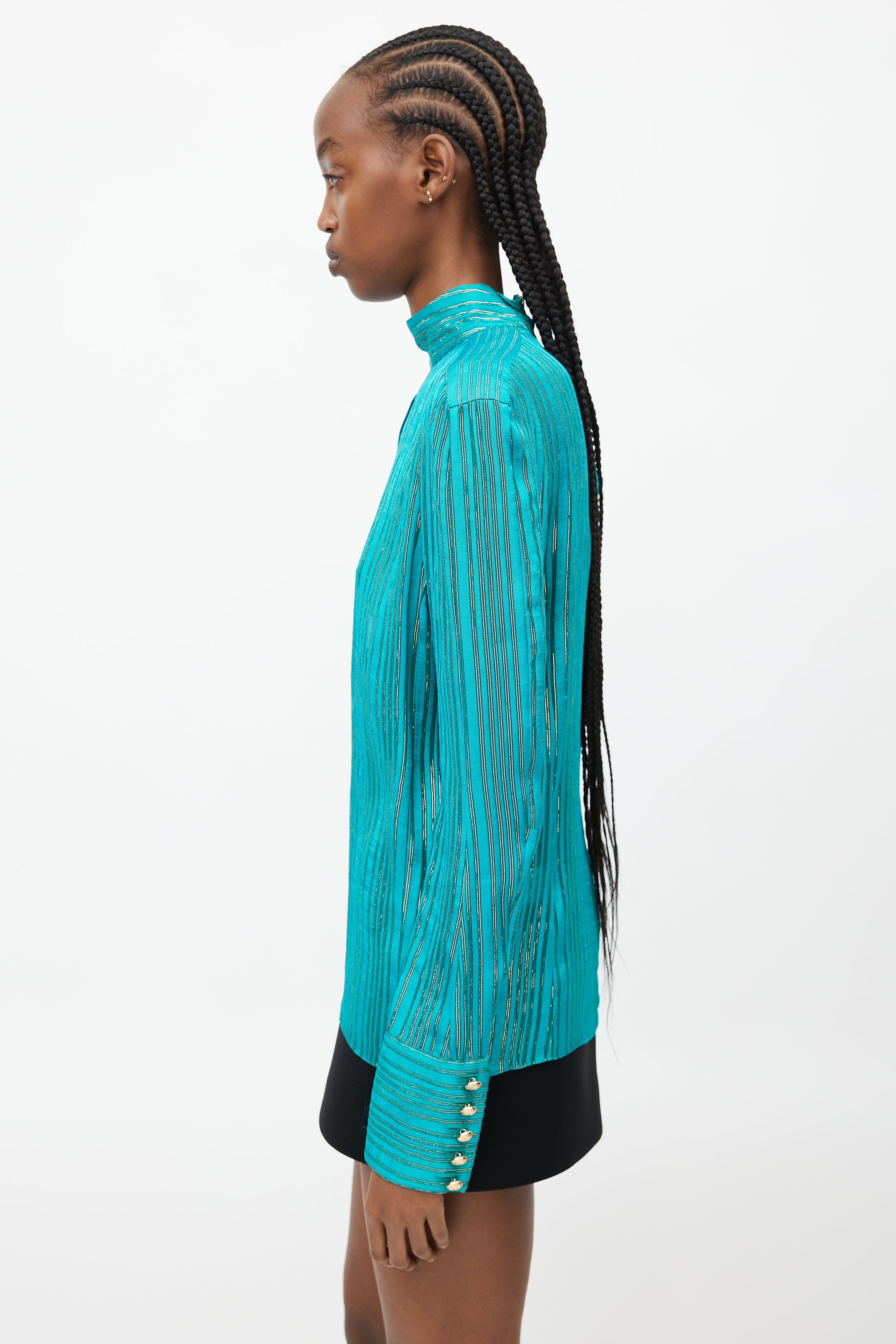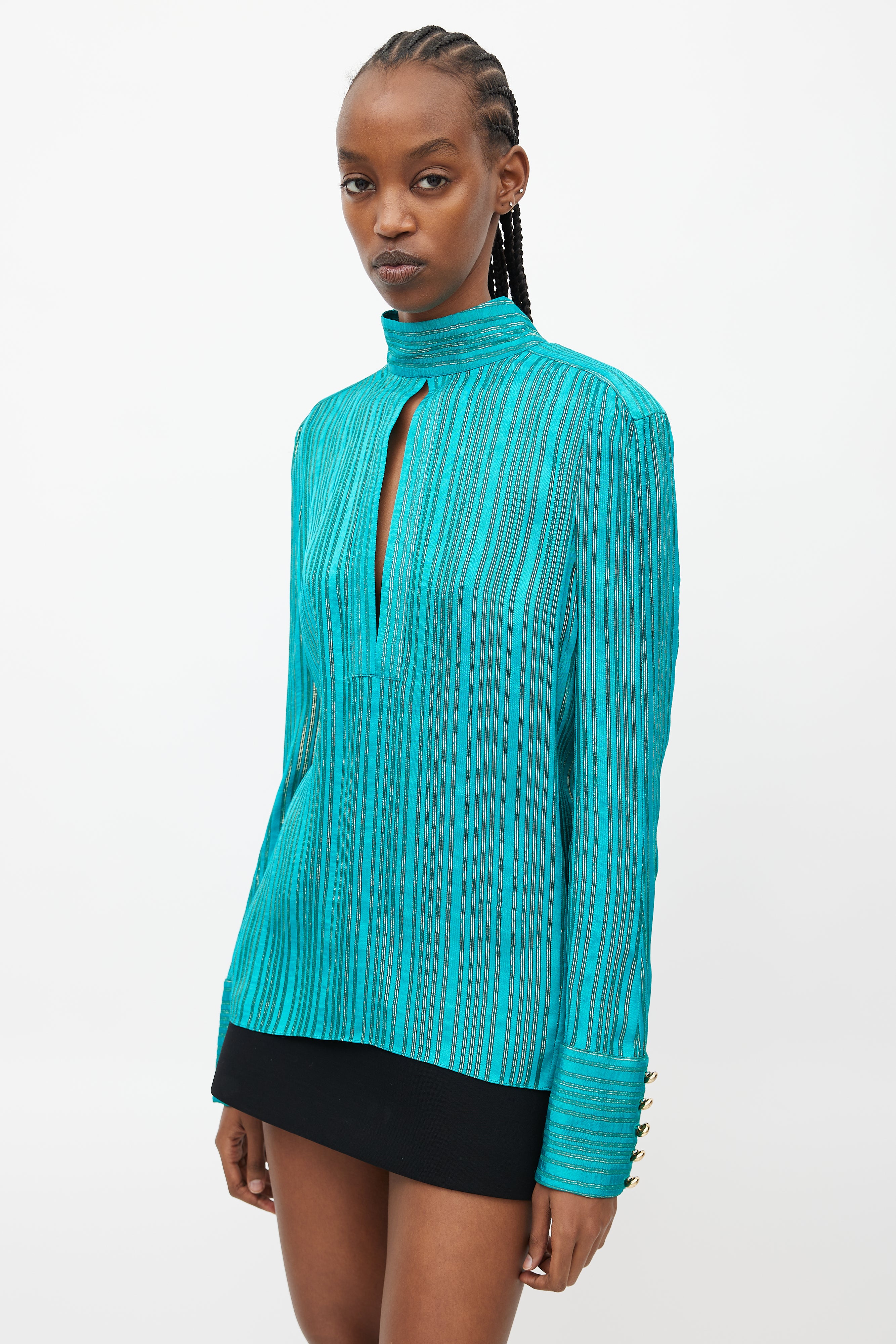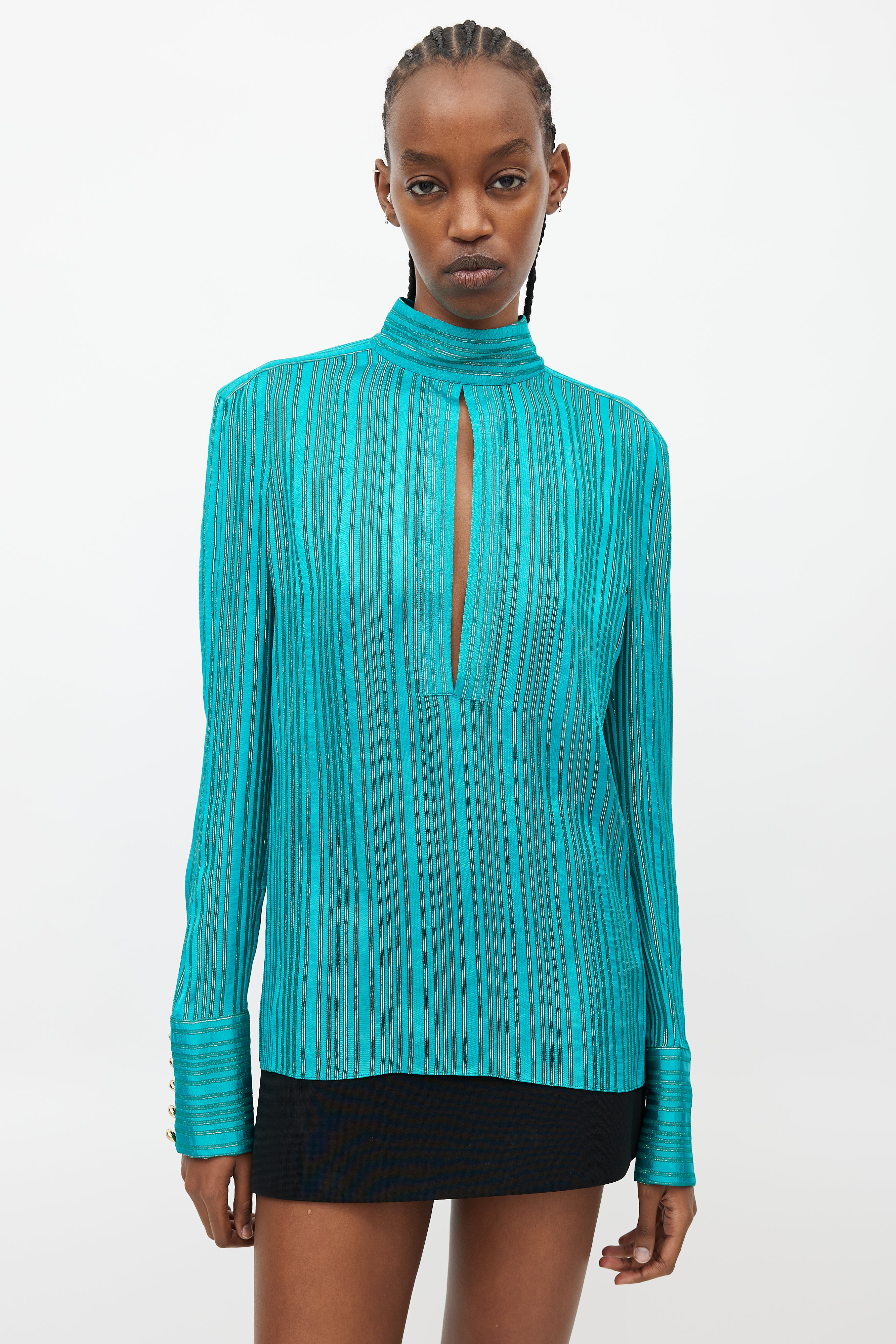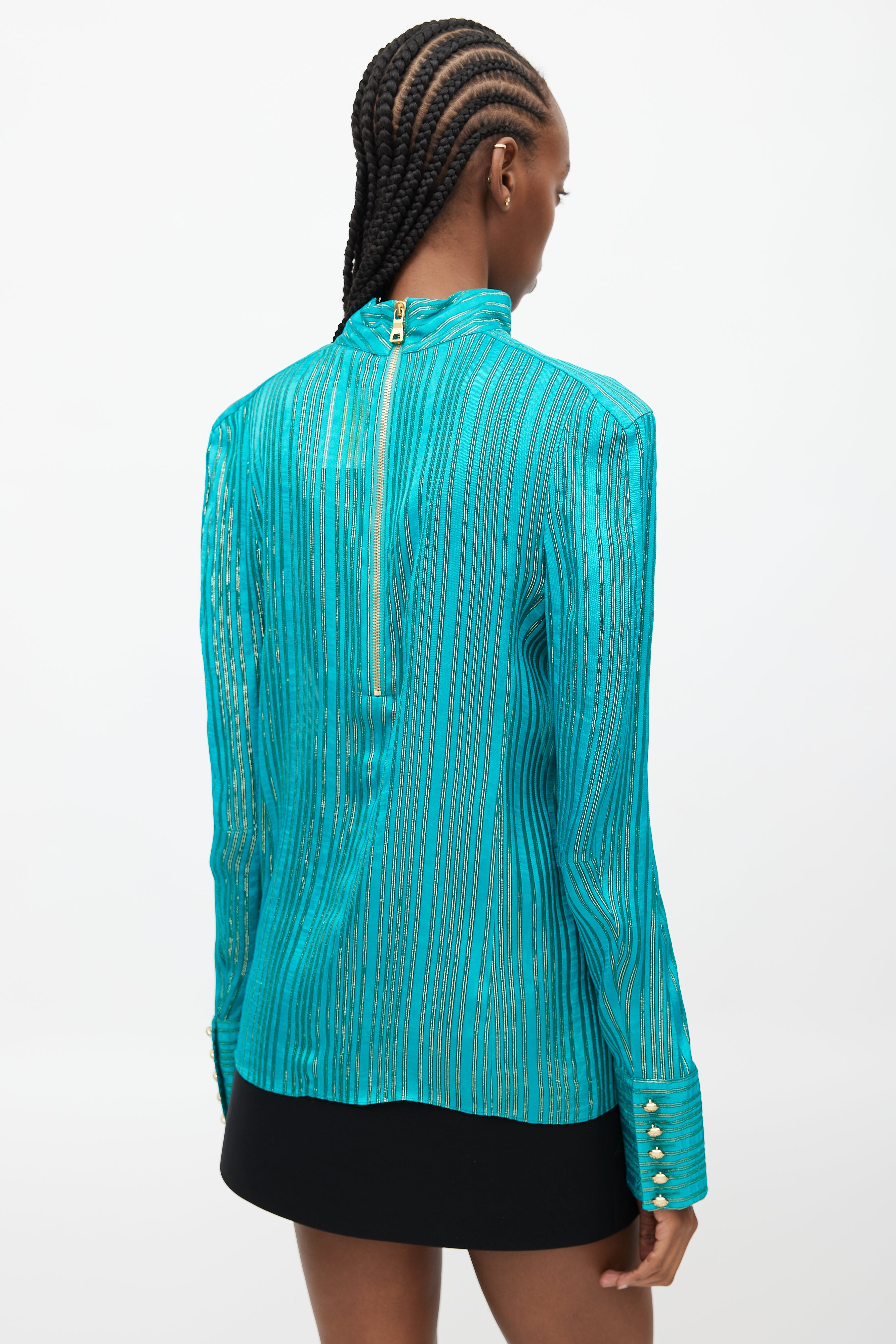 Pre-owned Balmain teal top featuring a mock neck collar, gold metallic striped pattern throughout, long sleeves with buttoned cuffs, cut out at front, and gold tone zip closure at back.