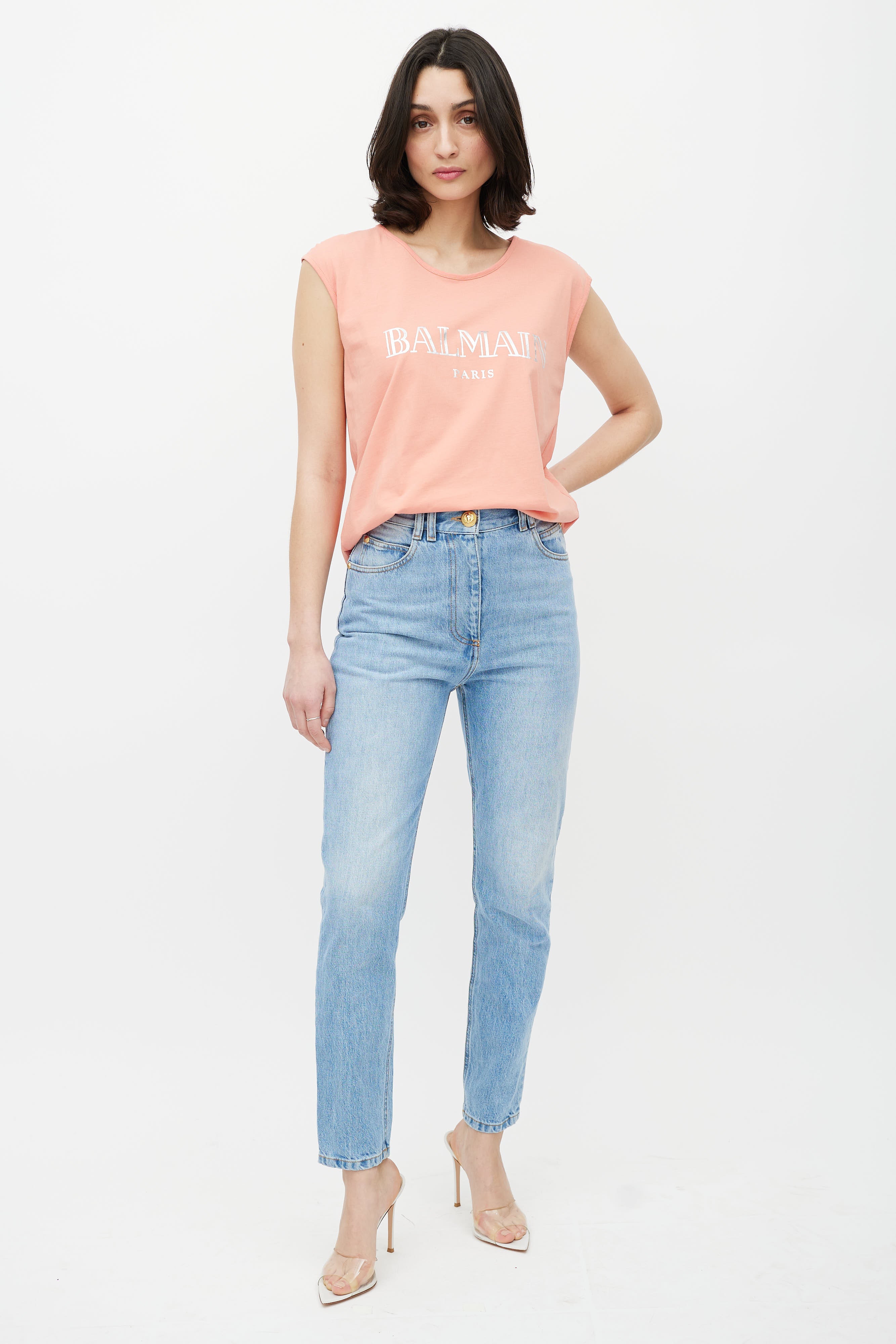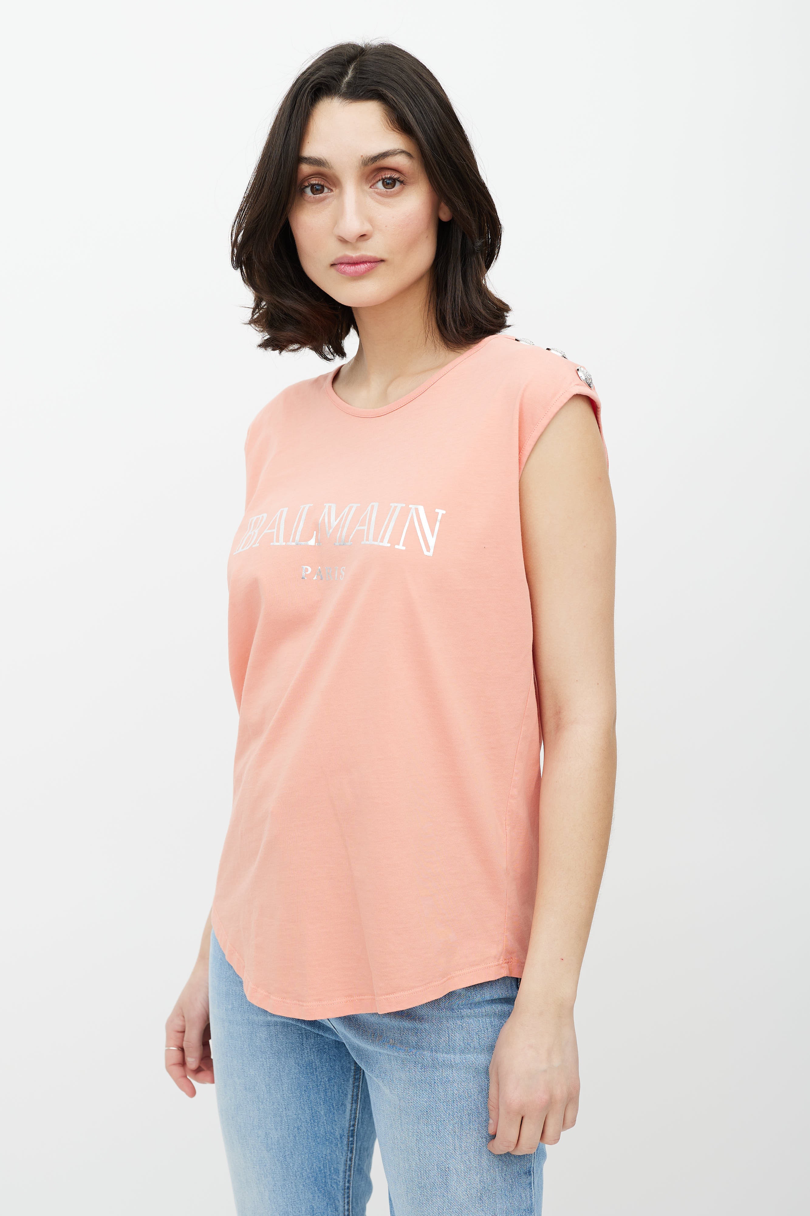 Pre-owned Balmain pink top featuring a silver logo print at chest, round neckline, sleeveless styling, and silver tone button detail at shoulder.