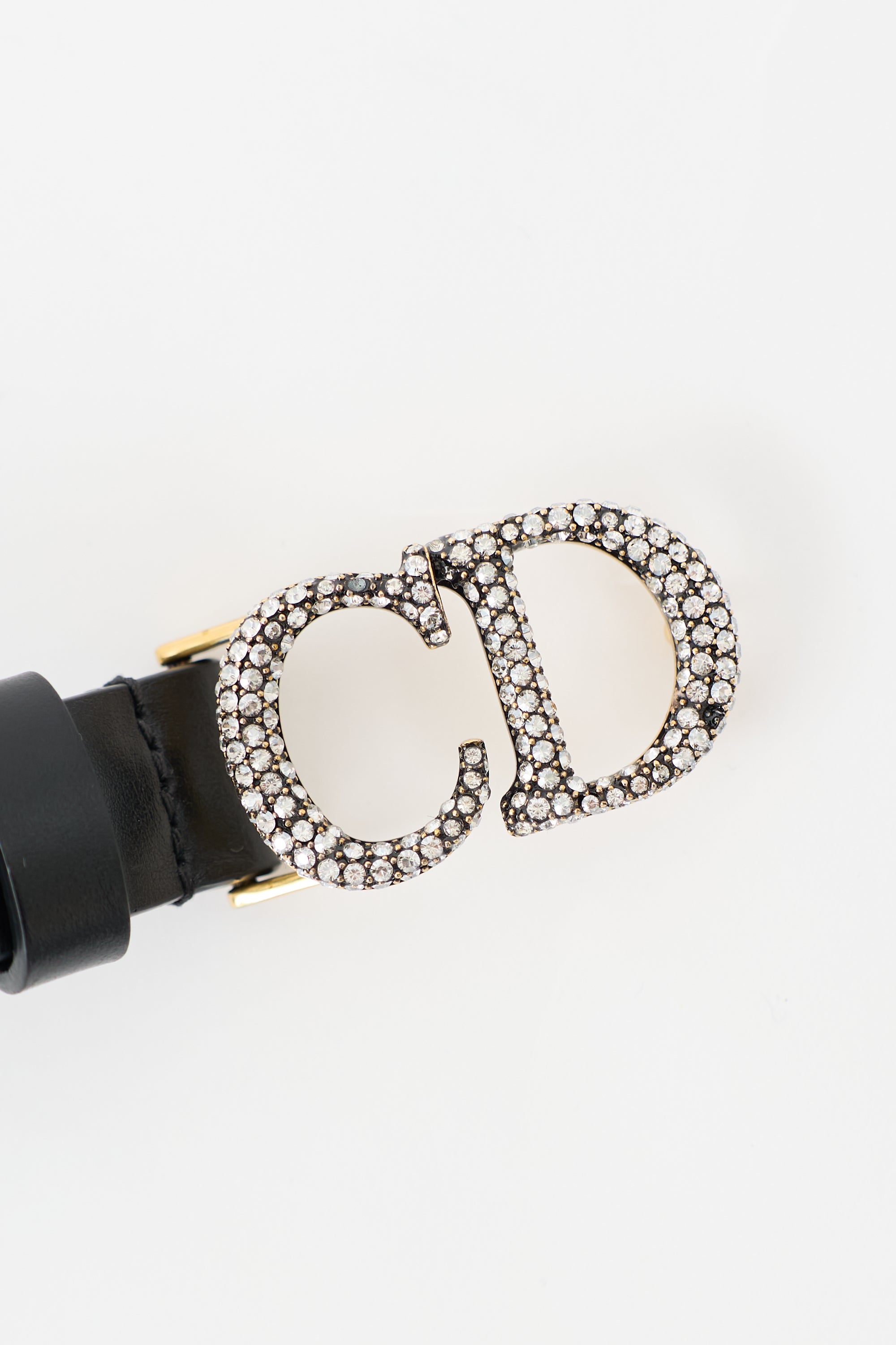 Pre-owned Dior black leather belt featuring crystal encrusted gold tone CD buckle, push pin closure, and stamped logo at reverse. Comes with original dust bag.