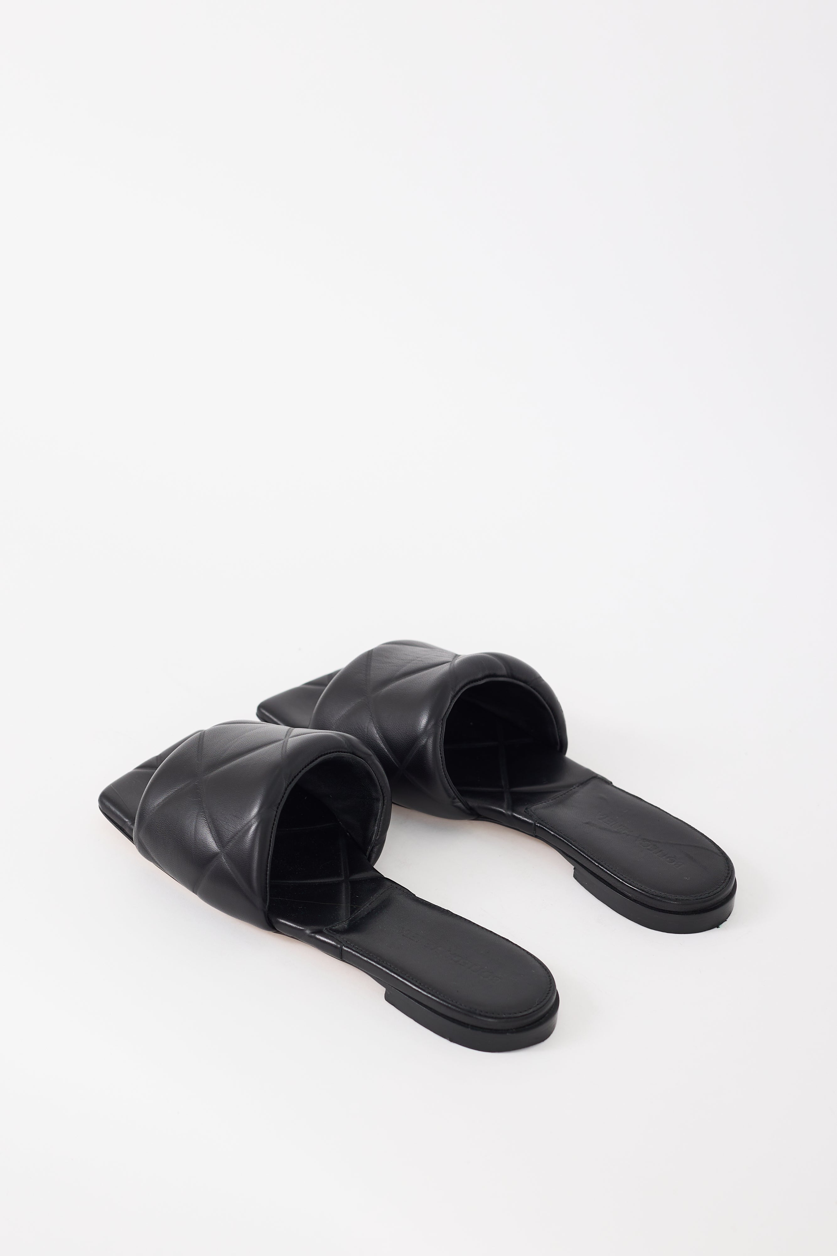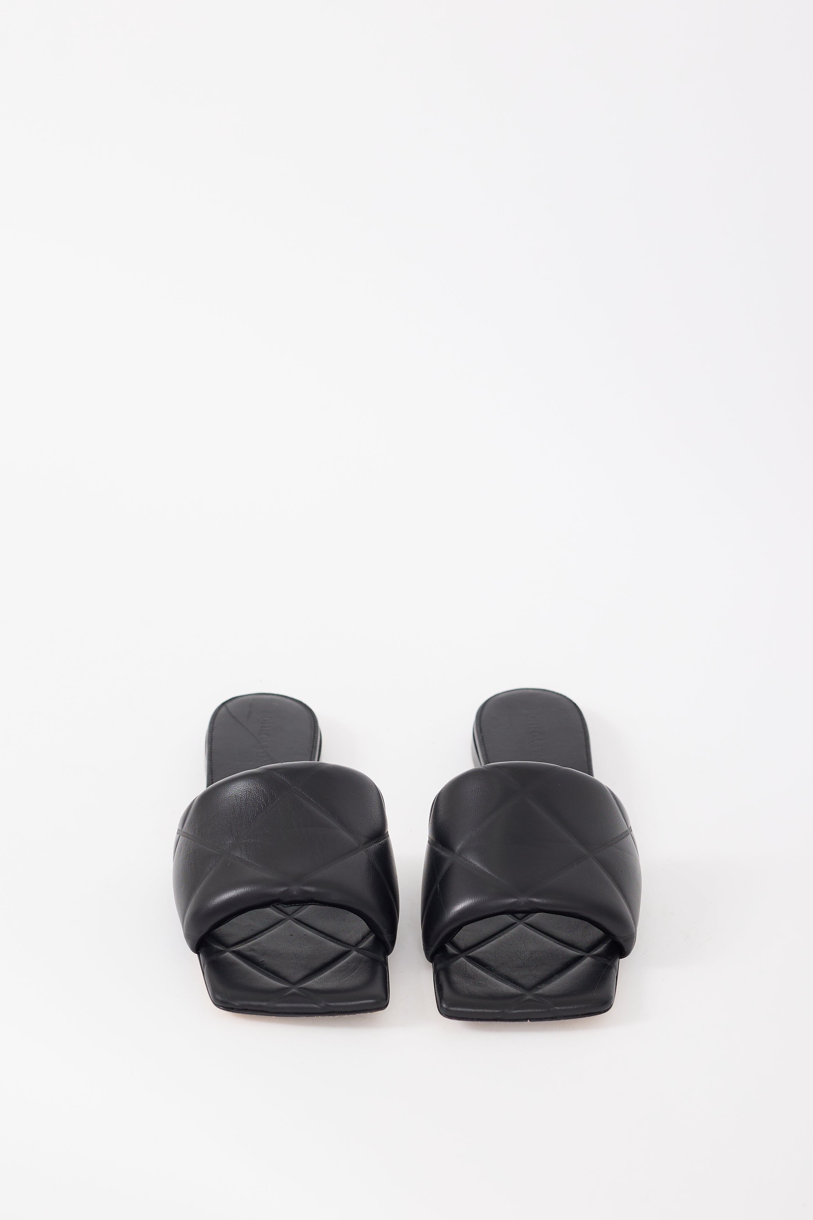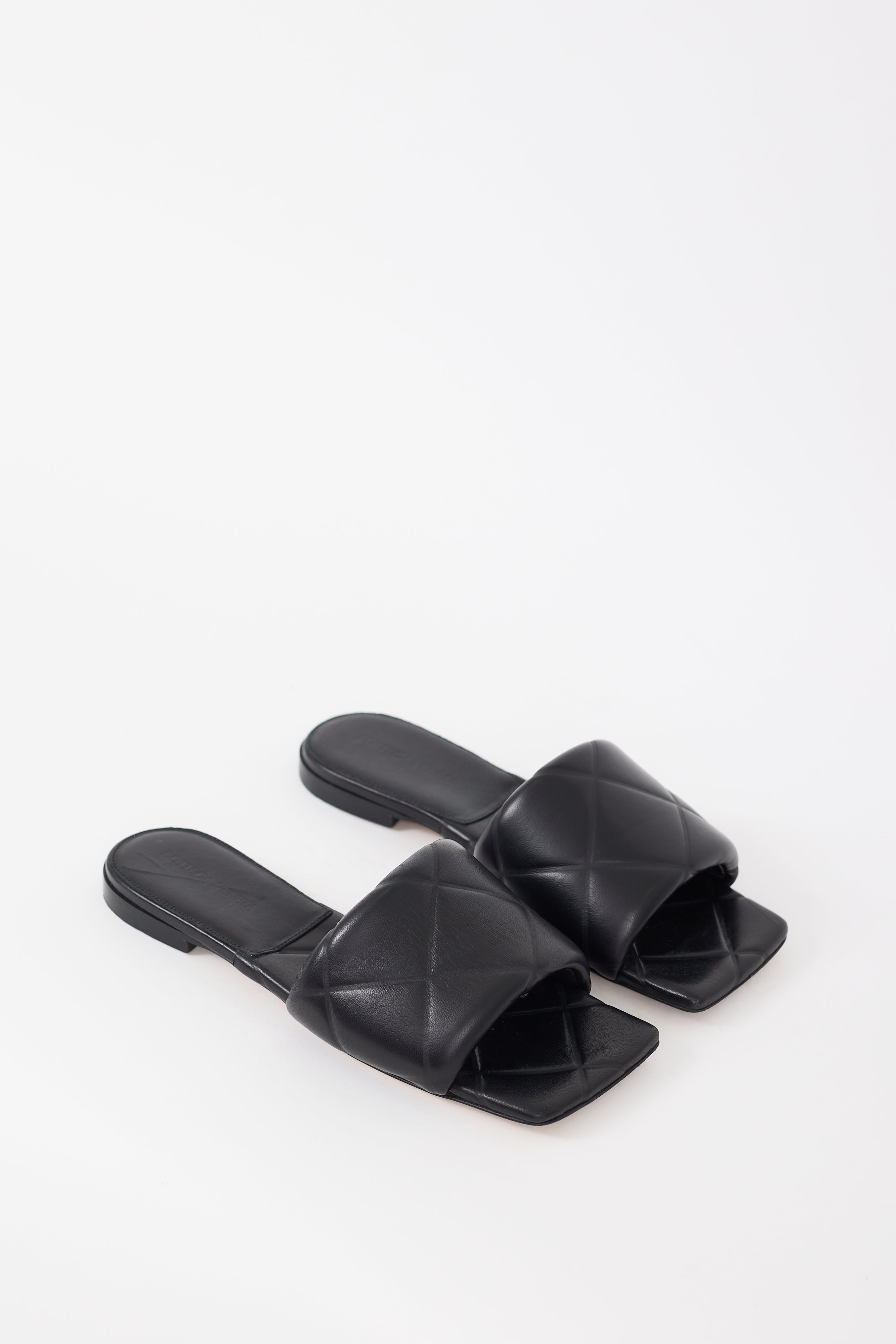 Pre-owned Bottega Veneta black leather Lido slides featuring open square toe, padded quilted leather vamp, slip on entry, and rubber ridged outsole. Comes with original dust bag.