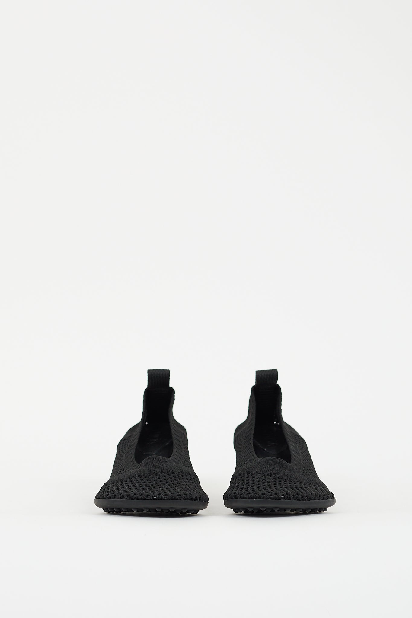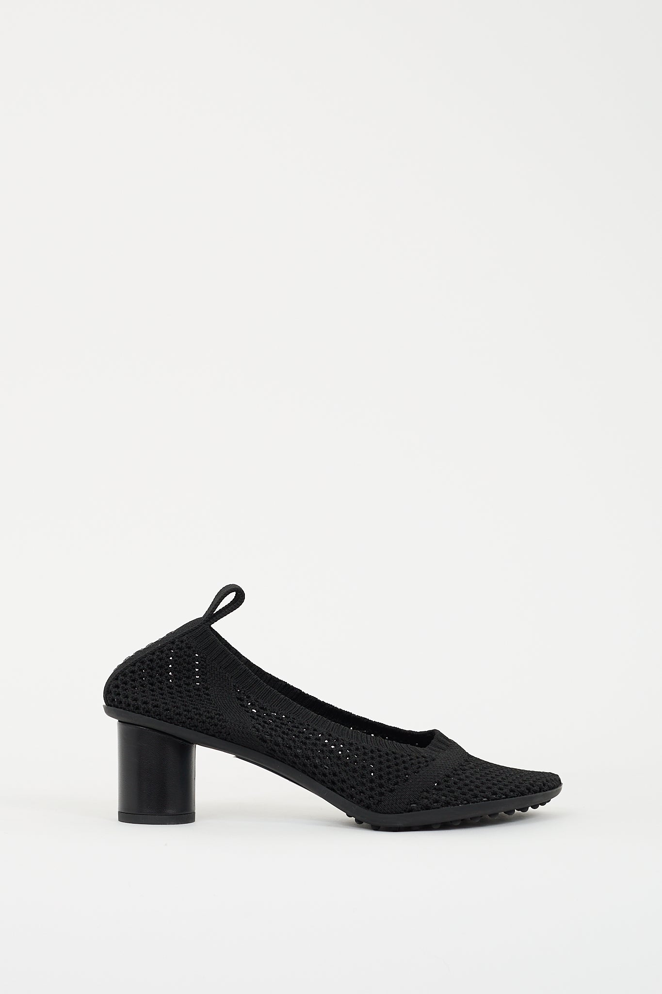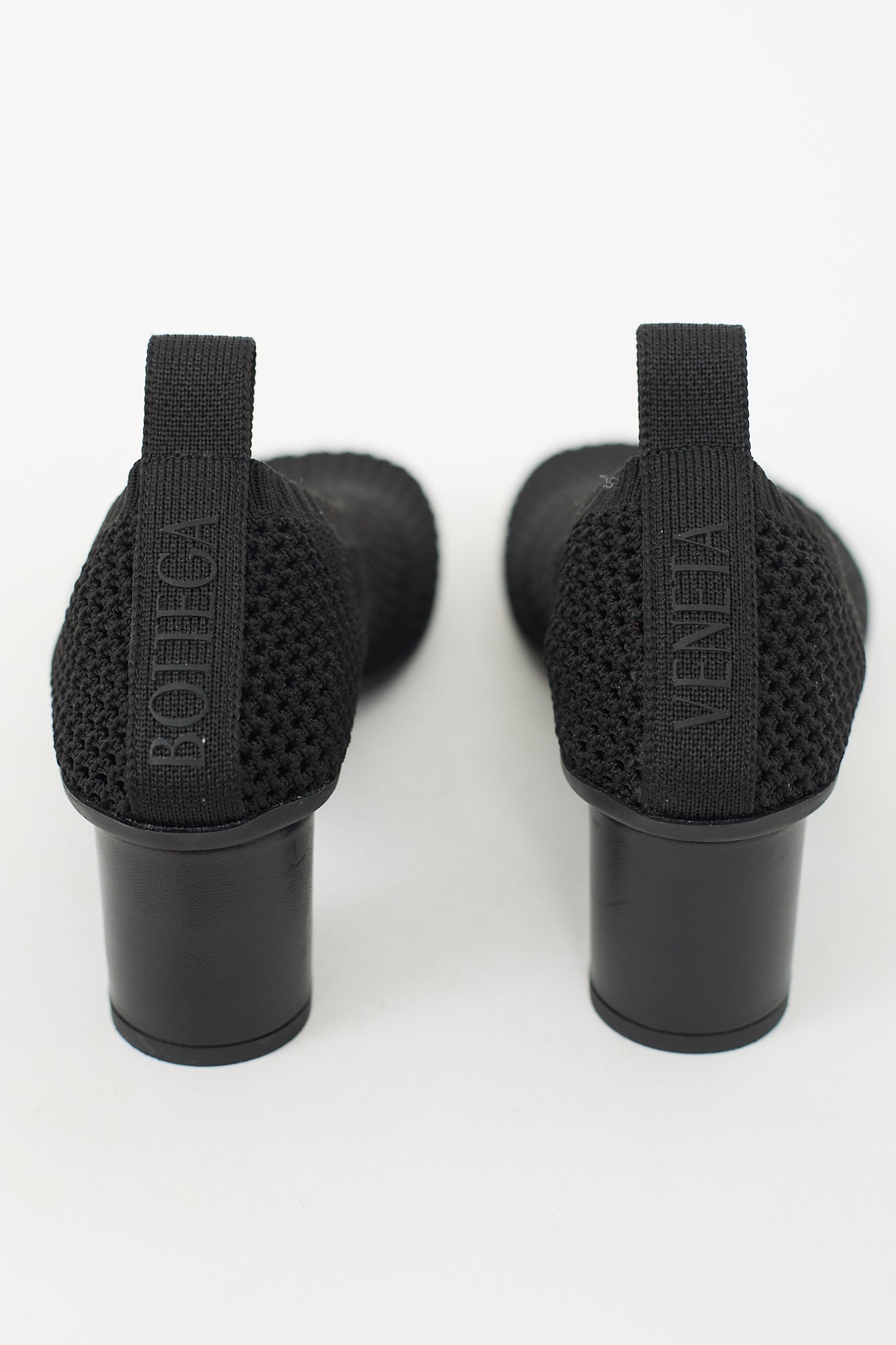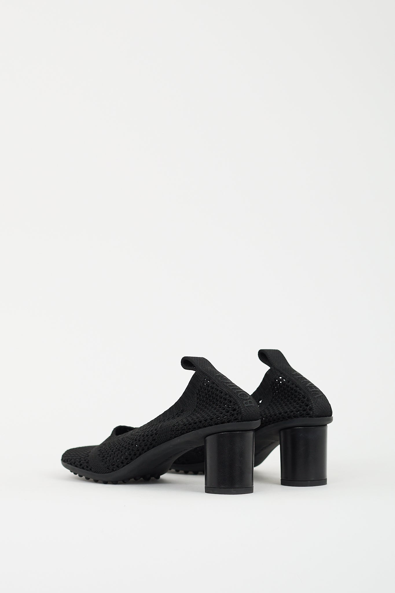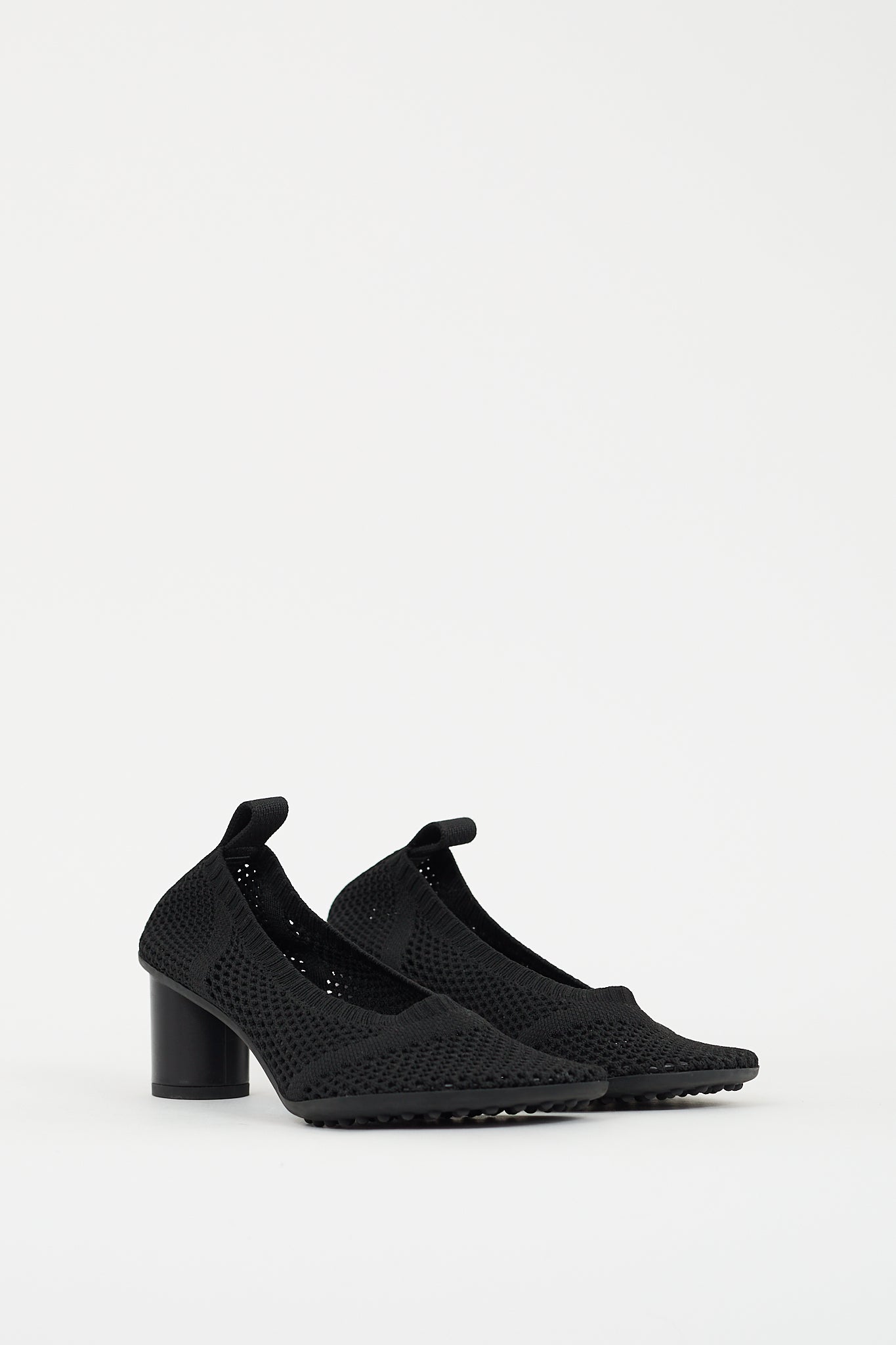 Pre-owned Bottega Veneta black mesh Atomic pumps featuring mesh upper, anatomical toe, slip on entry, pull tab at back with rubberized logo, rounded block heel, and lug rubber outsole.