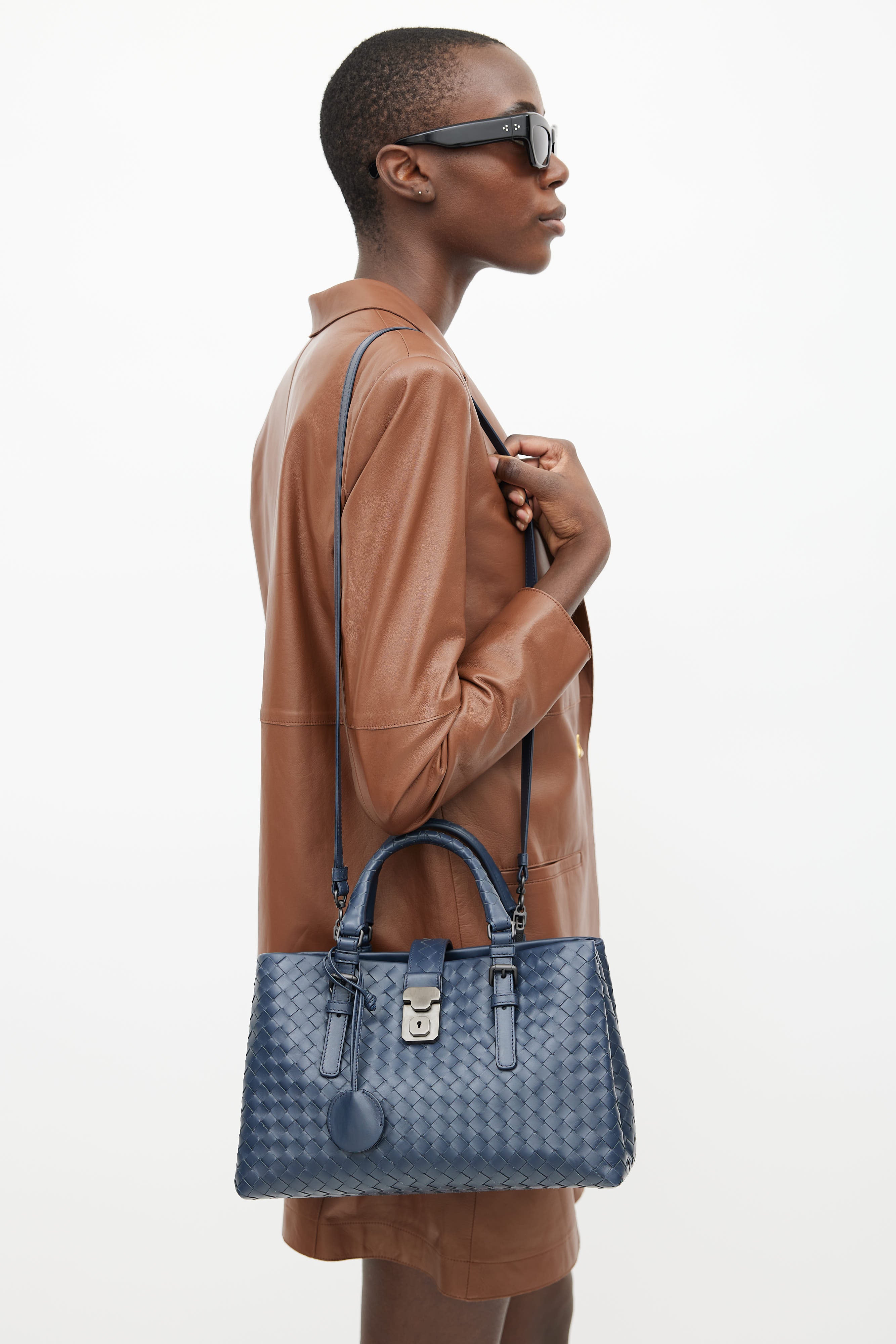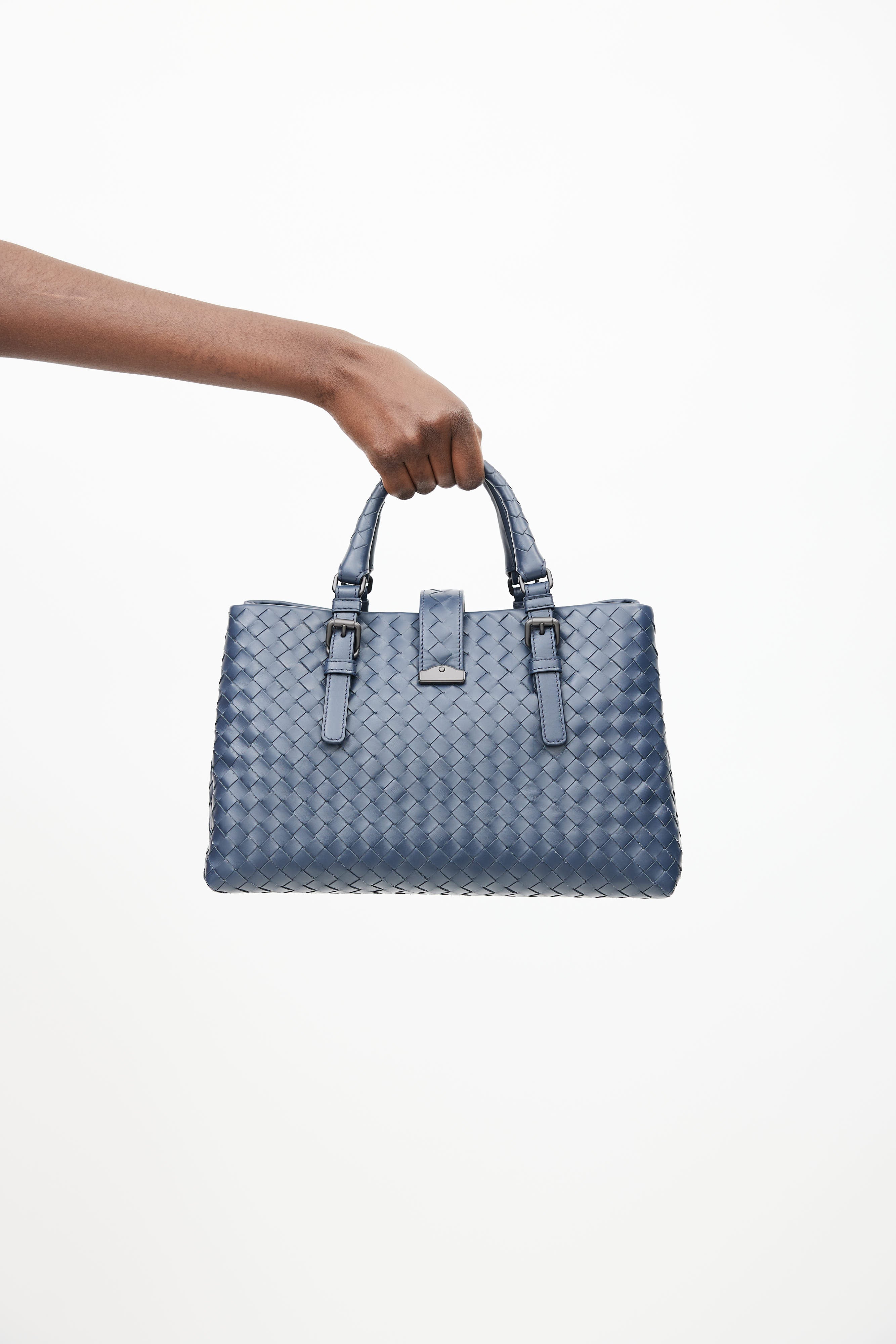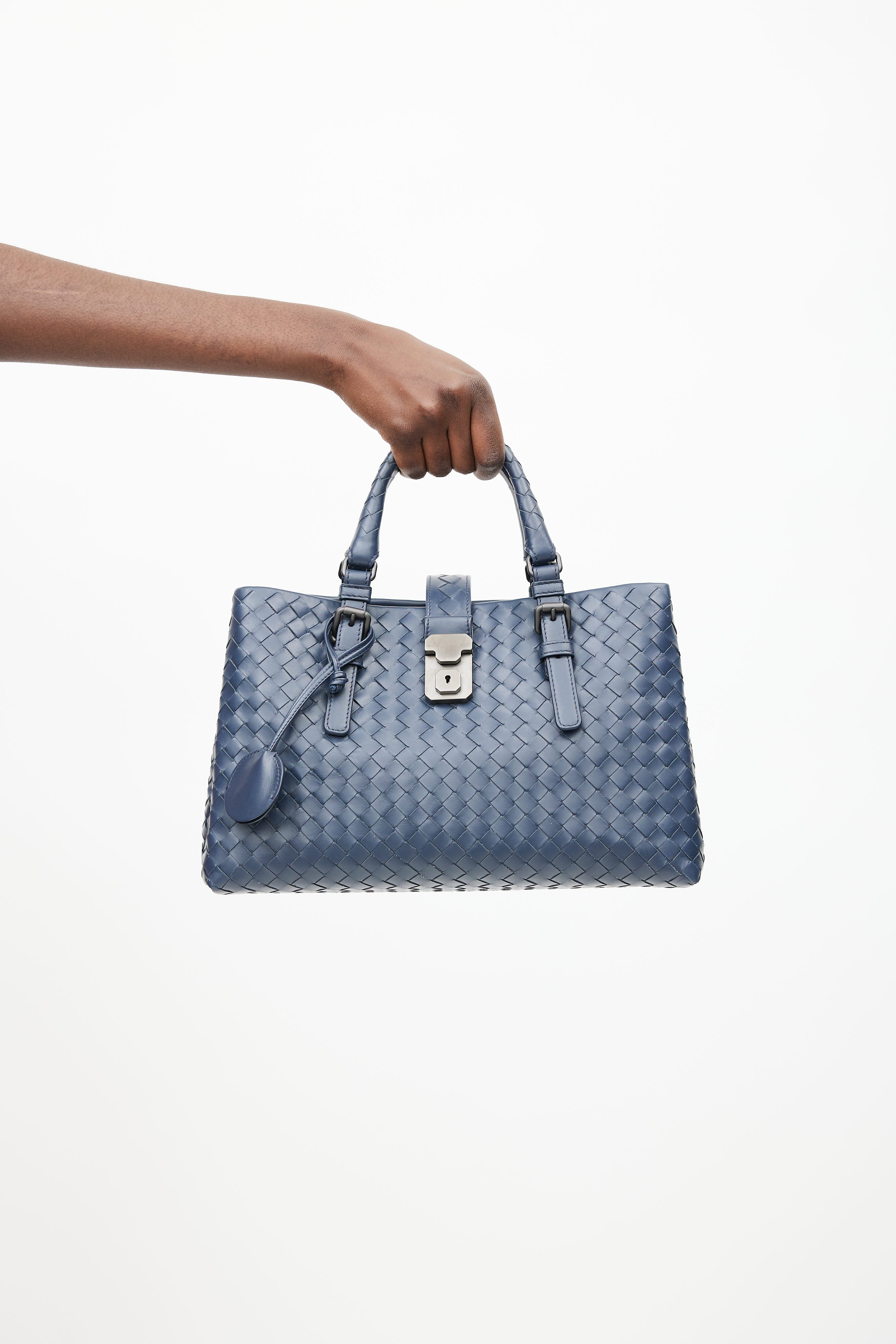 Pre-owned Bottega Veneta blue Roma bag featuring Intrecciato leather body, gunmetal hardware, dual rolled top handles, detachable shoulder strap, padlock closure with key clochette, three lined main compartments, snap button closure at middle compartment, and interior zip pocket. Comes with original dust bag.