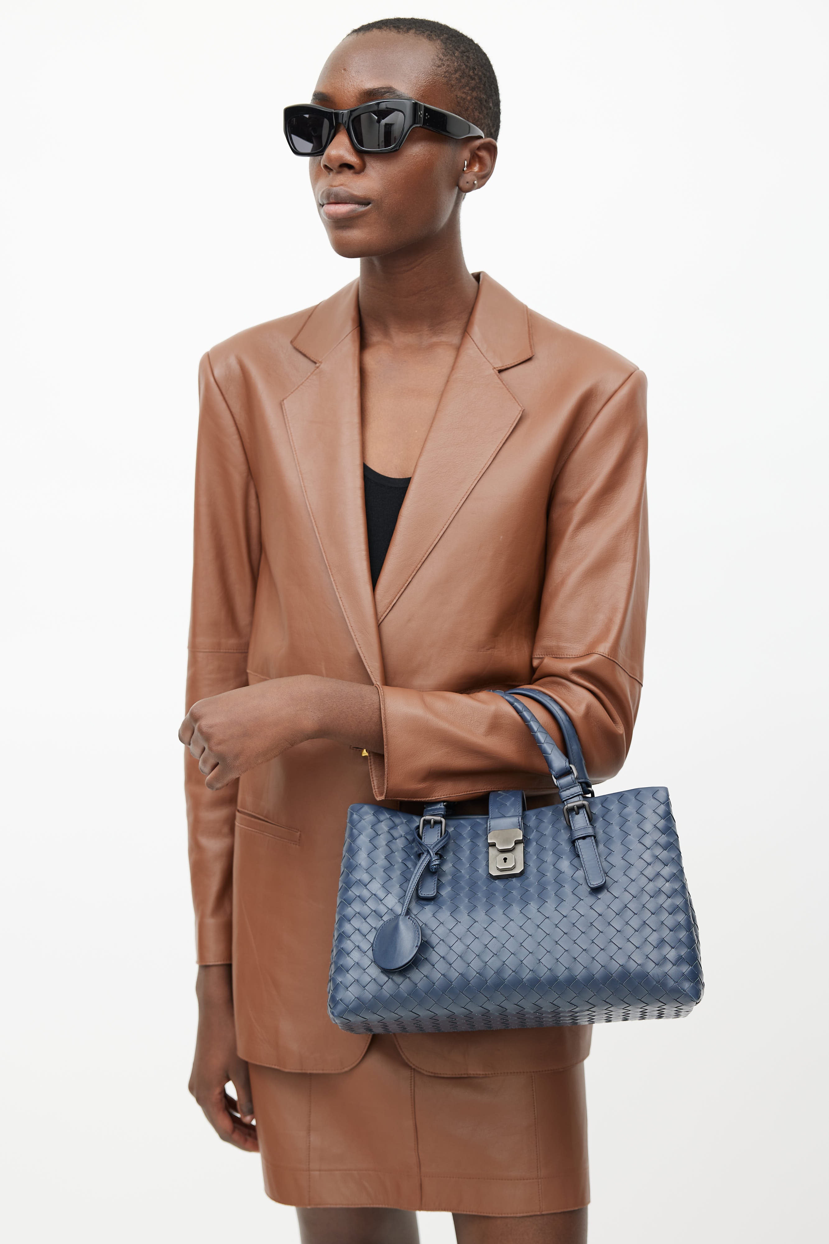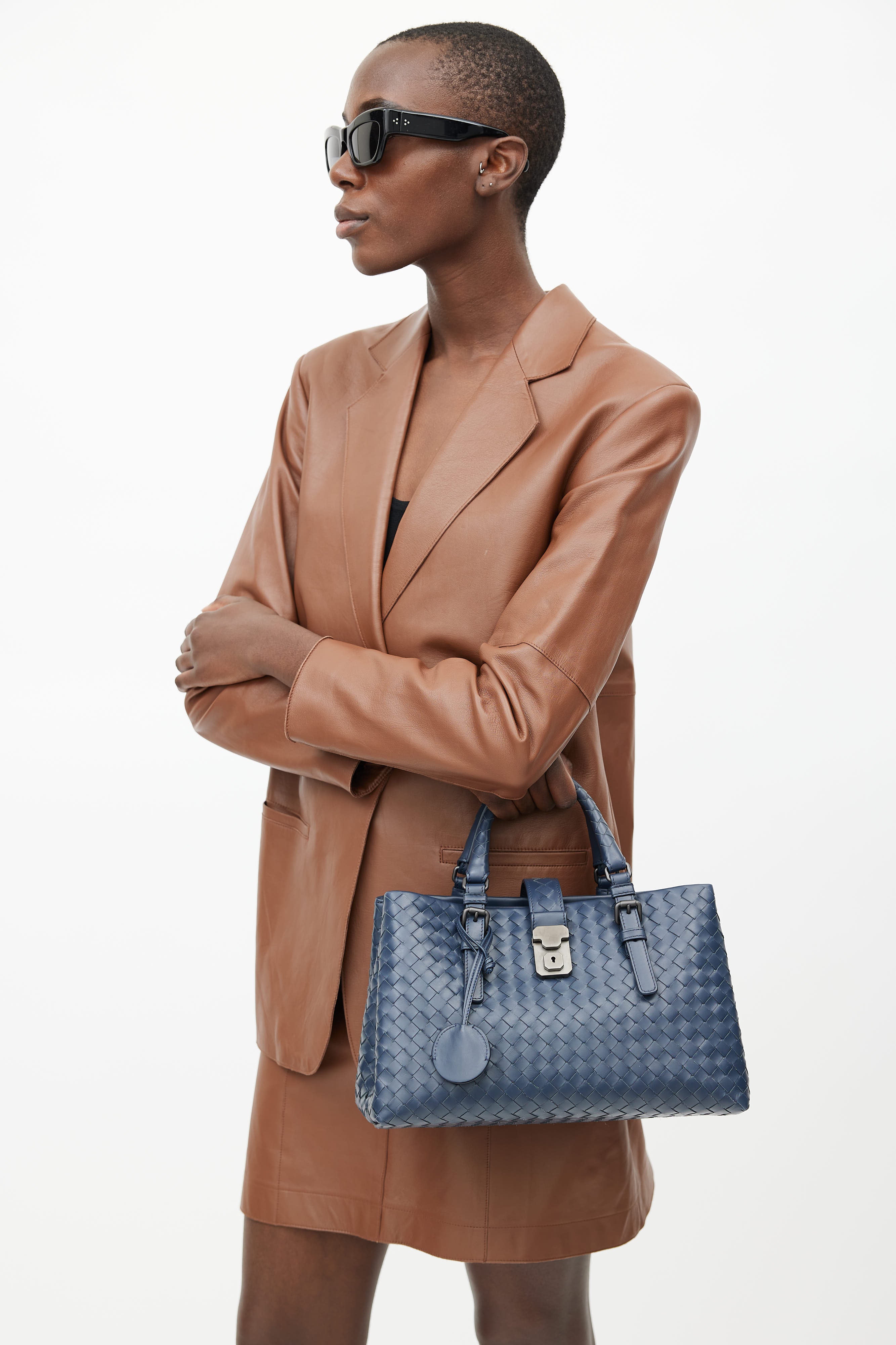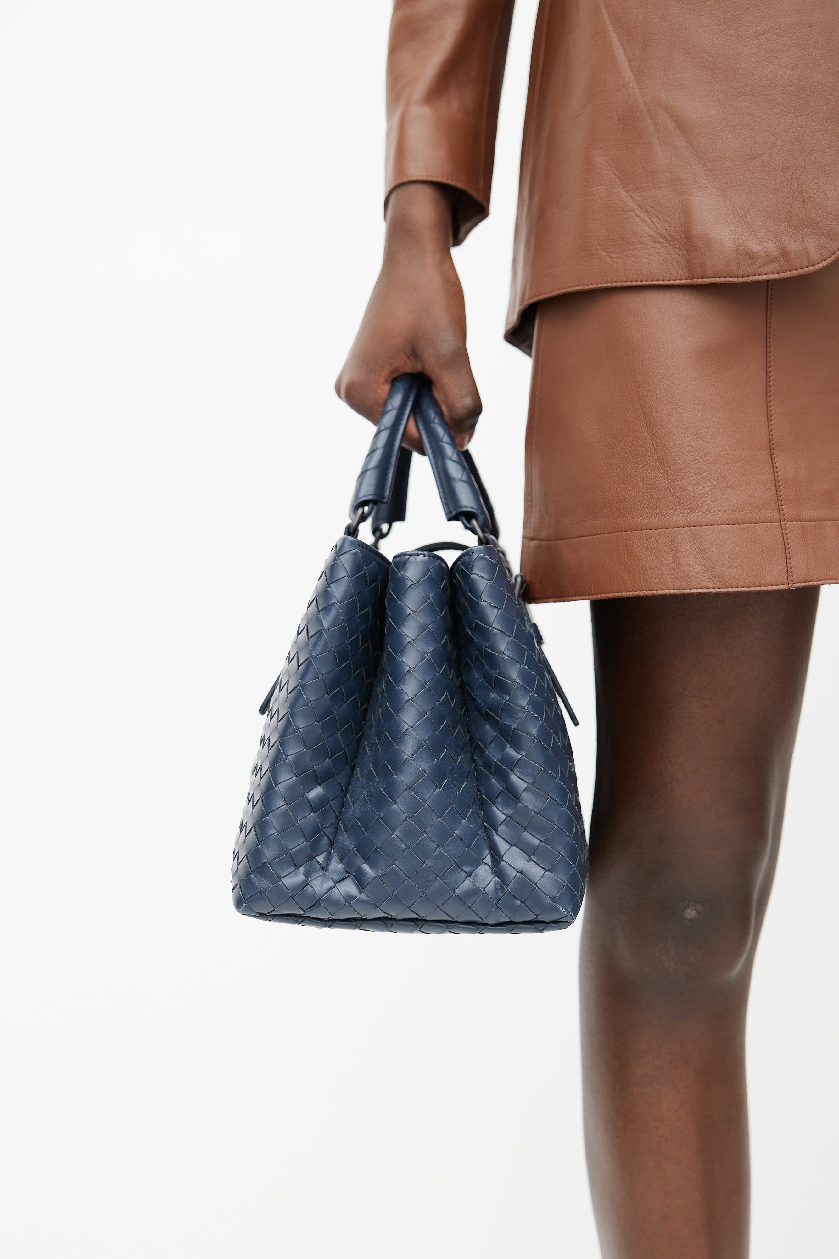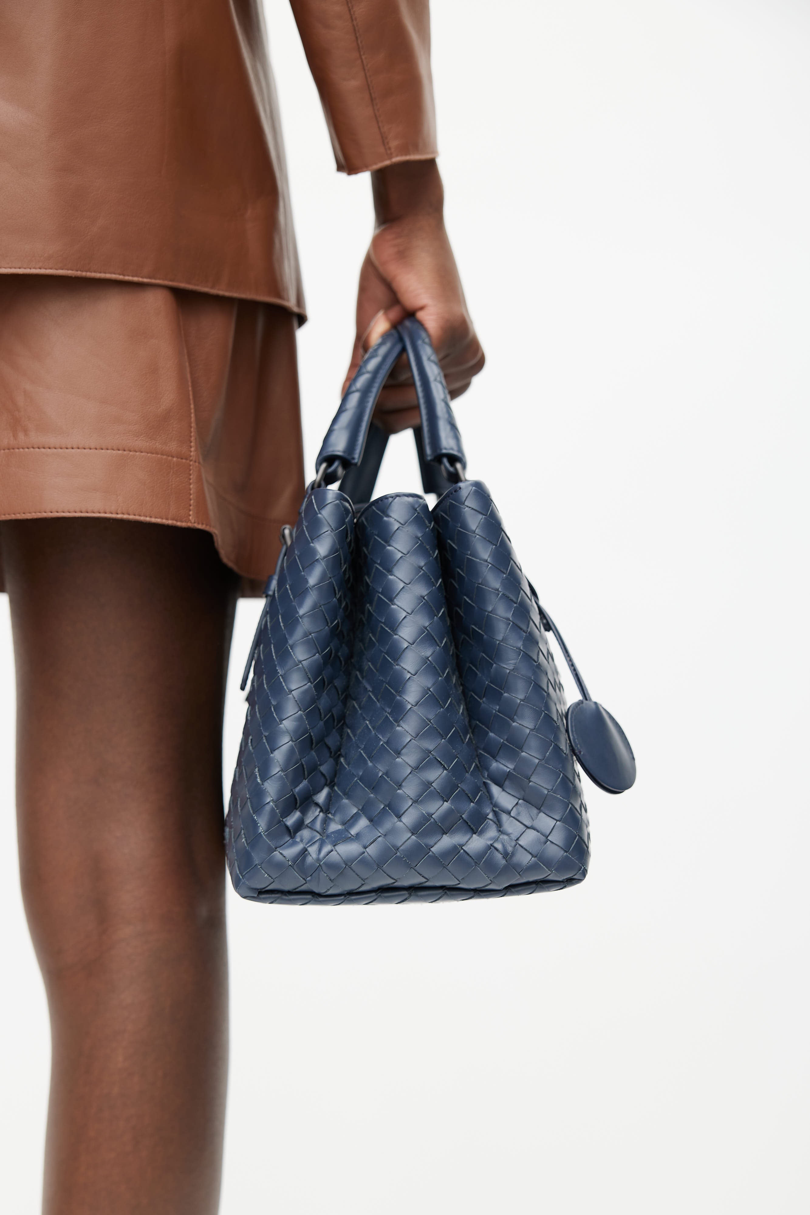 Pre-owned Bottega Veneta blue Roma bag featuring Intrecciato leather body, gunmetal hardware, dual rolled top handles, detachable shoulder strap, padlock closure with key clochette, three lined main compartments, snap button closure at middle compartment, and interior zip pocket. Comes with original dust bag.