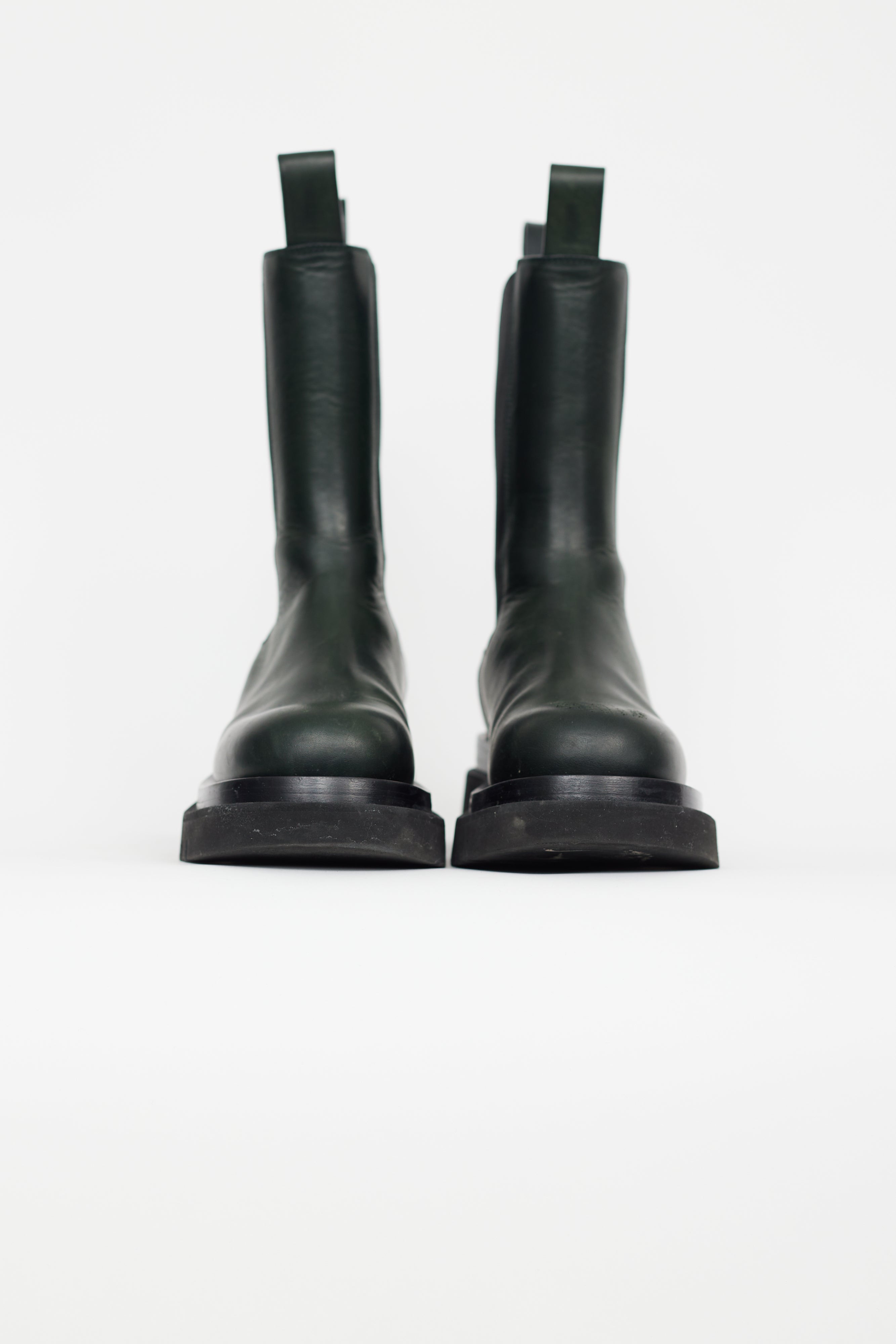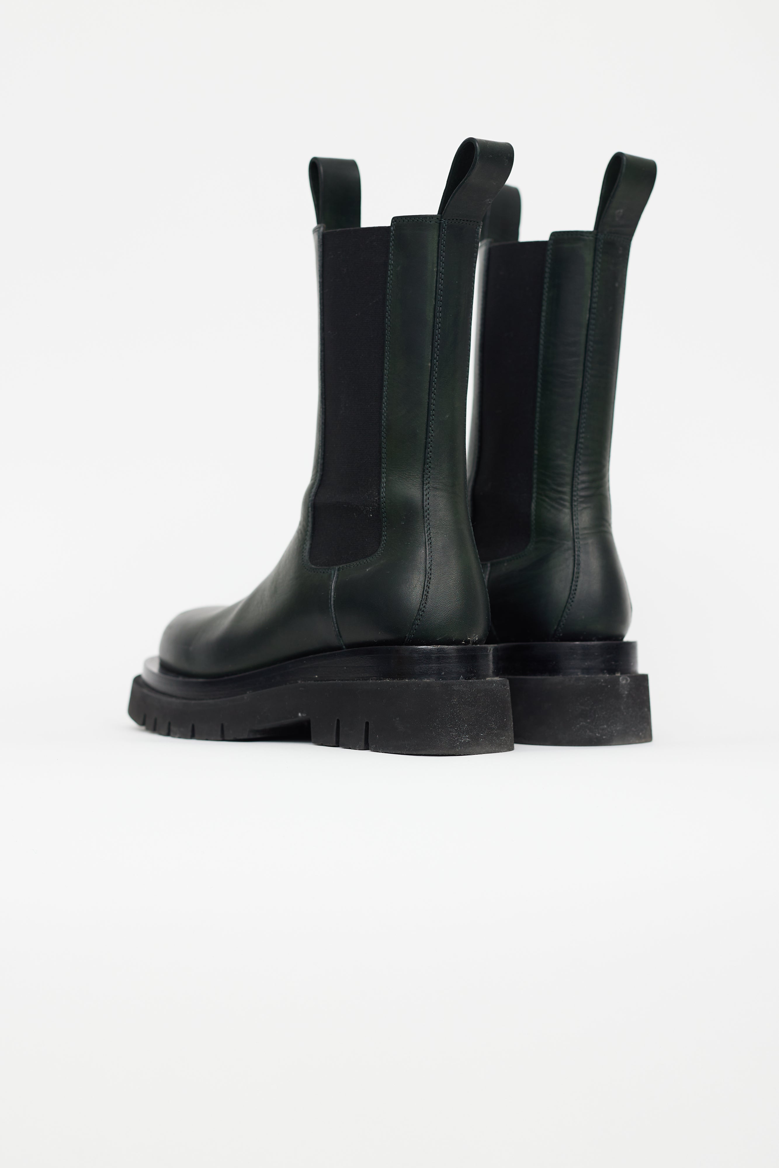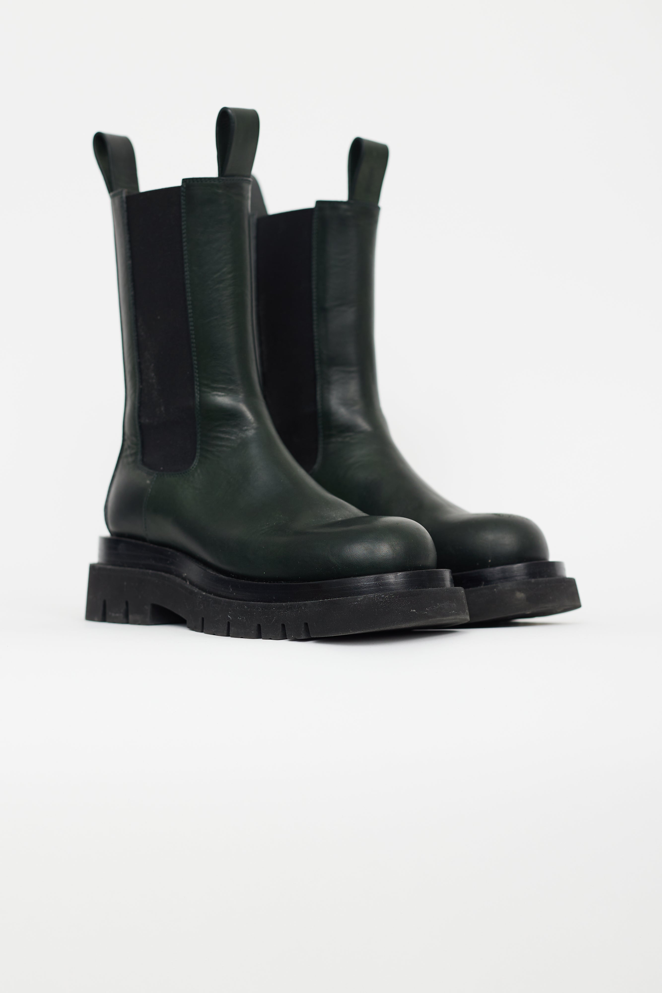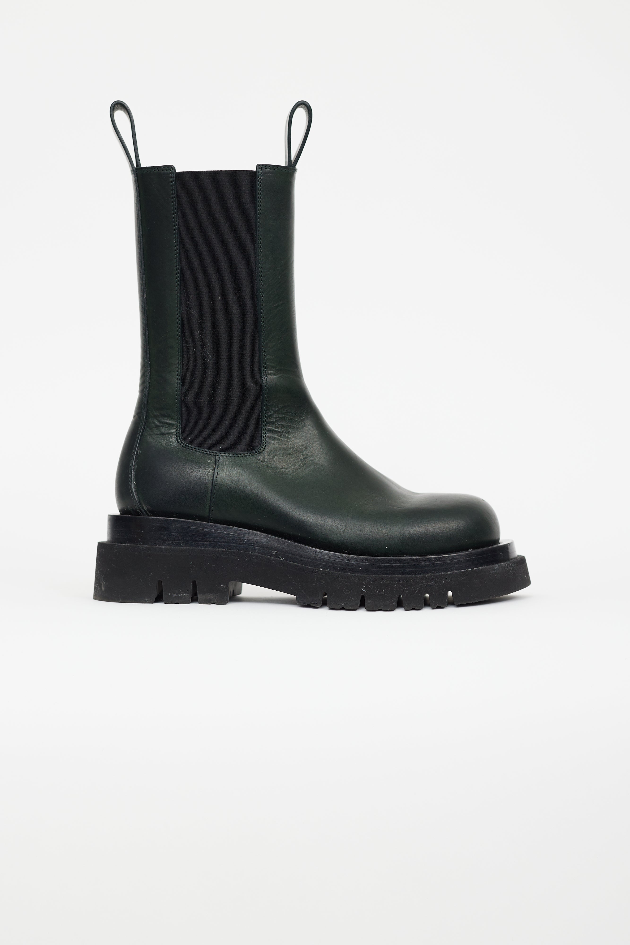 Pre-owned Bottega Veneta green leather boot featuring lug sole, mid calf height, elasticated gusset at side, round toe, and leather insoles. Comes with original box.