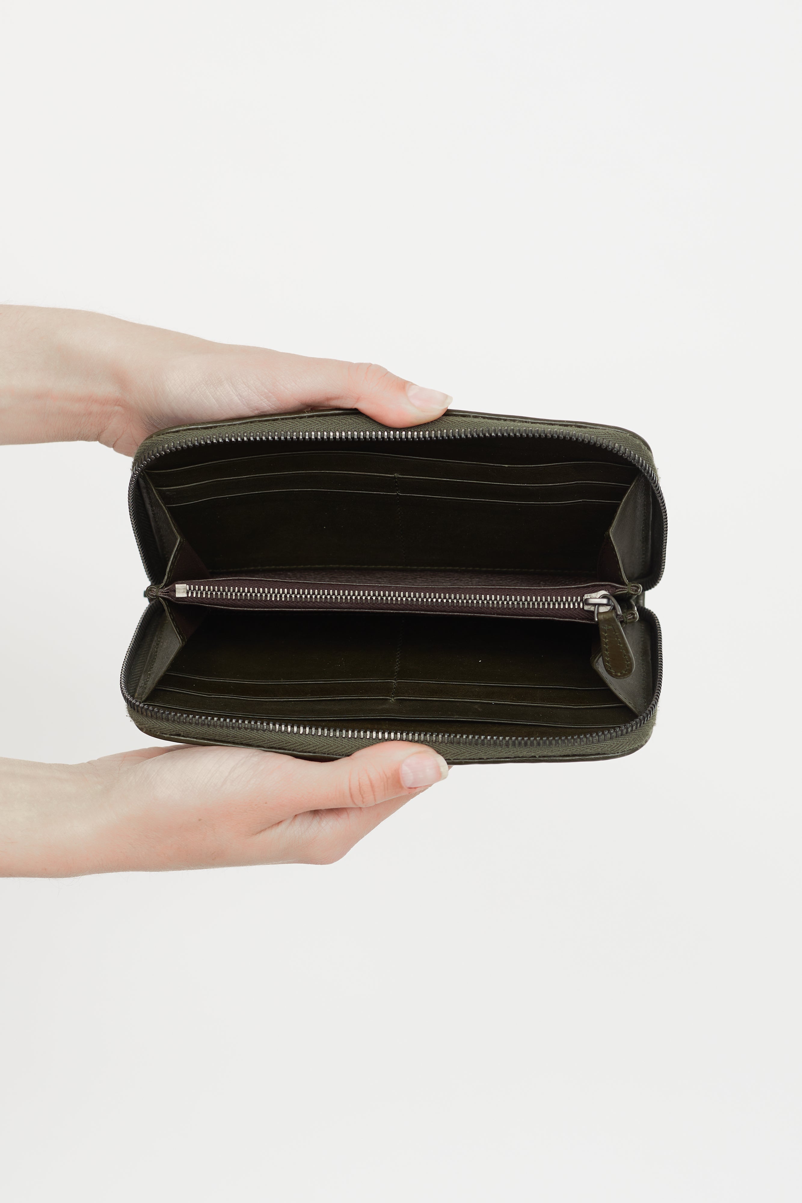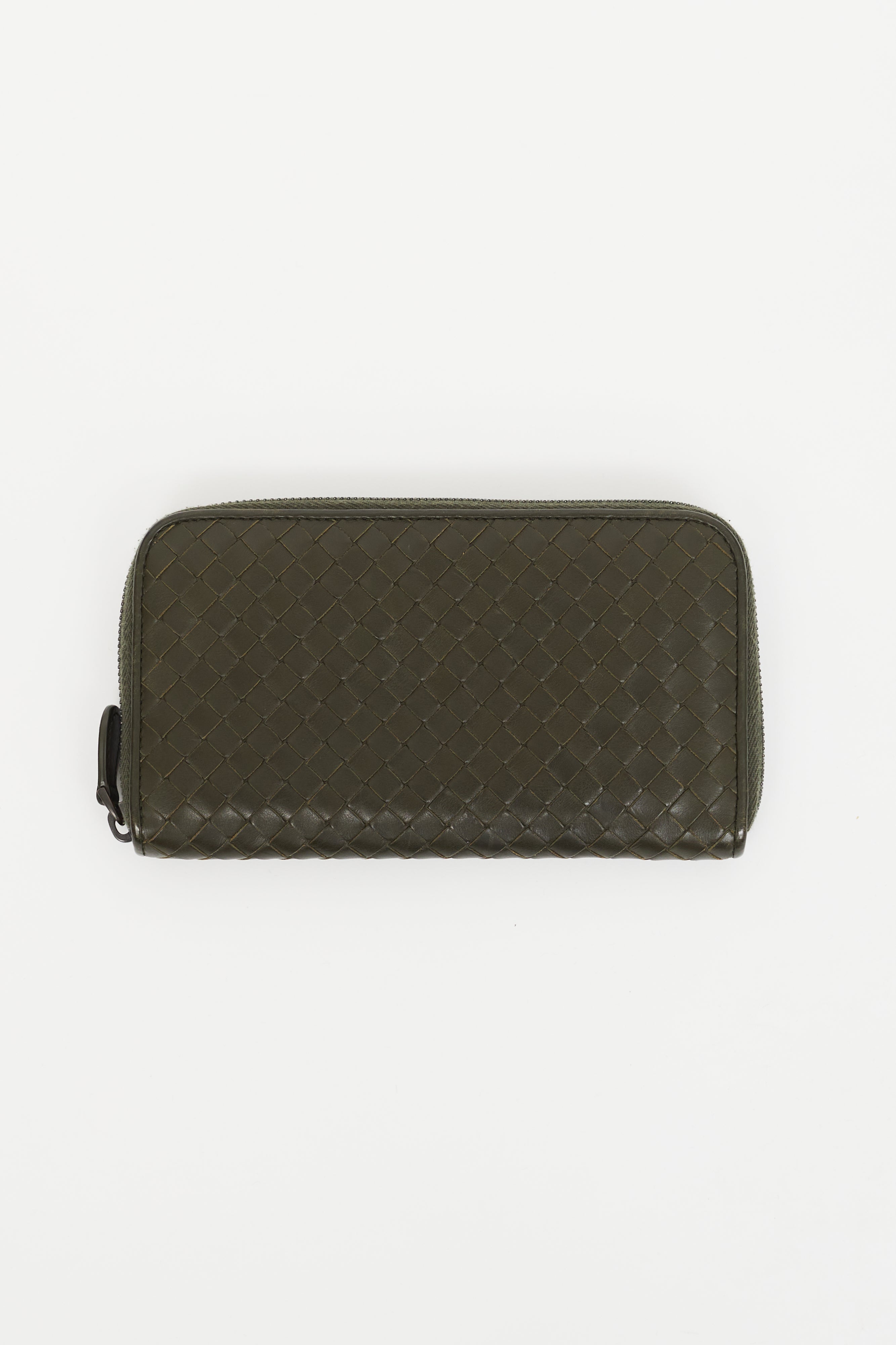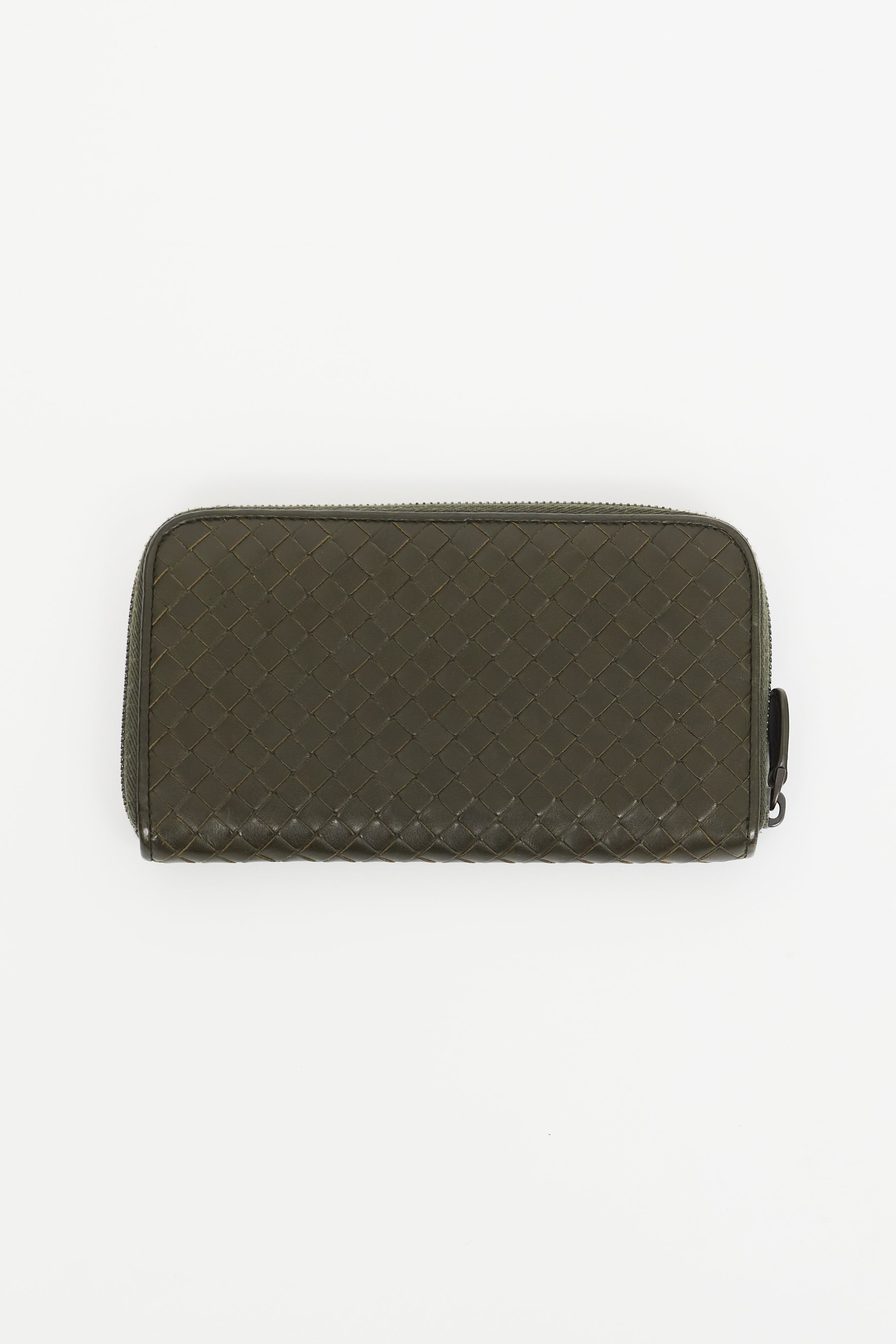 Pre-owned Bottega Veneta khaki green long leather wallet featuring signature Intrecciato exterior, gunmetal tone zip closure, multiple card slots, two main compartments and one zipped pocket at centre. Comes with original dust bag.