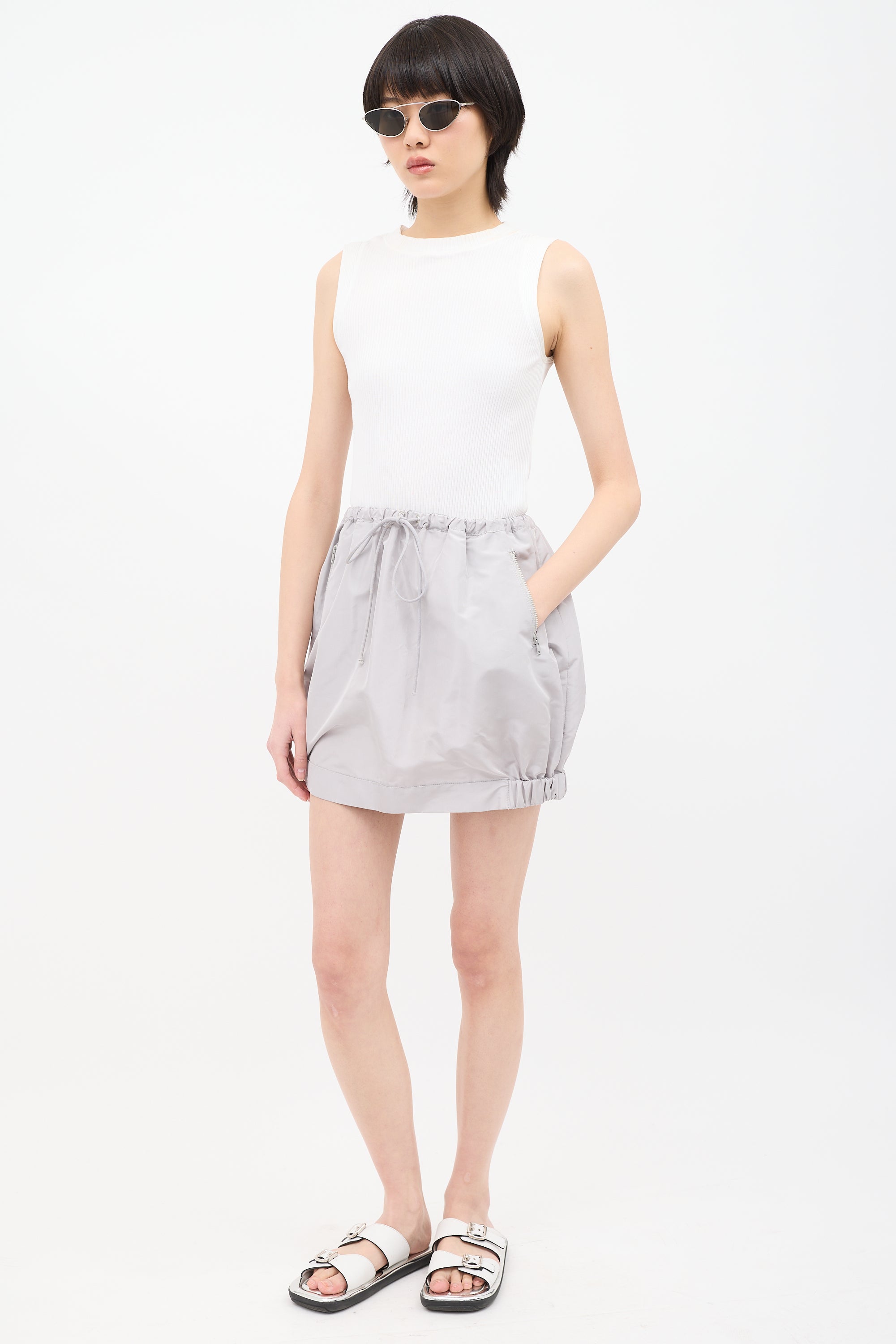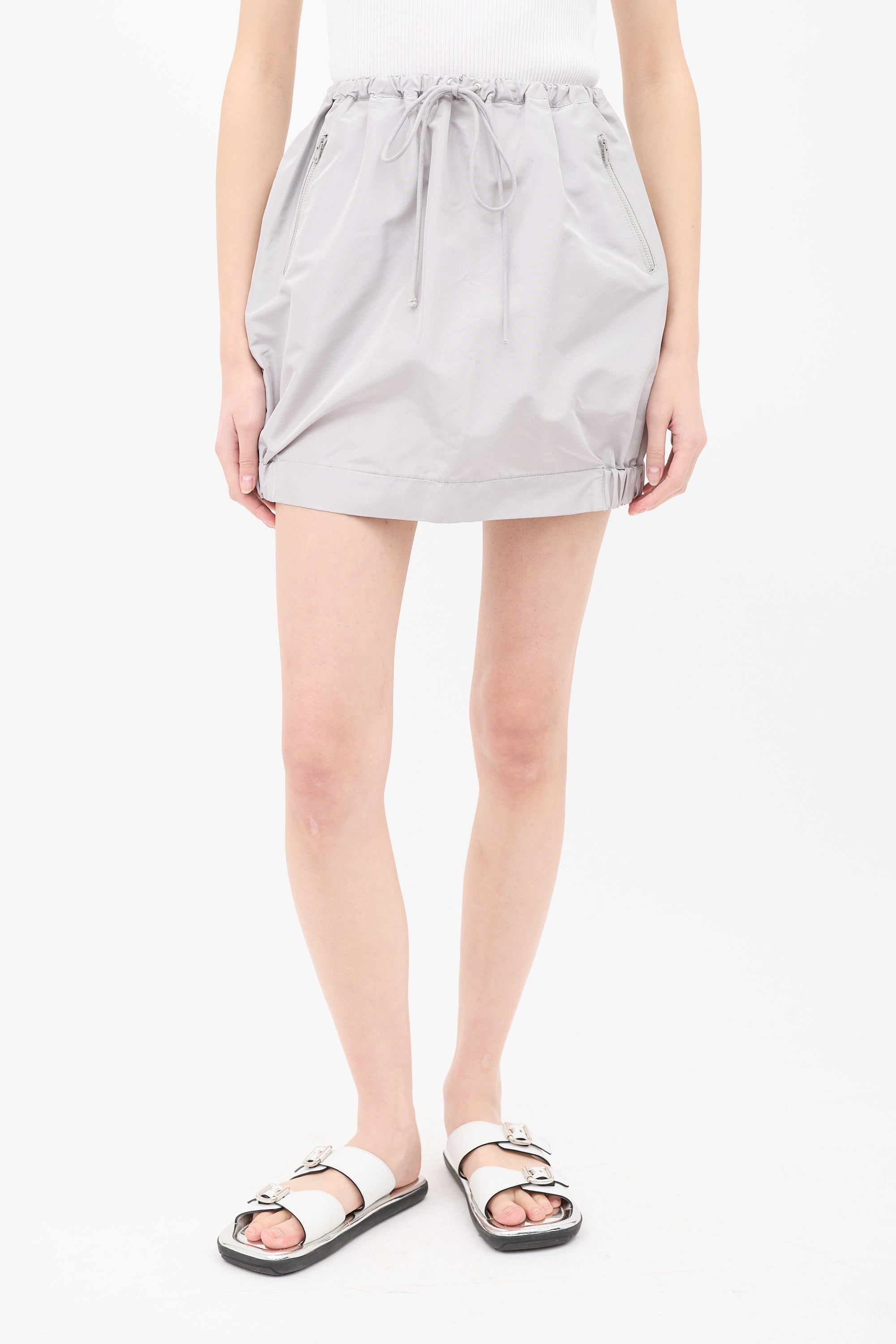 Pre-owned Sacai grey silk blend mini skirt featuring a drawstring waist, two front zip pockets, two back flap pockets, and elasticized hem.
