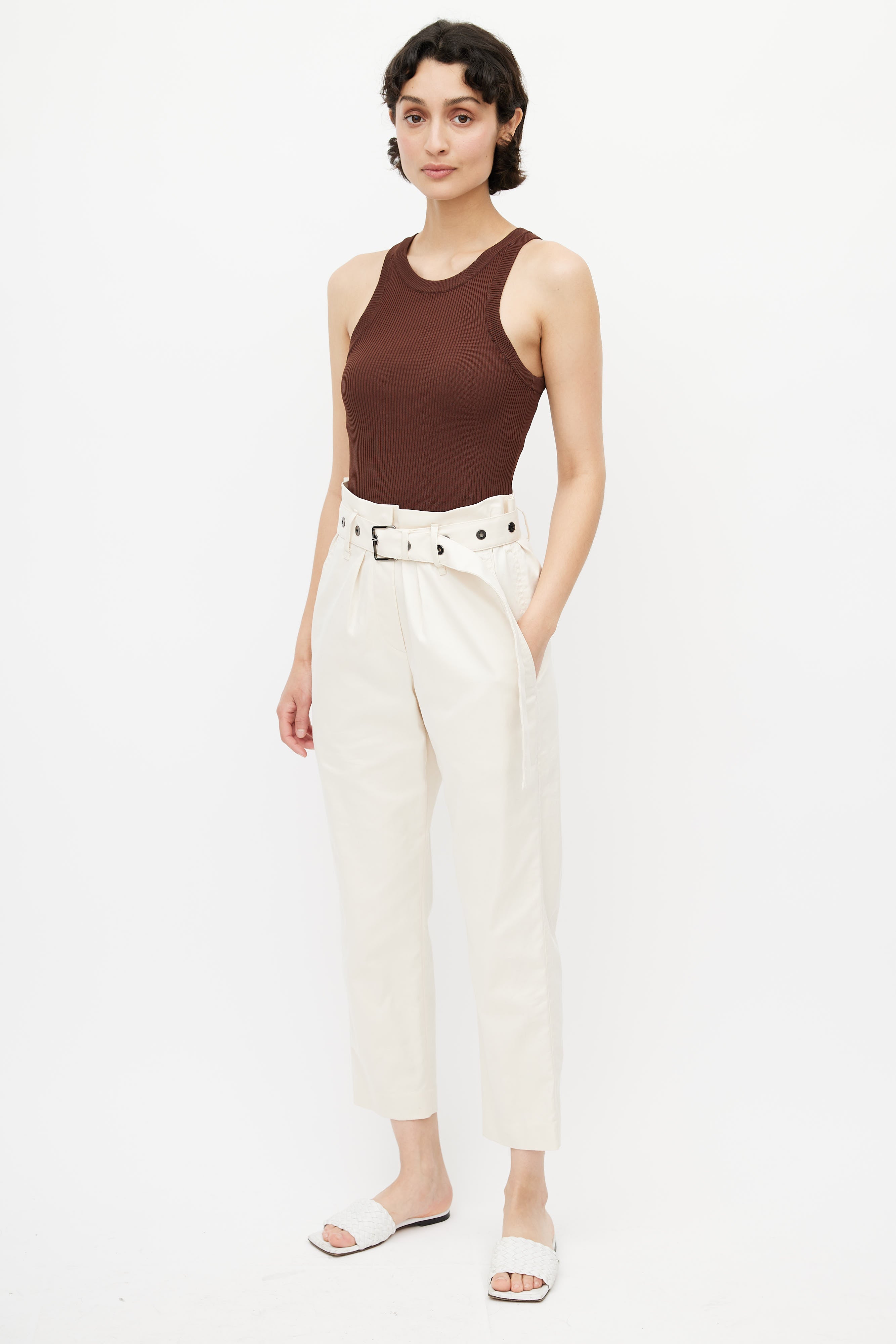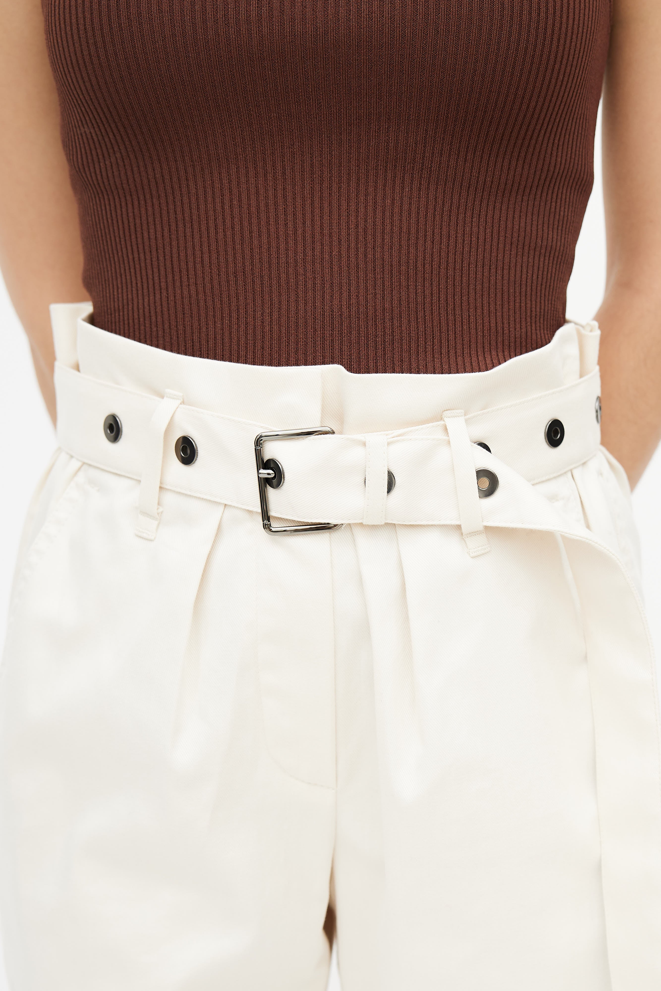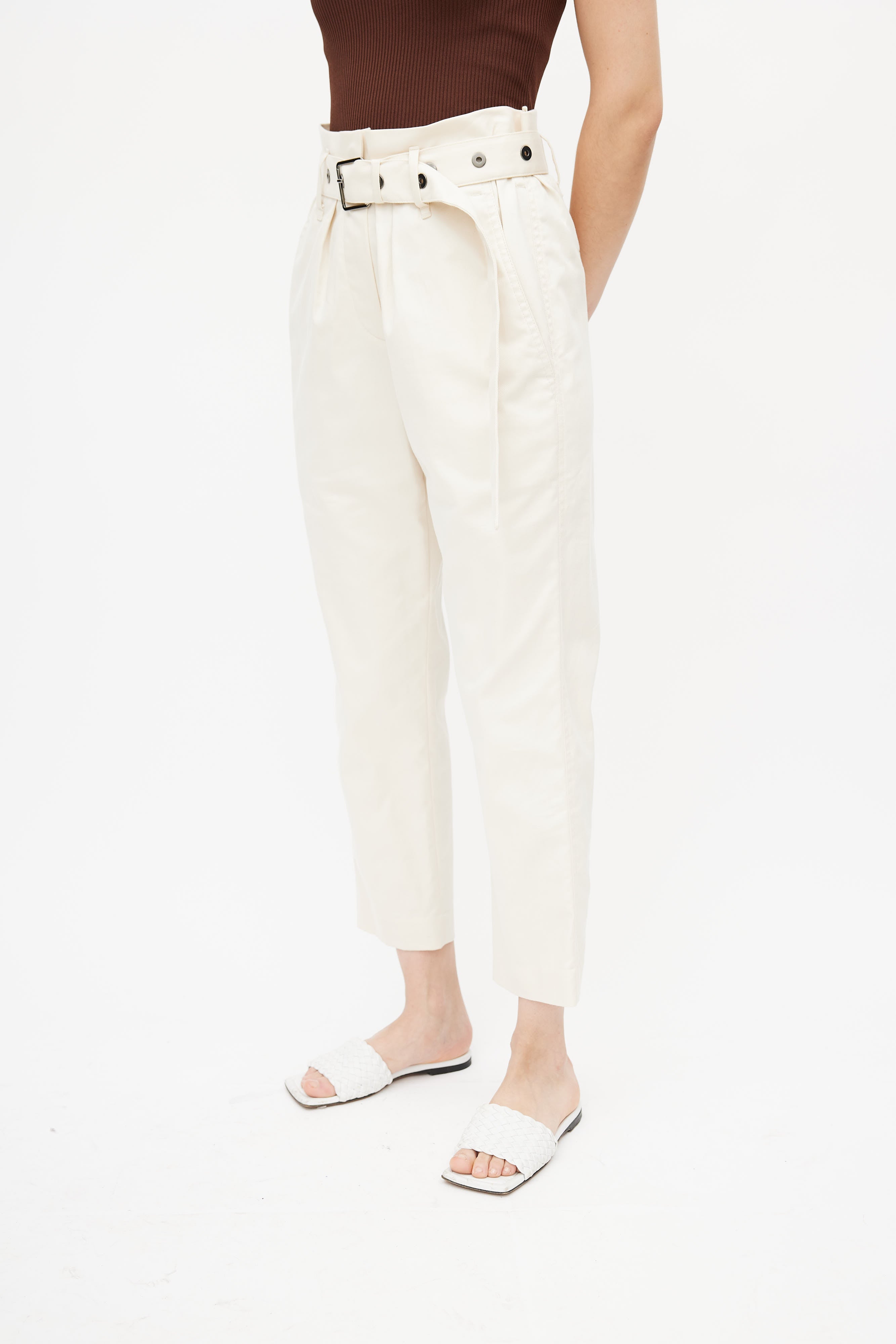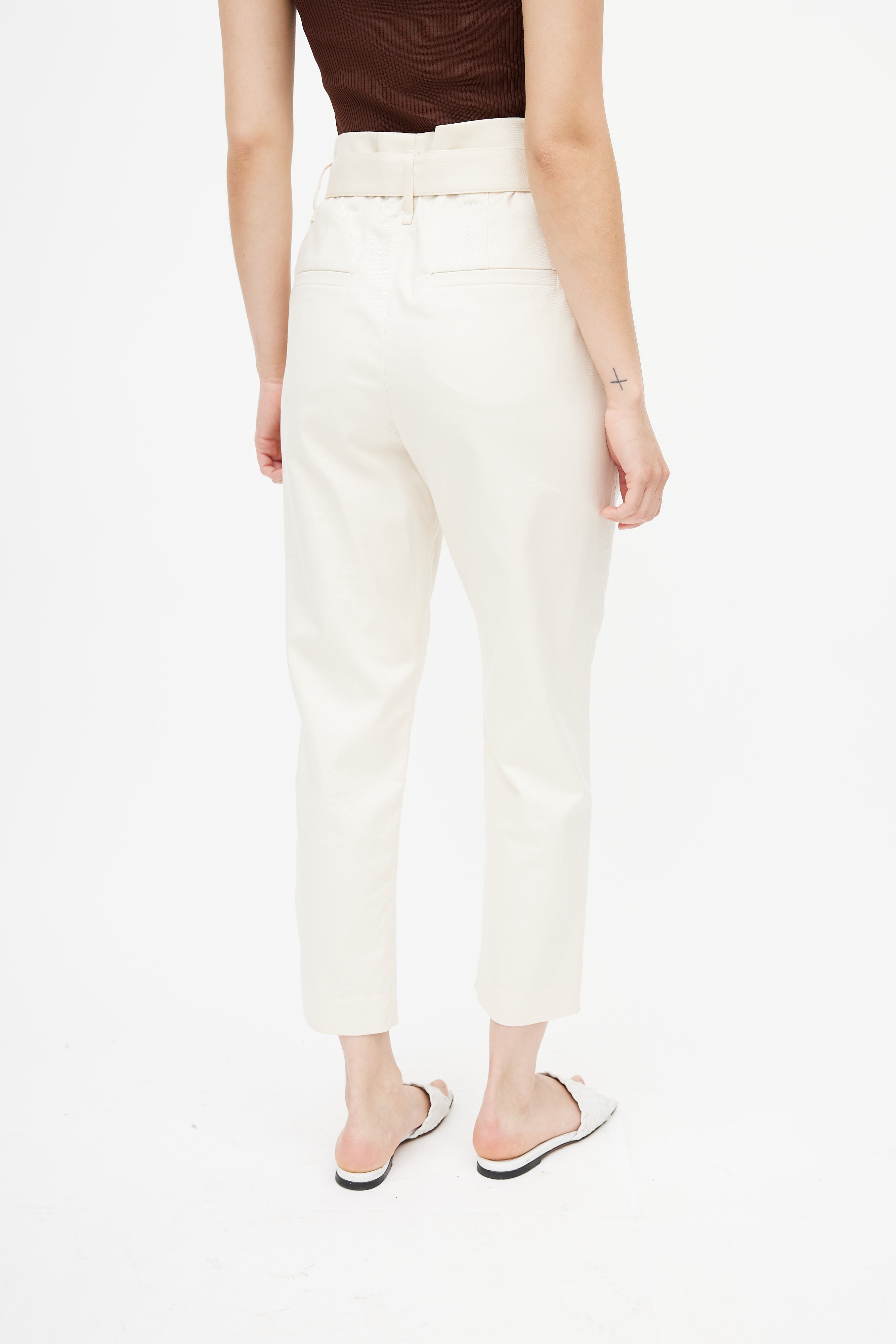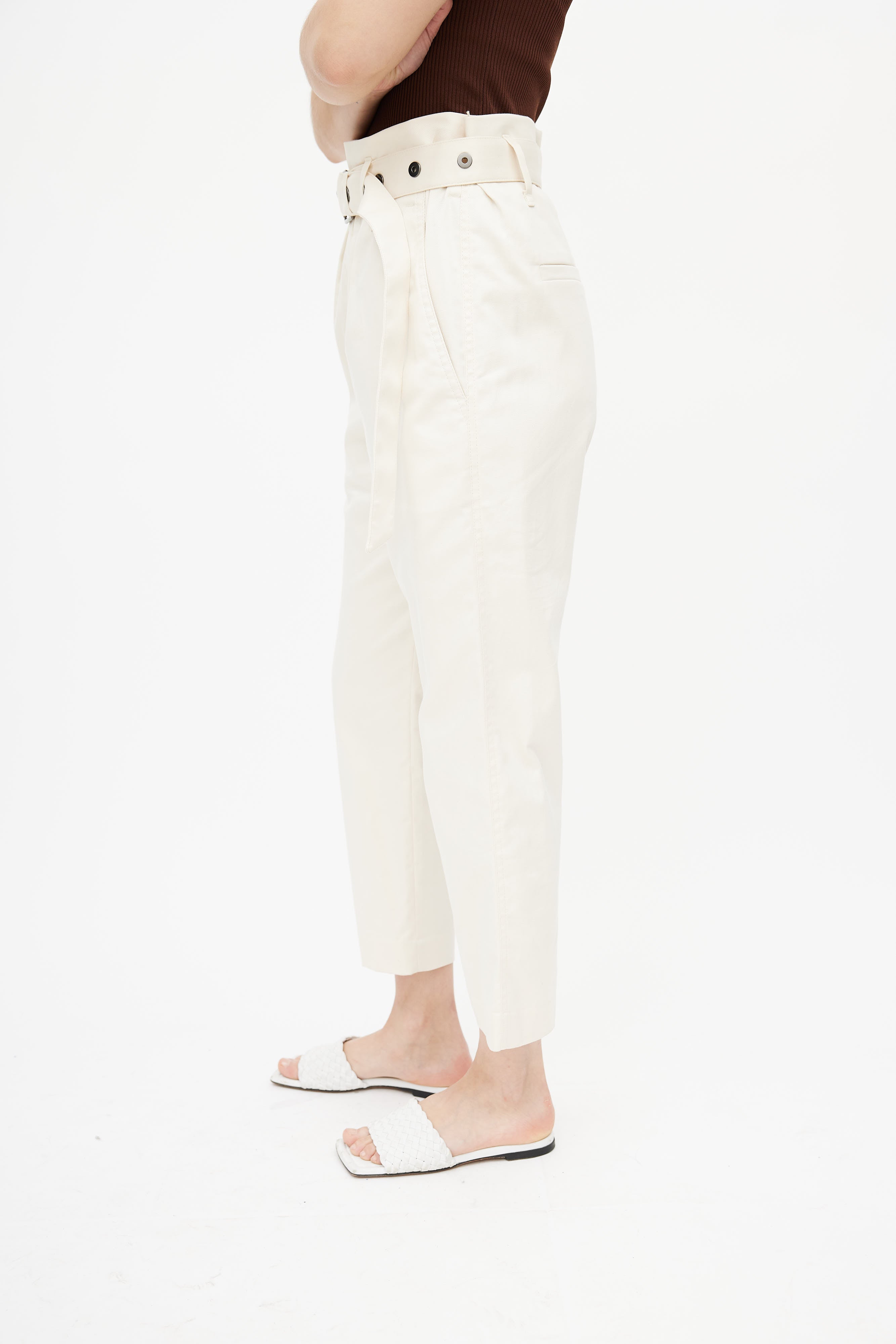 Pre-owned Brunello Cucinelli beige trouser featuring belt loops, zip fly, elastic band at inner waistband, two slash pockets at front, and two welt pockets at back. Comes with matching belt with gunmetal hardware.